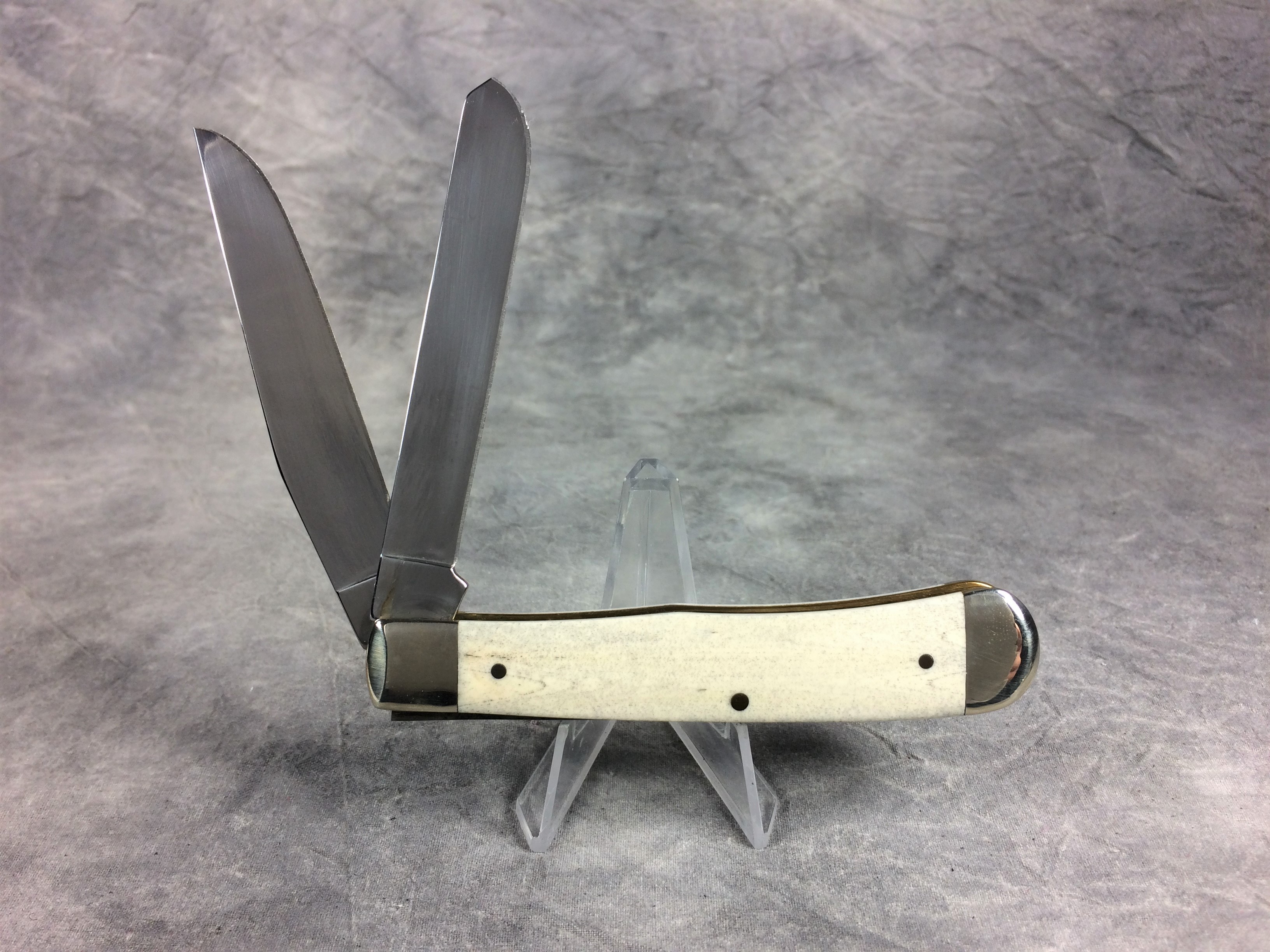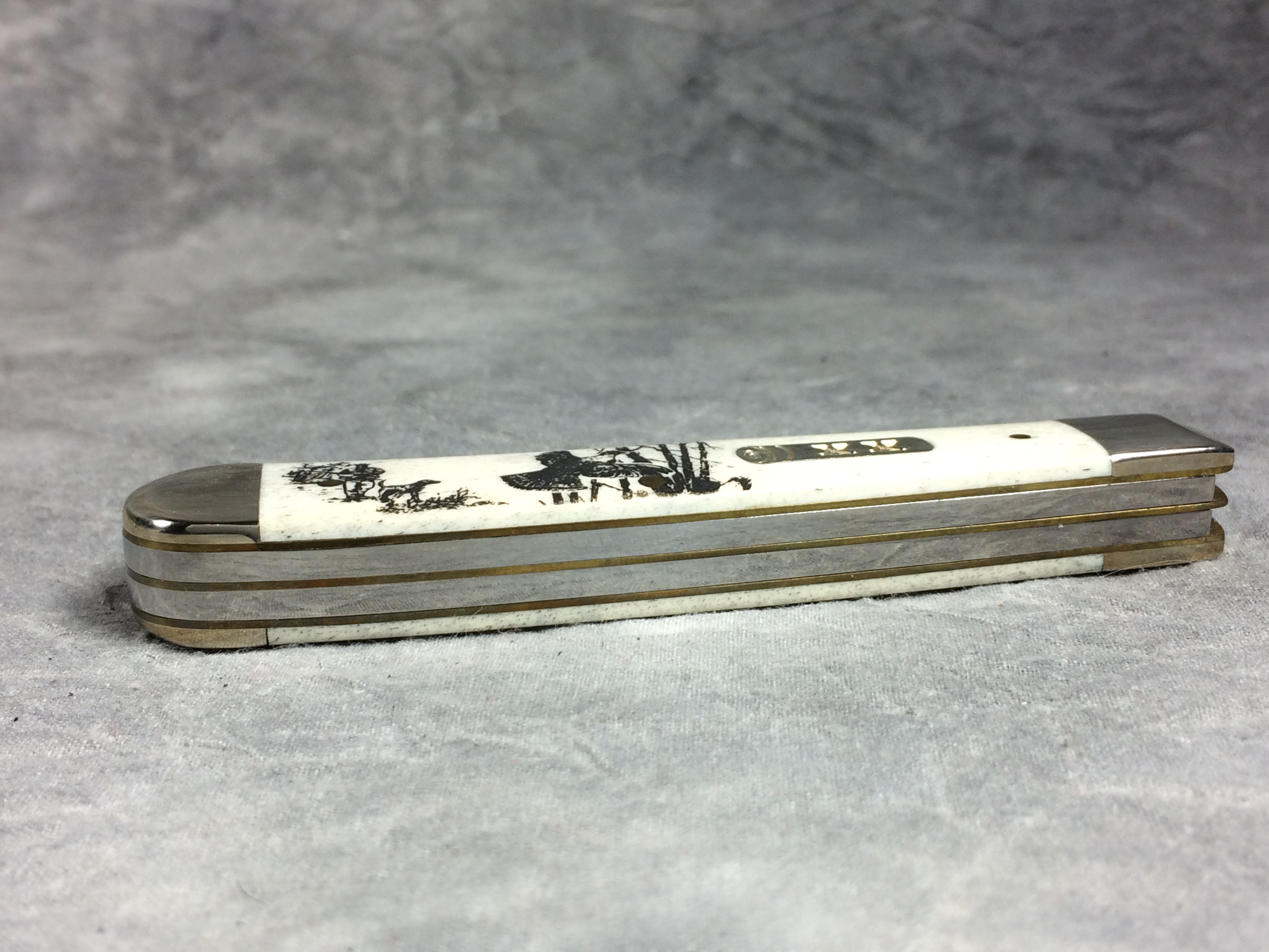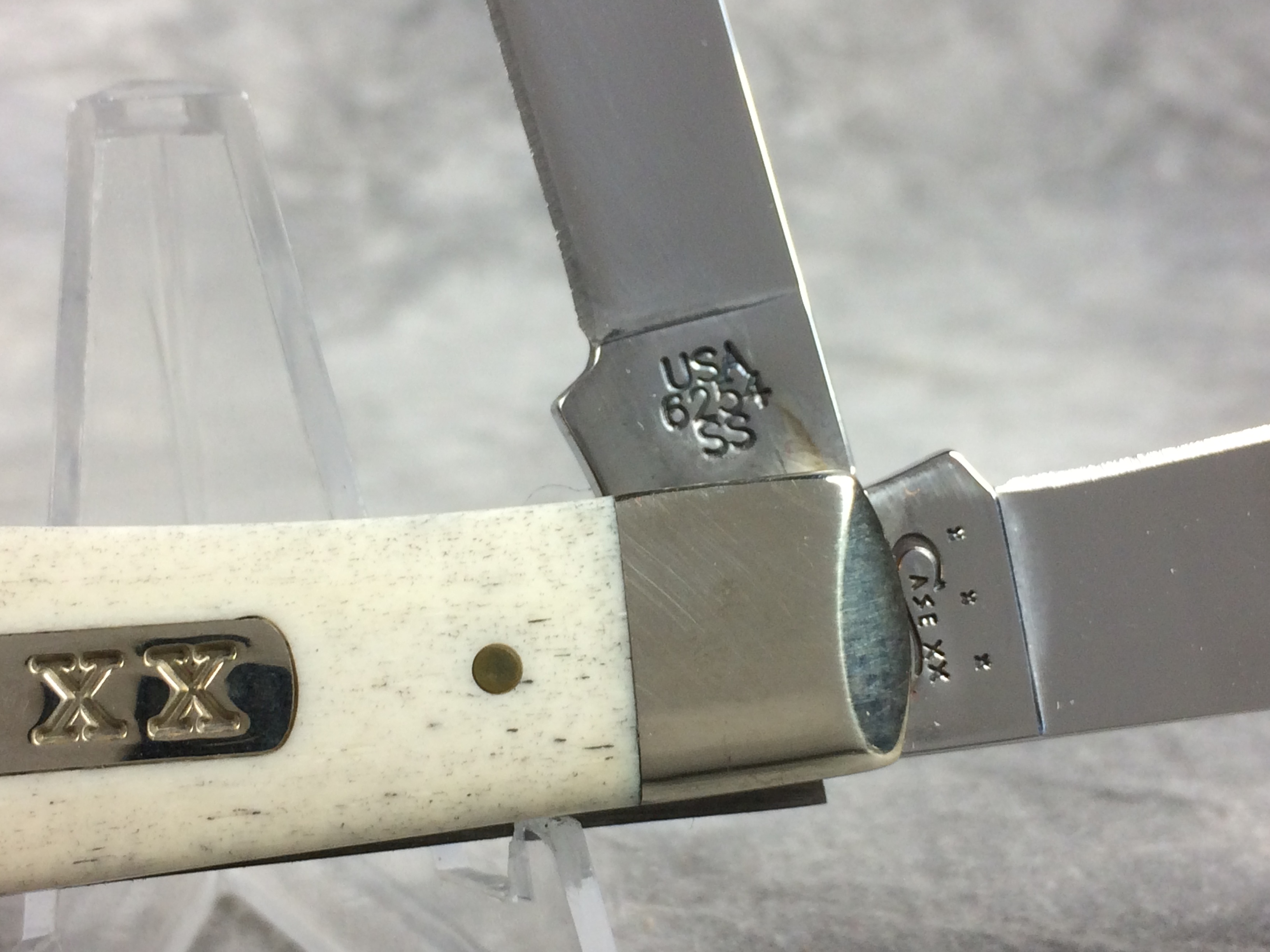 December 04, 2025 - 4-1/8 inches closed. 7-3/8 inches open. Made in USA. " x x x Case XX  x x* " (with lightning bolt S) and "USA 6254 SS" tang stamps. Tru-Sharp Surgical Steel blades. Main blade etched "W.R. CASE & SONS AMERICAN SPORTSMAN". Shotgun shell "XX" shield. Smooth natural bone handle etched with image of grouse and hunter. Nickel Silver bolsters. Brass liner.