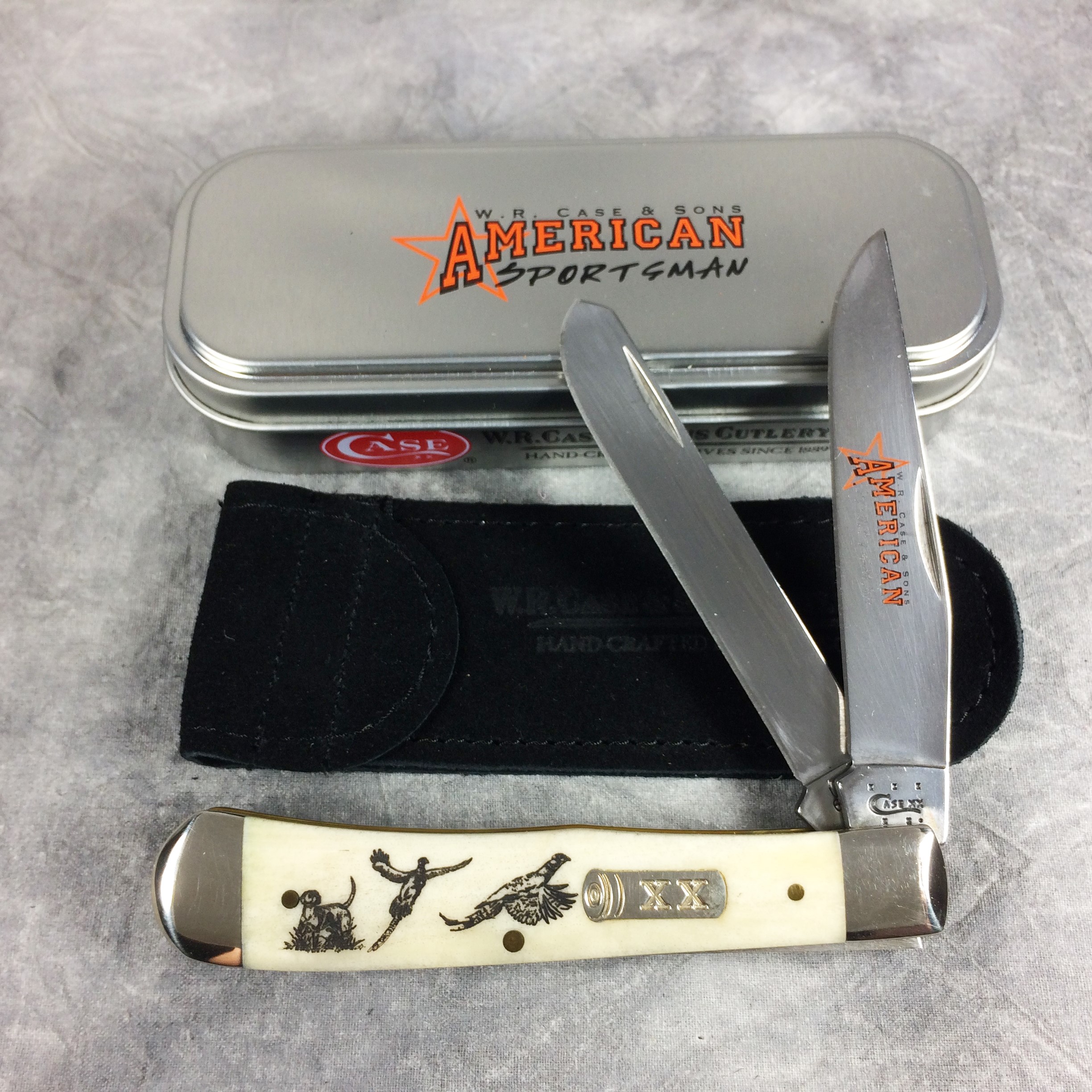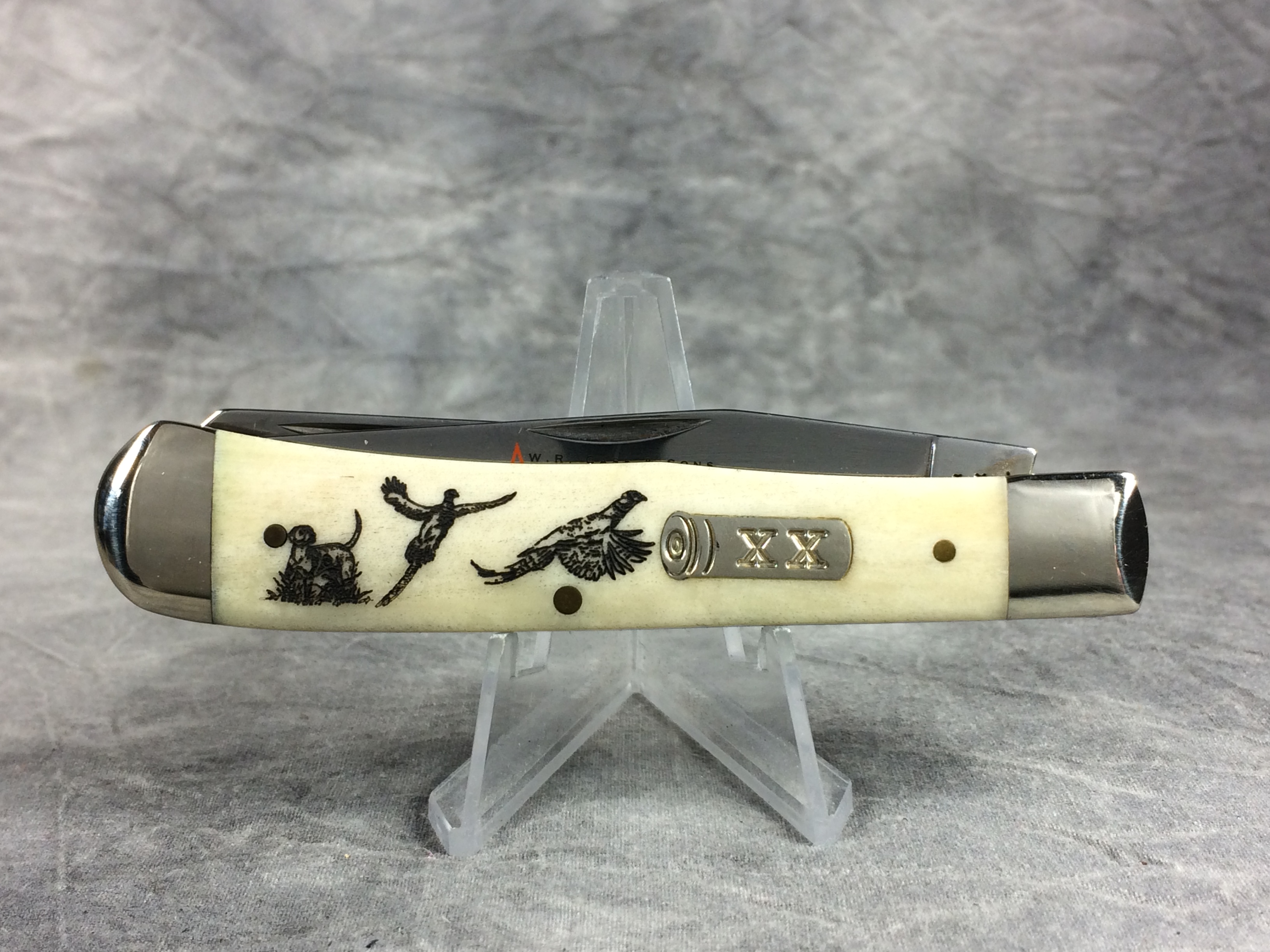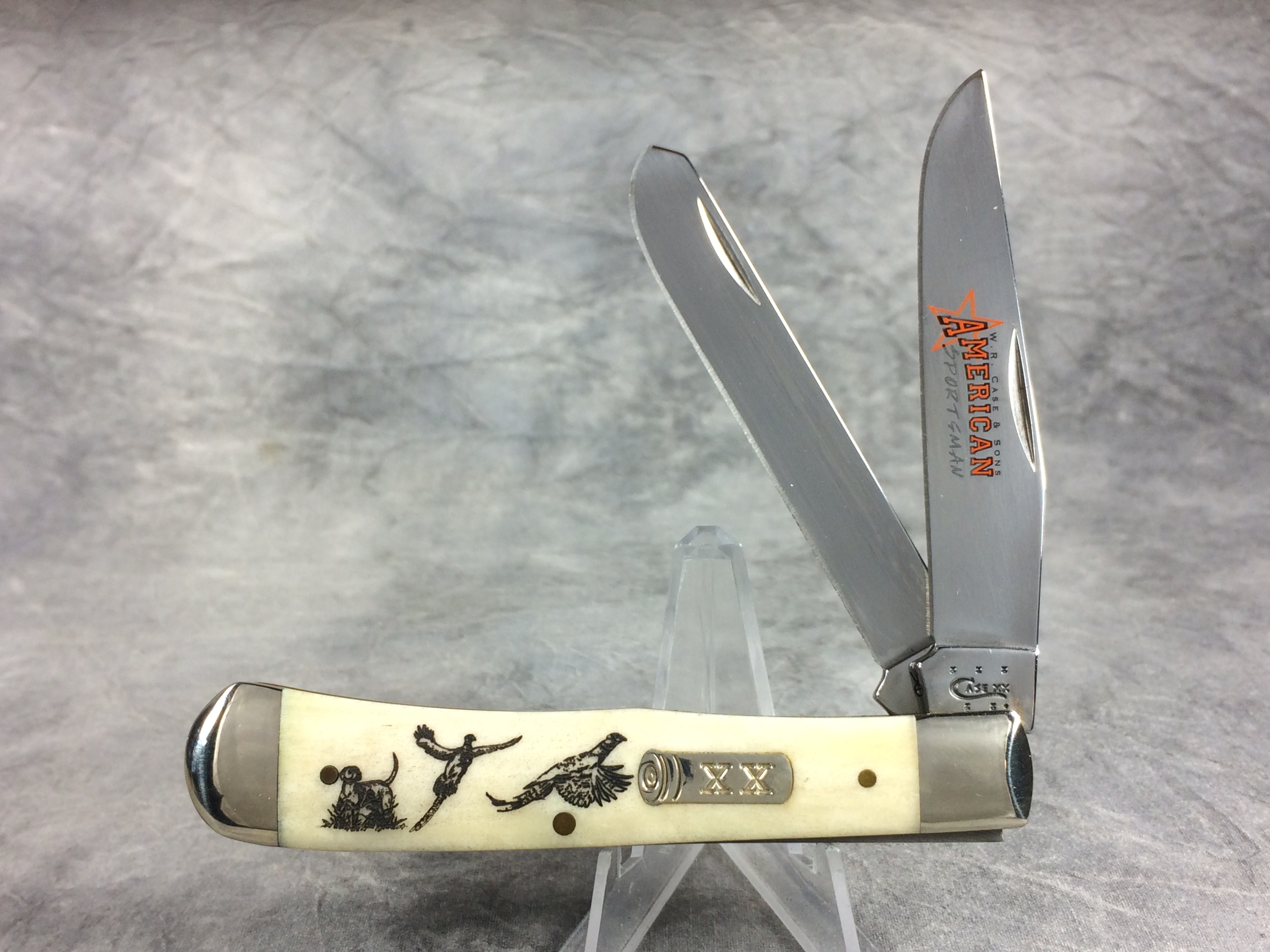 March 15, 2026 - 4-1/8 inches closed. 7-3/8 inches open. Made in USA. " x x x Case XX  x x* " (with lightning bolt S) and "USA 6254 SS" tang stamps. Tru-Sharp Surgical Steel blades. Main blade etched "W.R. CASE & SONS AMERICAN SPORTSMAN". Shotgun shell "XX" shield. Smooth natural bone handle etched with image of pheasant and hunter. Nickel Silver bolsters. Brass liner.