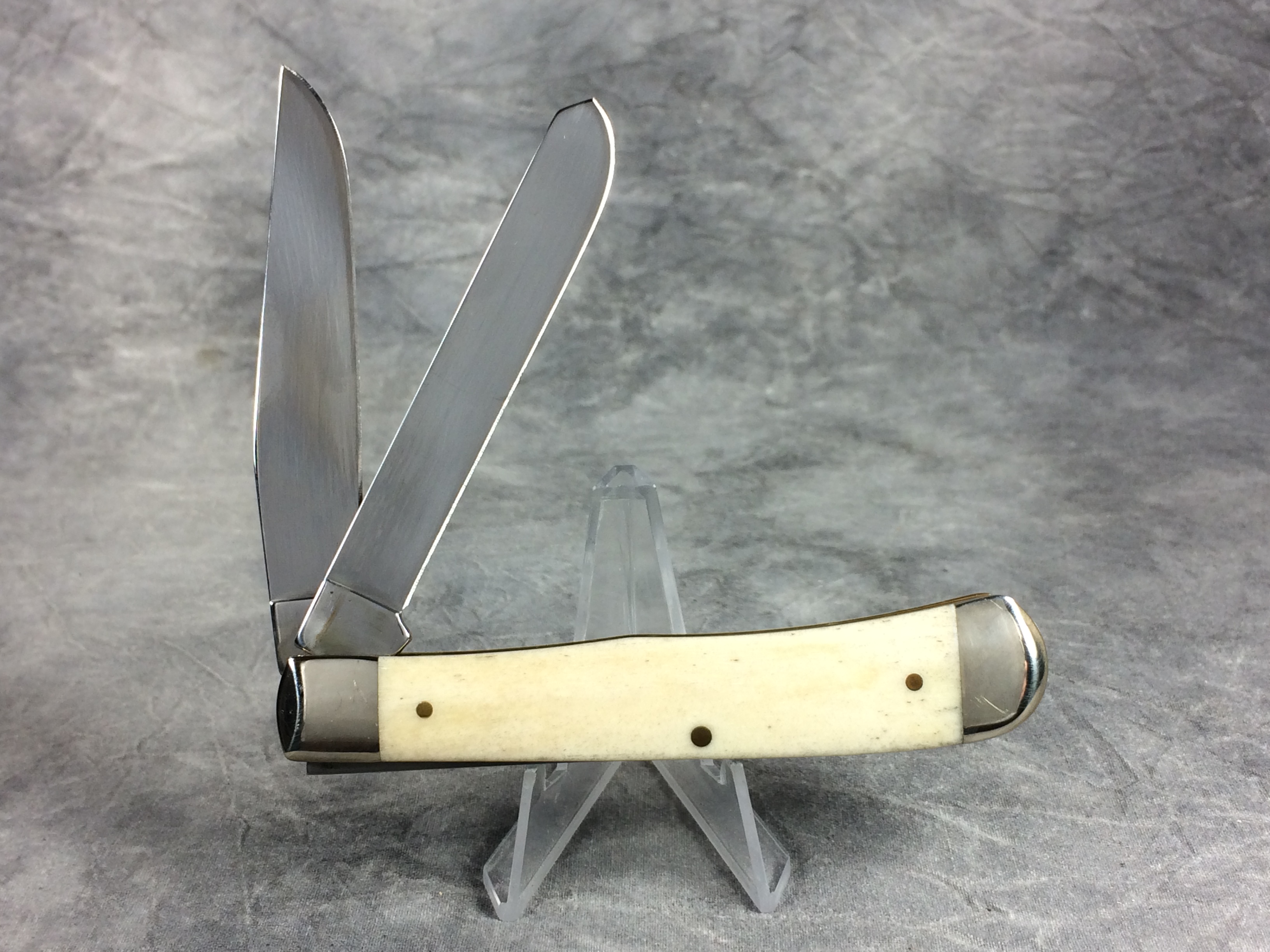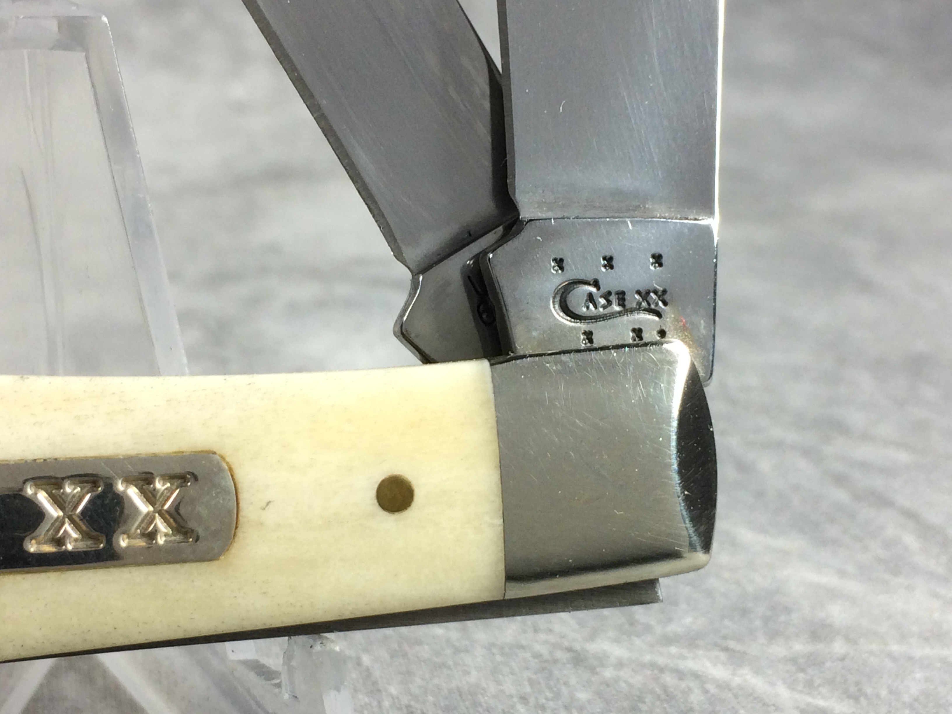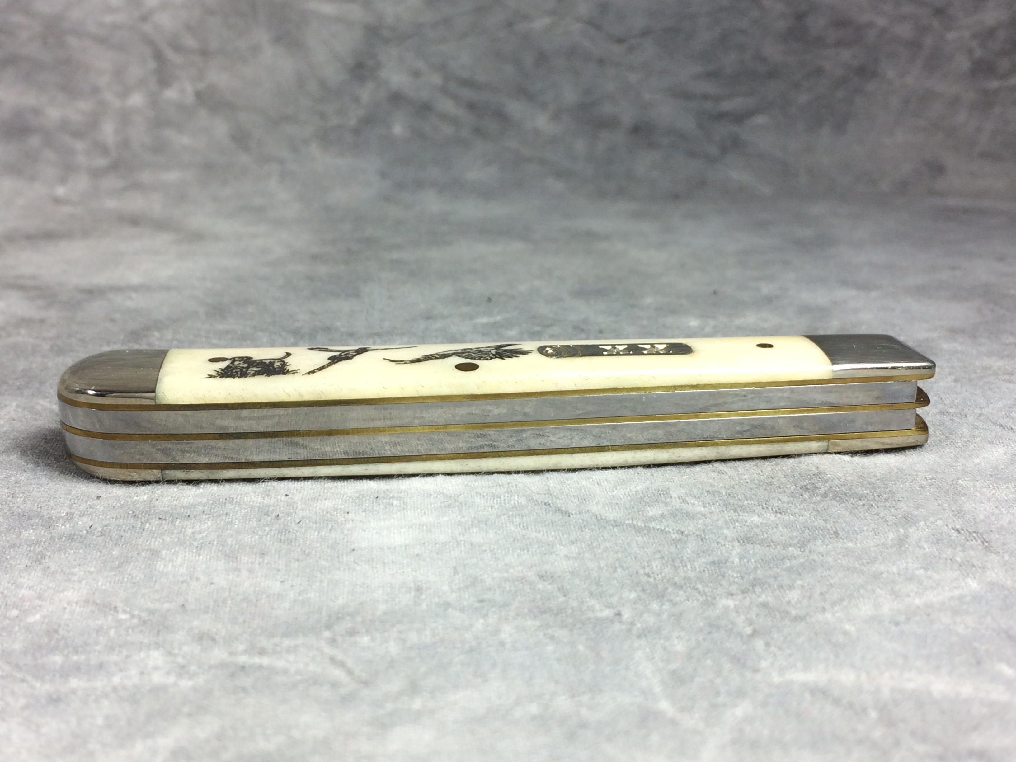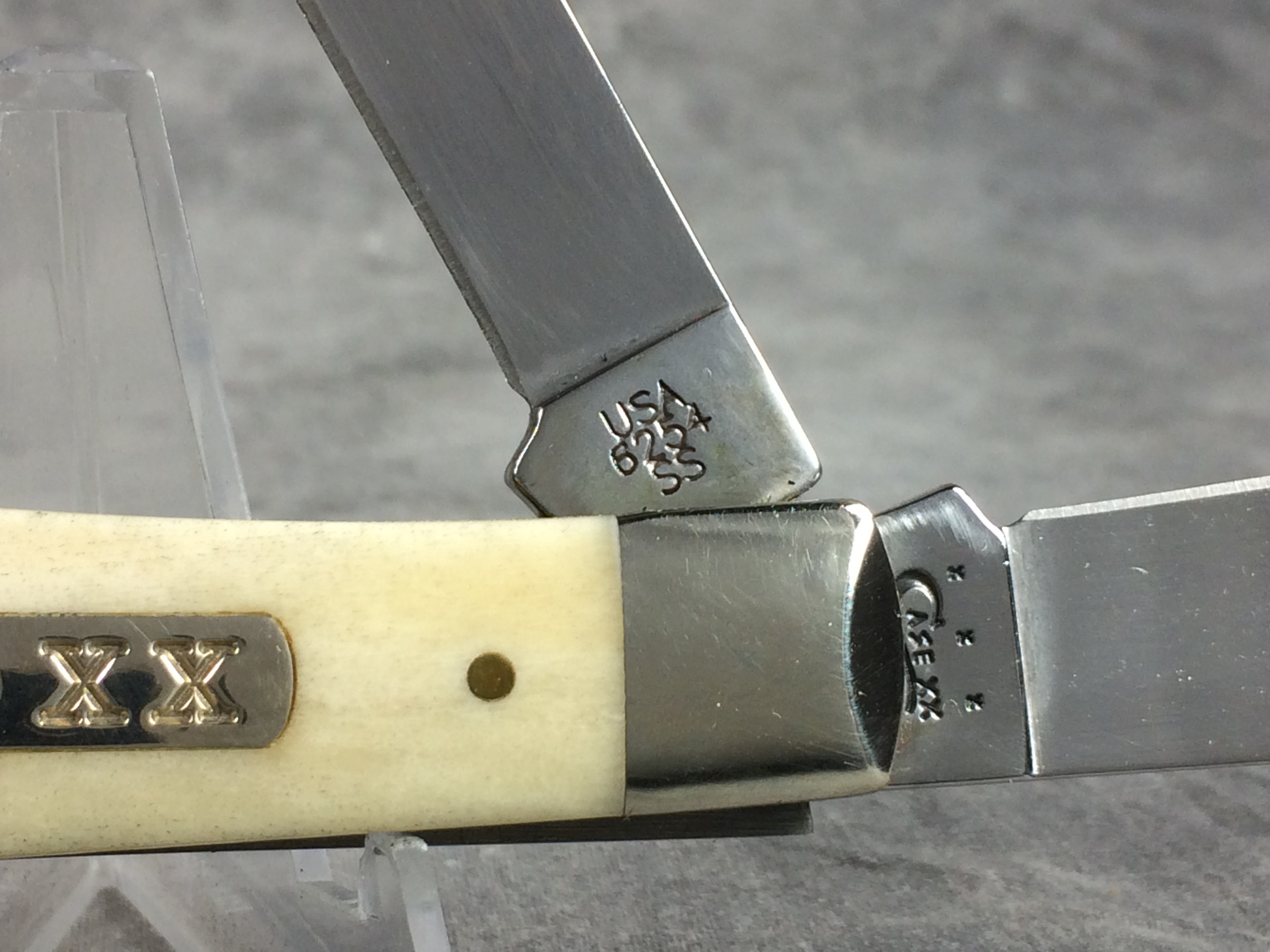March 15, 2026 - 4-1/8 inches closed. 7-3/8 inches open. Made in USA. " x x x Case XX  x x* " (with lightning bolt S) and "USA 6254 SS" tang stamps. Tru-Sharp Surgical Steel blades. Main blade etched "W.R. CASE & SONS AMERICAN SPORTSMAN". Shotgun shell "XX" shield. Smooth natural bone handle etched with image of pheasant and hunter. Nickel Silver bolsters. Brass liner.