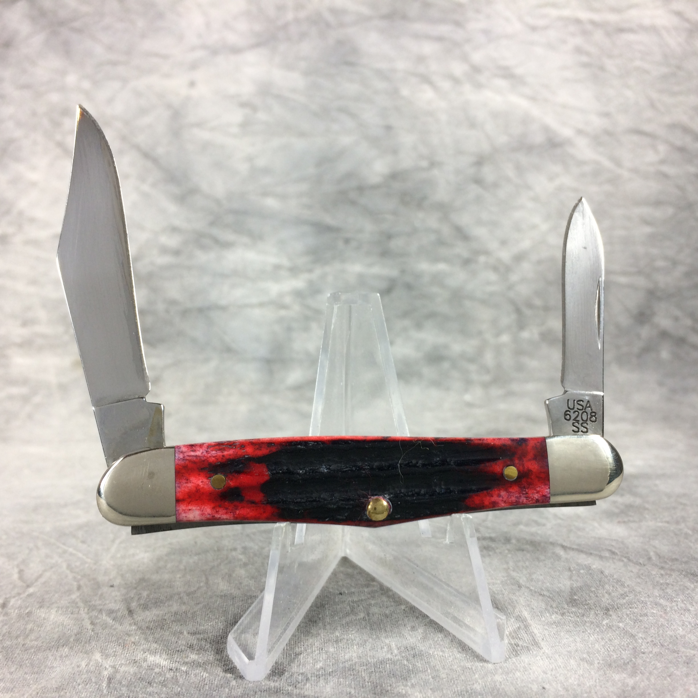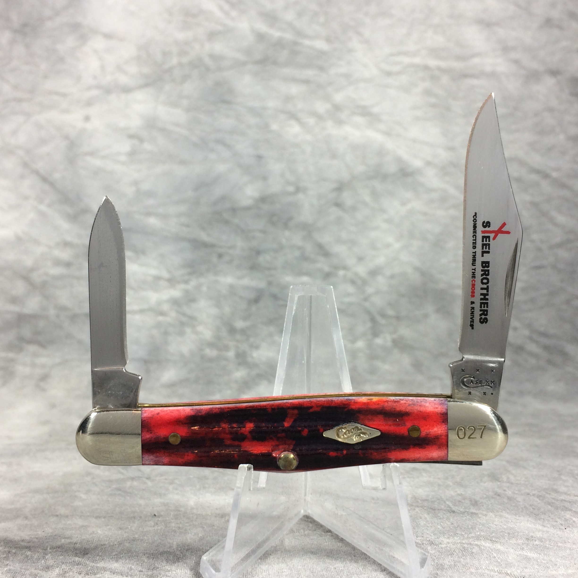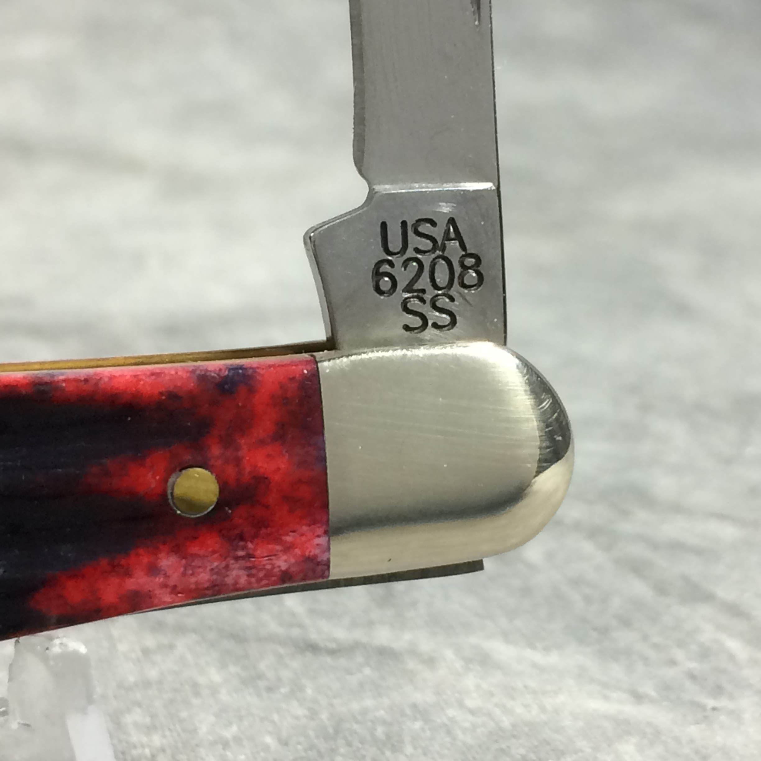 December 04, 2025 - 3-1/4 inches closed. 5-3/8 inches open. Made in USA. "  x x x  Case XX   x x*  " (with lightning bolt S) and "USA 6208 SS" tang stamps. Diamond-shaped long-C "Case xx" shield. Stainless Steel blades. Main blade etched "STEEL BROTHERS 'Connected thru the cross & knives'".Crimson jigged bone handle. Nickel Silver bolsters. Front right bolster etched with serial number . Brass liner.
