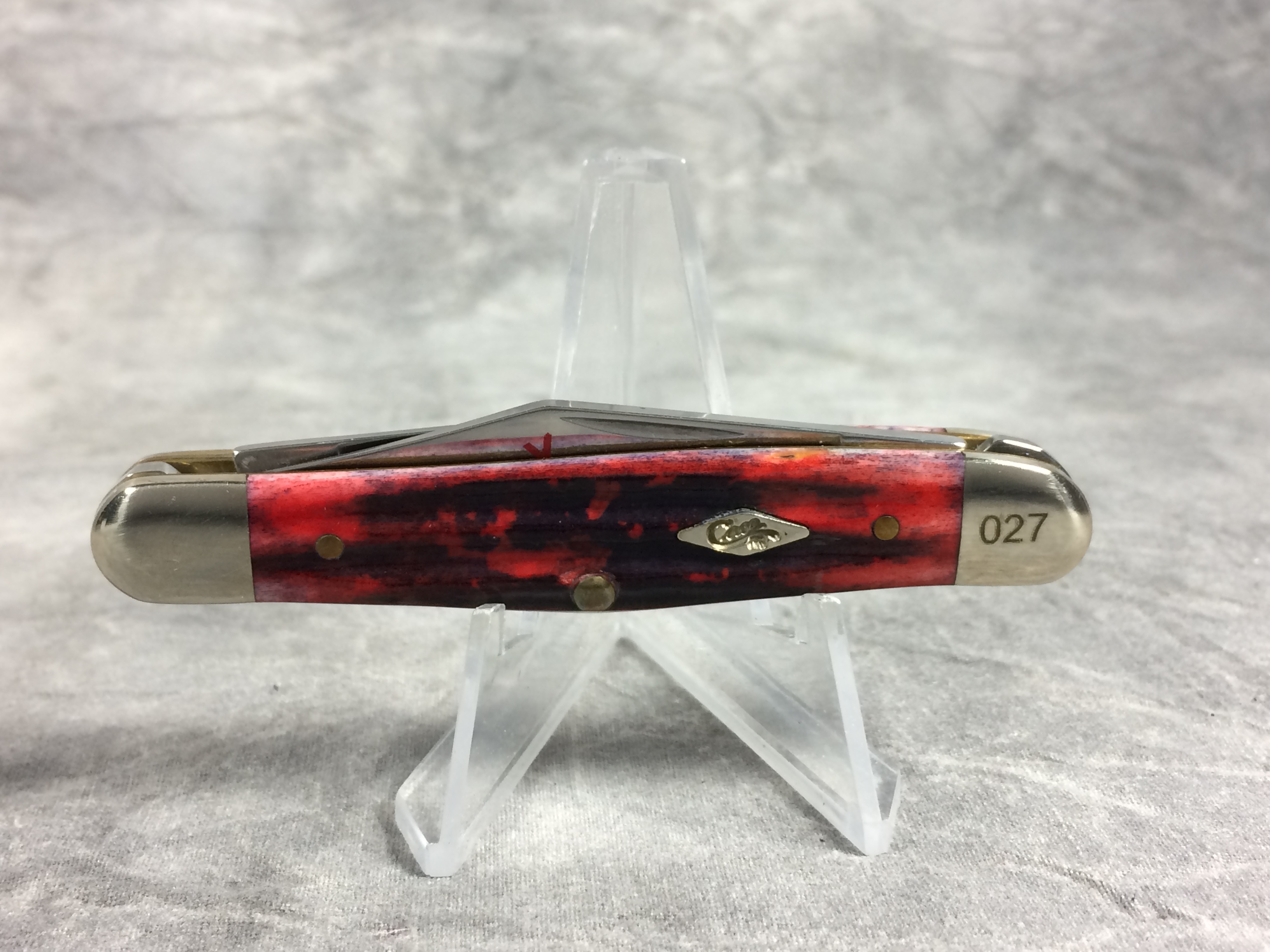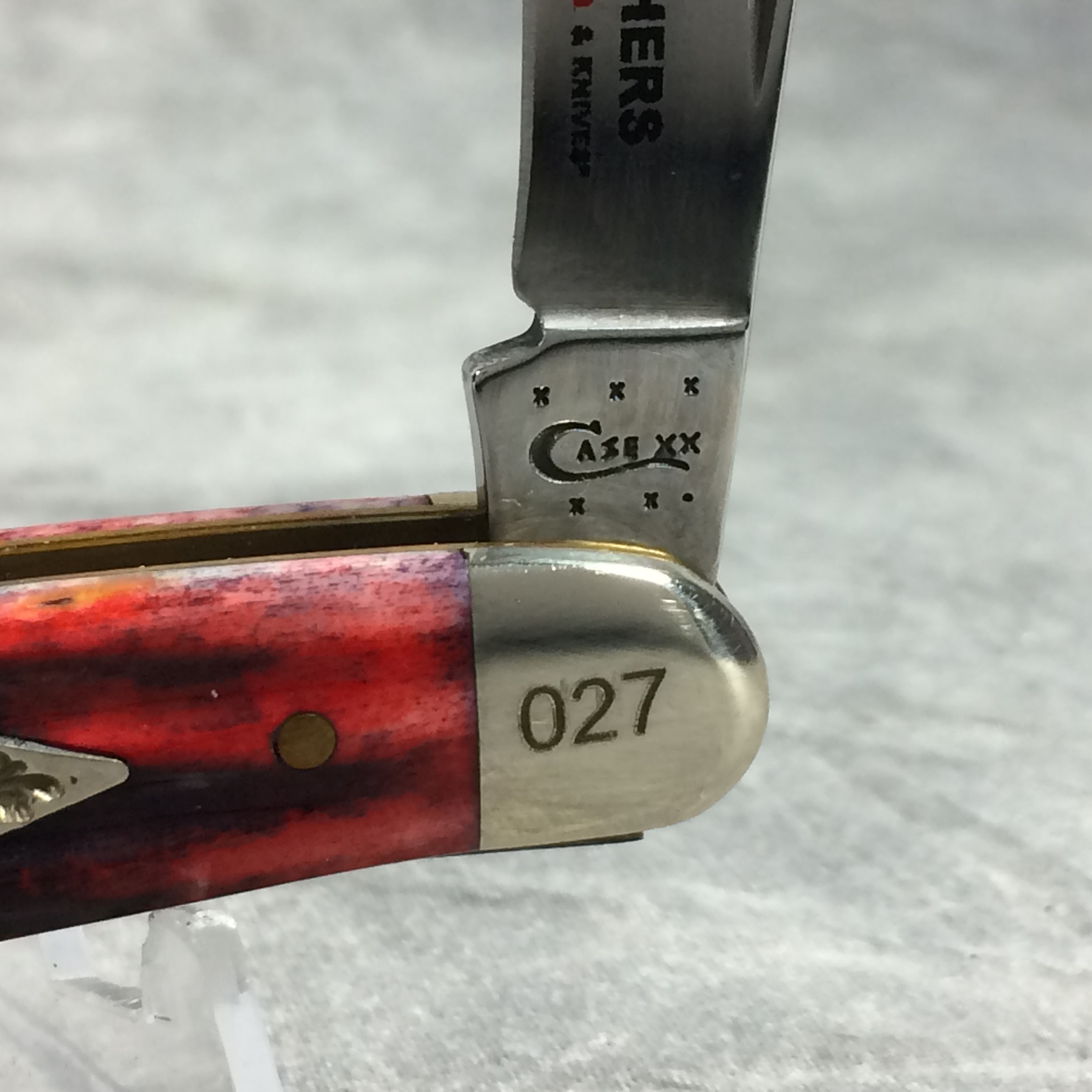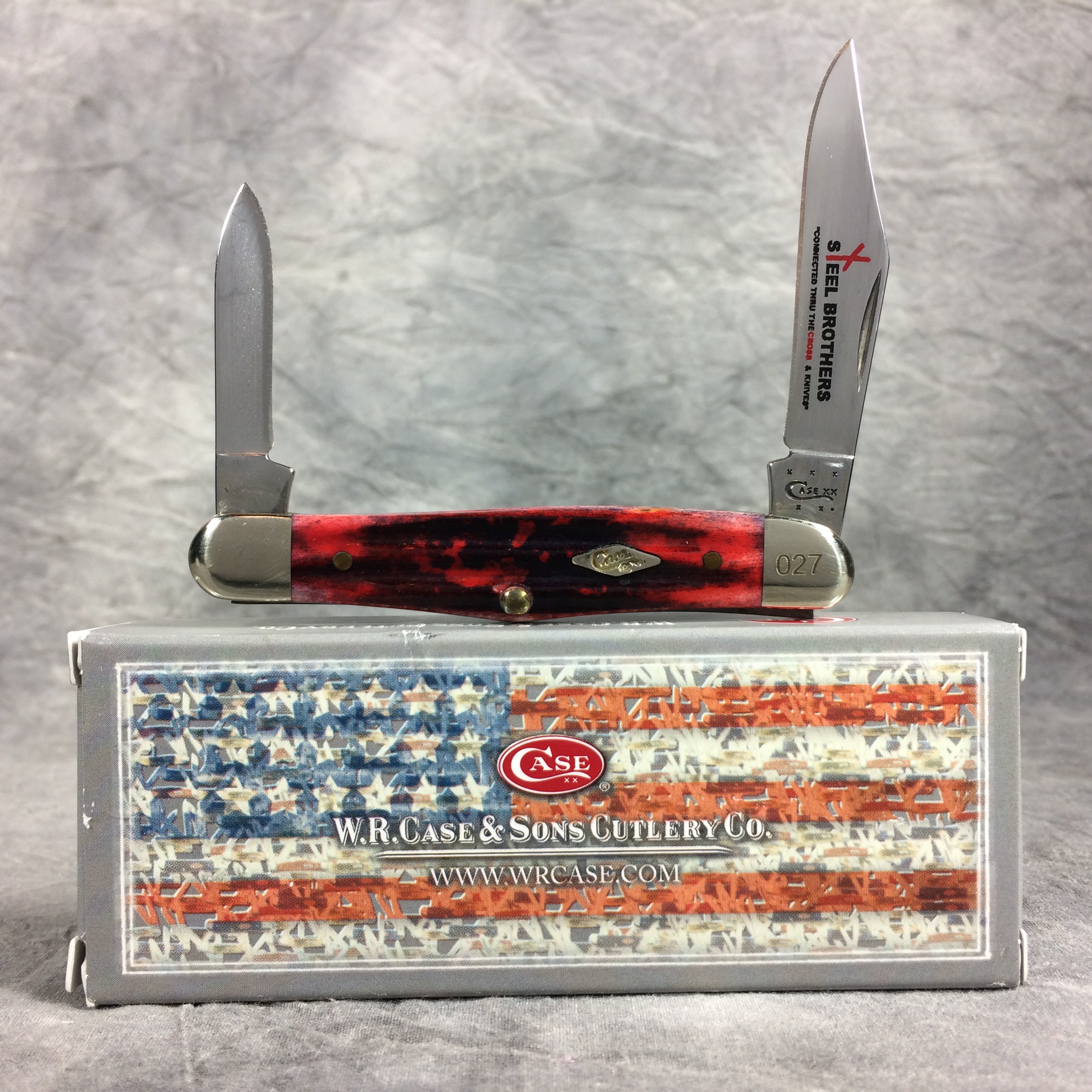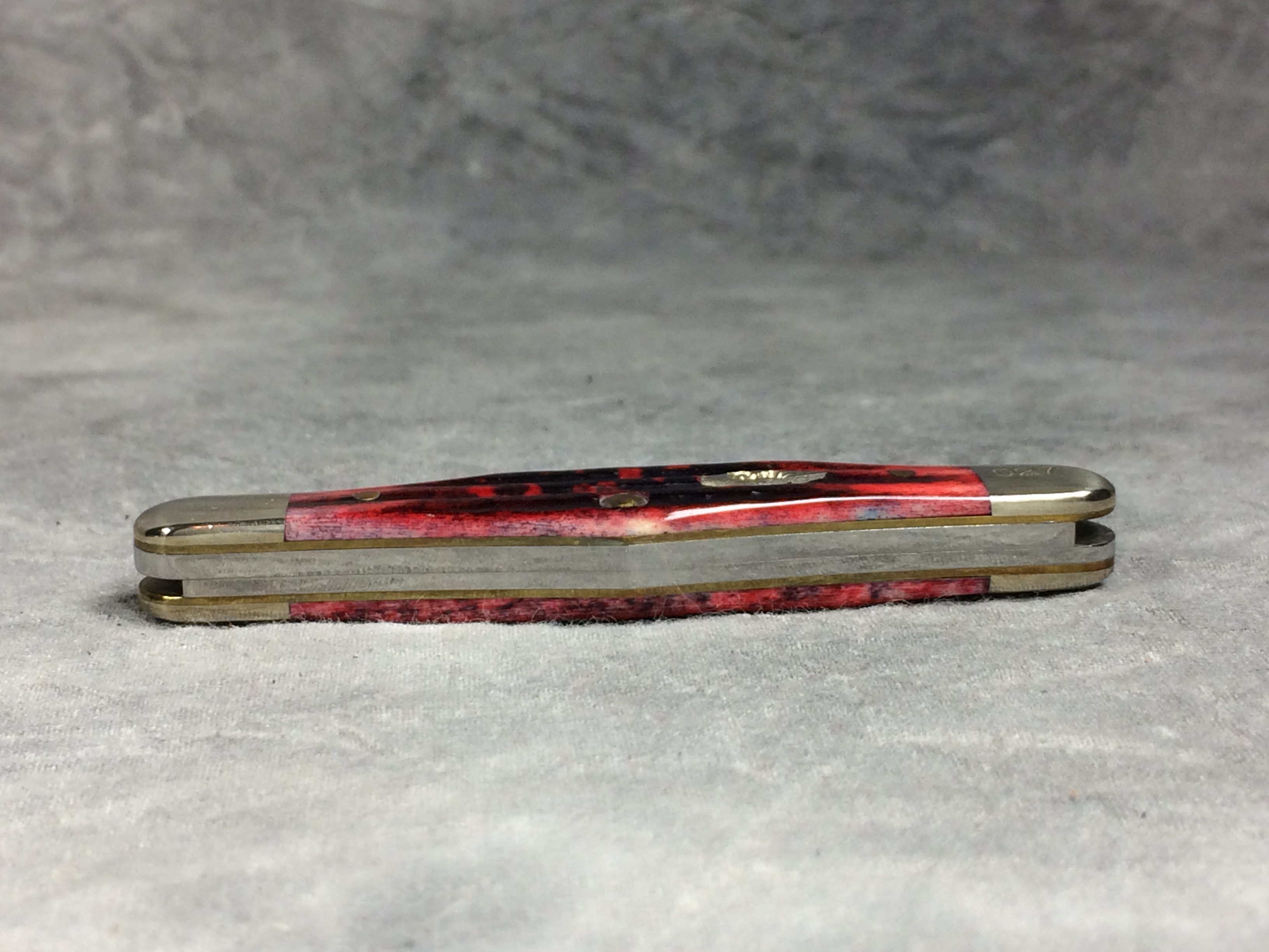 December 04, 2025 - 3-1/4 inches closed. 5-3/8 inches open. Made in USA. "  x x x  Case XX   x x*  " (with lightning bolt S) and "USA 6208 SS" tang stamps. Diamond-shaped long-C "Case xx" shield. Stainless Steel blades. Main blade etched "STEEL BROTHERS 'Connected thru the cross & knives'".Crimson jigged bone handle. Nickel Silver bolsters. Front right bolster etched with serial number . Brass liner.