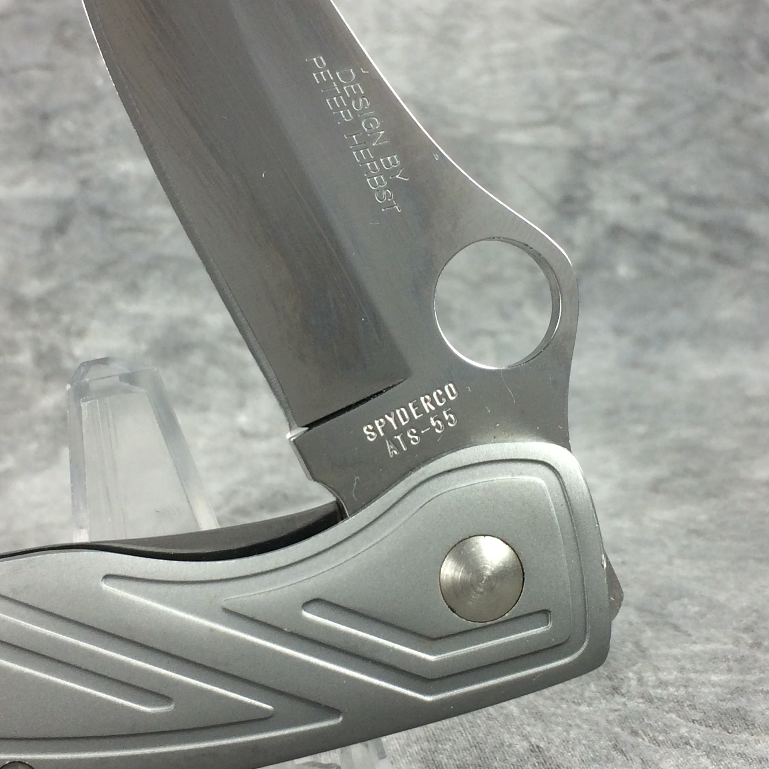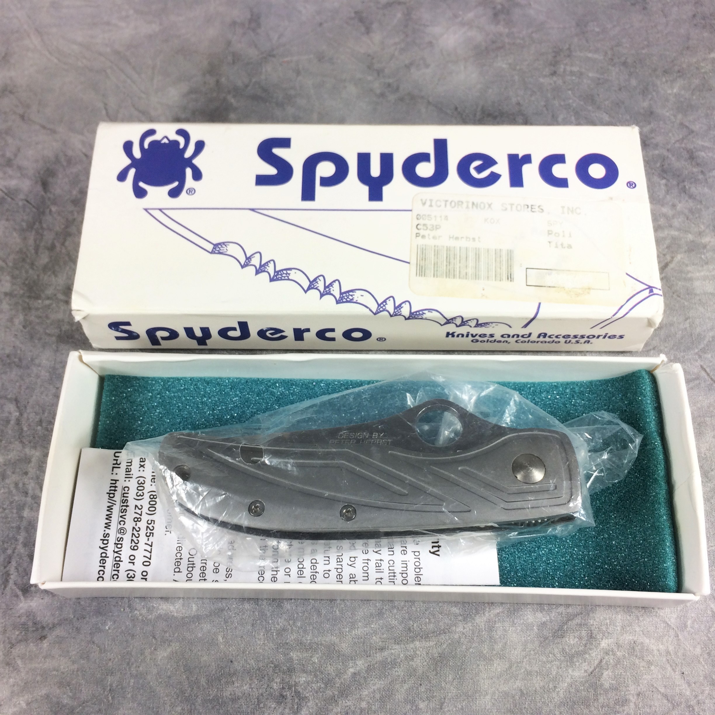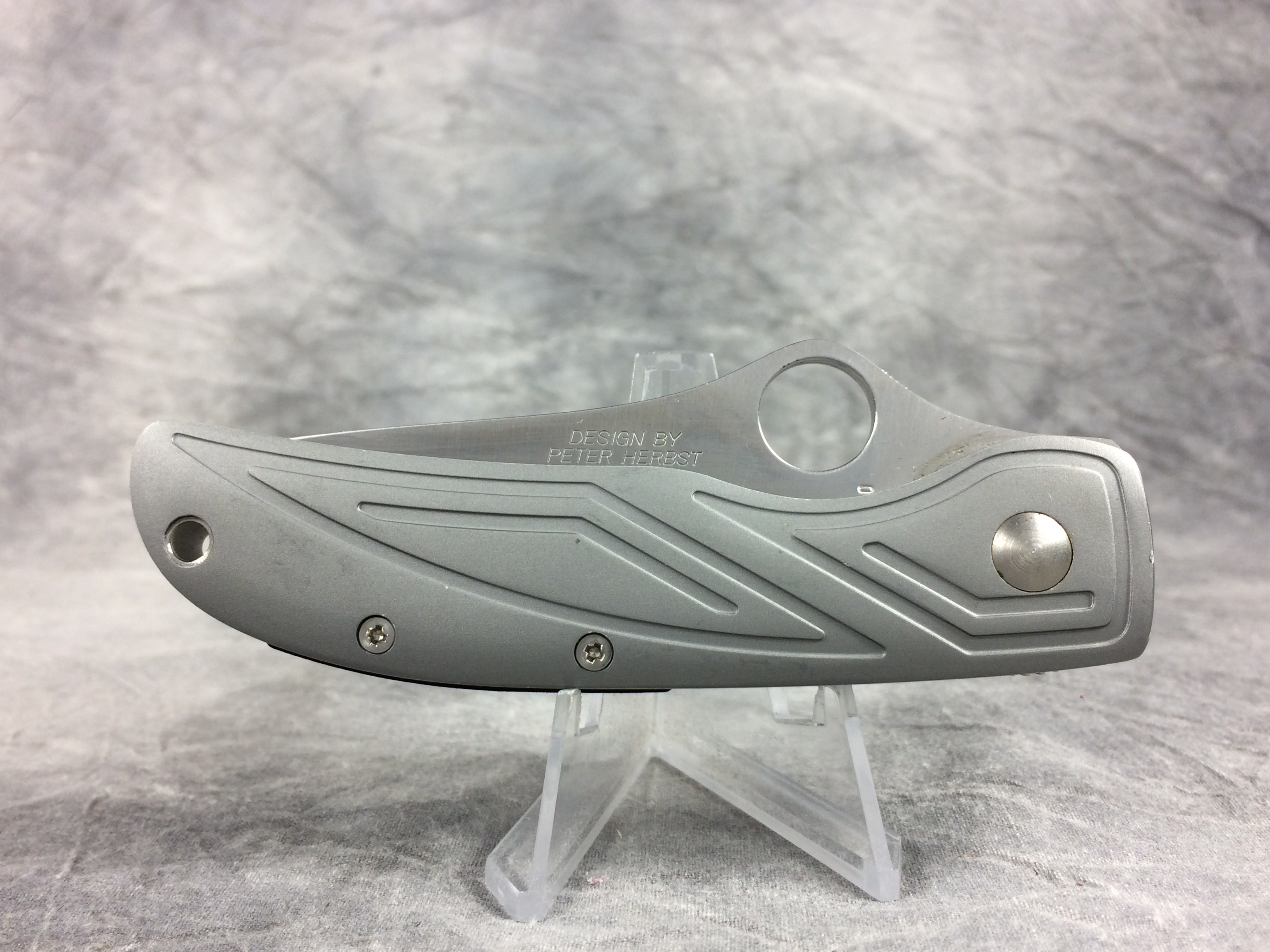 October 26, 2025 - Designed by German knifemaker PETER HERBST; this was the first Spyderco knife ever made in Germany. 4-3/32 inches closed. 7-5/32 inches open. Aluminum handle. "SPYDERCO ATS-55" and "SEKI-CITY JAPAN" tang stamps. Satin finish 440C stainless steel plain edge blade etched "DESIGN BY PETER HERBST". Clip etched with spider symbol. With original box and paperwork.