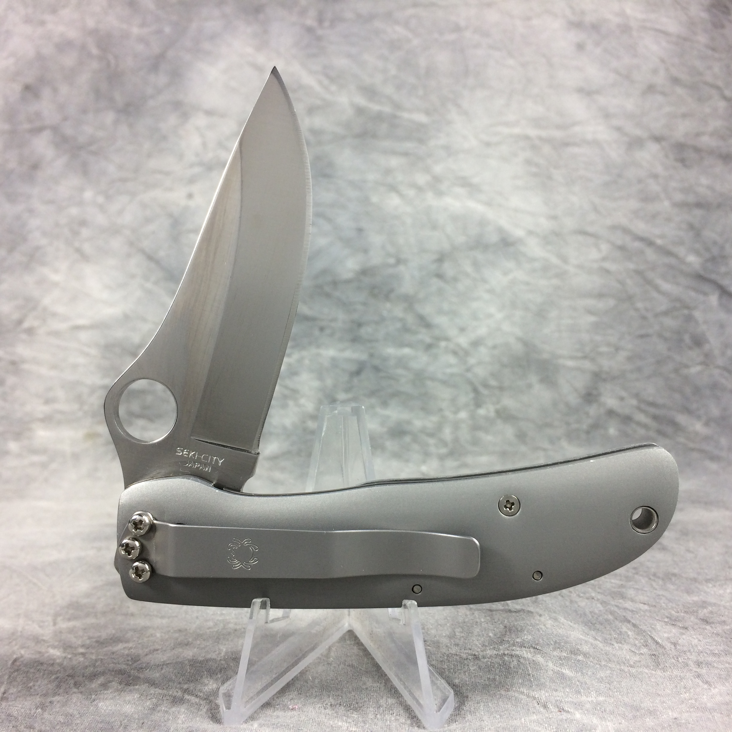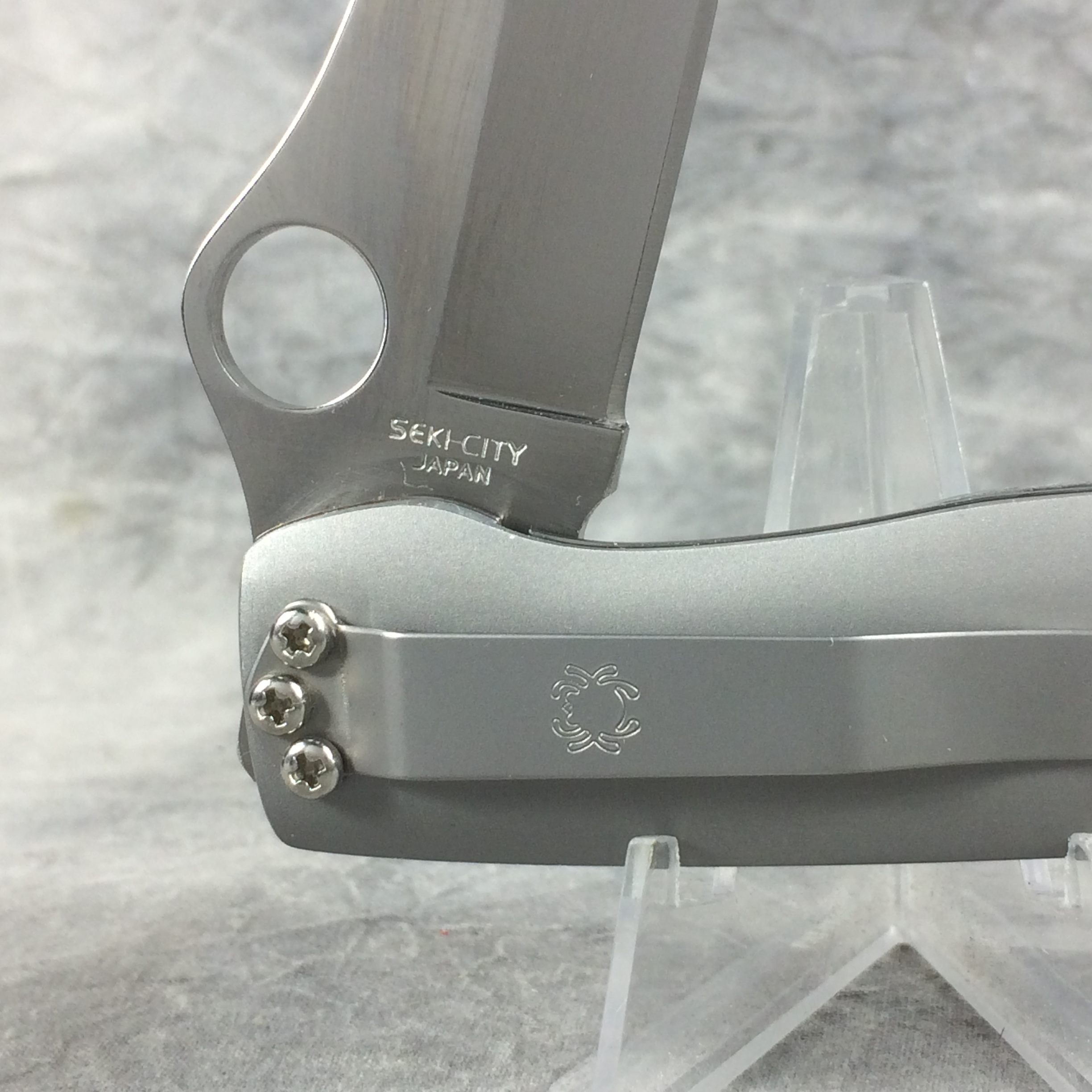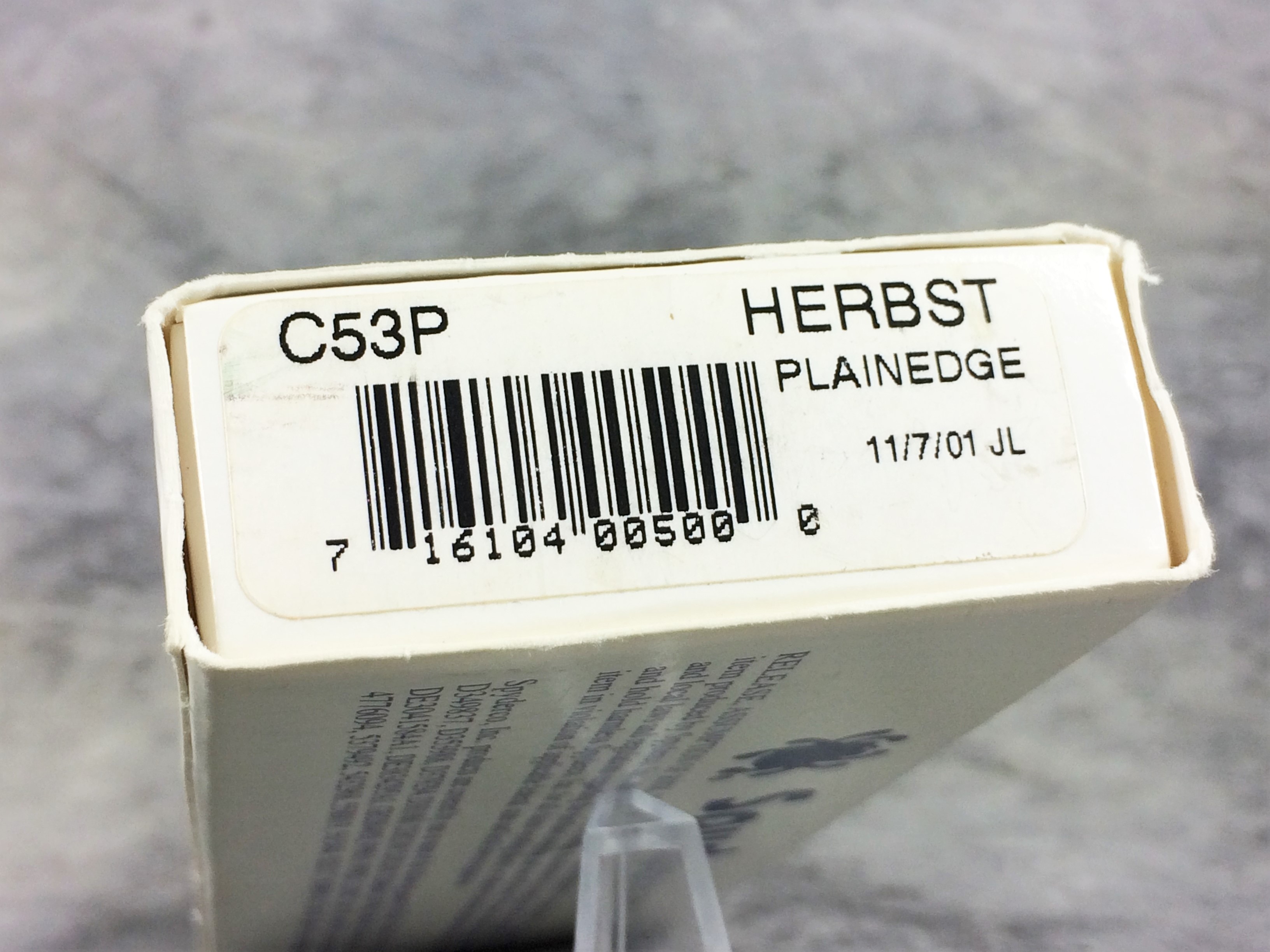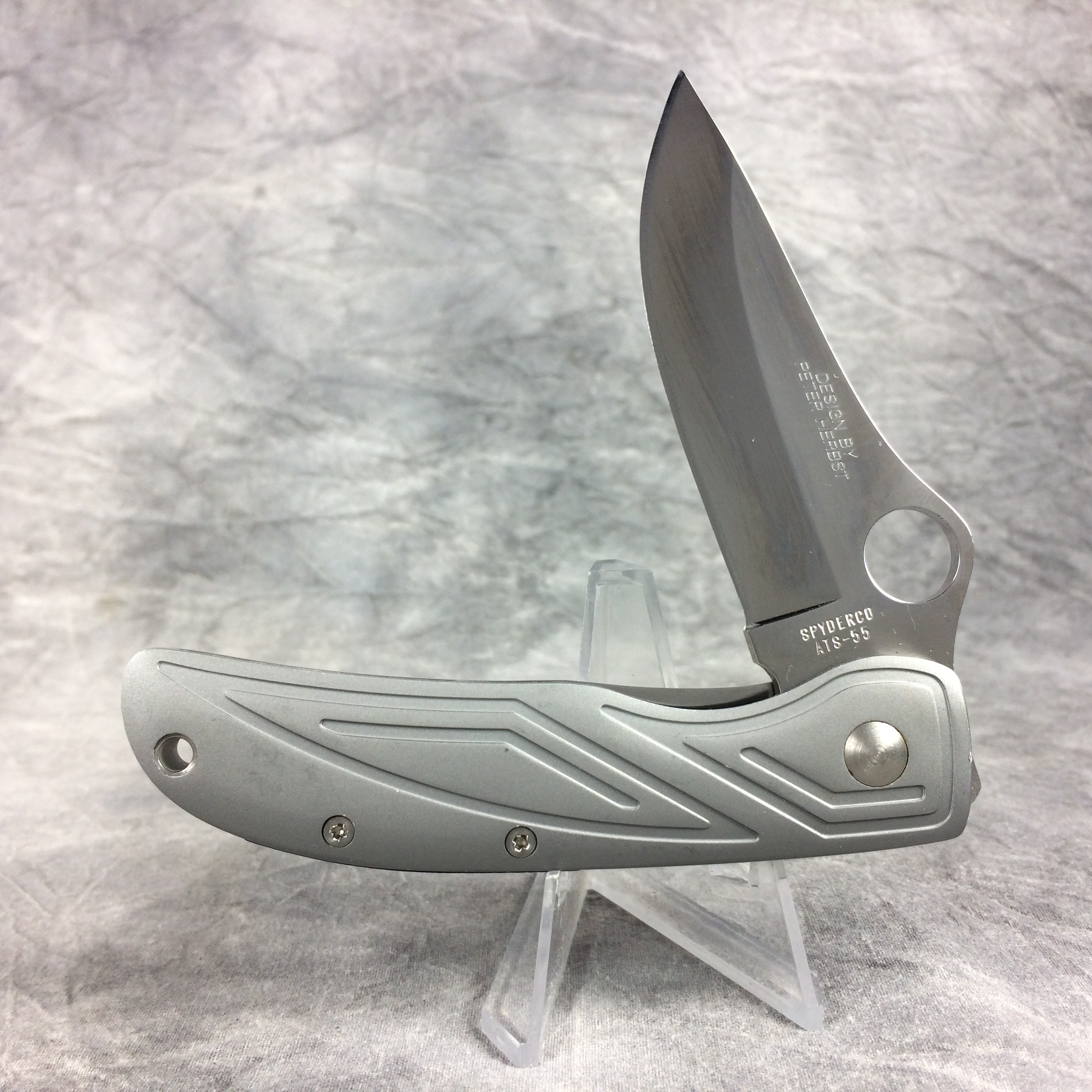 October 26, 2025 - Designed by German knifemaker PETER HERBST; this was the first Spyderco knife ever made in Germany. 4-3/32 inches closed. 7-5/32 inches open. Aluminum handle. "SPYDERCO ATS-55" and "SEKI-CITY JAPAN" tang stamps. Satin finish 440C stainless steel plain edge blade etched "DESIGN BY PETER HERBST". Clip etched with spider symbol. With original box and paperwork.