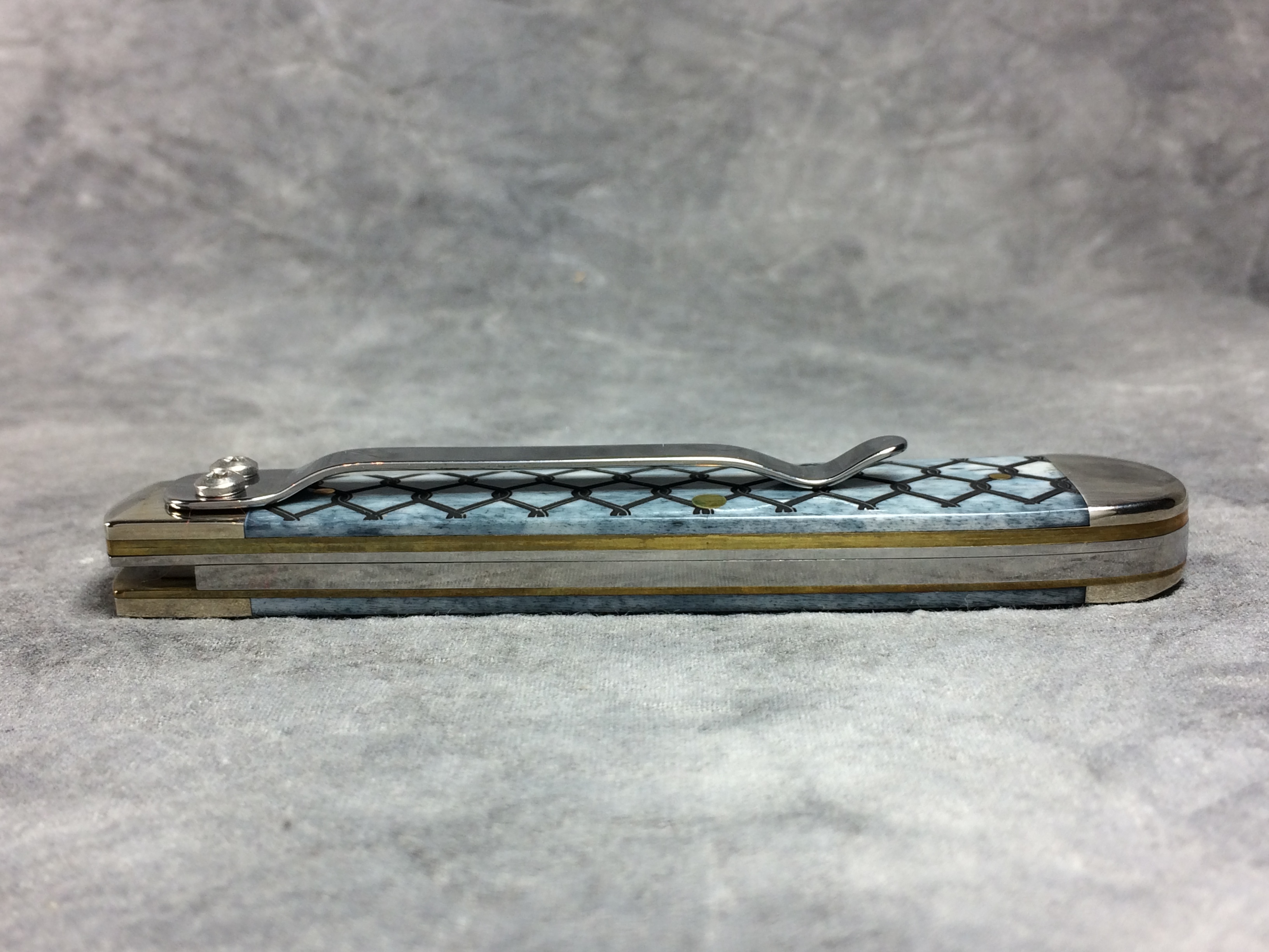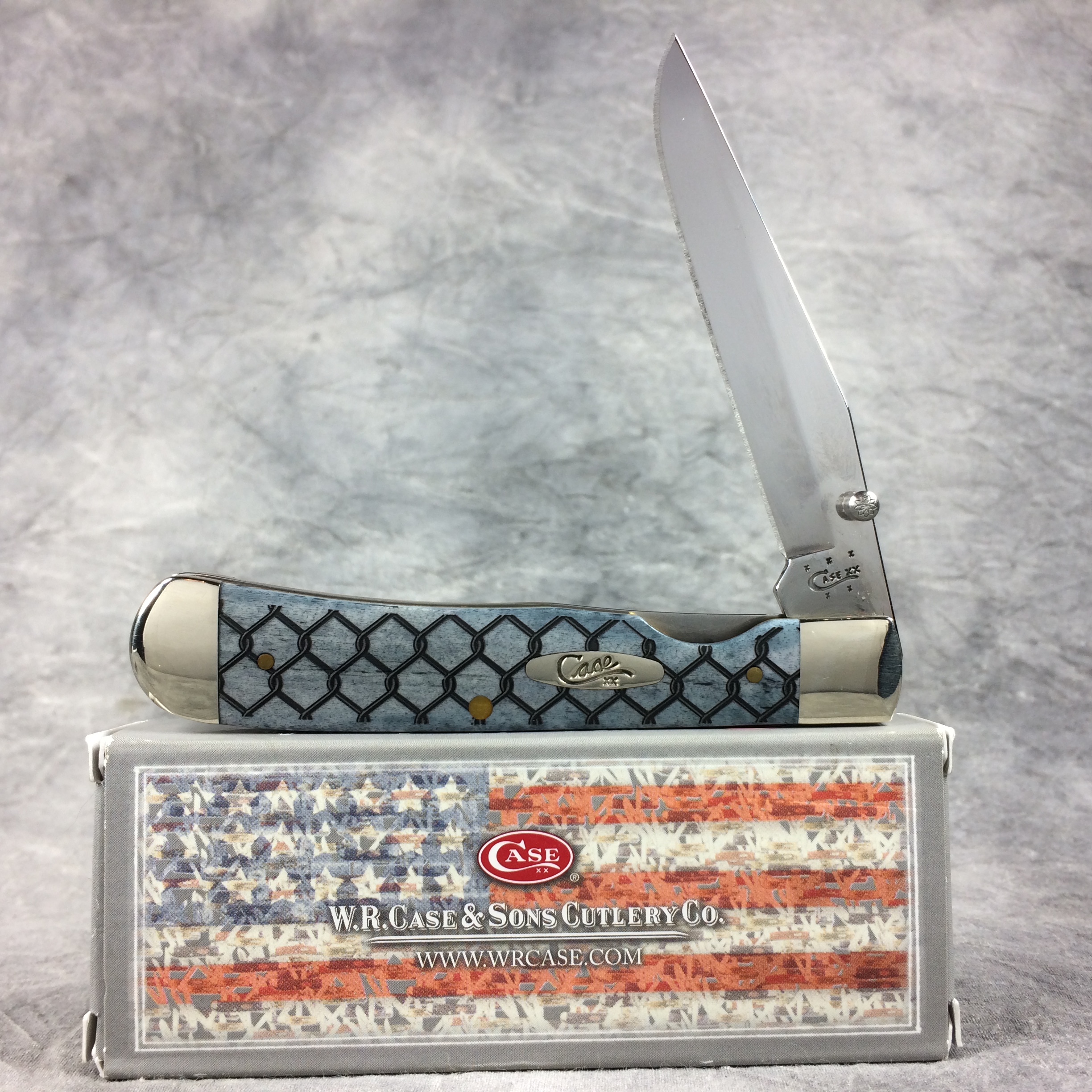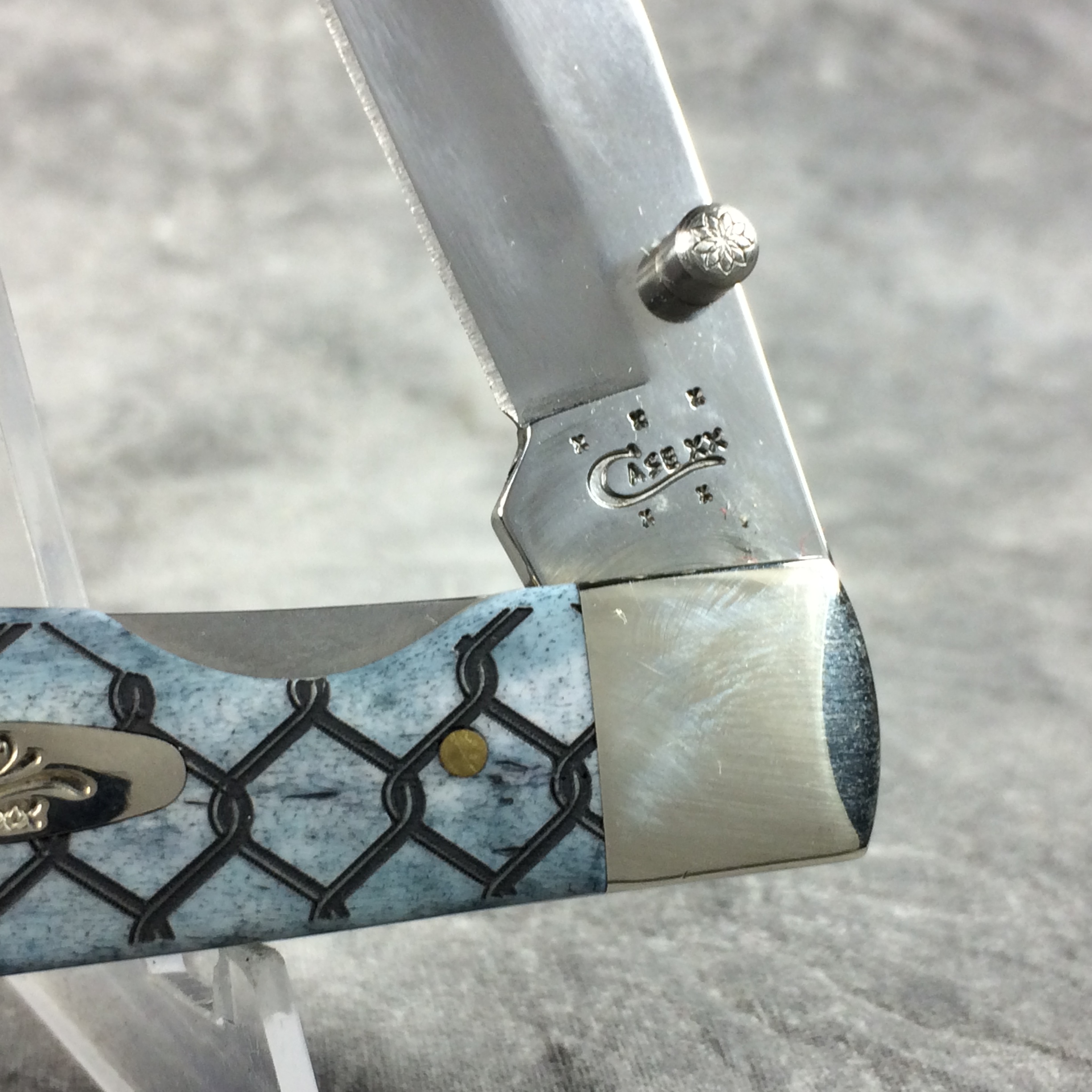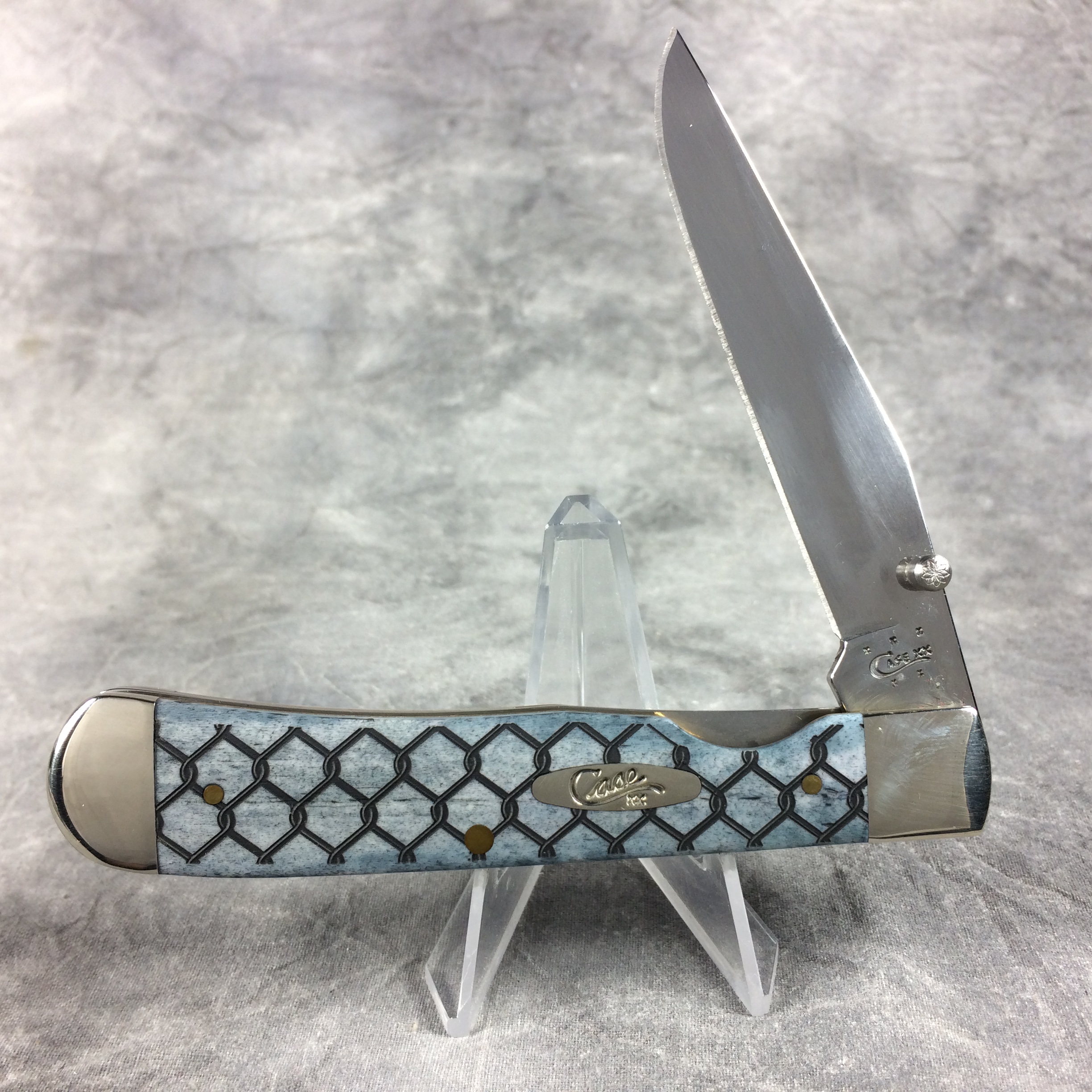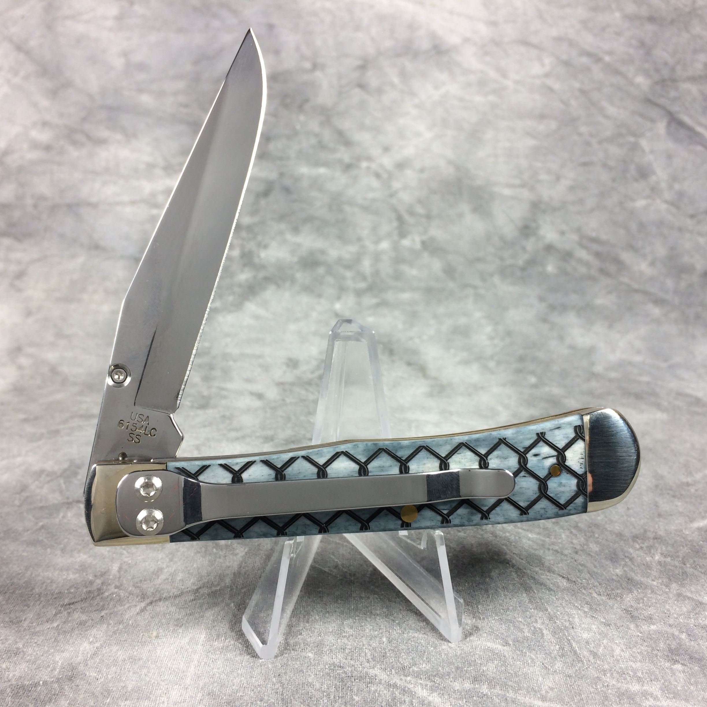 December 25, 2025 - 4-1/8 inches closed. 7-1/4 inches open. Made in USA. "  x x x  Case XX   x x  " (with lightning bolt S) and "USA 6154 LC SS" tang stamps. Oval long-C script "Case xx" shield. Stainless Steel blade. Smooth Gray Bone handle with chain link laser-etch design. Nickel Silver bolsters. Brass liner.