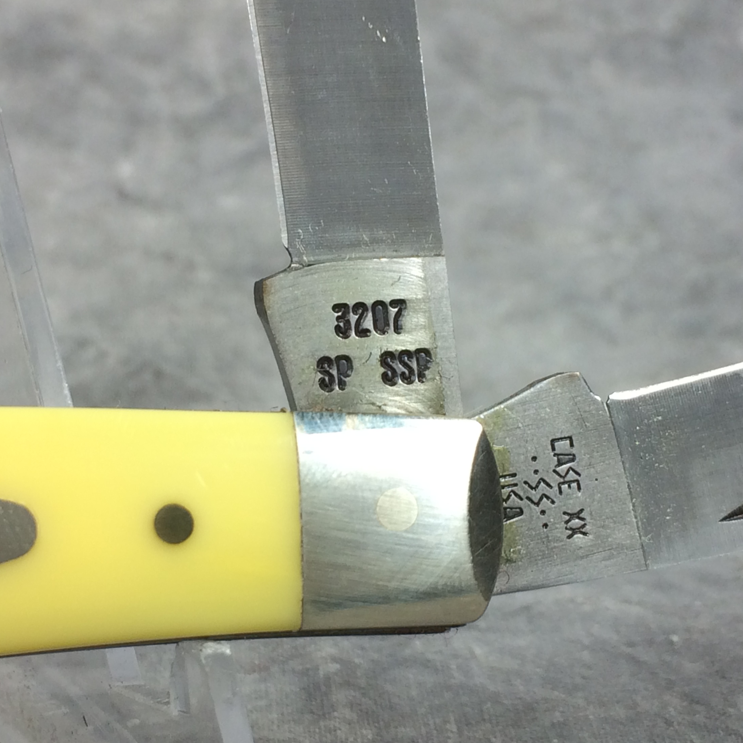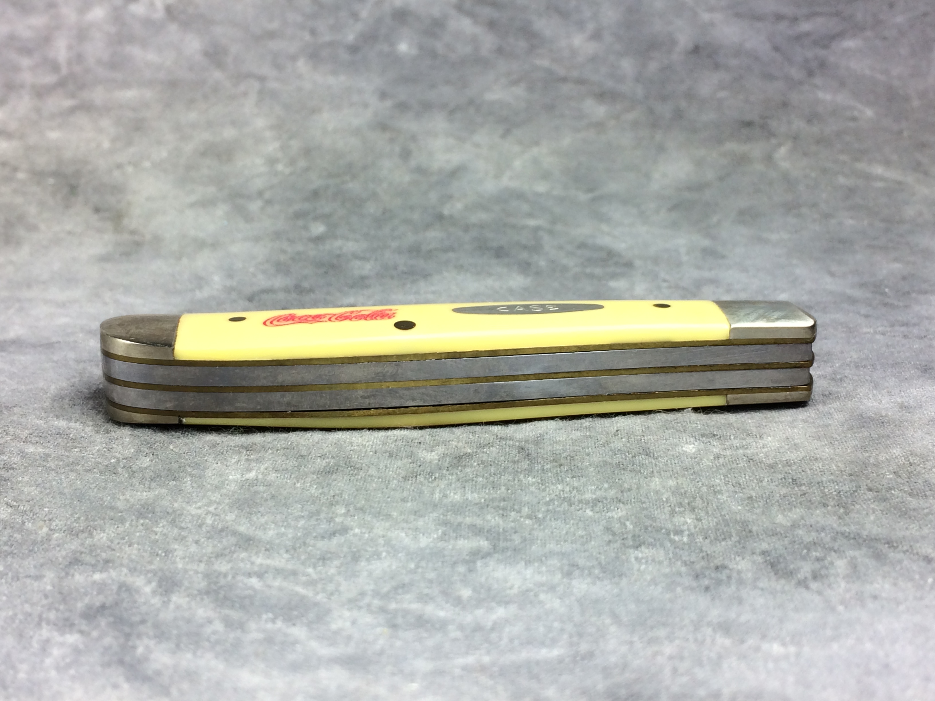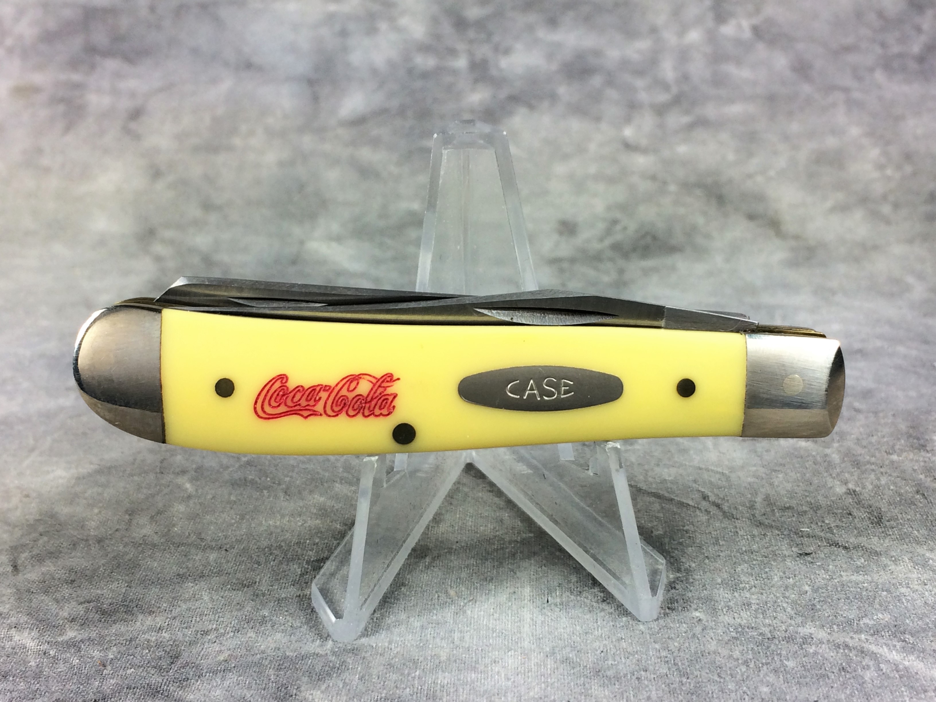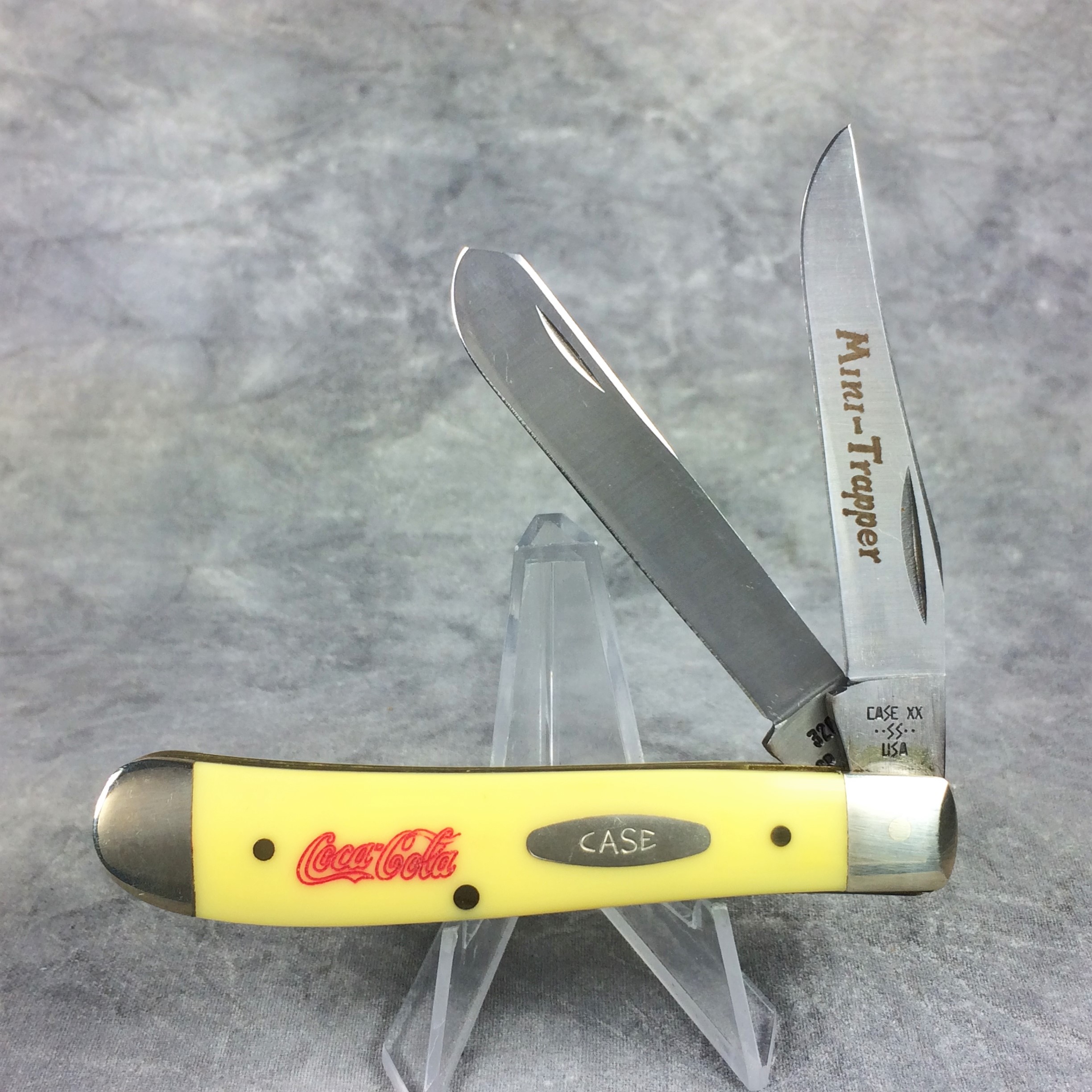 February 03, 2026 - 3-1/2 inches closed. 6-1/4 inches open. Made in USA. "CASE XX **SS** USA" (4 dot with lightning bolt S) and "3207 SP SSP" tang stamps. Single oval 'Open C' CASE shield. Stainless steel blades. Main blade etched with "Mini-Trapper". Yellow composition handle embellished with Coca-Cola logo. Nickel Silver bolsters. Brass liner.