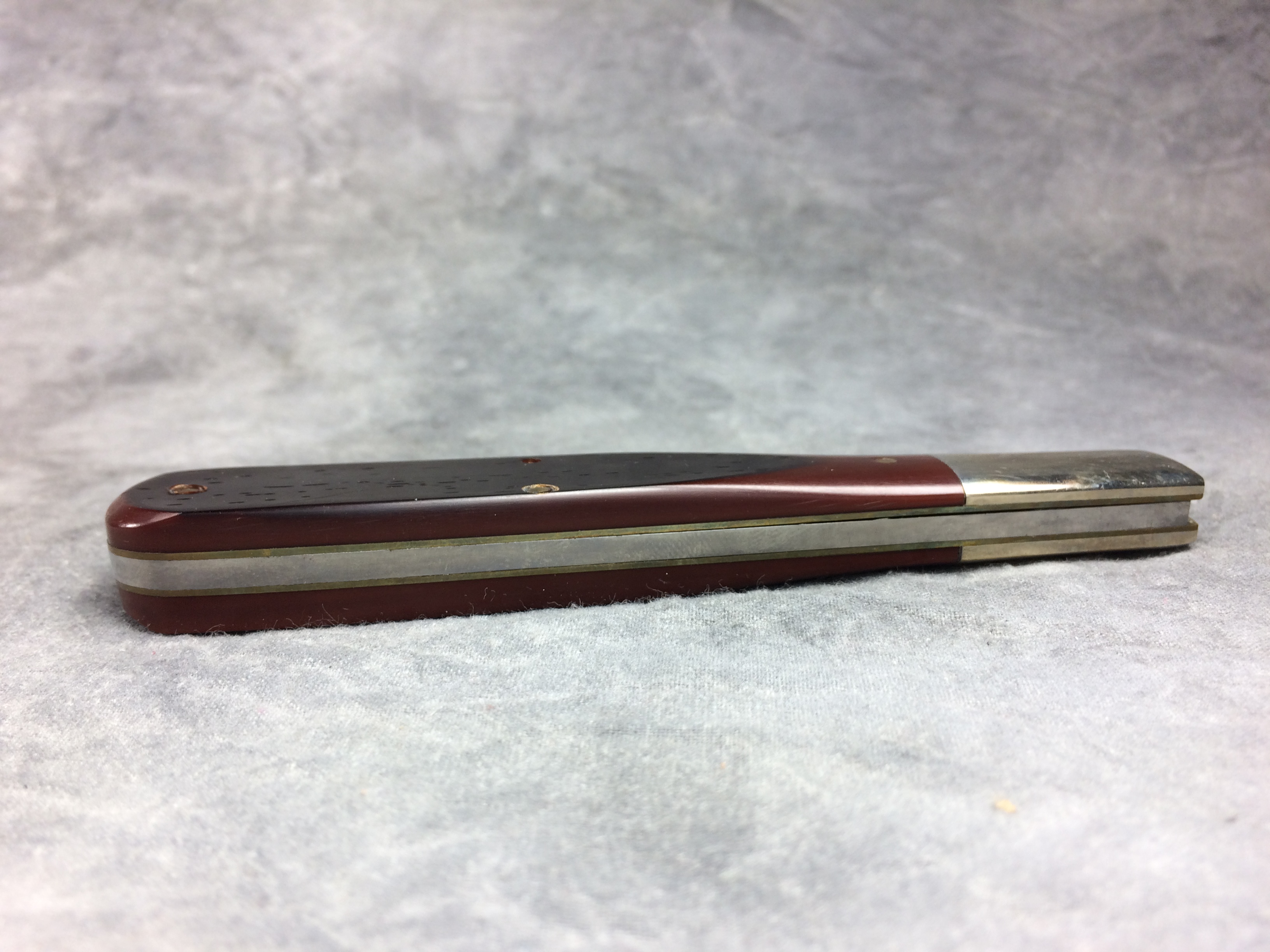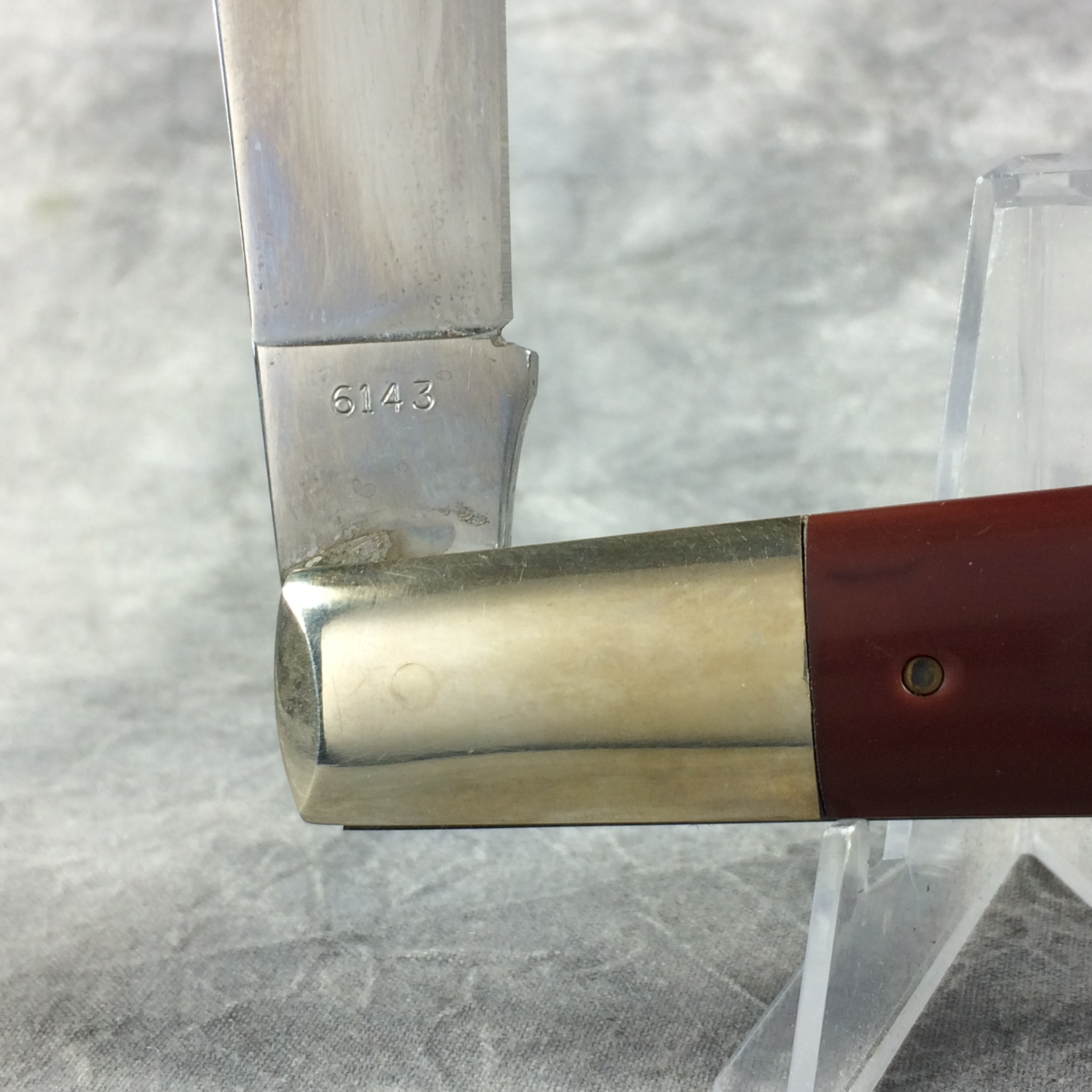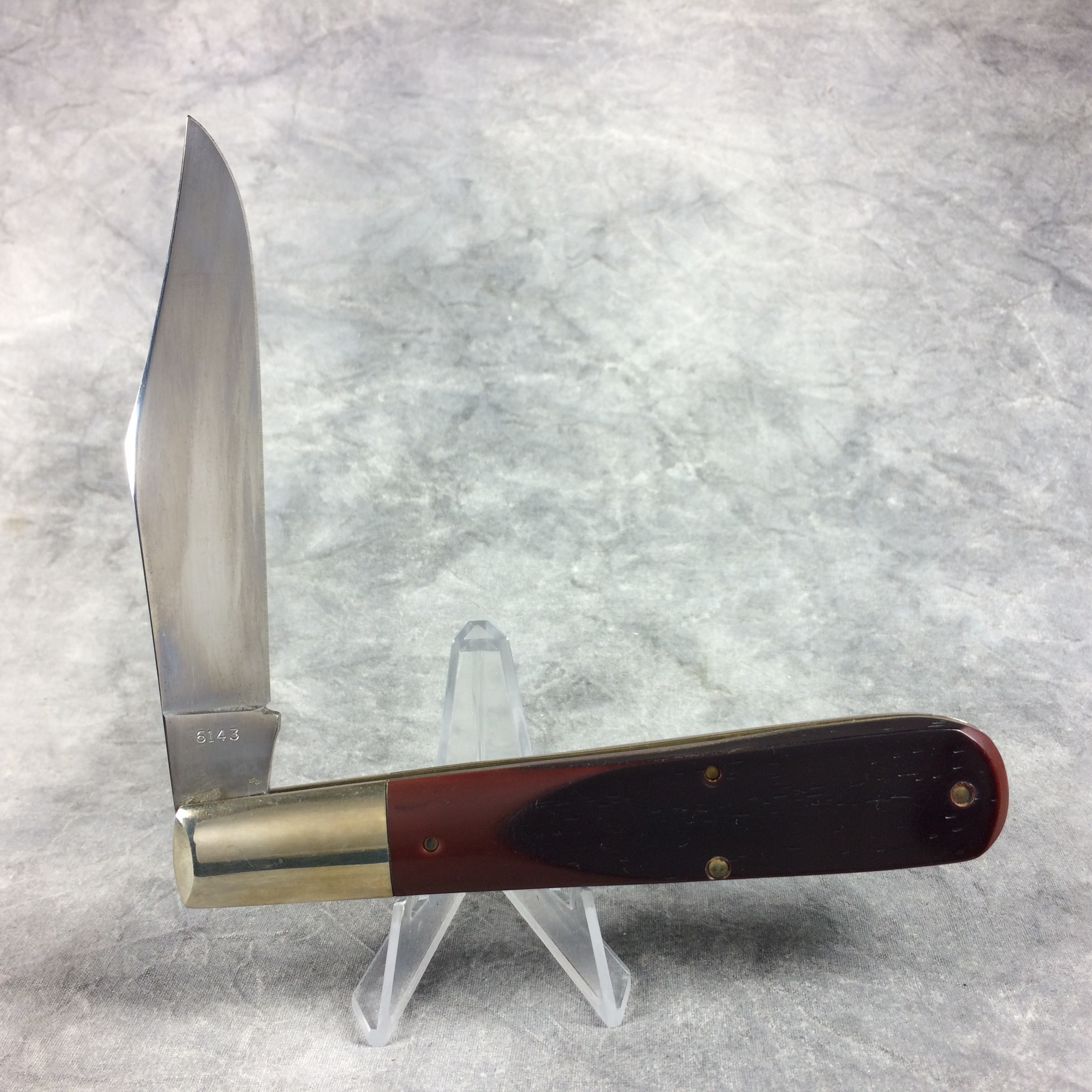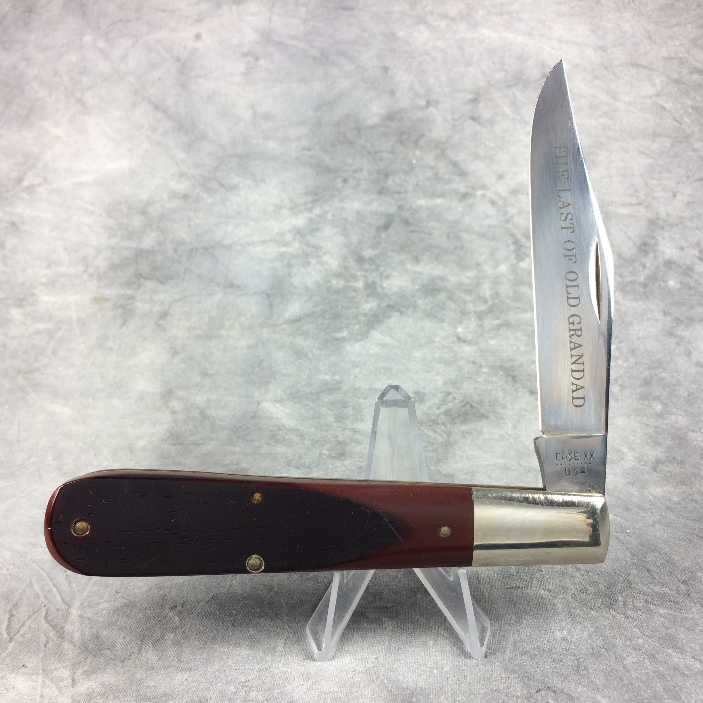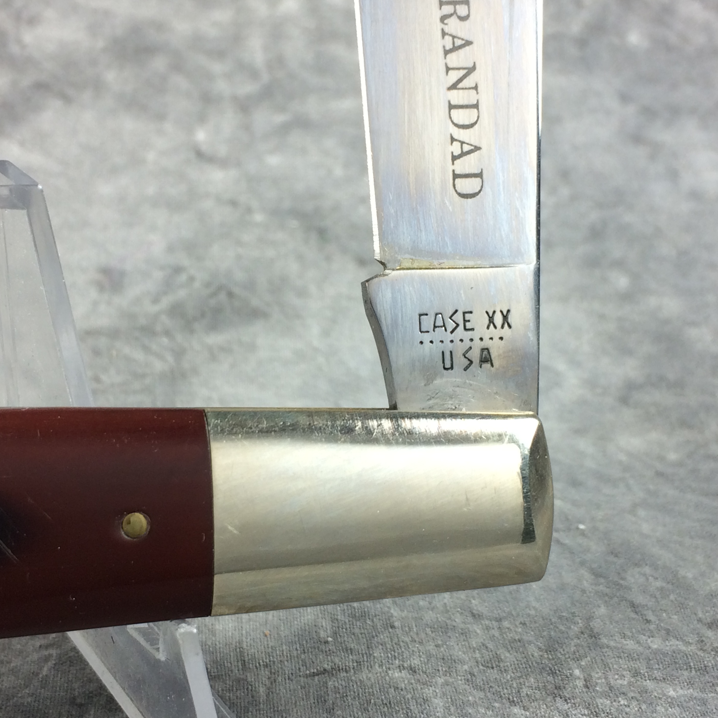 October 26, 2025 - 5 inches closed. 8-7/8 inches open. Made in USA. "CASE XX ********* USA " (9 dot with lightning bolt S) and "6143" tang stamps. Chrome vanadium blade etched "THE LAST OF OLD GRANDAD". Brown delrin handle. Nickel silver bolsters and brass liner.