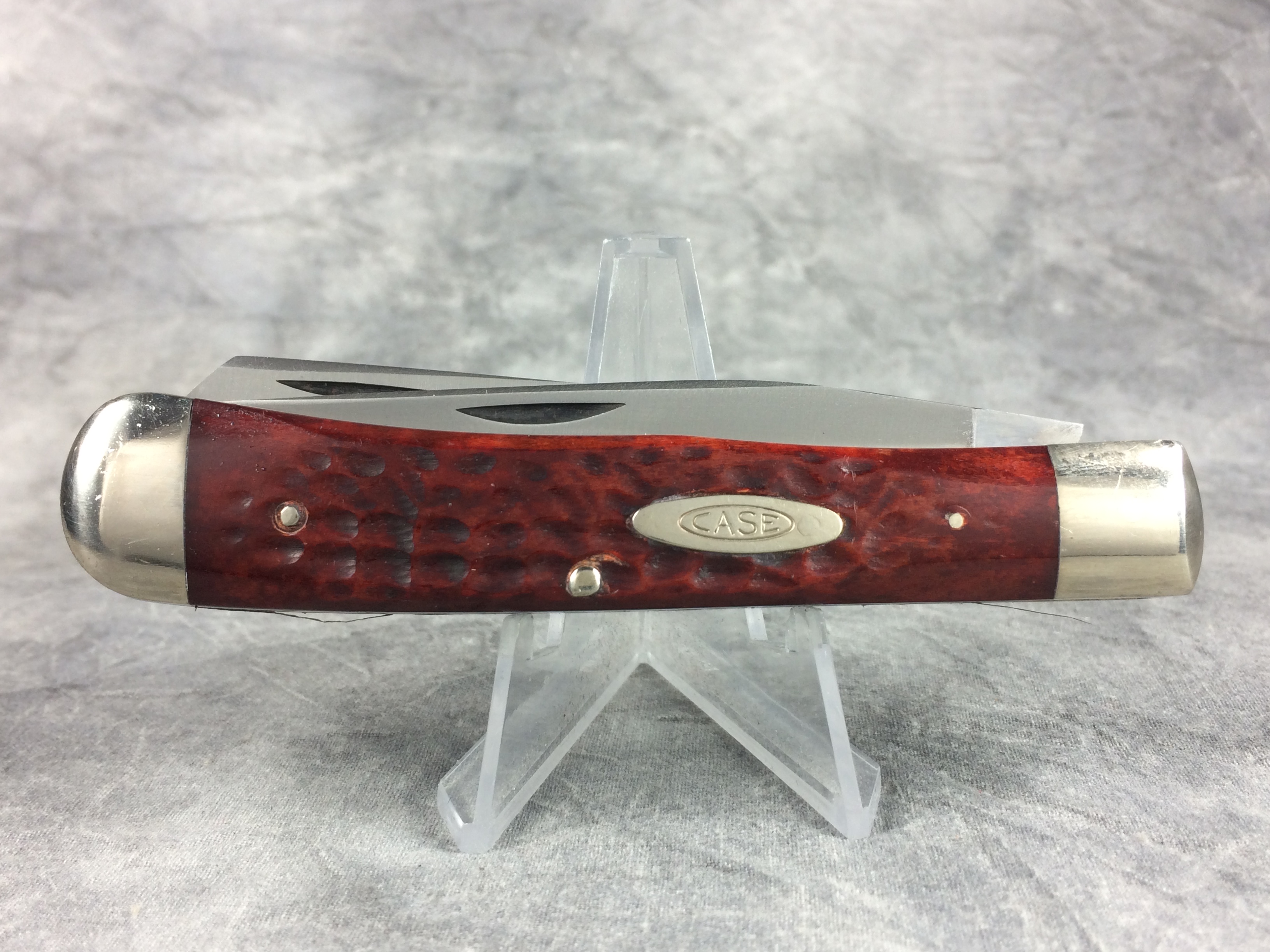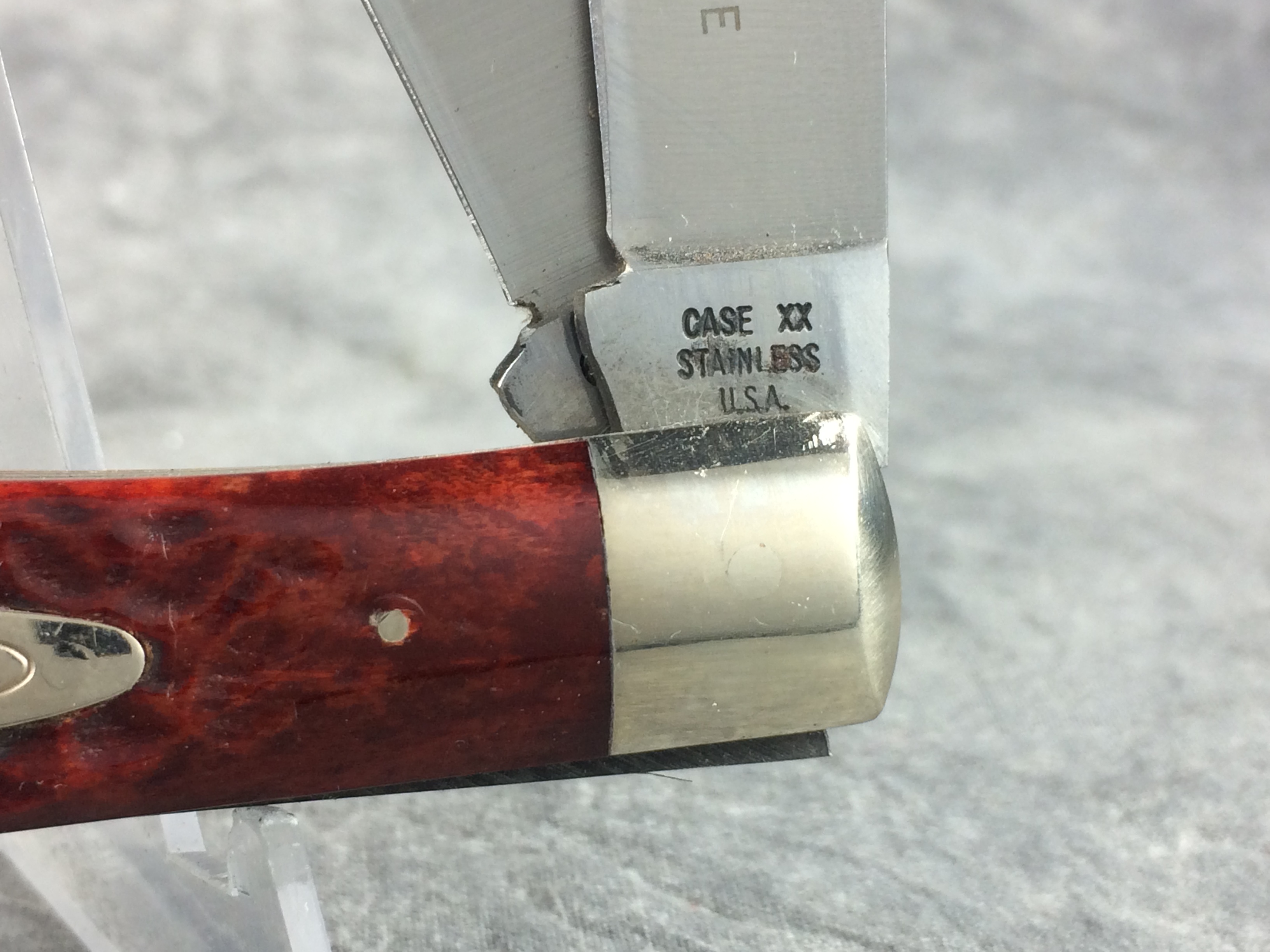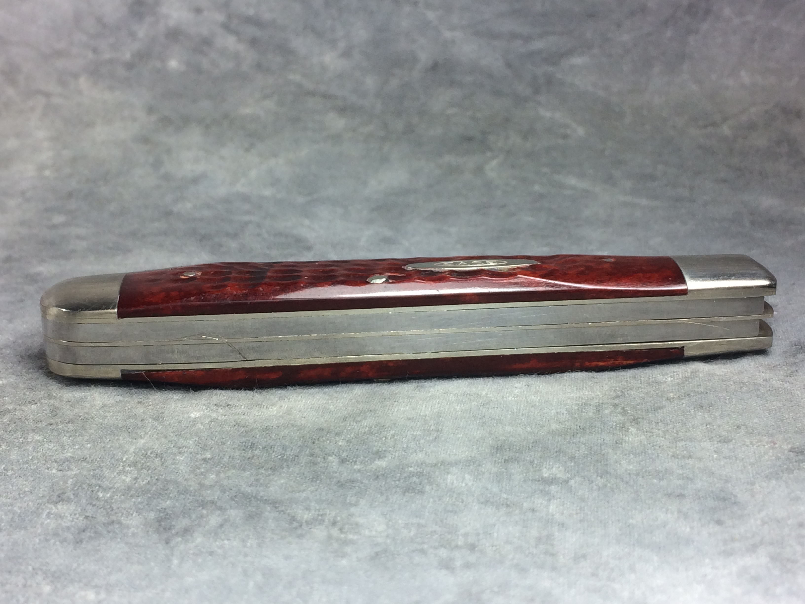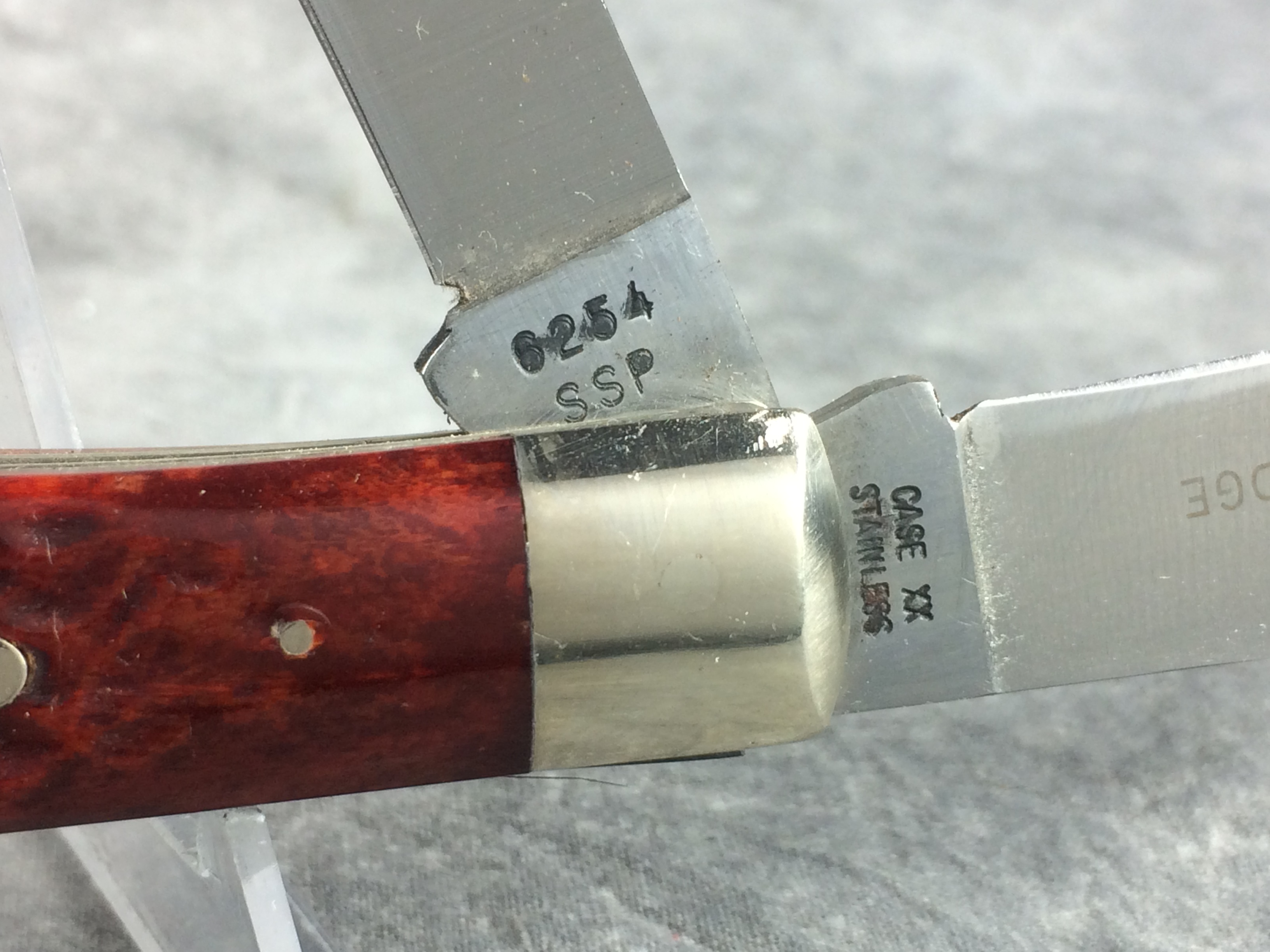 December 04, 2025 - 4-1/8 inches closed. 7-3/8 inches open. Made in USA. "CASE XX STAINLESS U.S.A. ******* " (7 dot - not all dots are visible, but based on position, there appear to be 7 dots) and "6254 SSP" tang stamps. Double oval open-C "CASE" shield. Stainless steel blades. Master blade stamped "TESTED XX RAZOR EDGE". Red/brown jigged bone handle. Nickel Silver bolsters. Brass liner.