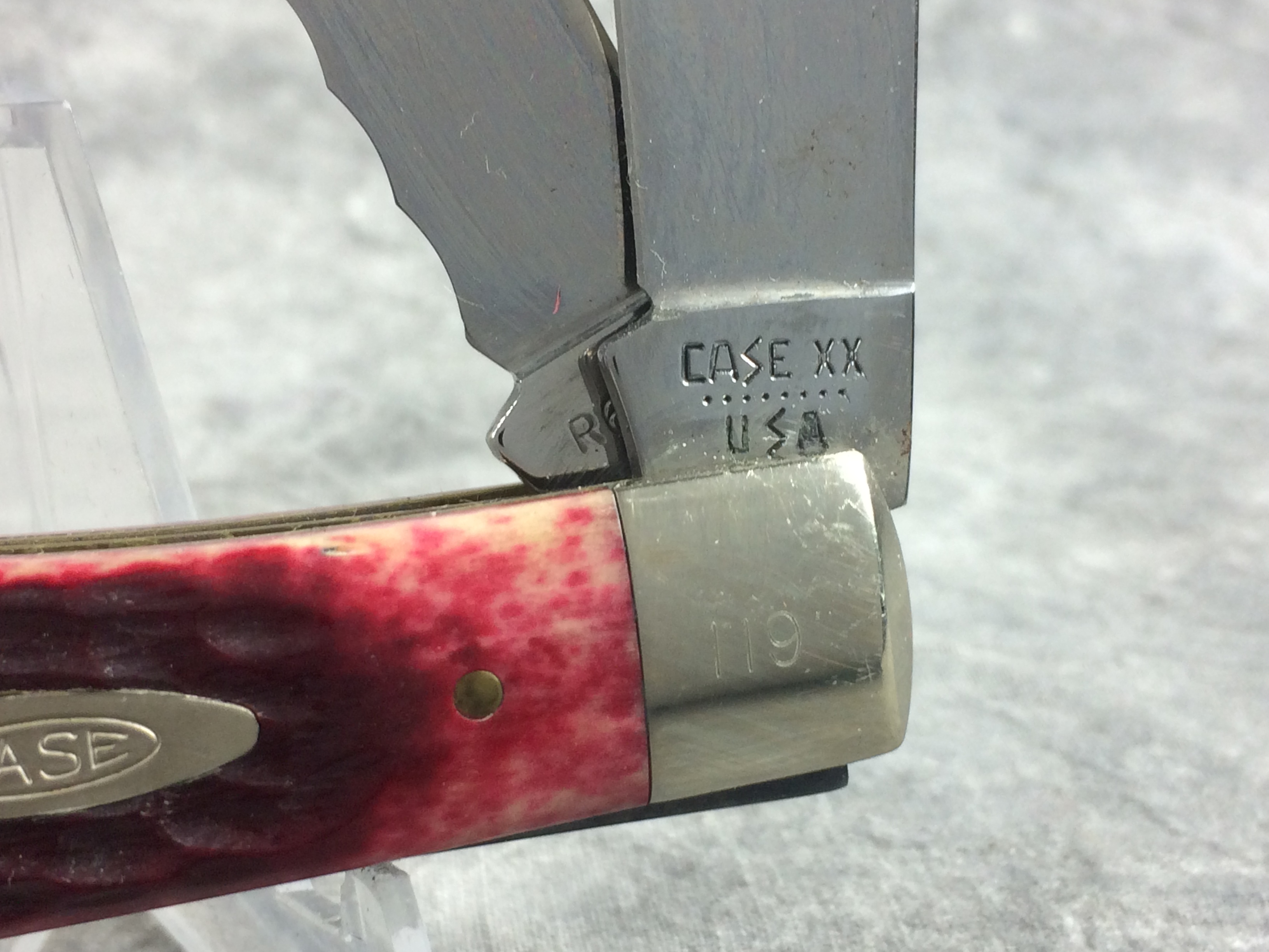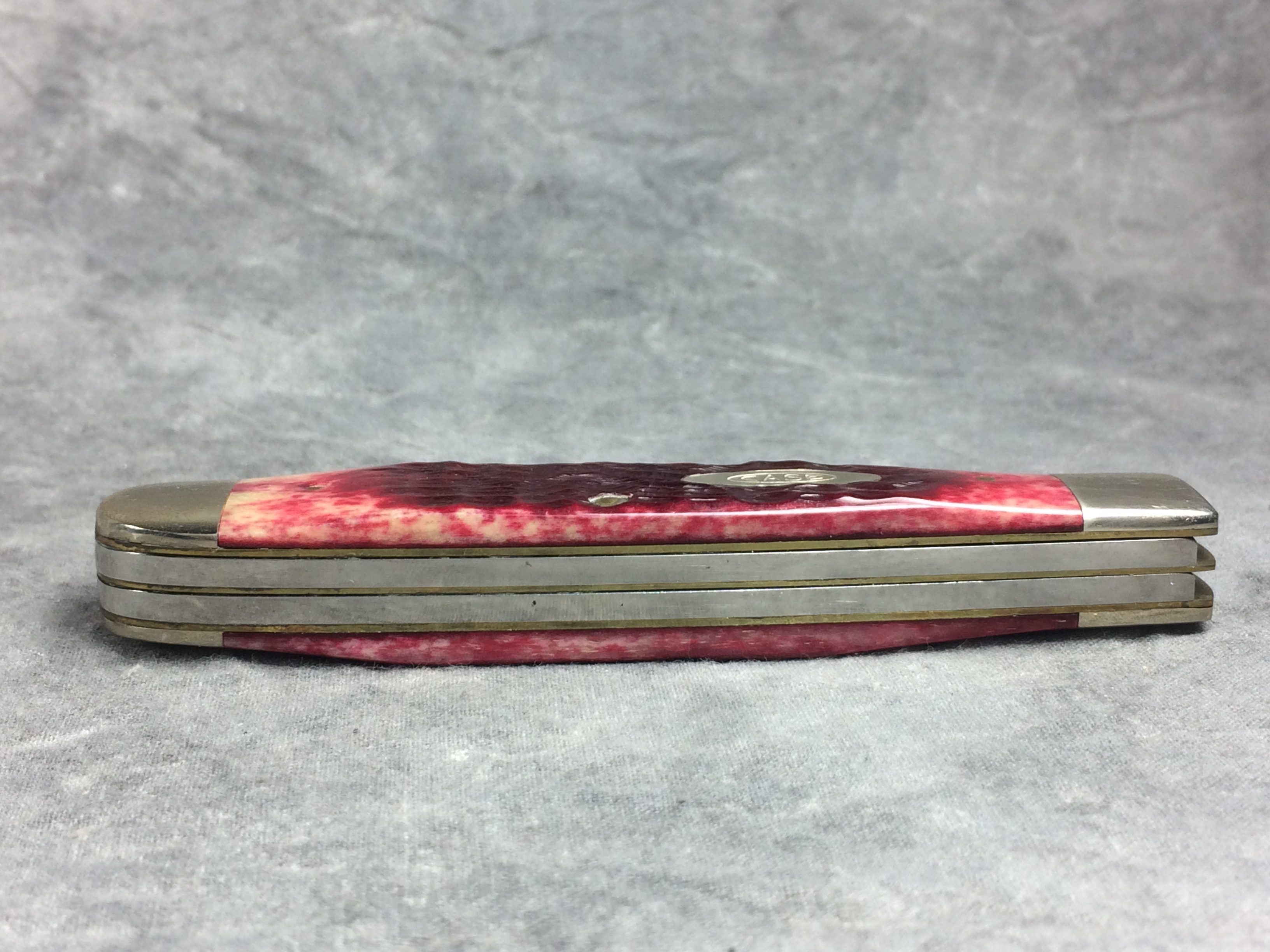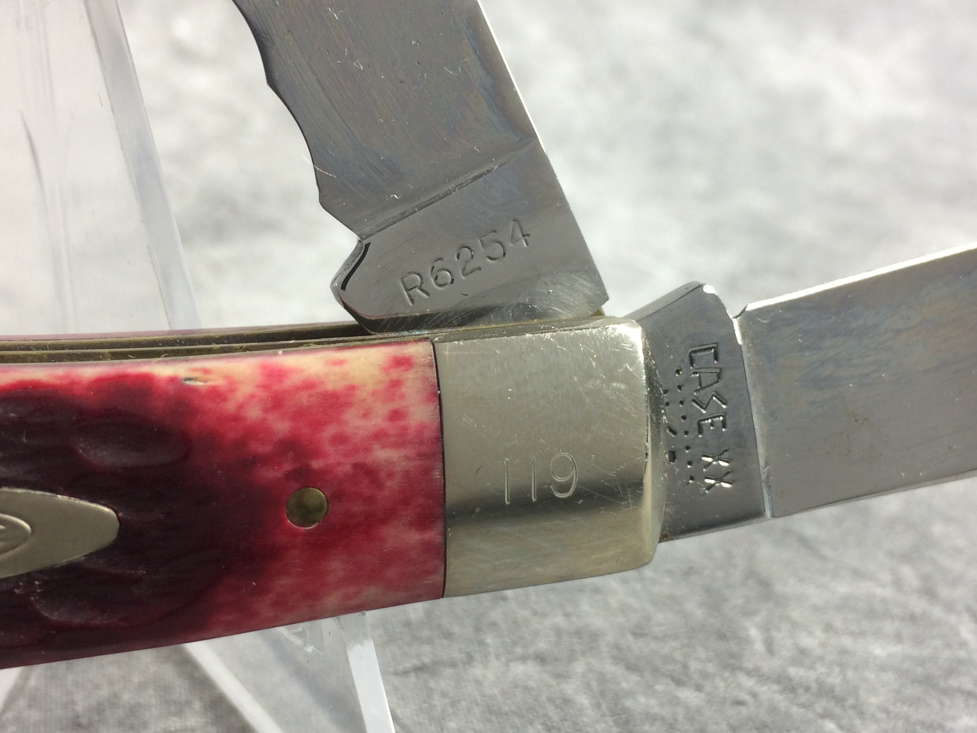 December 04, 2025 - 4-1/8 inches closed. 7-3/8 inches open. Made in USA. "CASE XX ******** USA" (8 dot with lightning bolt S) and "R6254" tang stamps. Double oval open C "CASE" shield. Chrome Vanadium blades - serrated spey blade. Red jigged bone handles. Nickel Silver bolsters. Front right bolster etched with serial . Brass liner.