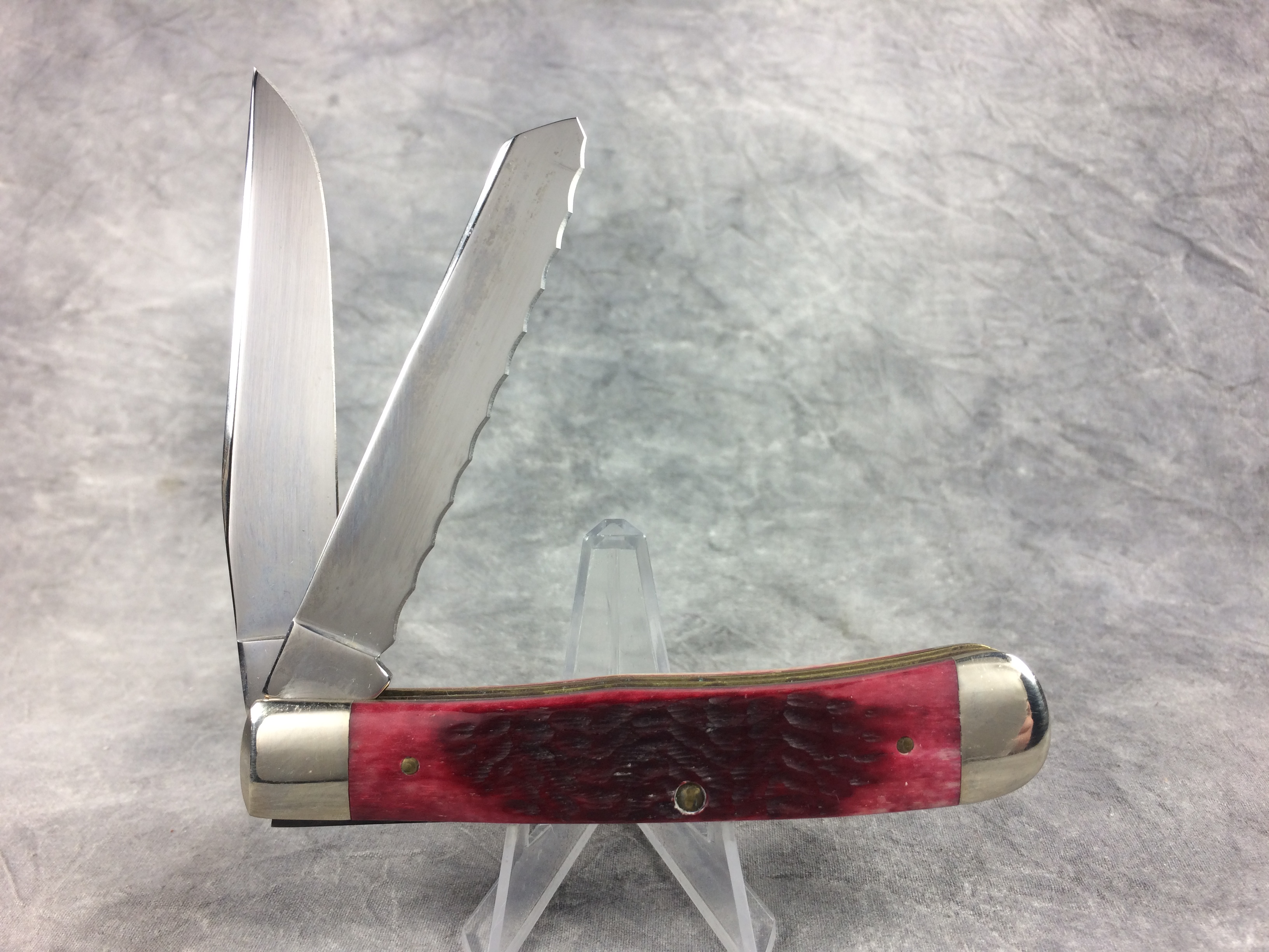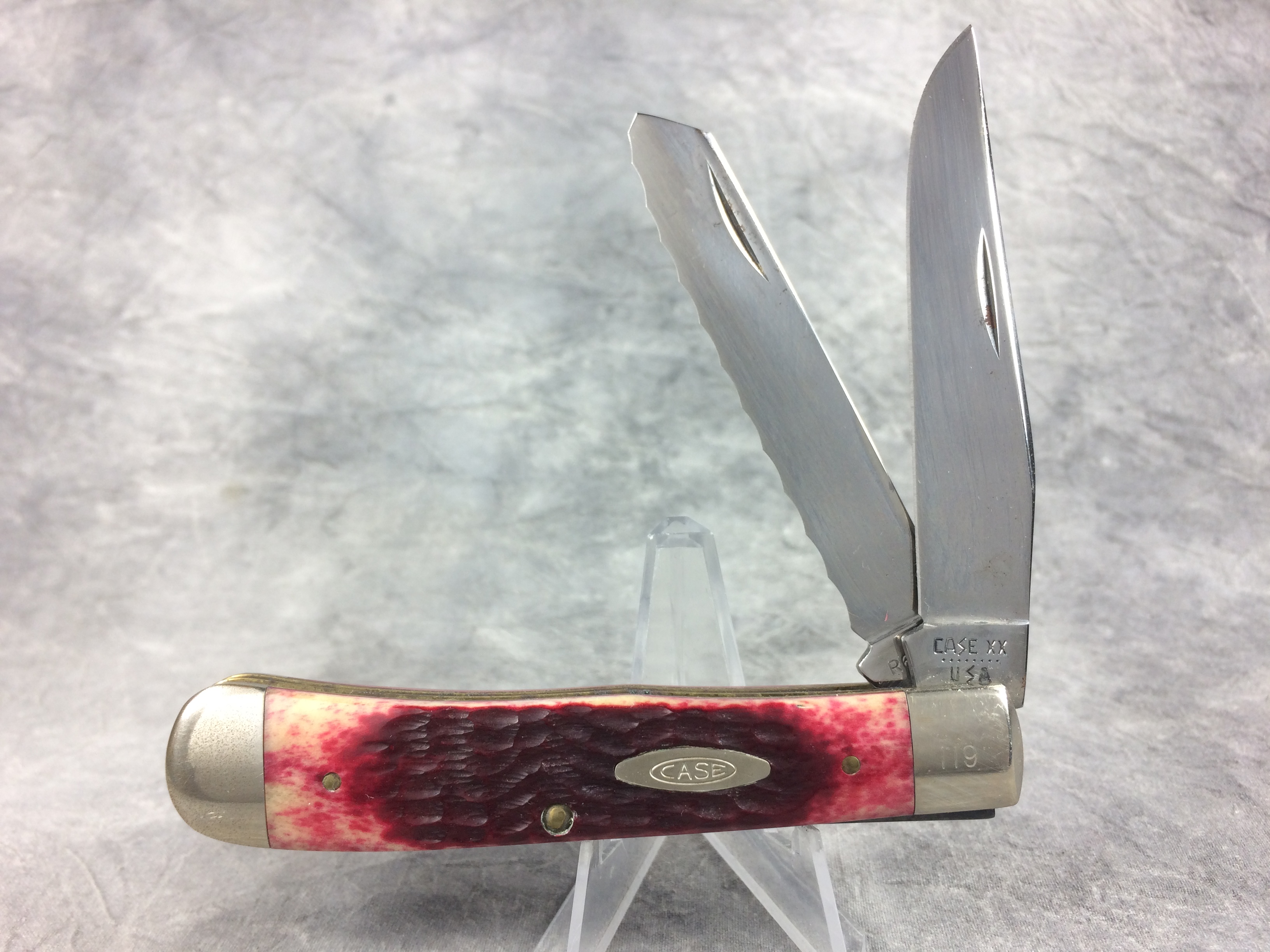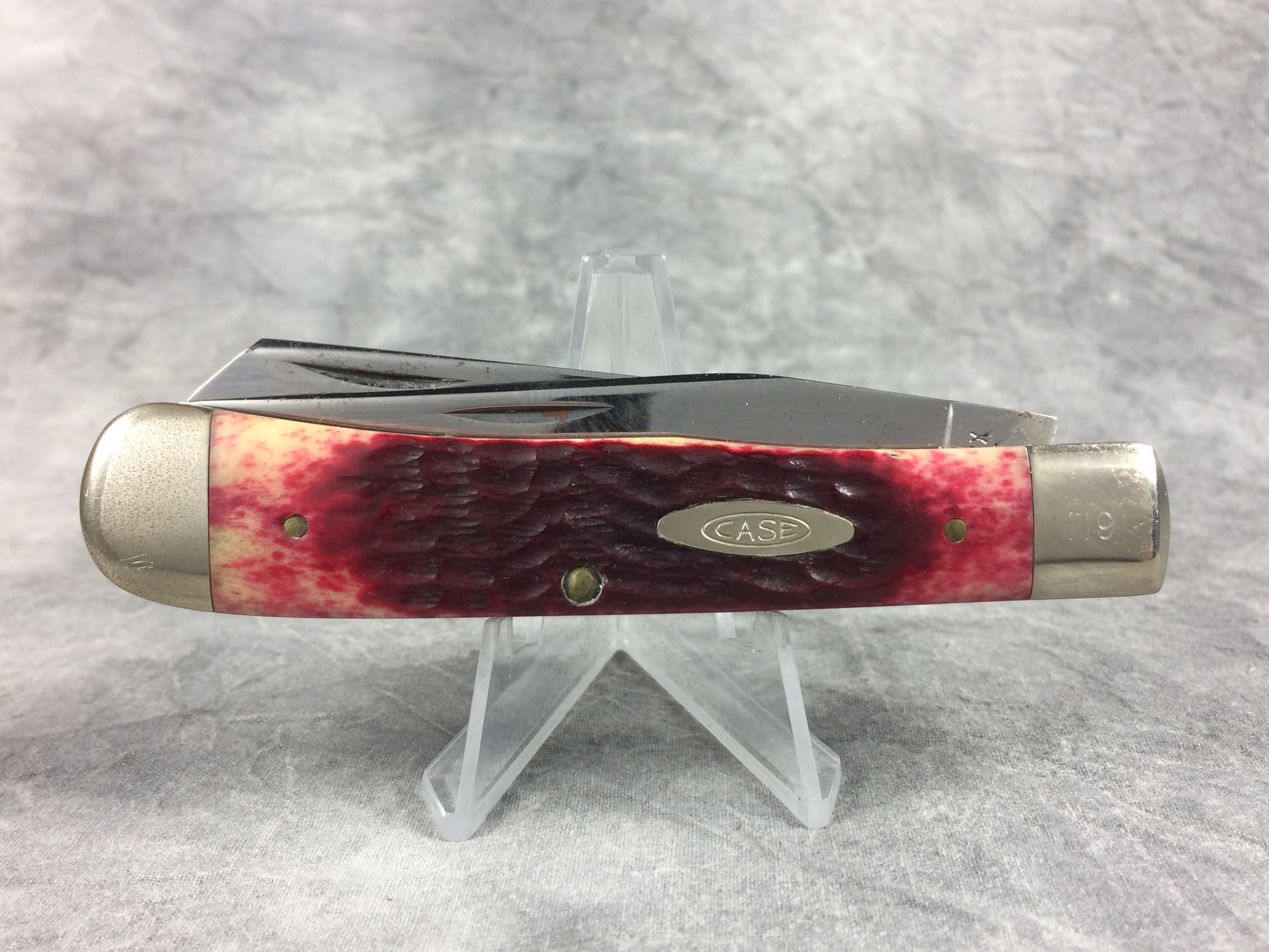 December 04, 2025 - 4-1/8 inches closed. 7-3/8 inches open. Made in USA. "CASE XX ******** USA" (8 dot with lightning bolt S) and "R6254" tang stamps. Double oval open C "CASE" shield. Chrome Vanadium blades - serrated spey blade. Red jigged bone handles. Nickel Silver bolsters. Front right bolster etched with serial . Brass liner.