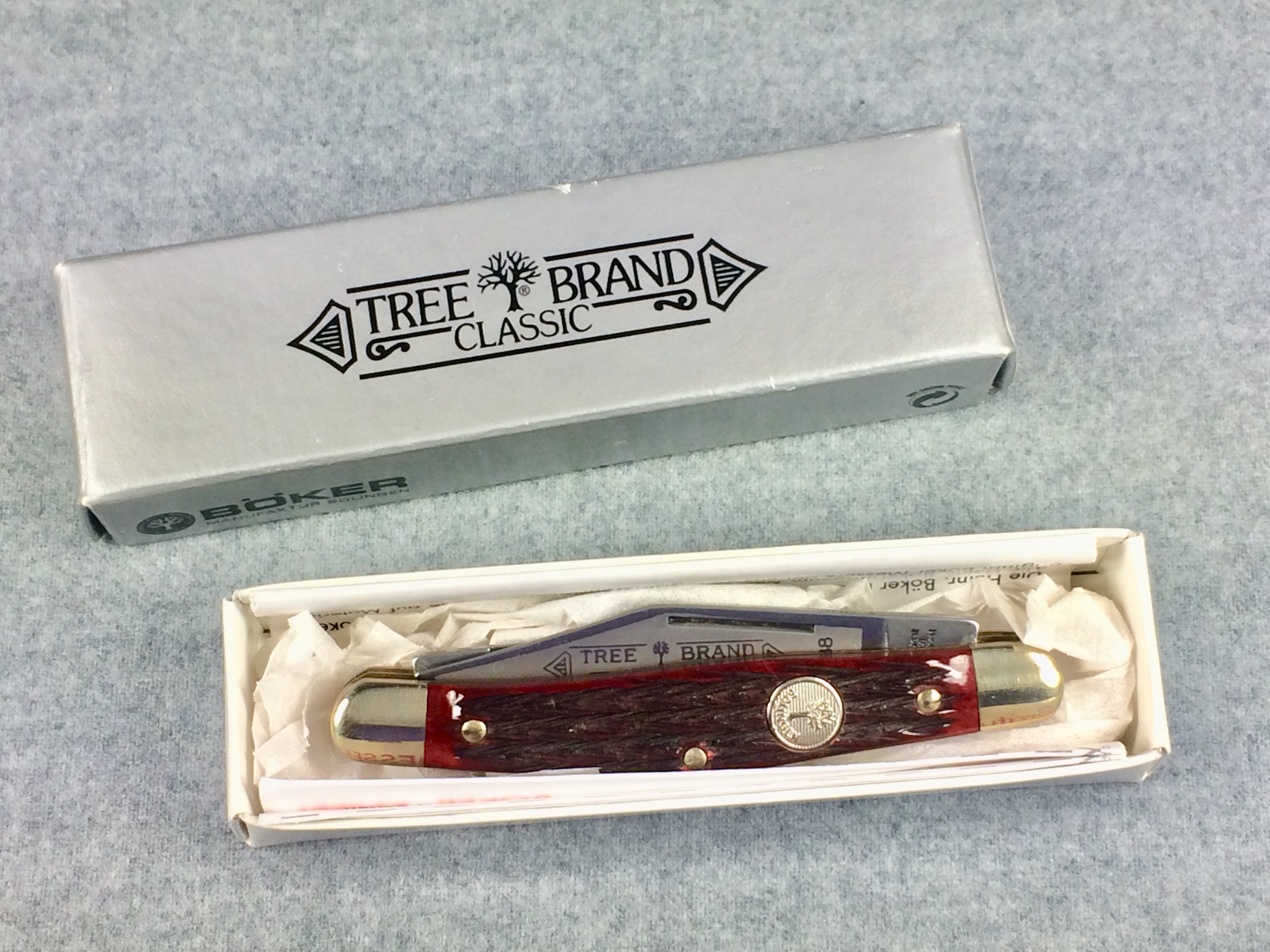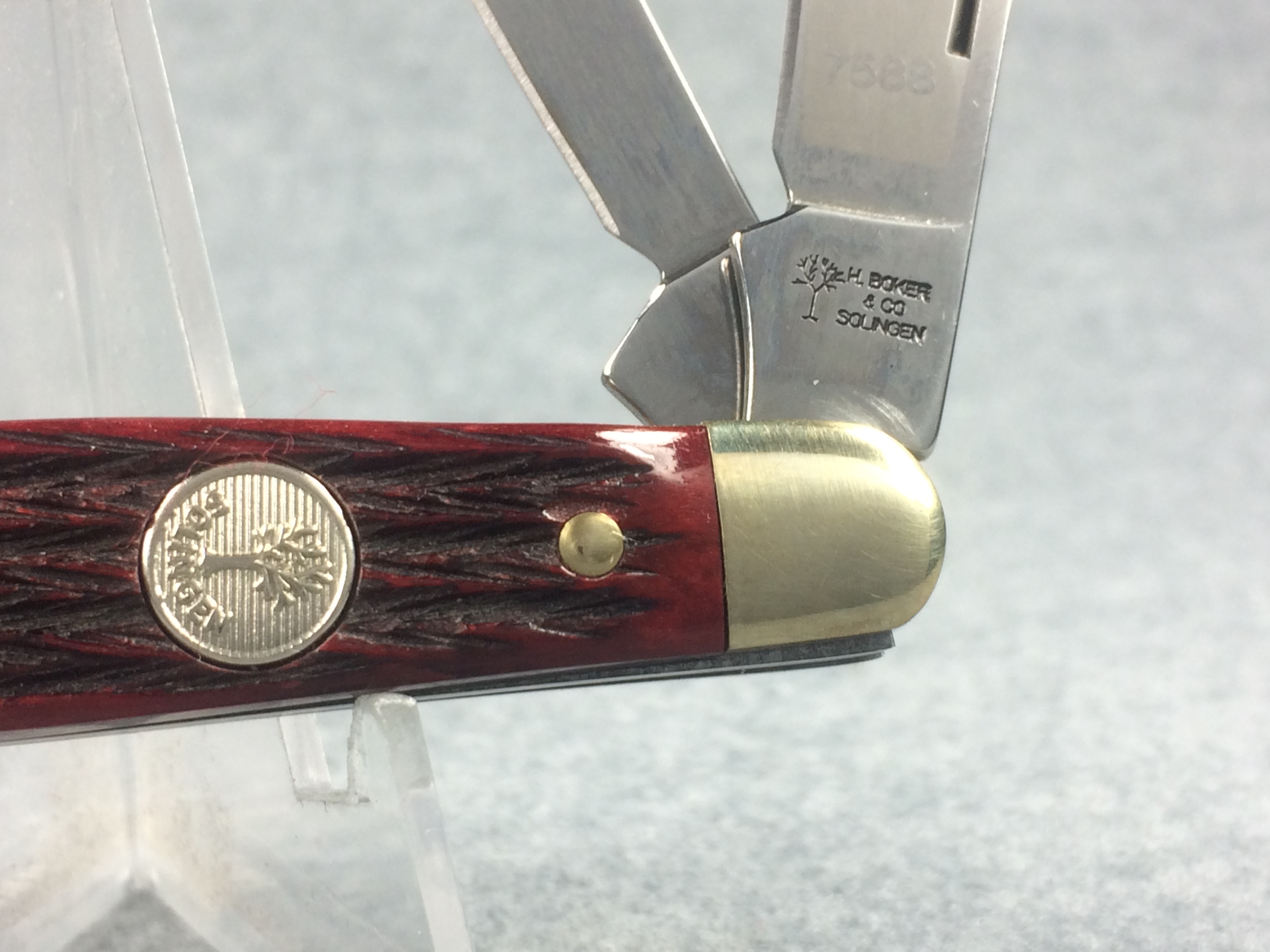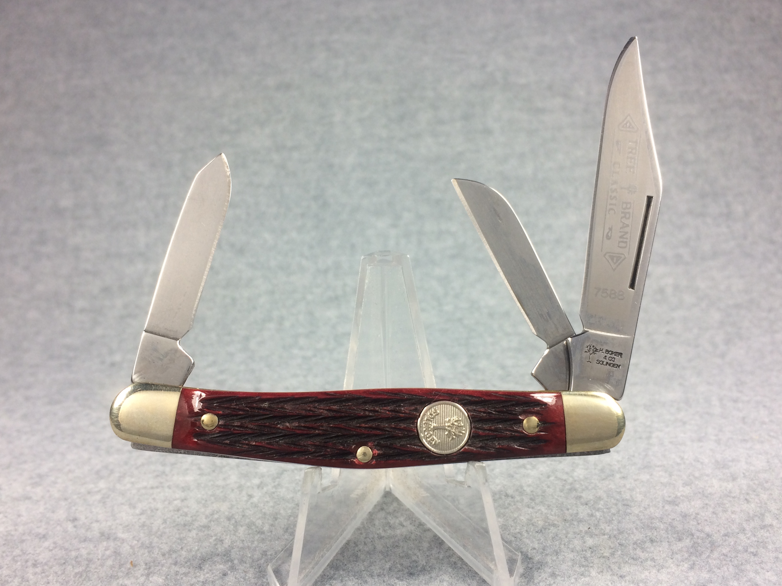 April 05, 2026 - 3-3/8 inches closed. 5-7/8 inches open. Made in Germany. Tree Logo and "H. BOKER & CO. SOLINGEN" tang stamp on master blade. Circle Tree Solingen shield. Stainless Steel blades. Master blade stamped "TREE BRAND CLASSIC 7588". Jigged Red Bone handle. Nickel Silver bolsters. Brass liner. With original box and paperwork.