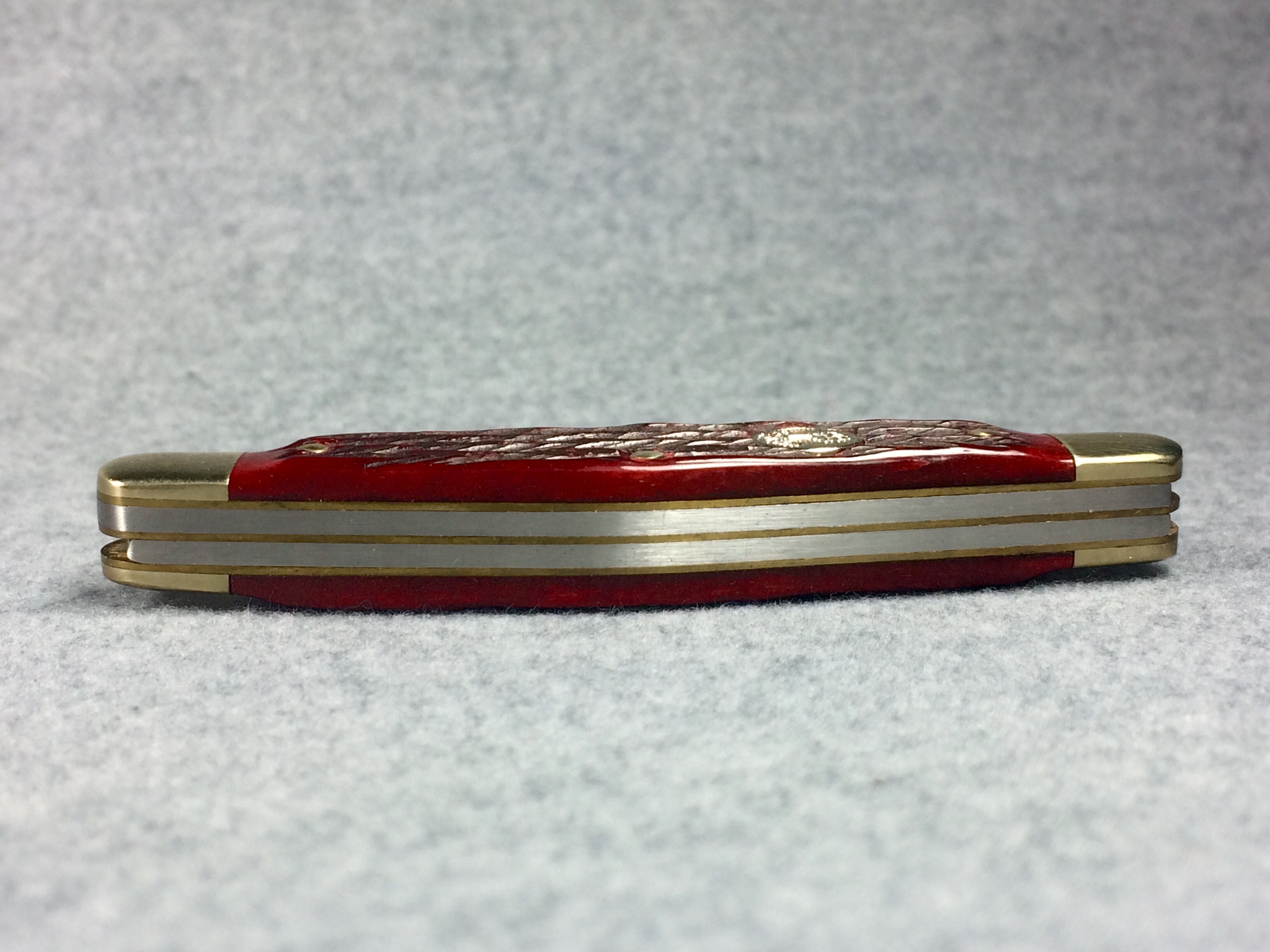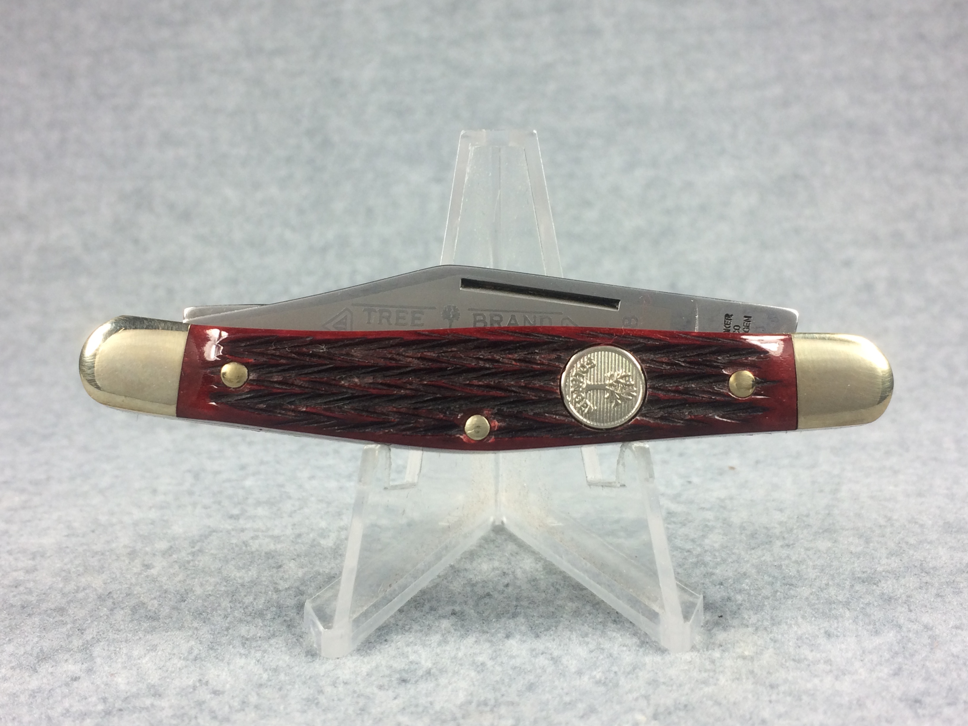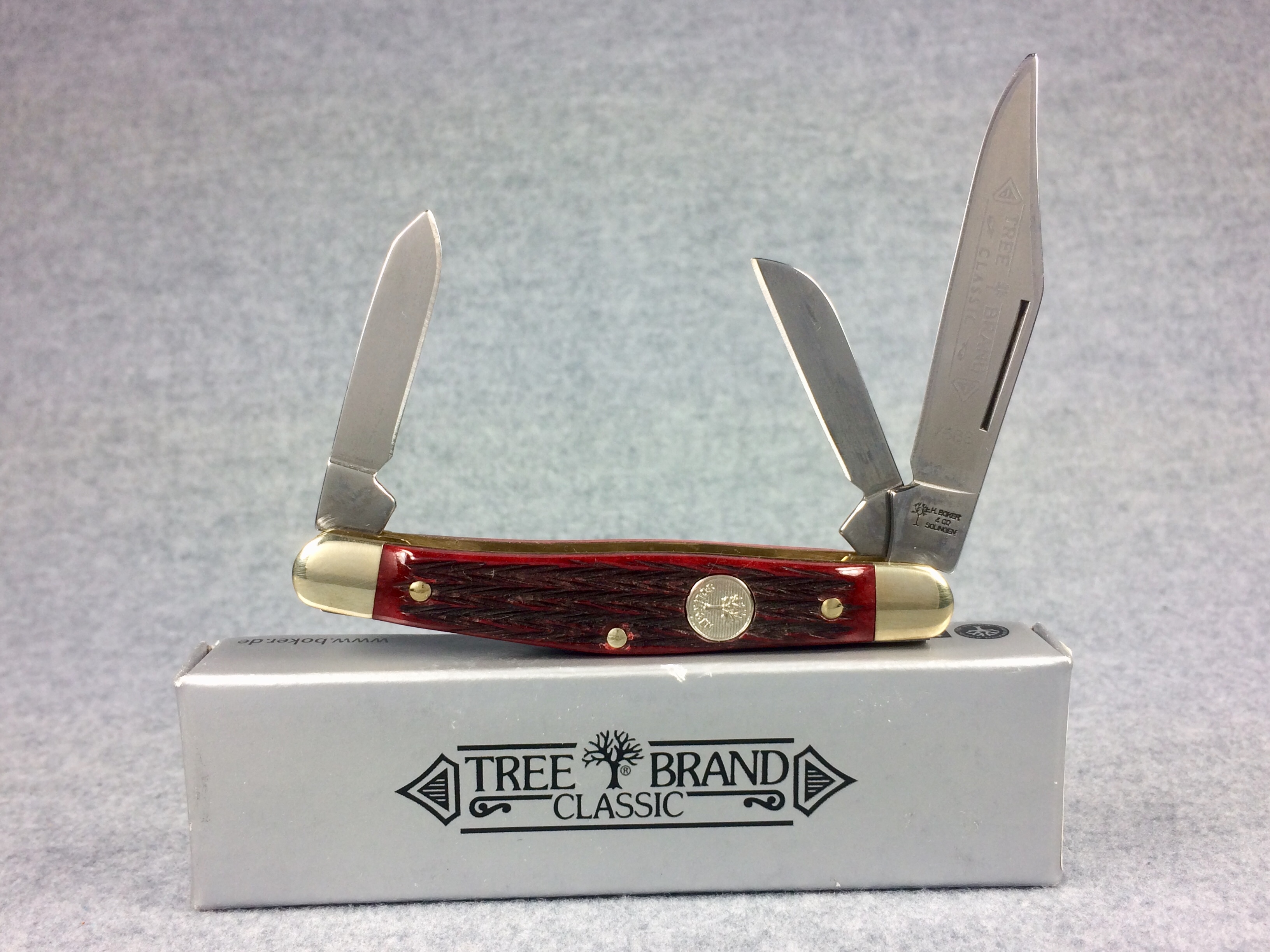 April 05, 2026 - 3-3/8 inches closed. 5-7/8 inches open. Made in Germany. Tree Logo and "H. BOKER & CO. SOLINGEN" tang stamp on master blade. Circle Tree Solingen shield. Stainless Steel blades. Master blade stamped "TREE BRAND CLASSIC 7588". Jigged Red Bone handle. Nickel Silver bolsters. Brass liner. With original box and paperwork.