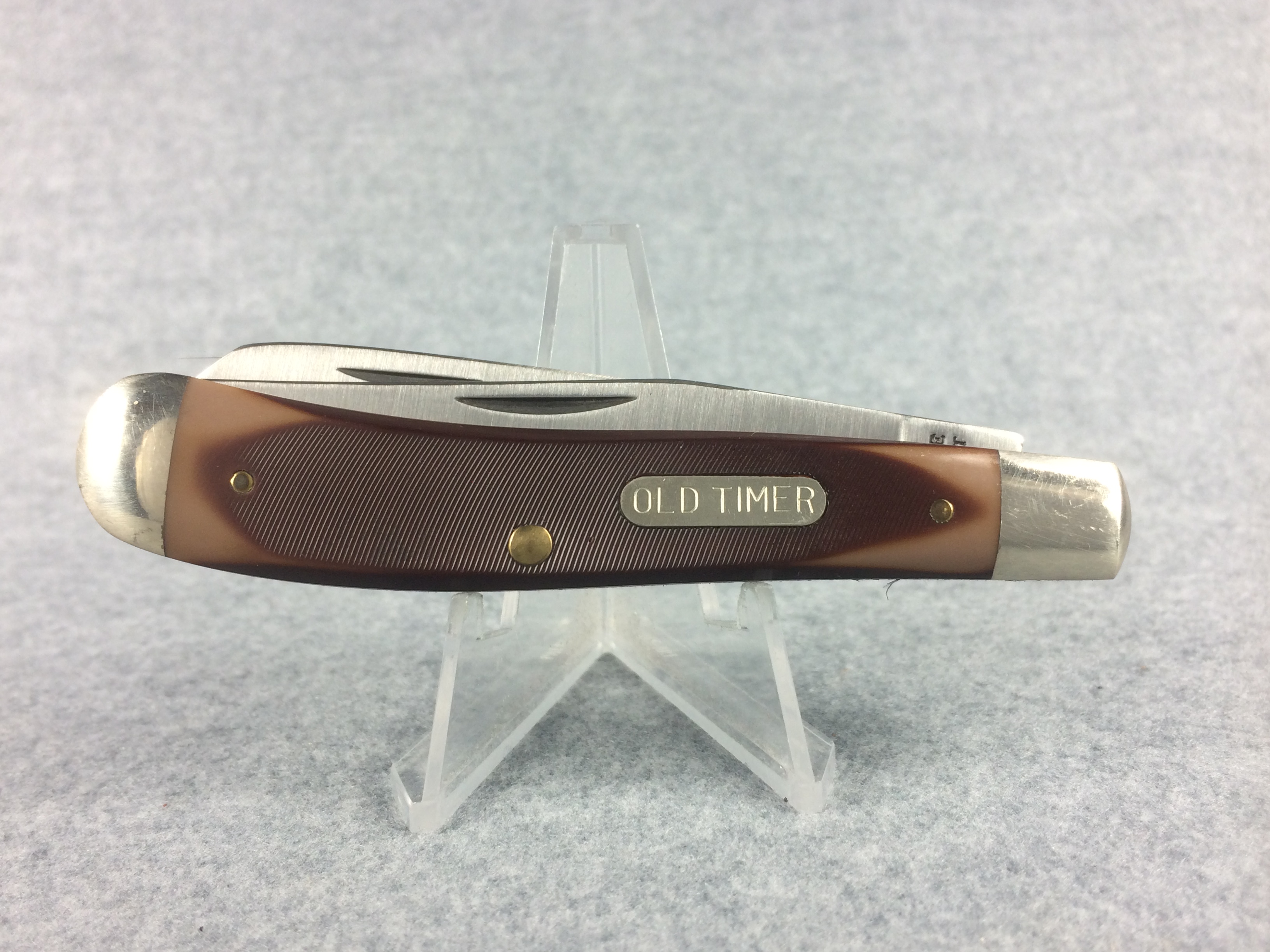 December 24, 2025 - 3-7/8 inches closed. 7 inches open. Made in USA. "SCHRADE U.S.A. 94OT" tang stamp. Oval "OLD TIMER" shield. Sawcut Delrin handle. Nickel Silver bolsters. Brass liner.