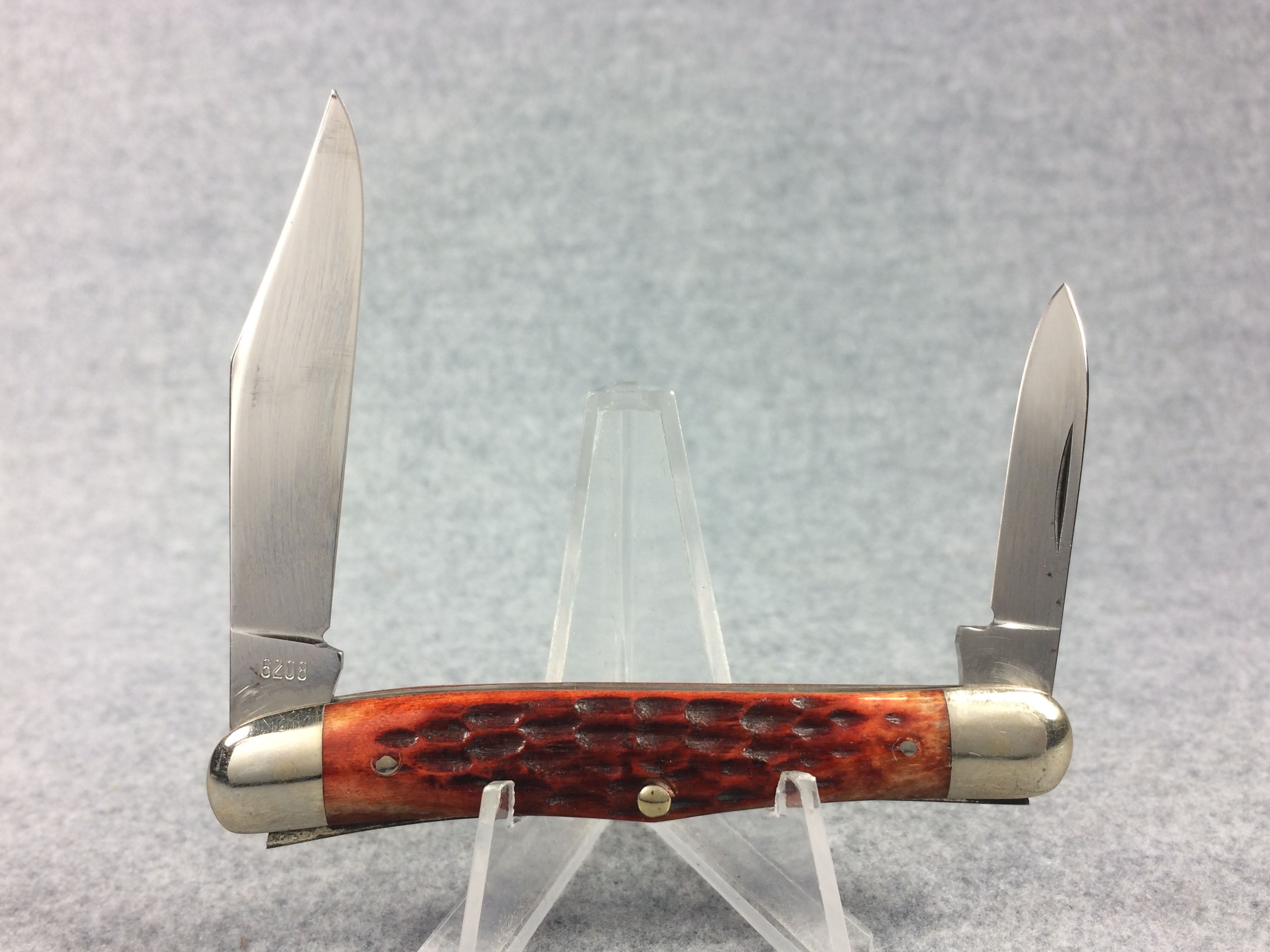 January 14, 2026 - 3-1/4 inches closed. 5-1/2 inches open. Made in USA. "CASE XX" and "6208" tang stamps. Chrome Vanadium blades. Red/Brown Jigged bone handle. Nickel Silver bolsters and liner.