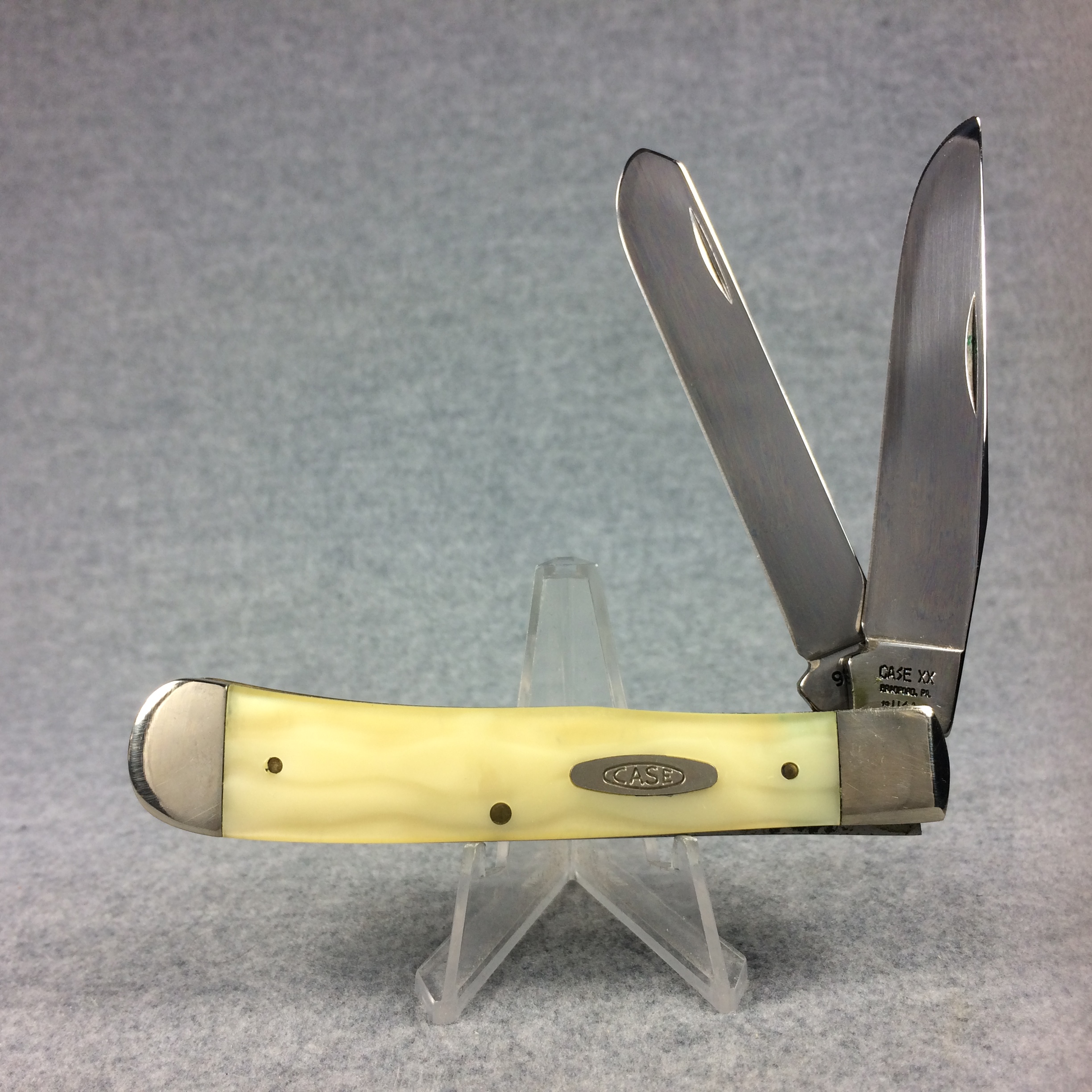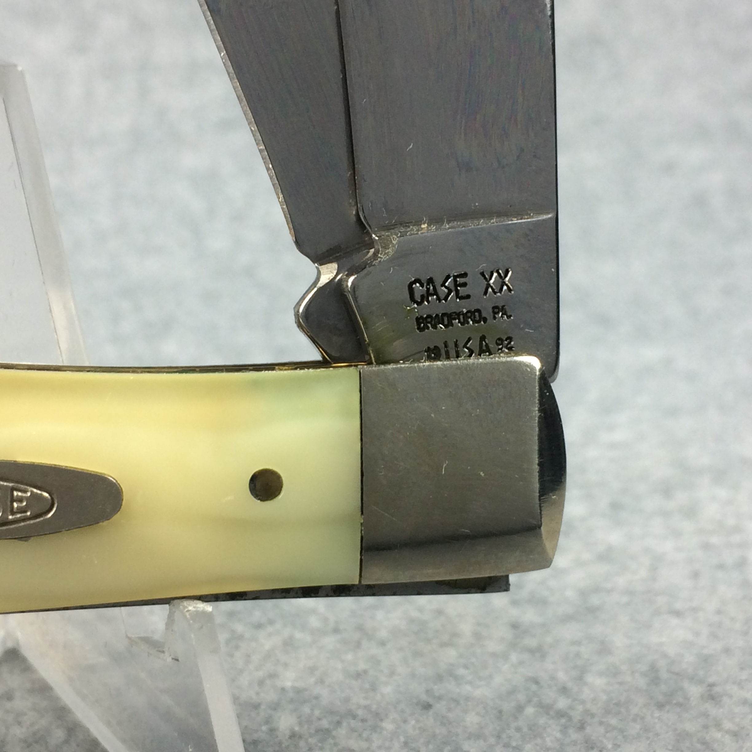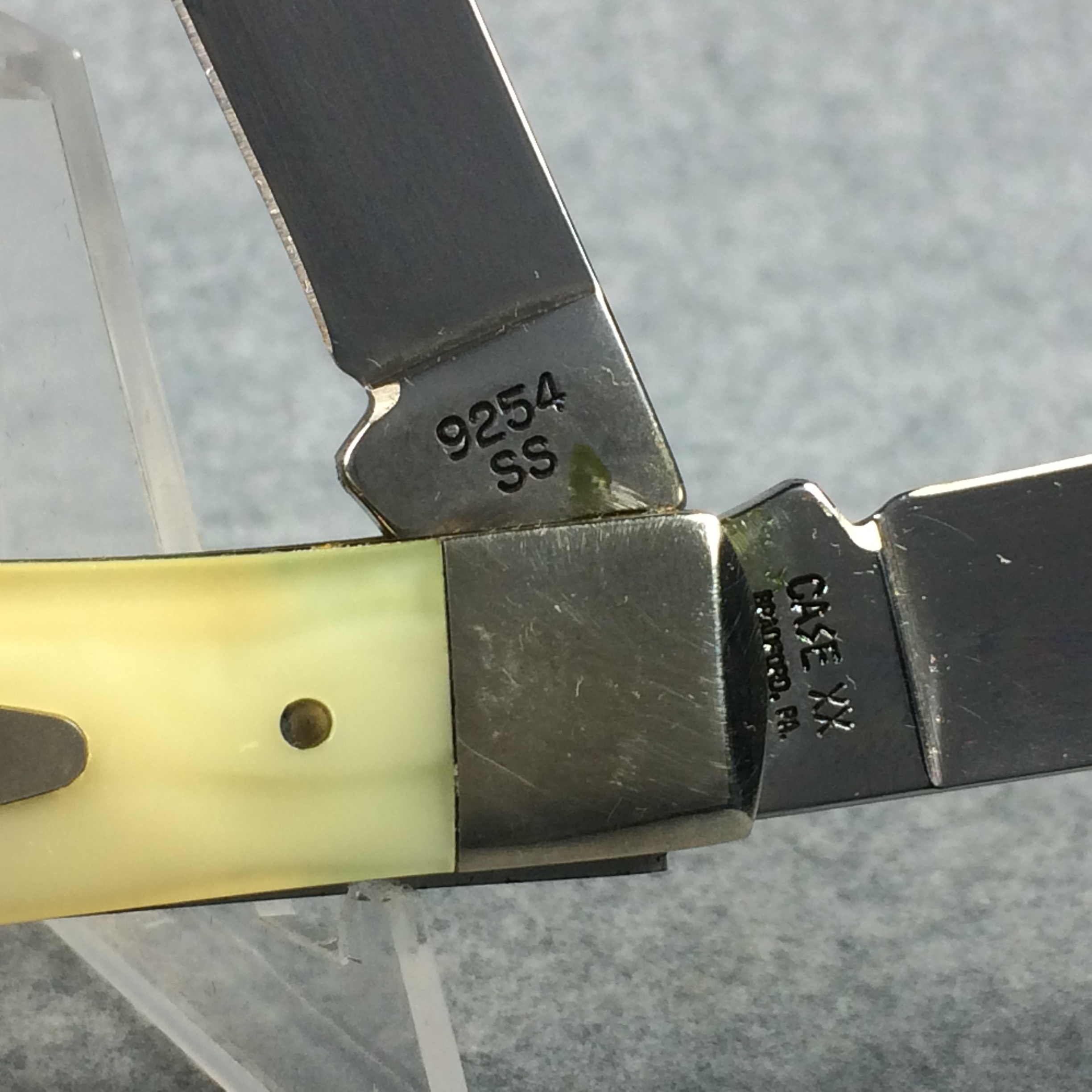 December 04, 2025 - 4-1/8 inches closed. 7-1/4 inches open. Made in USA. "CASE XX BRADFORD, PA 19 USA 92" (with lightning bolt S) and "9254 SS" tang stamps. Double Oval 'Open C' CASE shield. Stainless steel blades. Cracked Ice handle. Nickel Silver bolster. Brass liner.