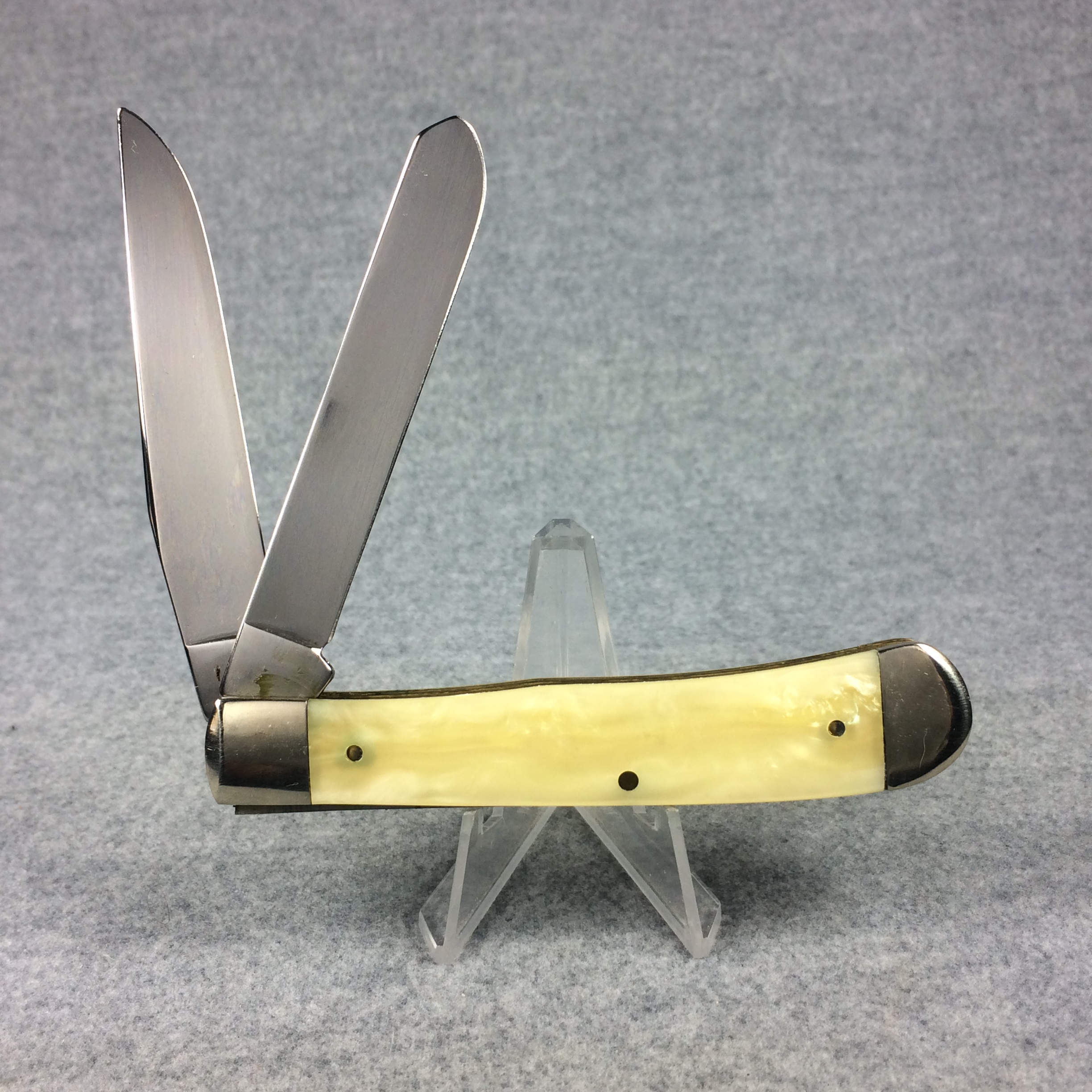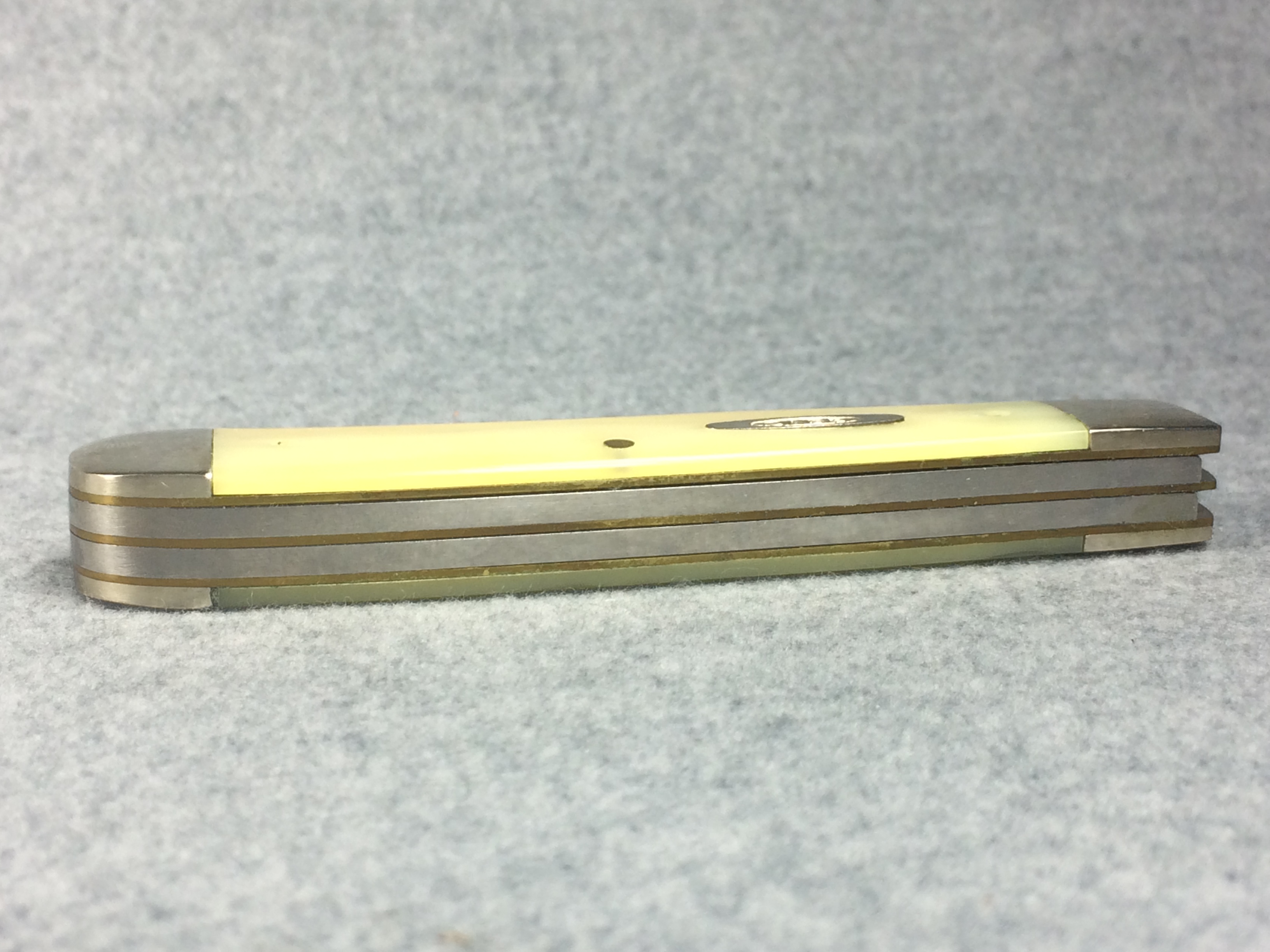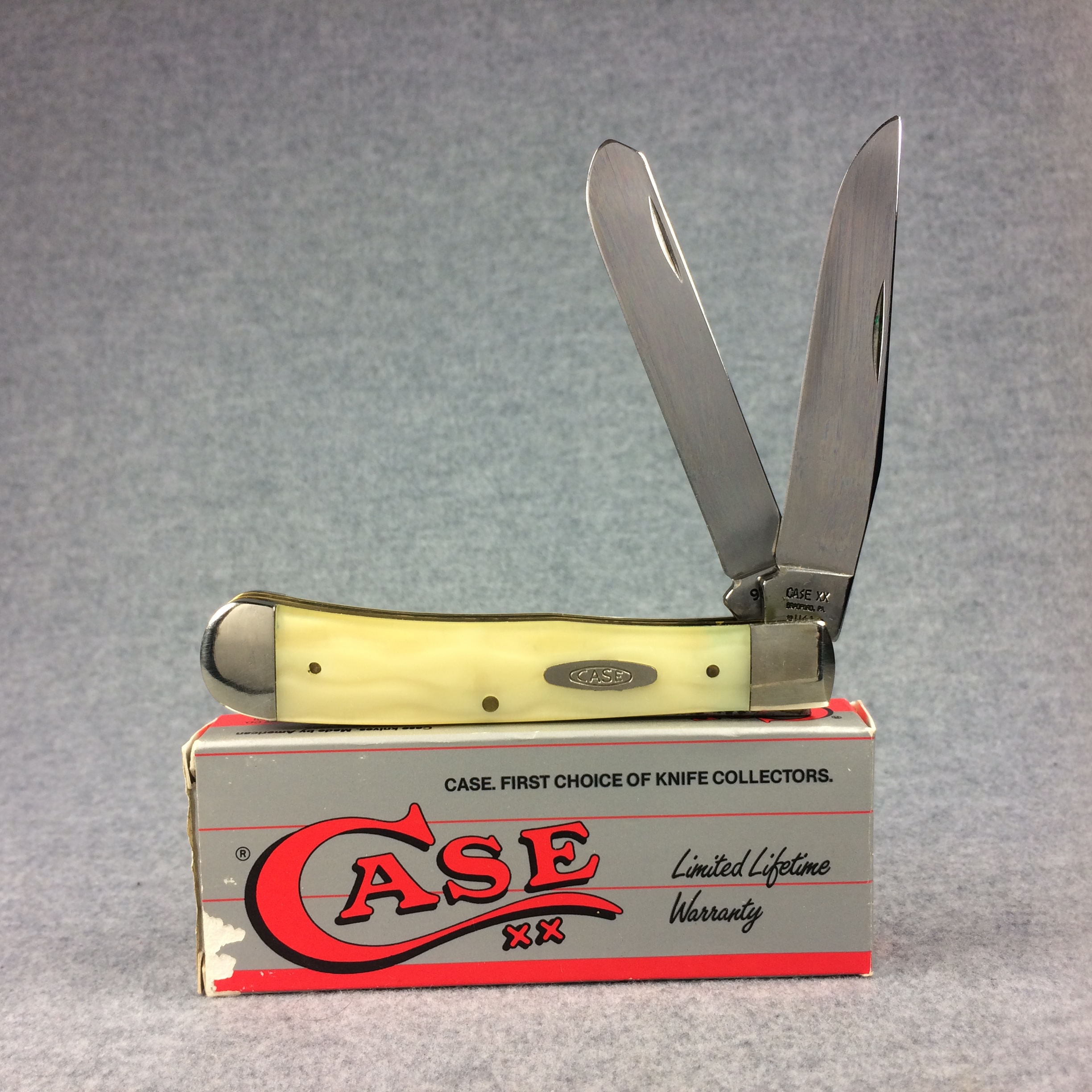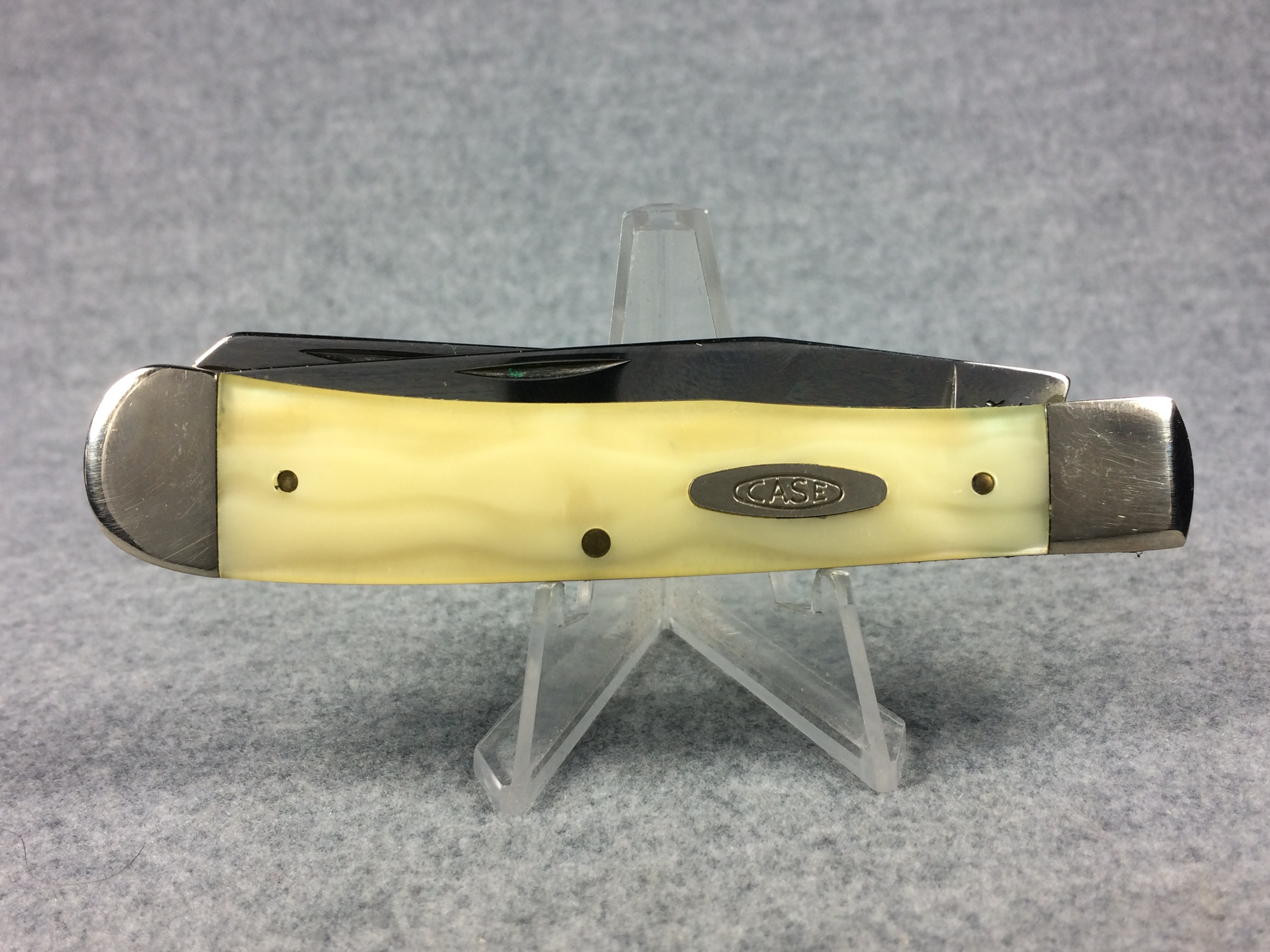 December 04, 2025 - 4-1/8 inches closed. 7-1/4 inches open. Made in USA. "CASE XX BRADFORD, PA 19 USA 92" (with lightning bolt S) and "9254 SS" tang stamps. Double Oval 'Open C' CASE shield. Stainless steel blades. Cracked Ice handle. Nickel Silver bolster. Brass liner.