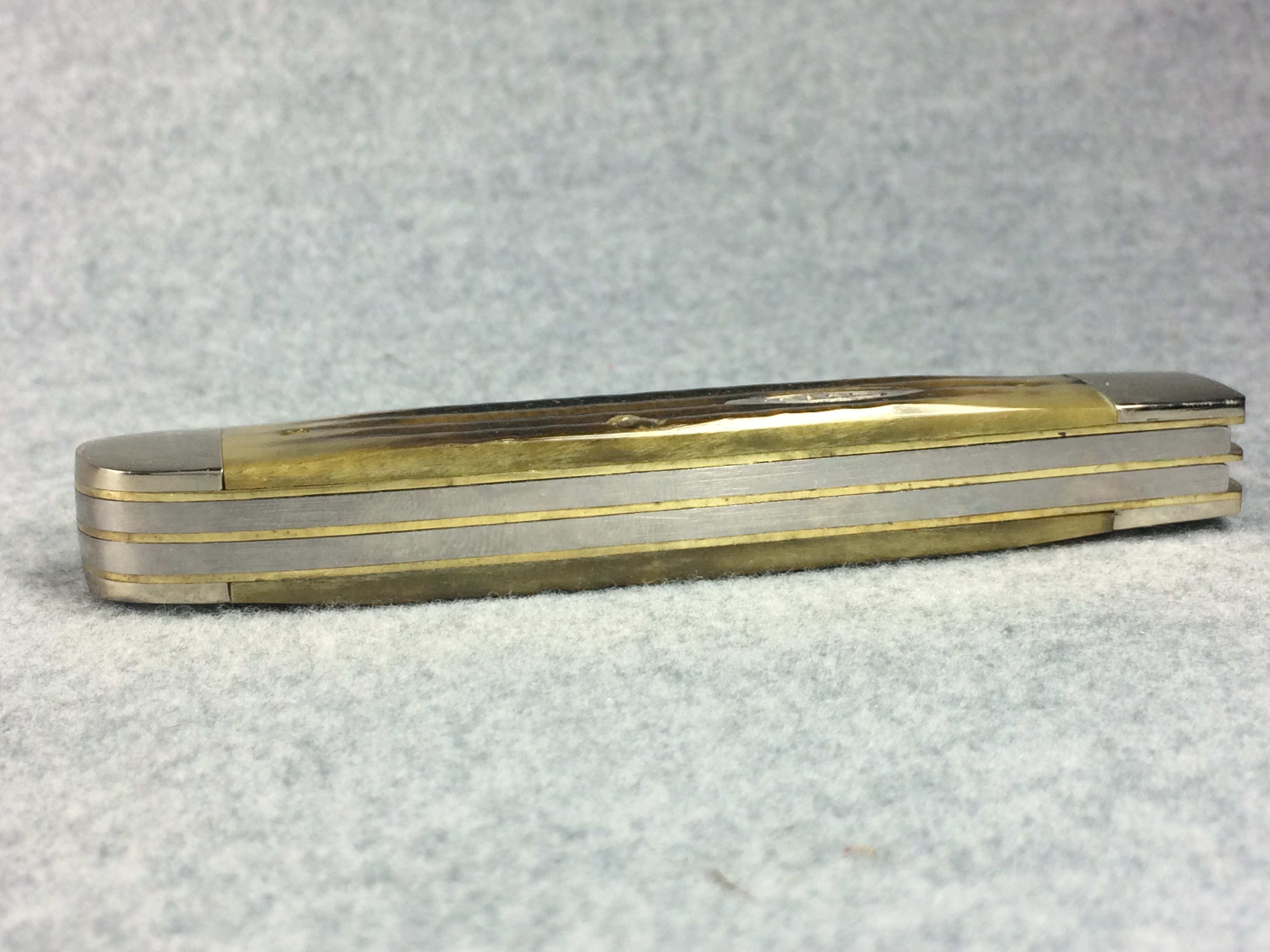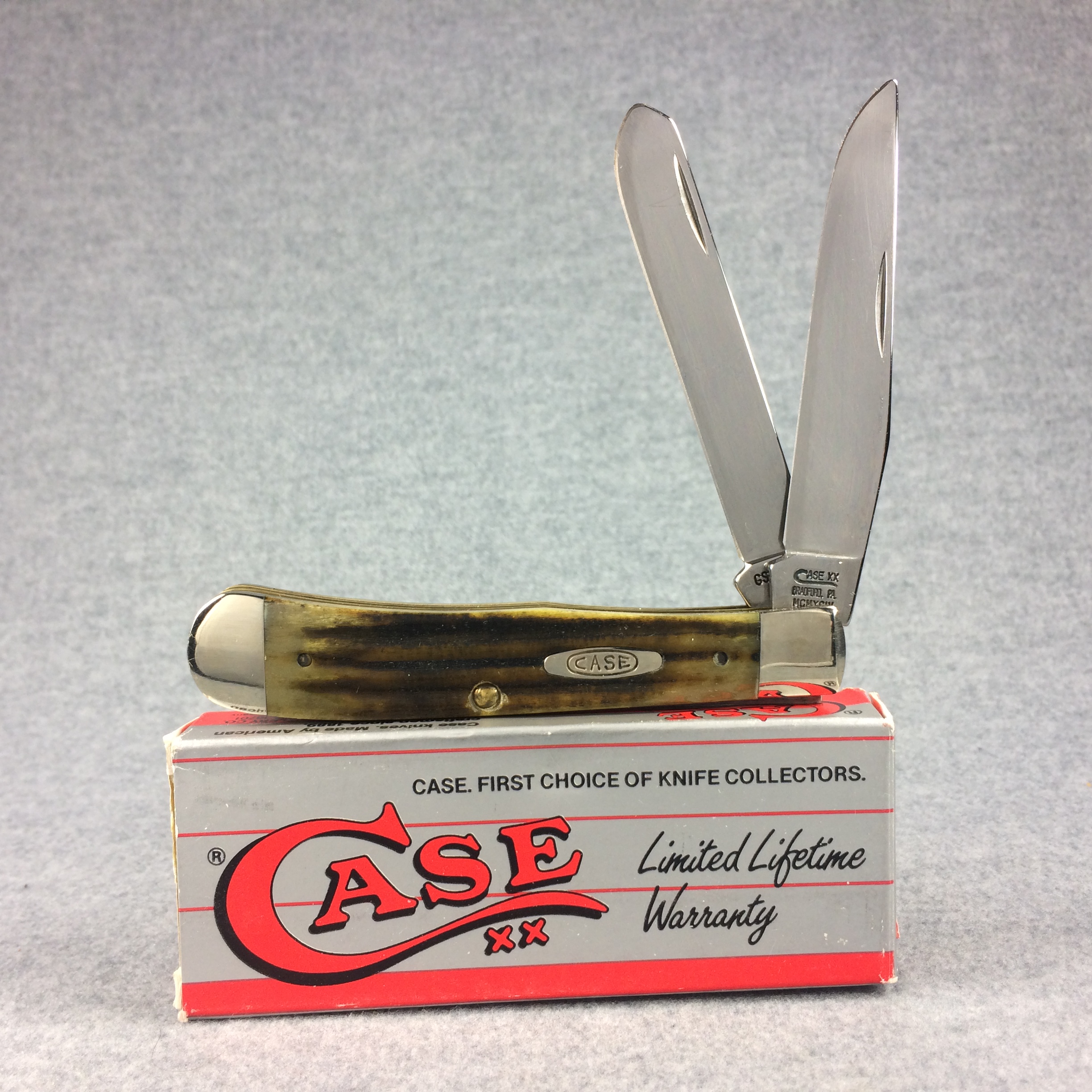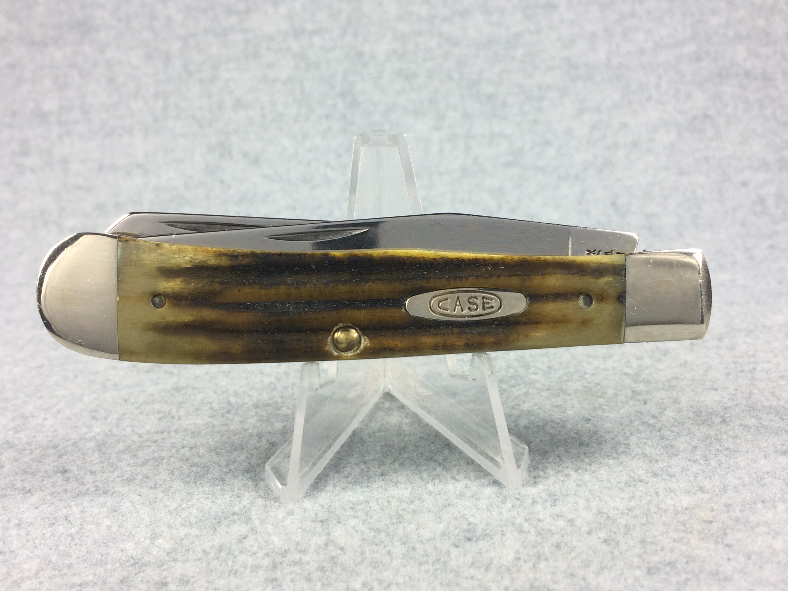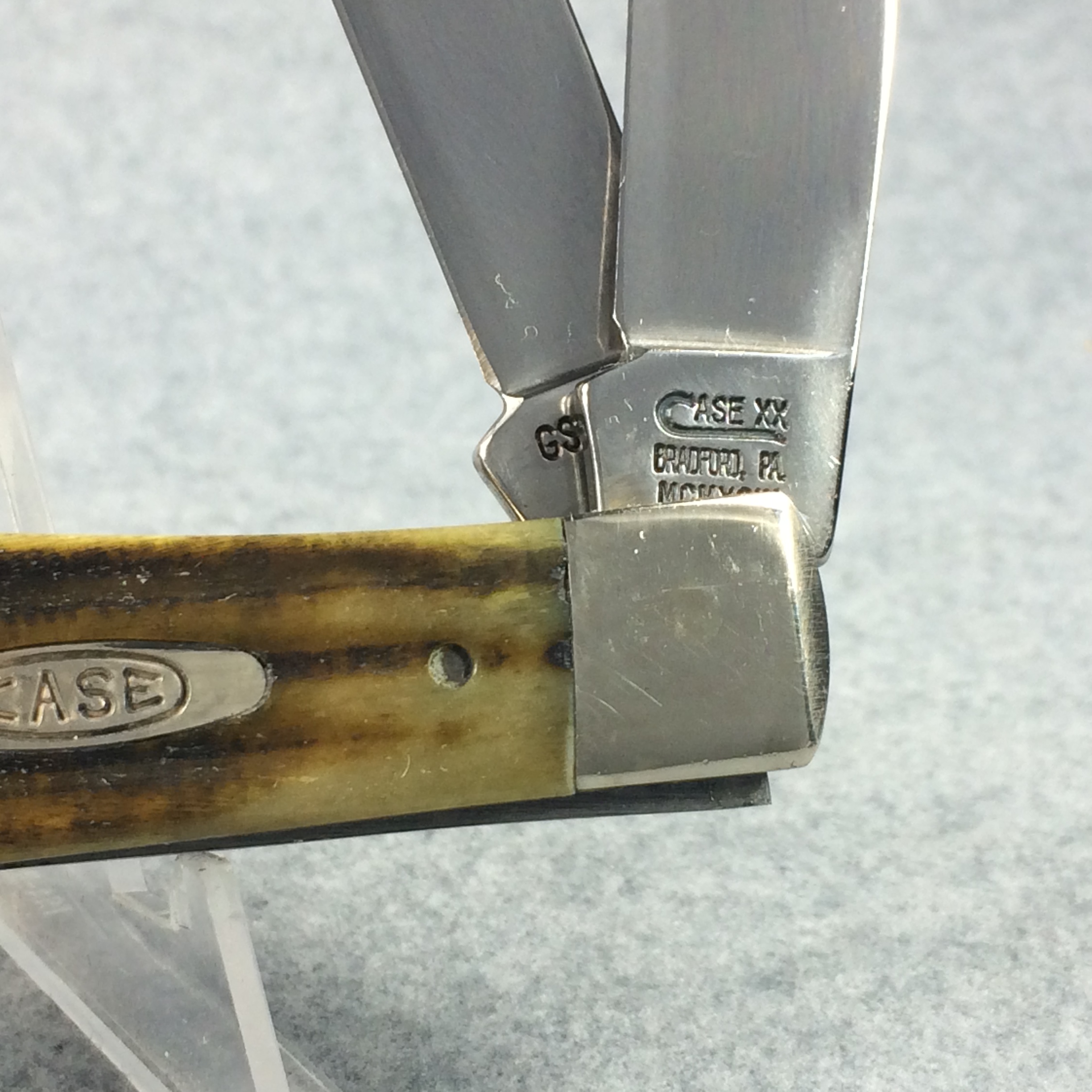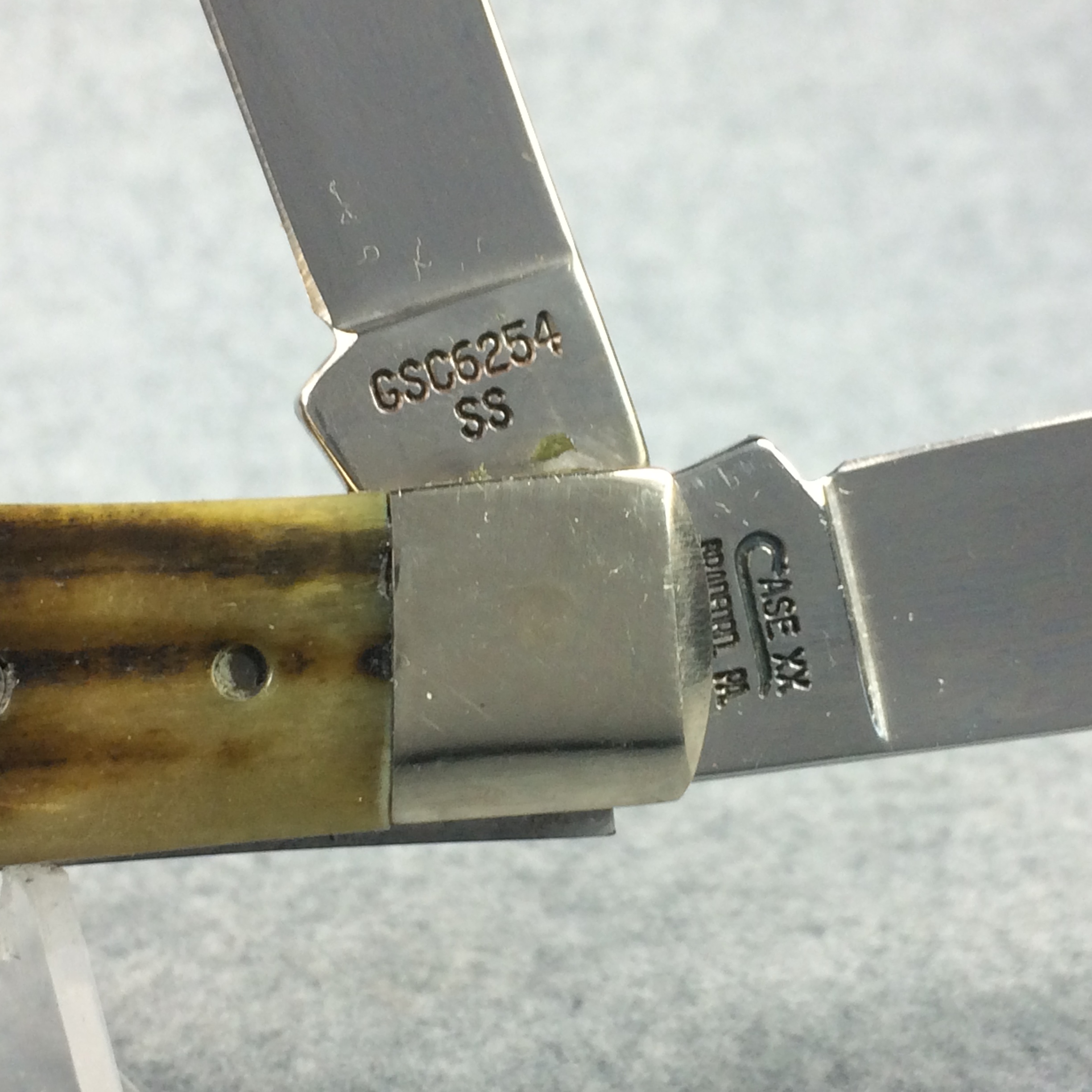 January 14, 2026 - 4-1/8 inches closed. 7-3/8 inches open. Made in USA. Long-C "CASE XX BRADFORD, PA MCMXCIV" and "GSC6254 SS" tang stamps. Double Oval 'Open C' CASE shield. Stainless Steel blades. Green second-cut bone handle. Nickel Silver bolsters. Brass liner.