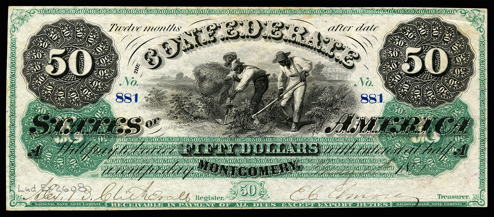 October 28, 2025 - 1606 issued. Green and black on red silk fiber paper. Blank back. Machine printed serial numbers in blue ink. Slaves weeding cotton. Hand-signed by Clitherall and Elmore. Printed by National Bank Note Company.