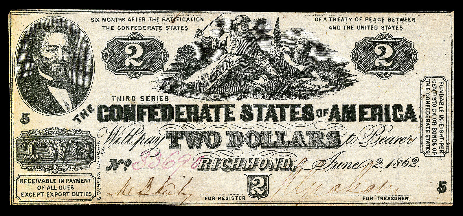 November 02, 2025 - 1,520,000 issued. Black. Blank back. Confederacy personified at center, J. P Benjamin left. Lithographed date, 'June 2, 1862'. Printed by B. Duncan, Columbia, SC. Contemporary counterfeits exist and are of similar value.