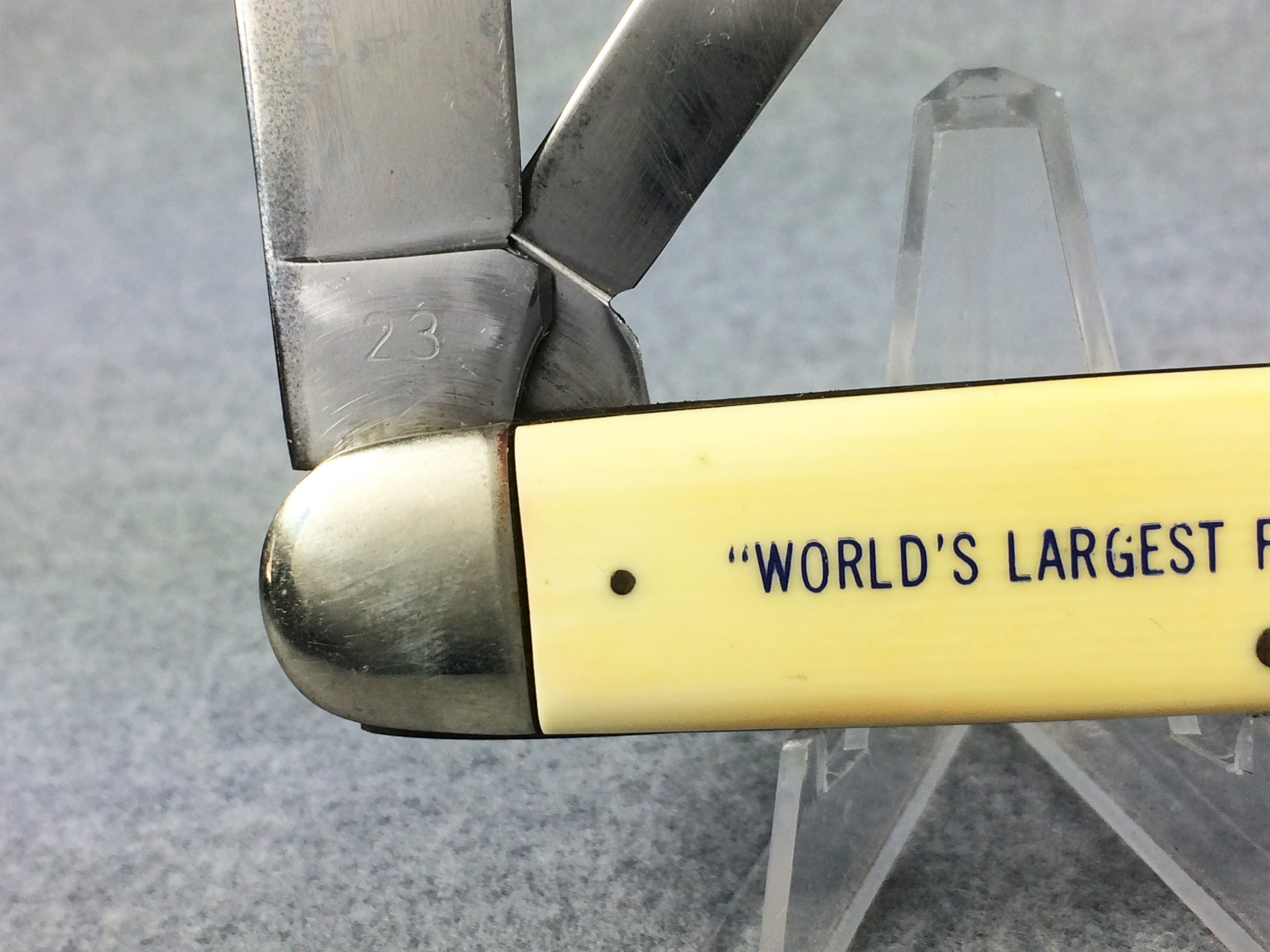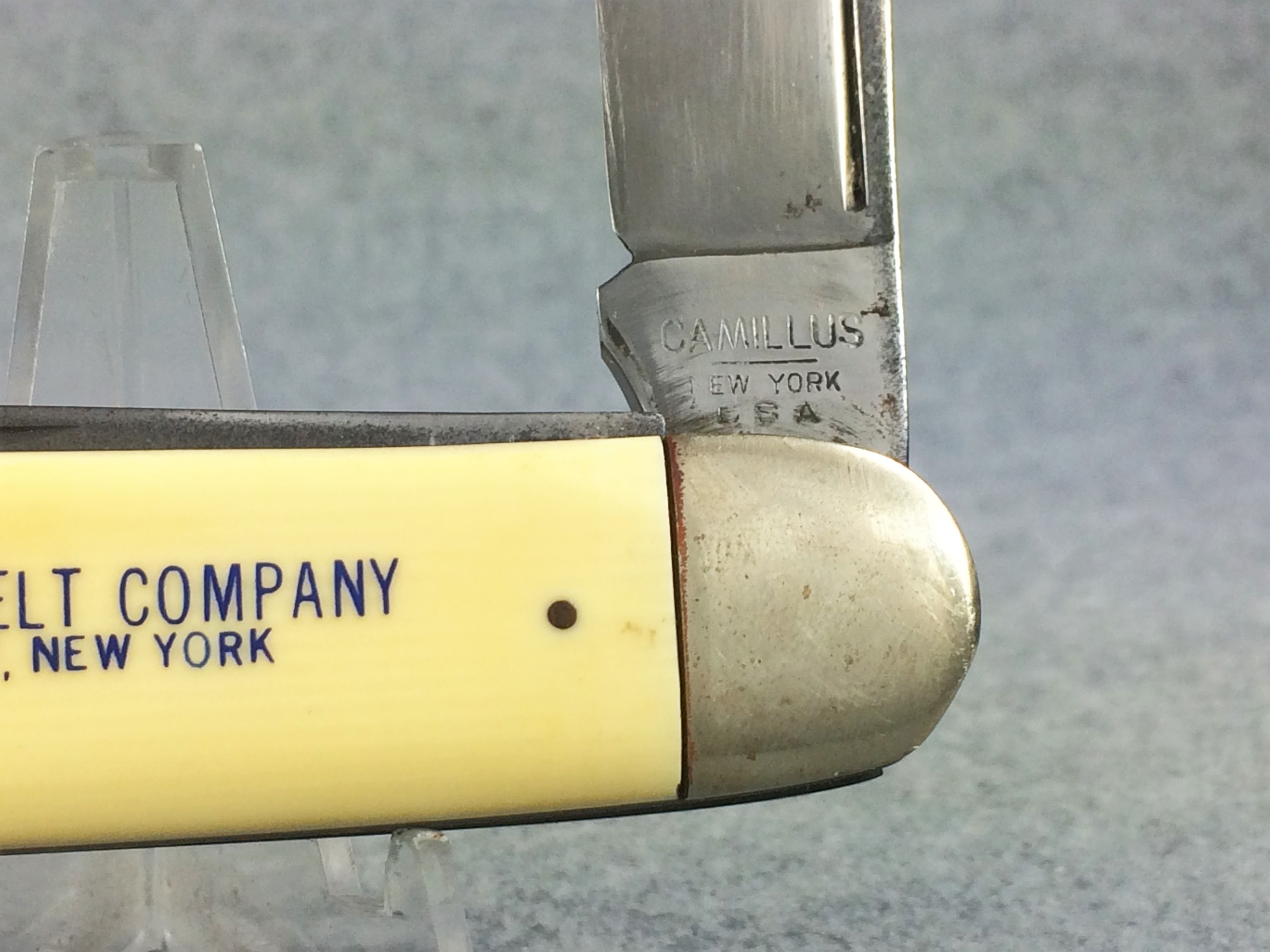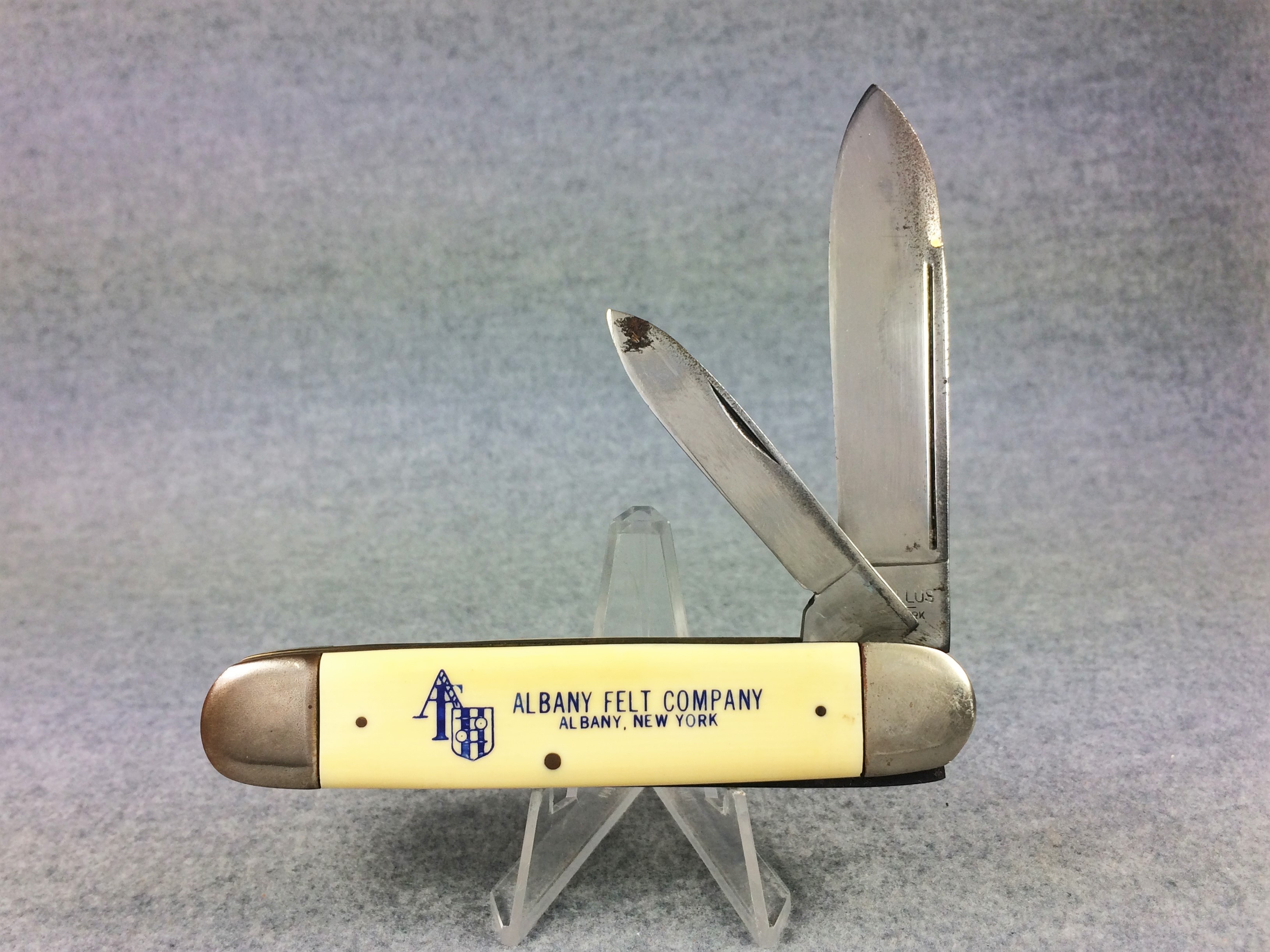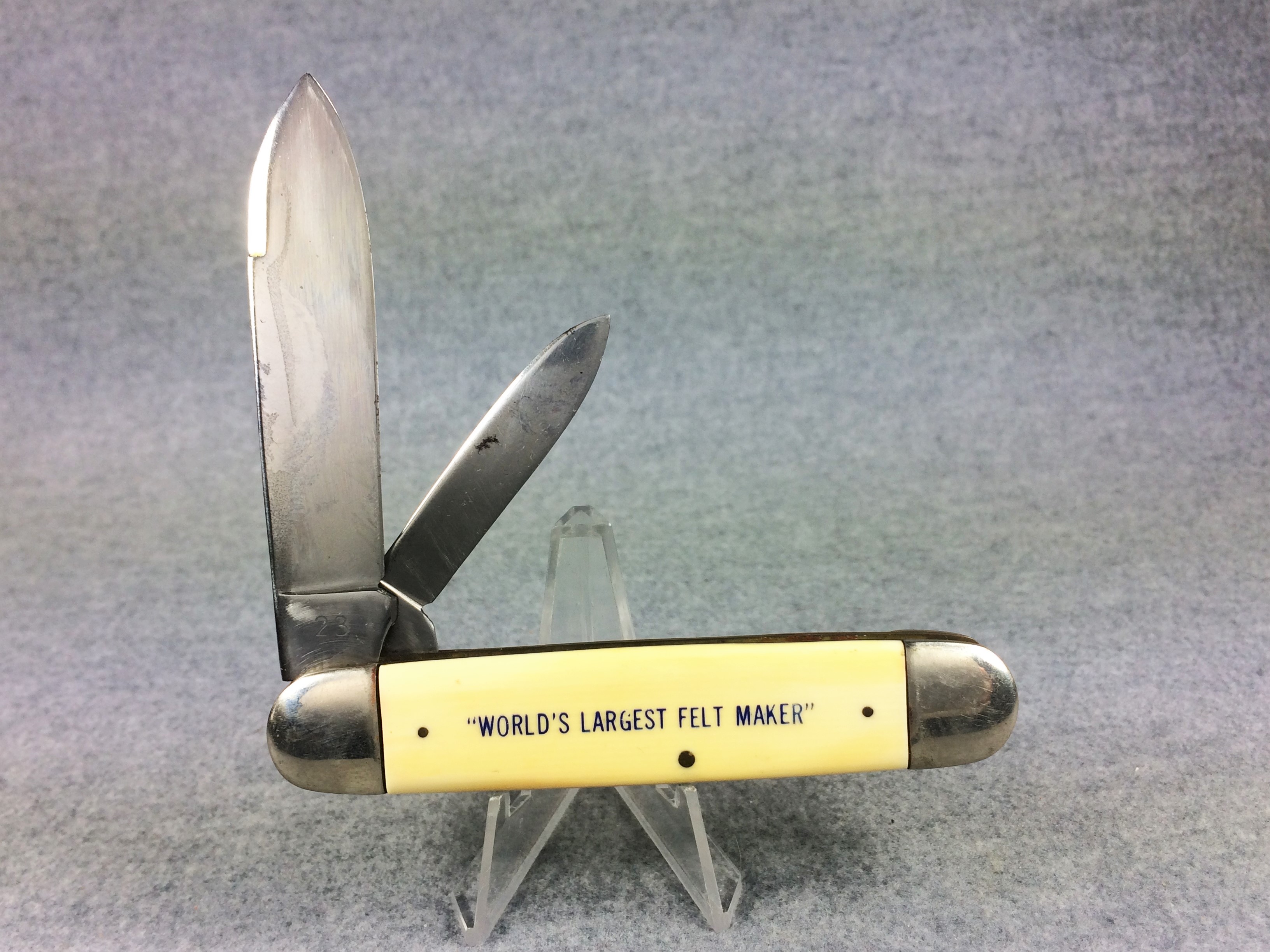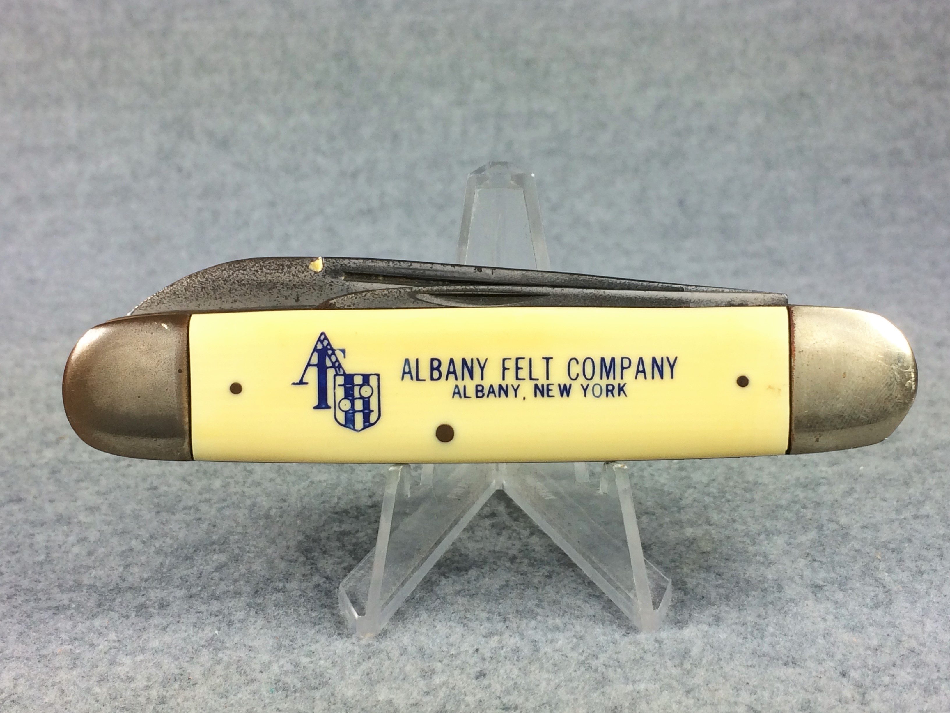 January 14, 2026 - 2-Blade Jack Knife. 4-1/4 inches closed. 7-3/8 inches open. Made in USA. "CAMILLUS New York" and "23" tang stamps. Smooth yellow composition handle etched "ALBAND FELT COMPANY ALBANY, NEW YORK" and "'WORLD'S LARGEST FELT MAKER'". Nickel silver bolsters and brass liner.