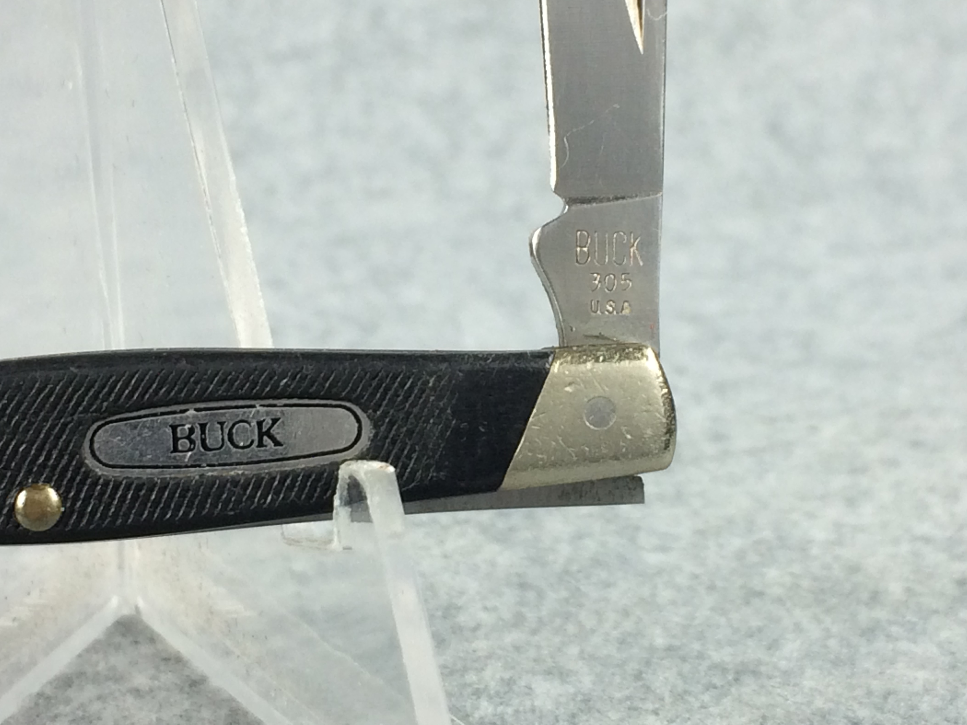December 14, 2025 - 2-5/8 inches closed. 4-1/2 inches open. Made in USA. "BUCK 305 U.S.A." tang stamp. Oval "BUCK" shield. Black sawcut delrin handle. Nickel silver bolsters and brass liner.