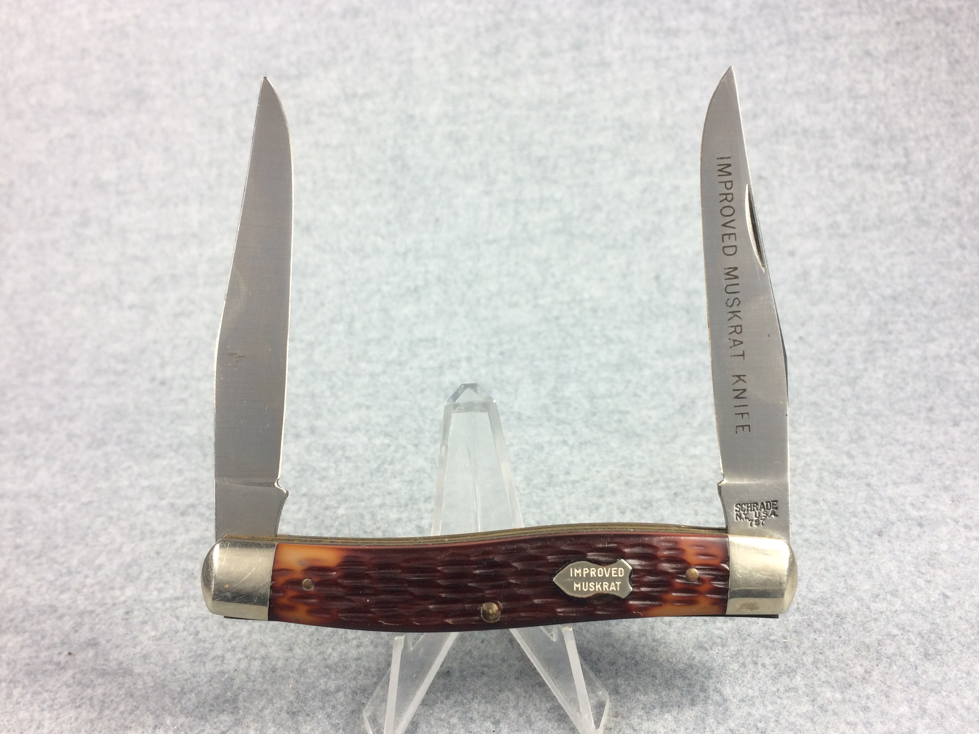 February 03, 2026 - 3-7/8 inches closed. 7 inches open. SCHRADE N.Y. U.S.A. 787" tang stamp. Federal "IMPROVED MUSKRAT" shield. Master blade stamped "IMPROVED MUSKRAT KNIFE". Brown jigged imitation bone handle. Nickel Silver bolsters. Brass liner. No box.