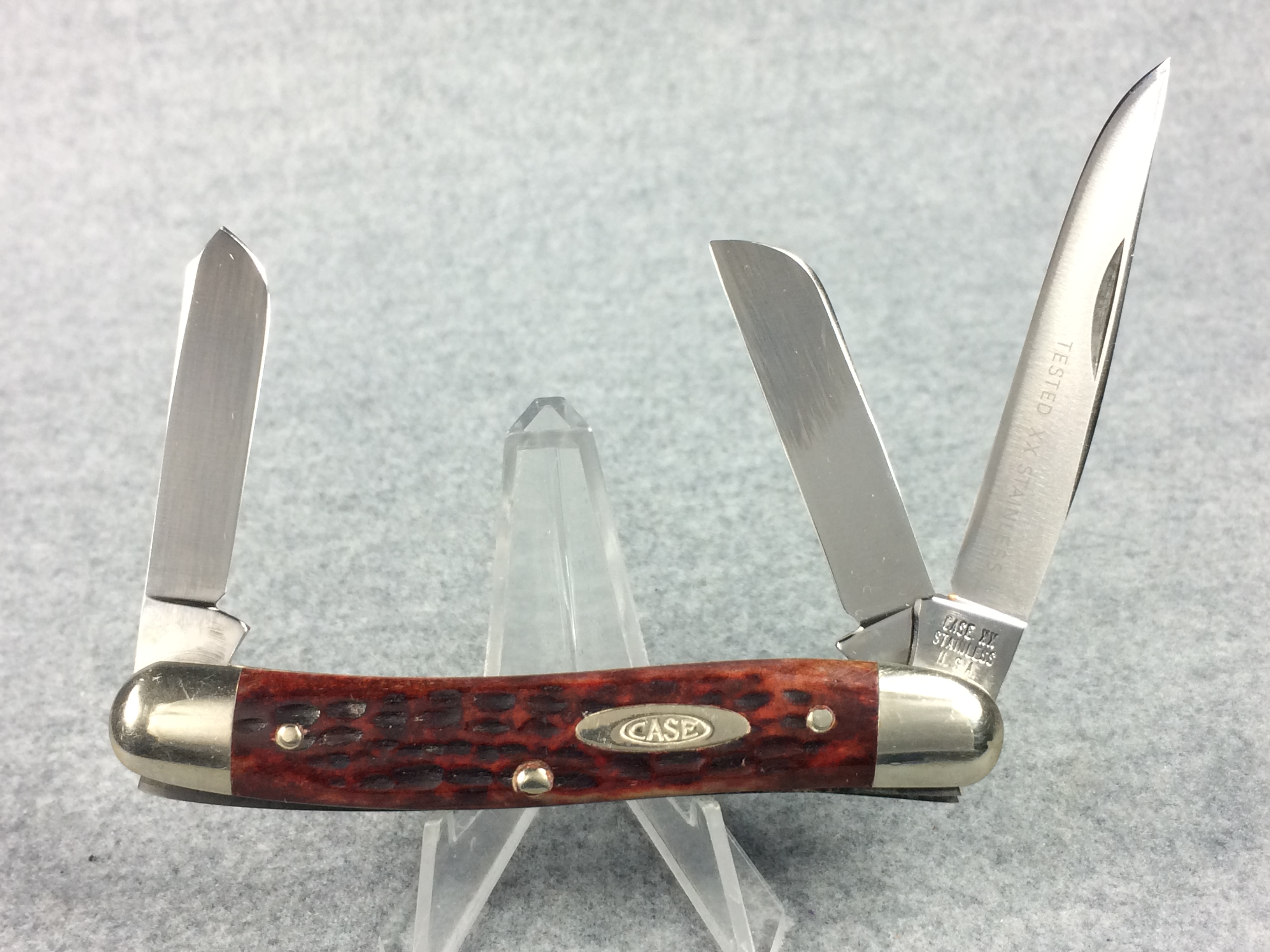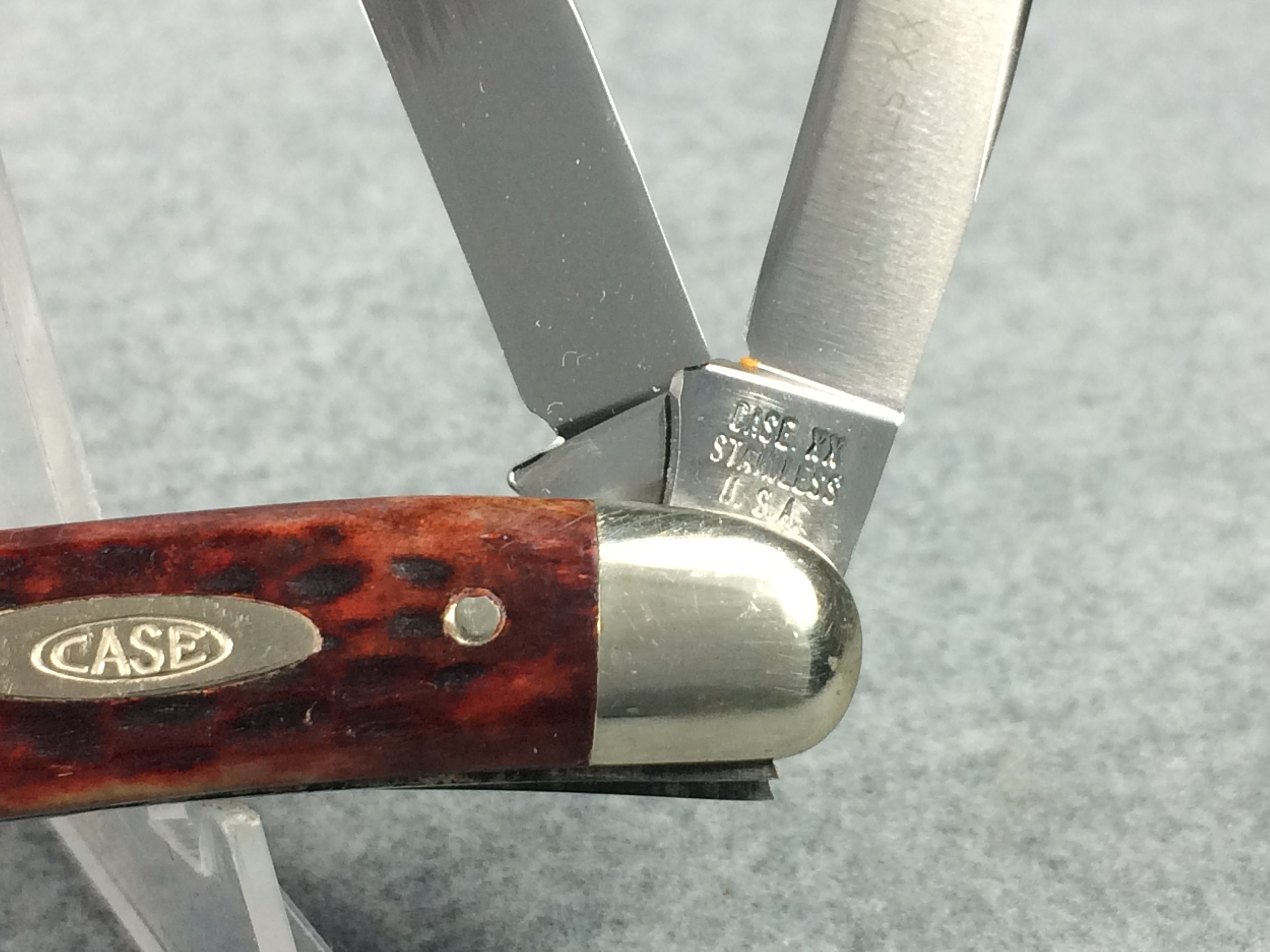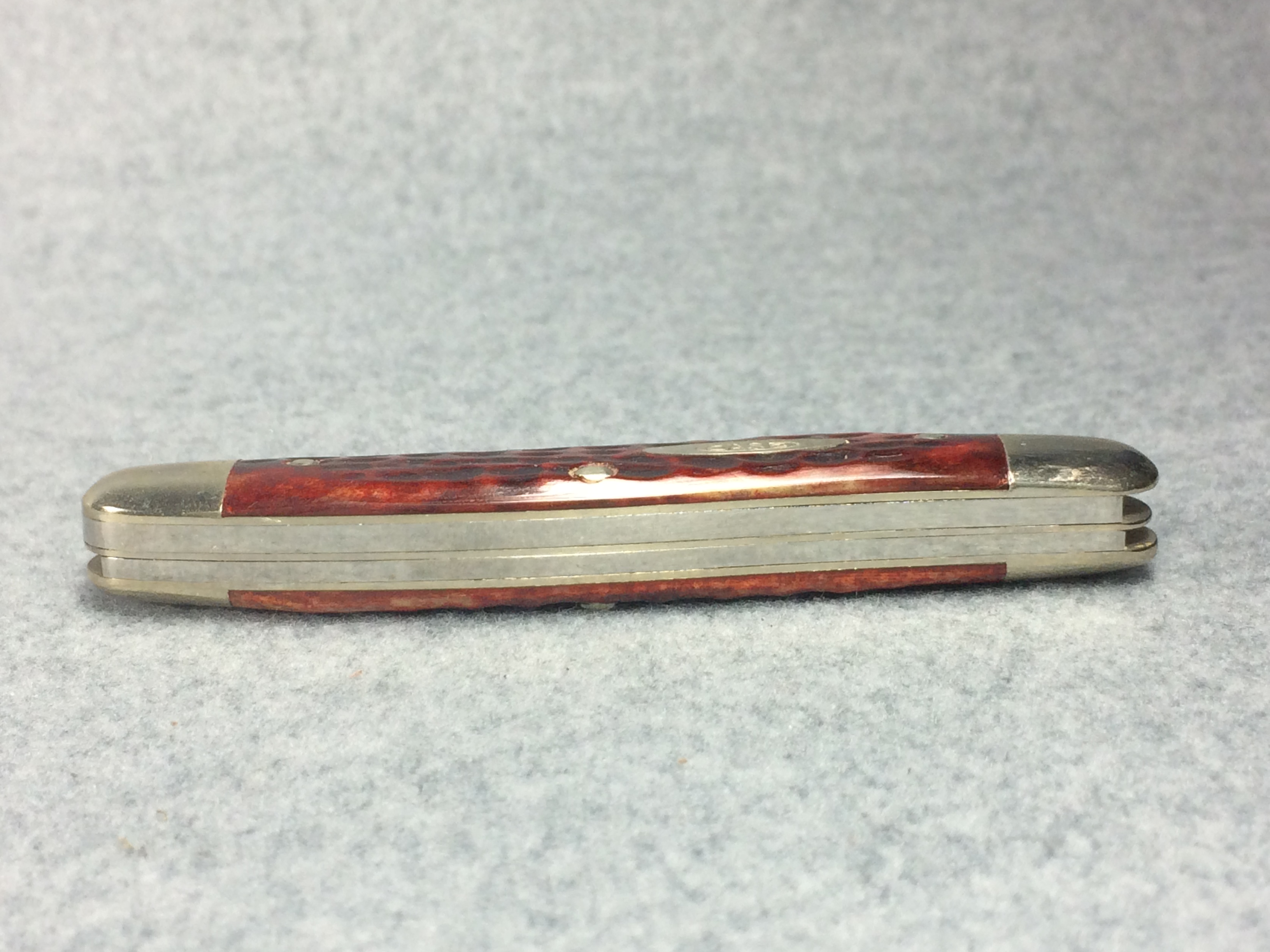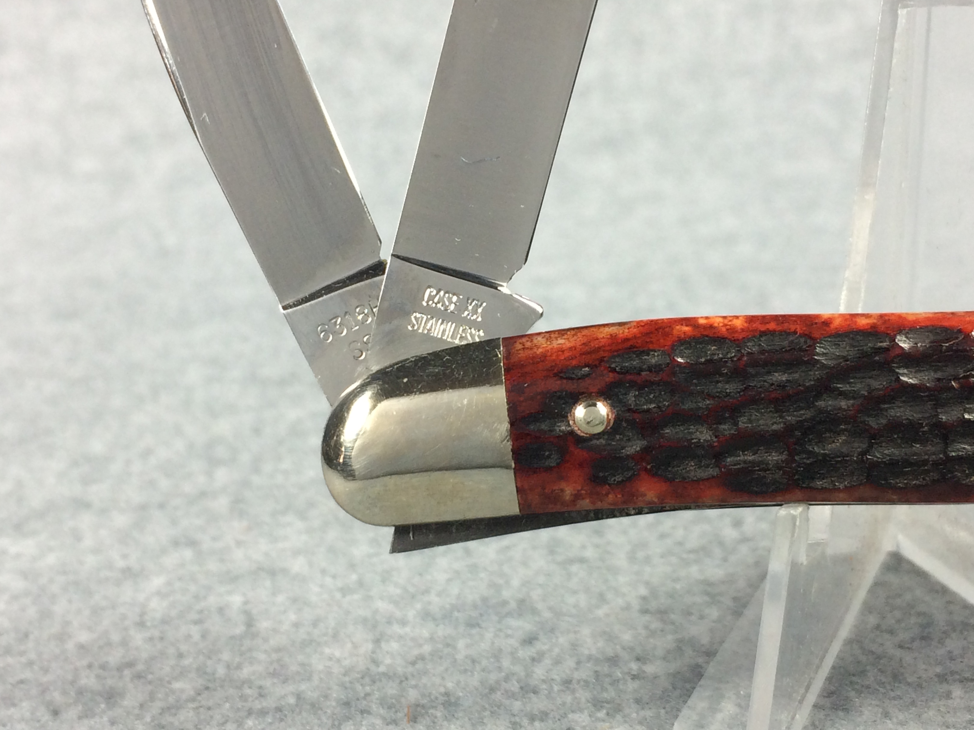 October 26, 2025 - 3-5/8 inches closed. 6-1/4 inches open. Made in USA. "CASE XX STAINLESS U.S.A." (no dots), "CASE XX STAINLESS" and "6318HP SSP" tang stamps. Double oval open-C "CASE" shield. Stainless steel blades. Master blade stamped "TESTED XX STAINLESS" (which is the identifier for all first model stainless knives). Red/Brown jigged bone handle. Nickel Silver bolsters and liner.