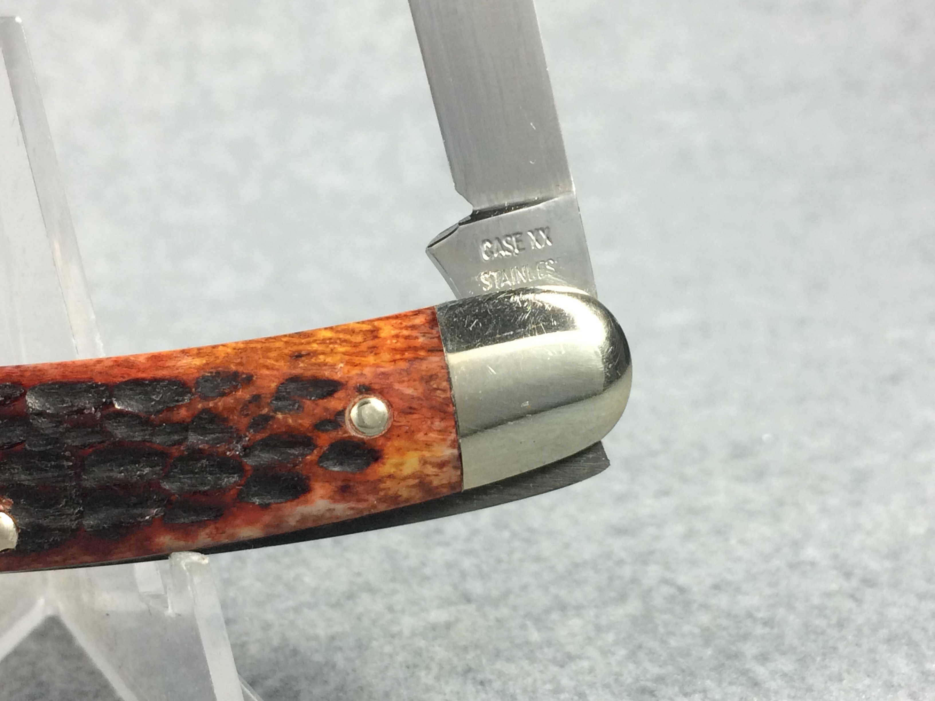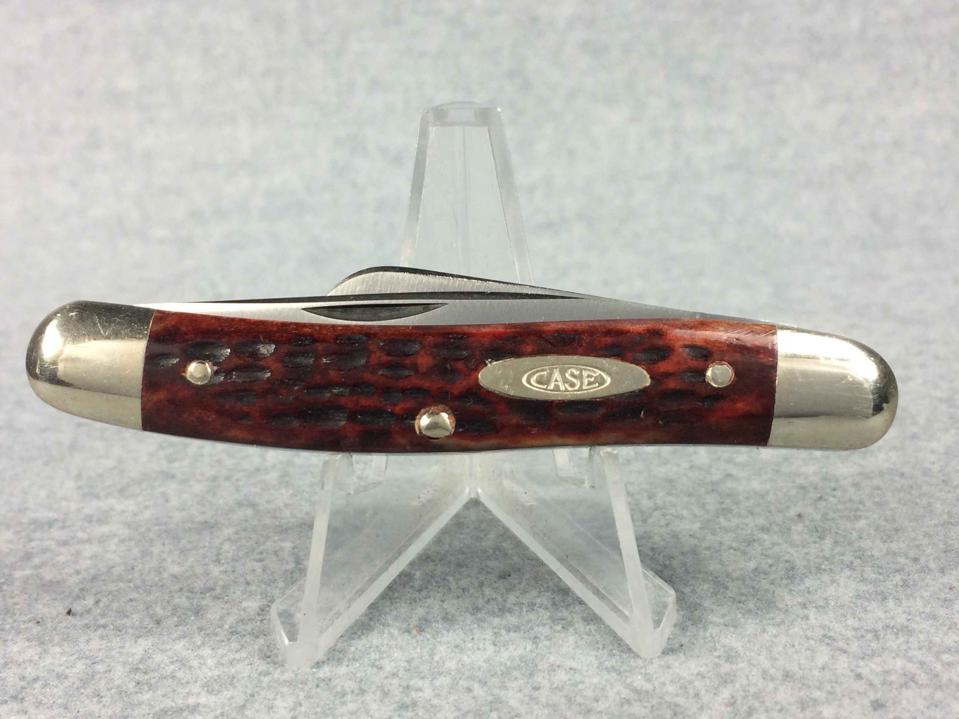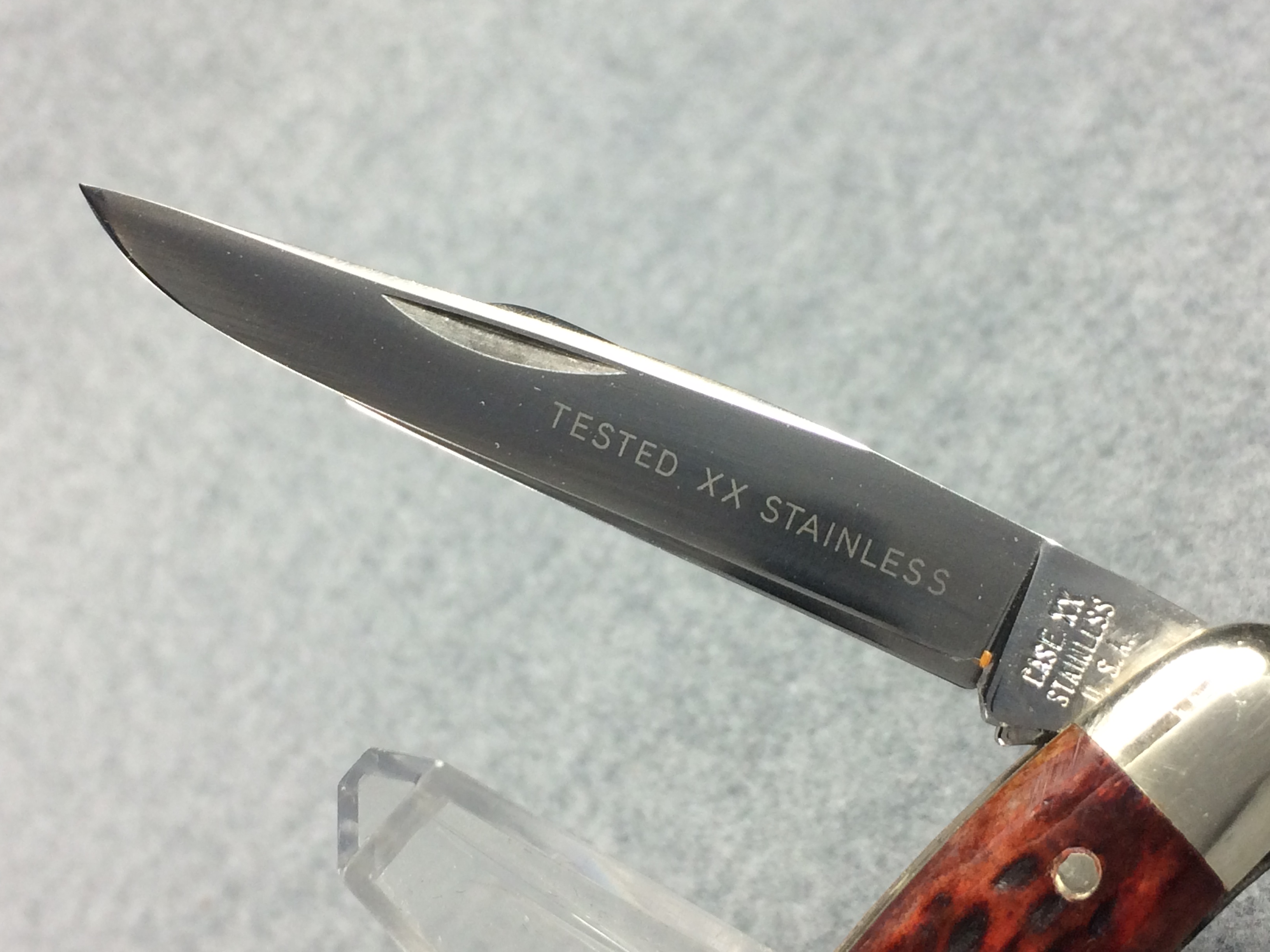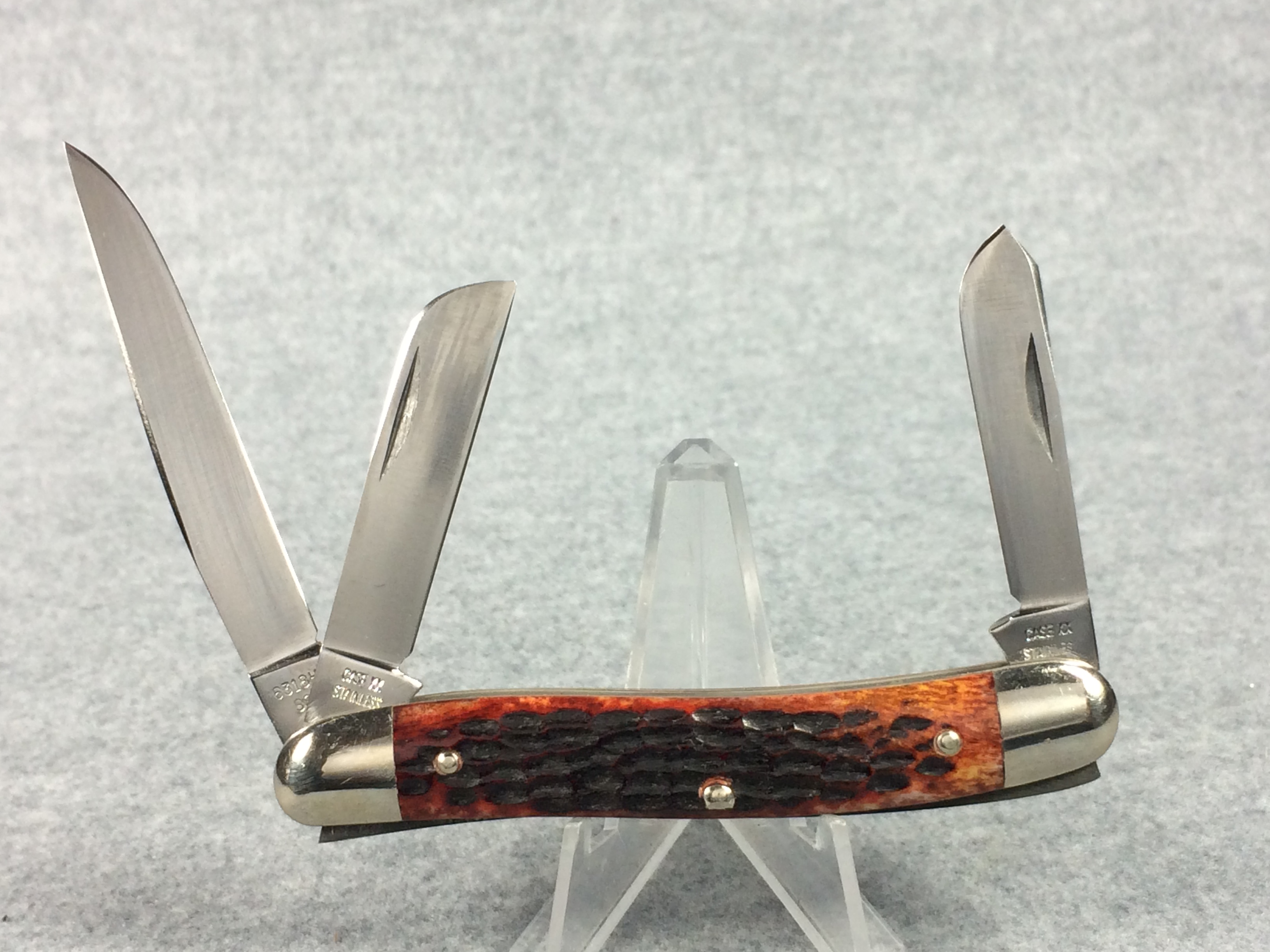 October 26, 2025 - 3-5/8 inches closed. 6-1/4 inches open. Made in USA. "CASE XX STAINLESS U.S.A." (no dots), "CASE XX STAINLESS" and "6318HP SSP" tang stamps. Double oval open-C "CASE" shield. Stainless steel blades. Master blade stamped "TESTED XX STAINLESS" (which is the identifier for all first model stainless knives). Red/Brown jigged bone handle. Nickel Silver bolsters and liner.