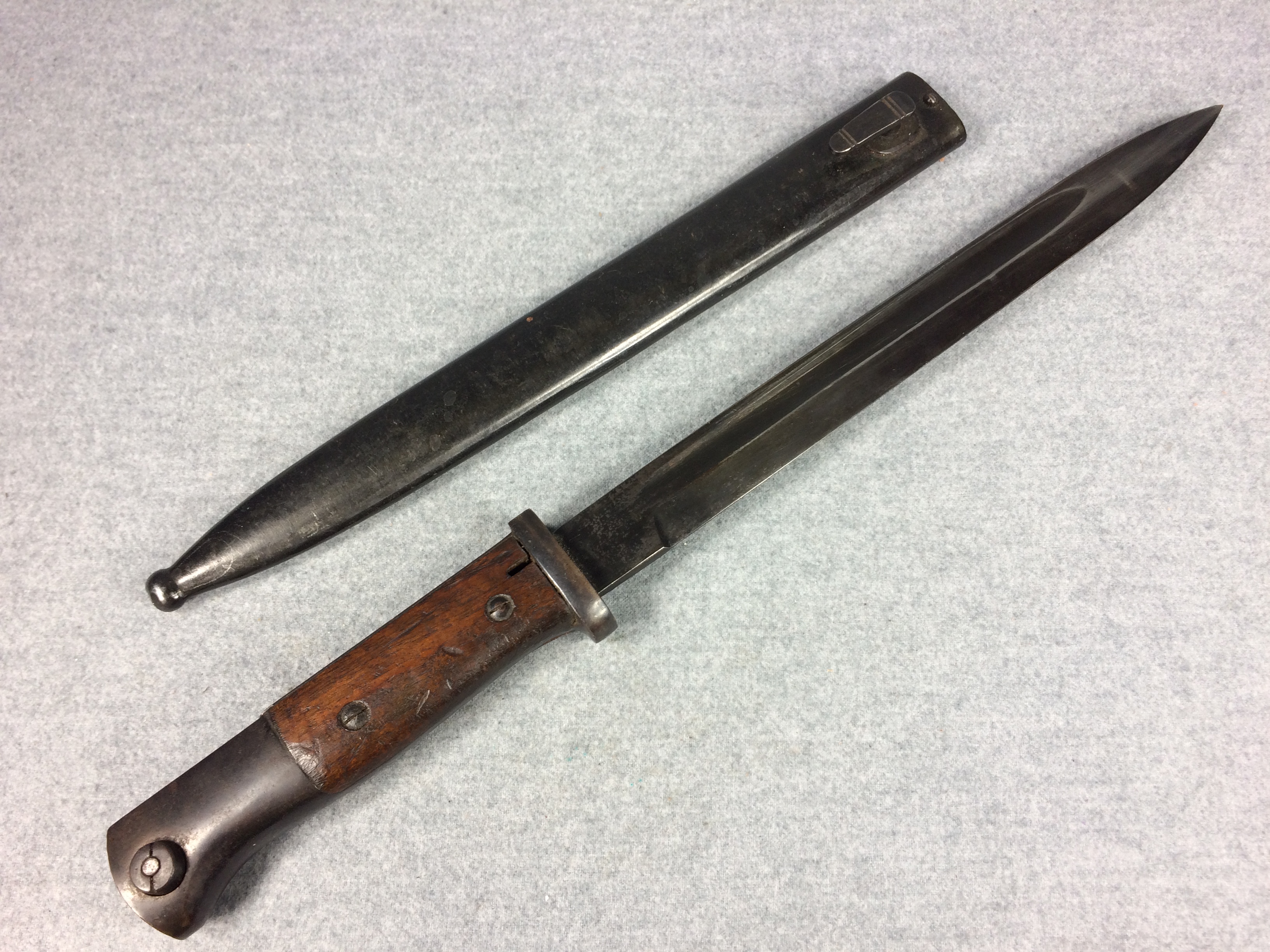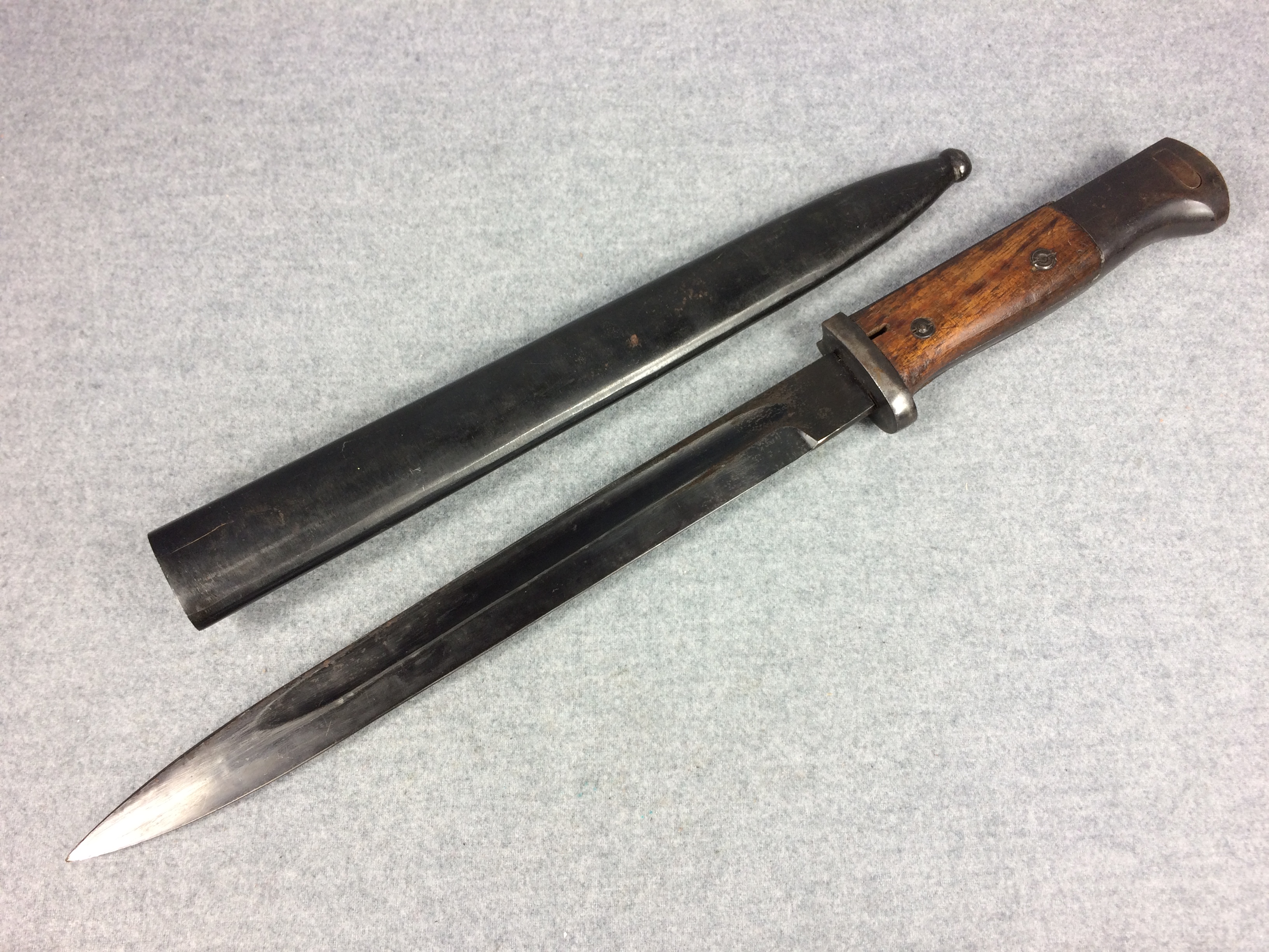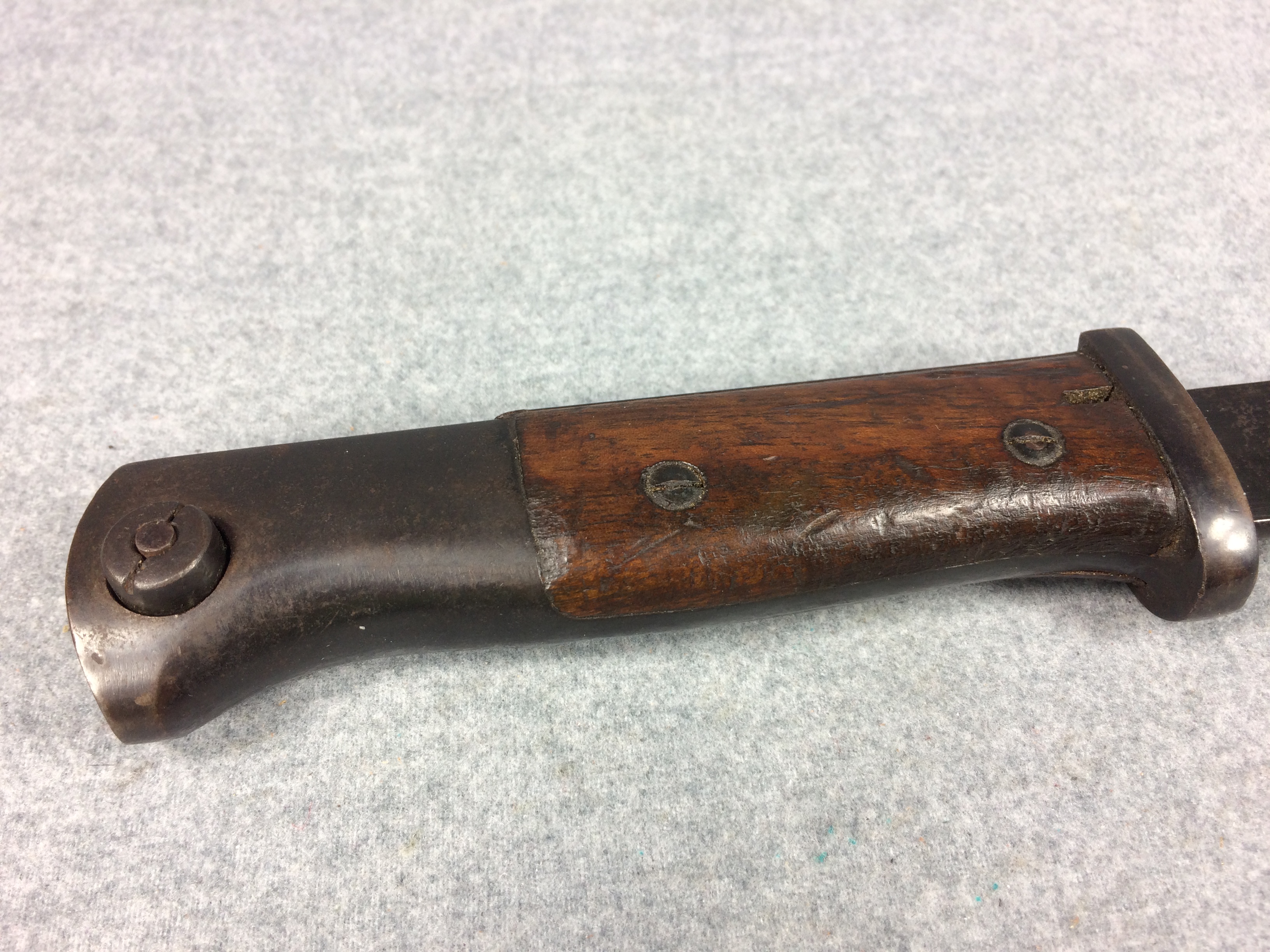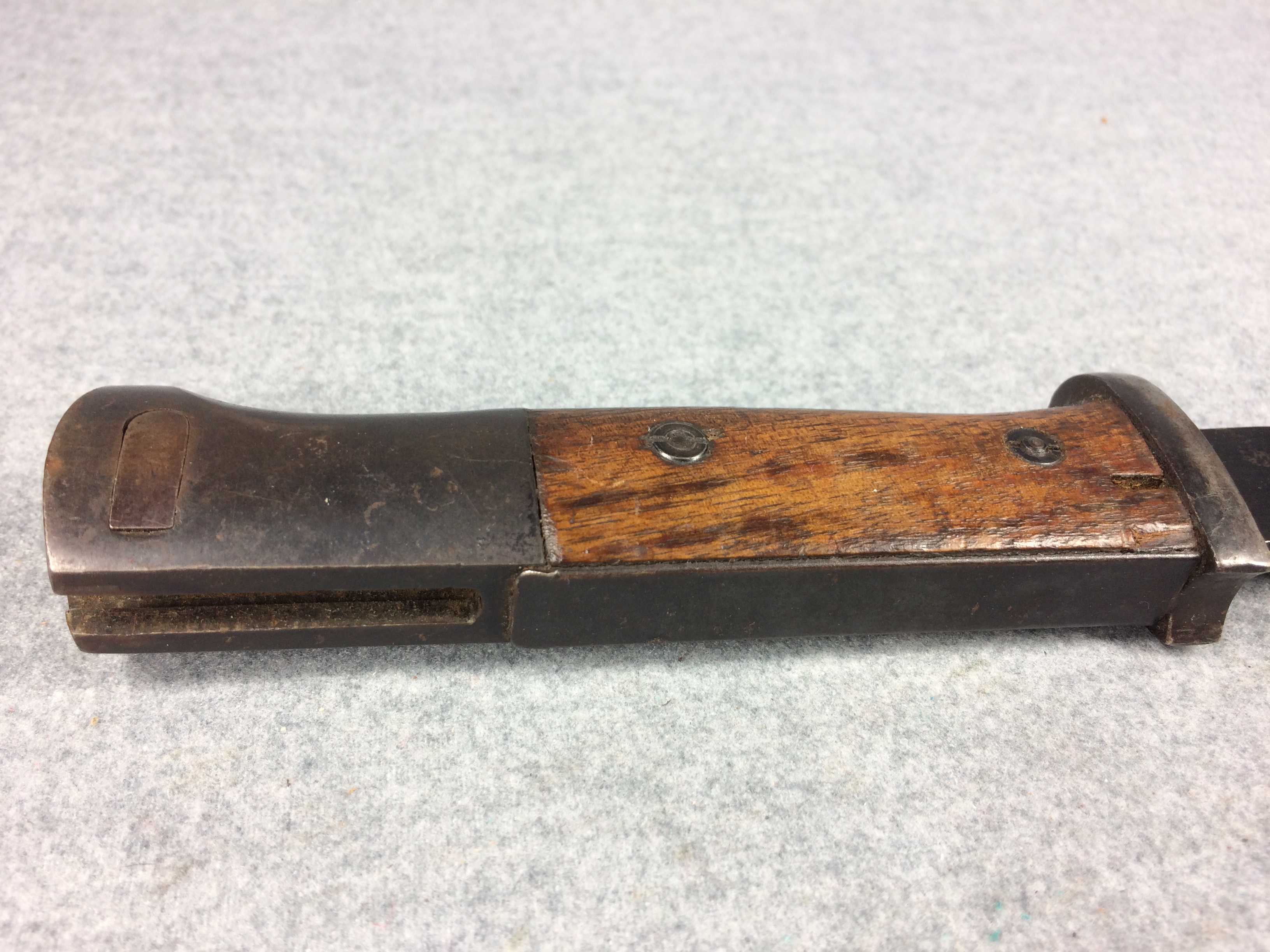 December 24, 2025 - Fixed Blade Bayonet. 15 inches long overall. 9-3/4 inch blade. Wood handle. With scabbard. No visible markings of any kind. Nice vintage condition.