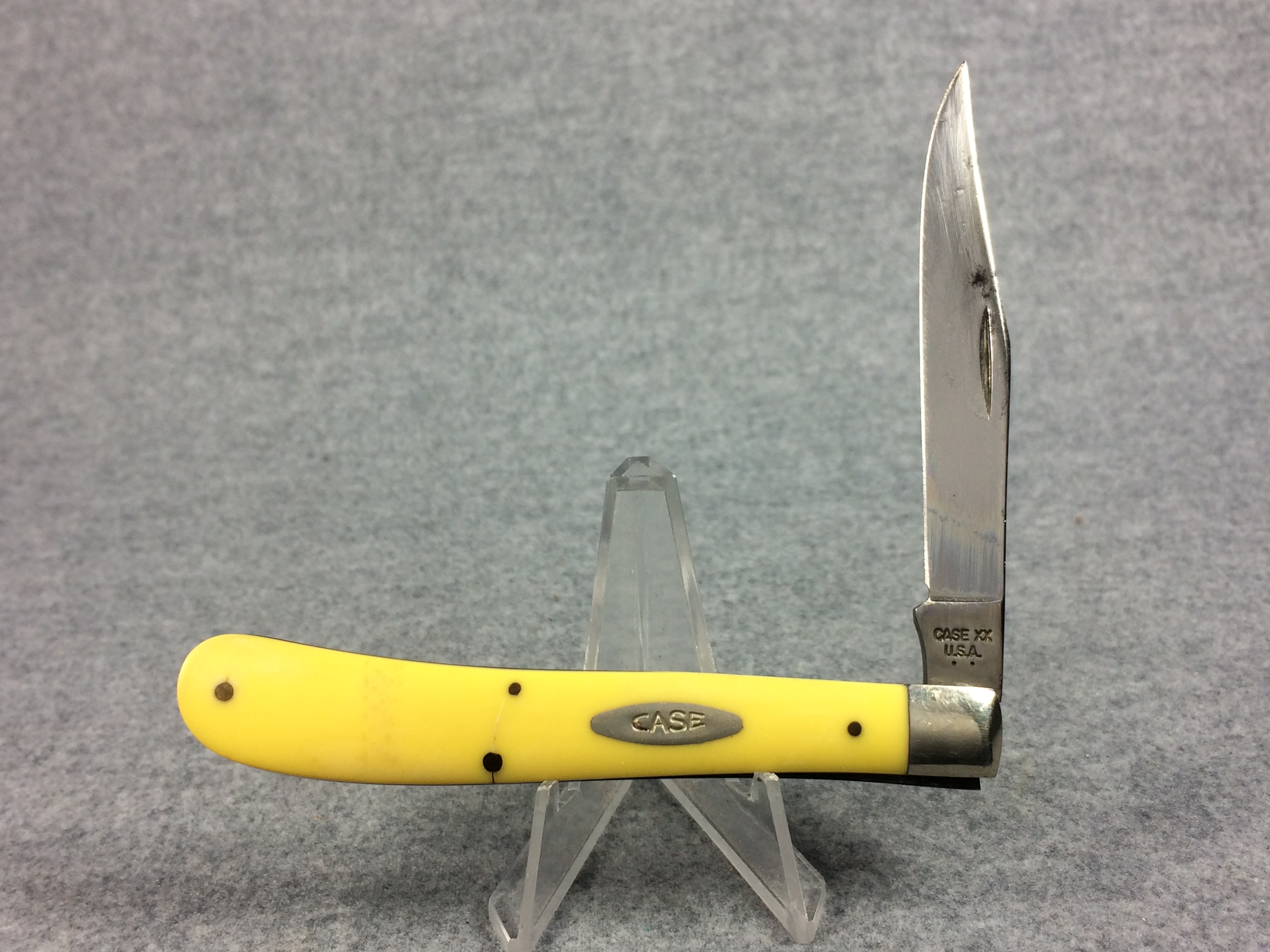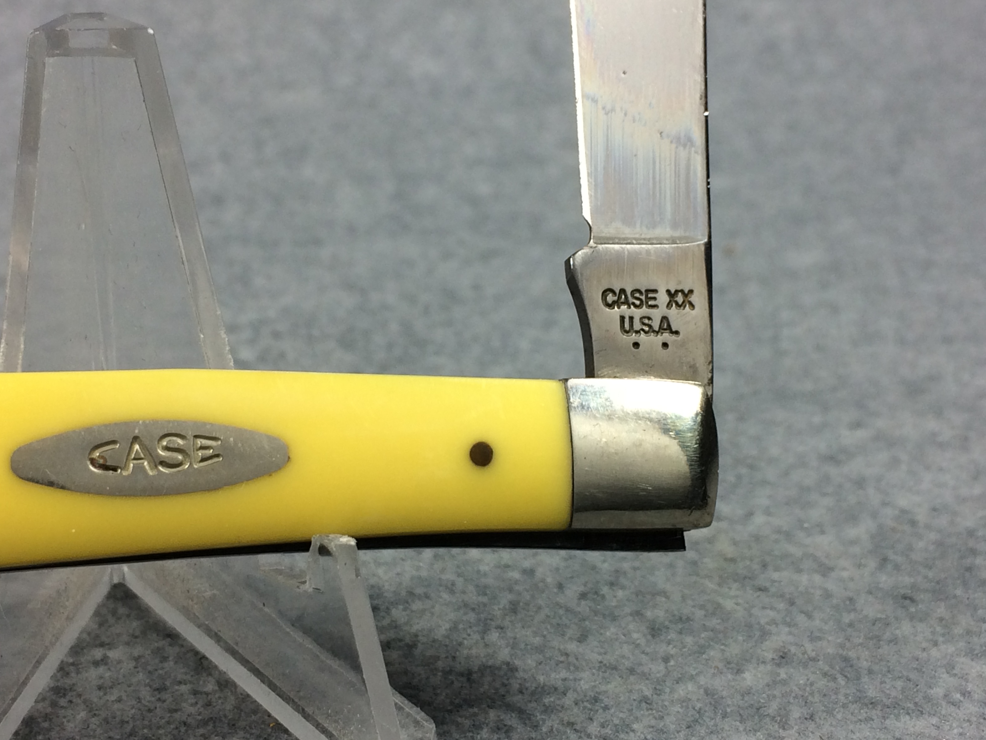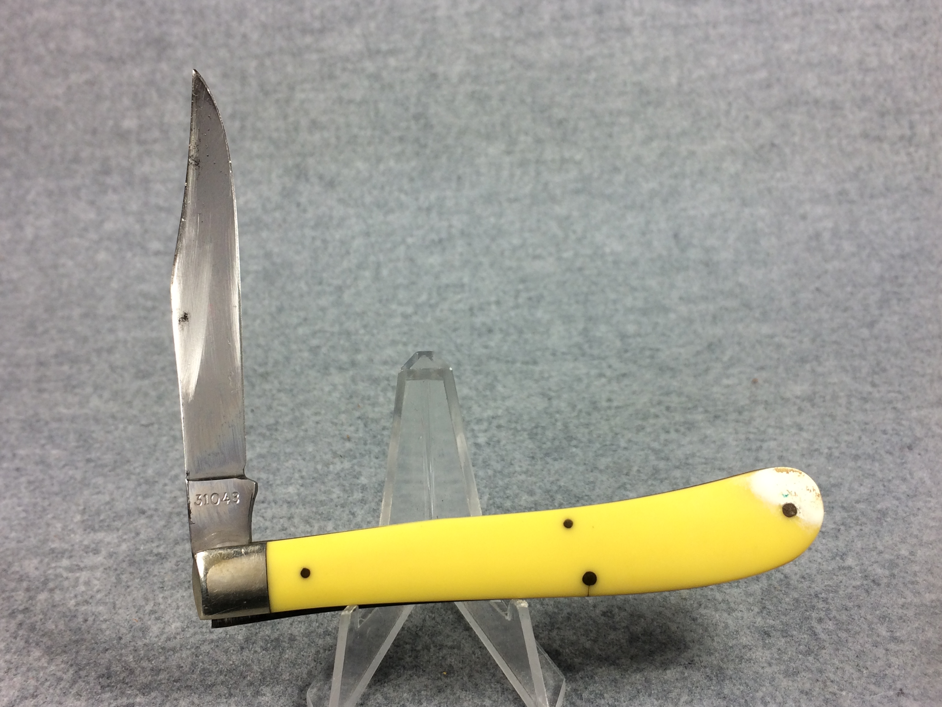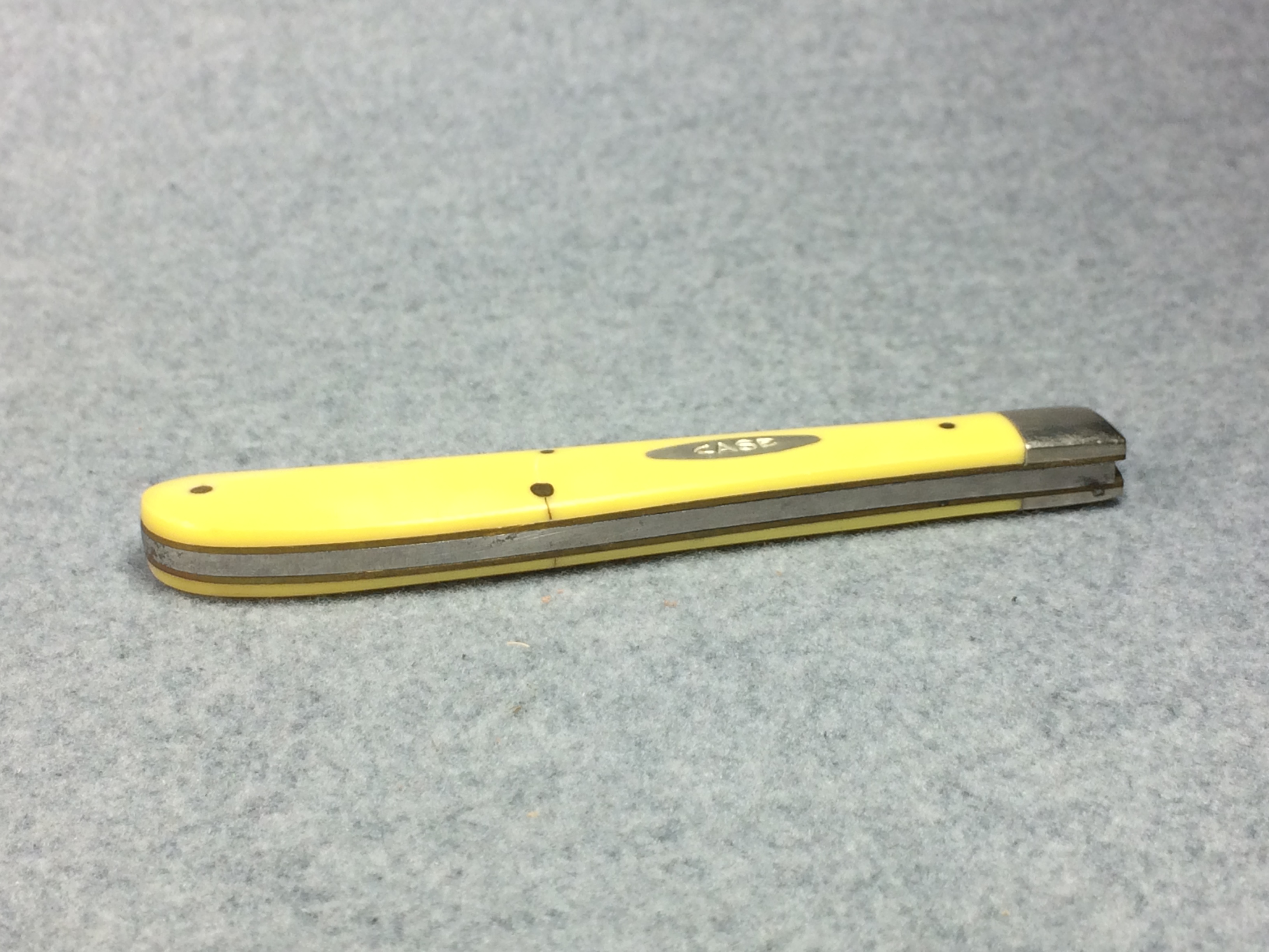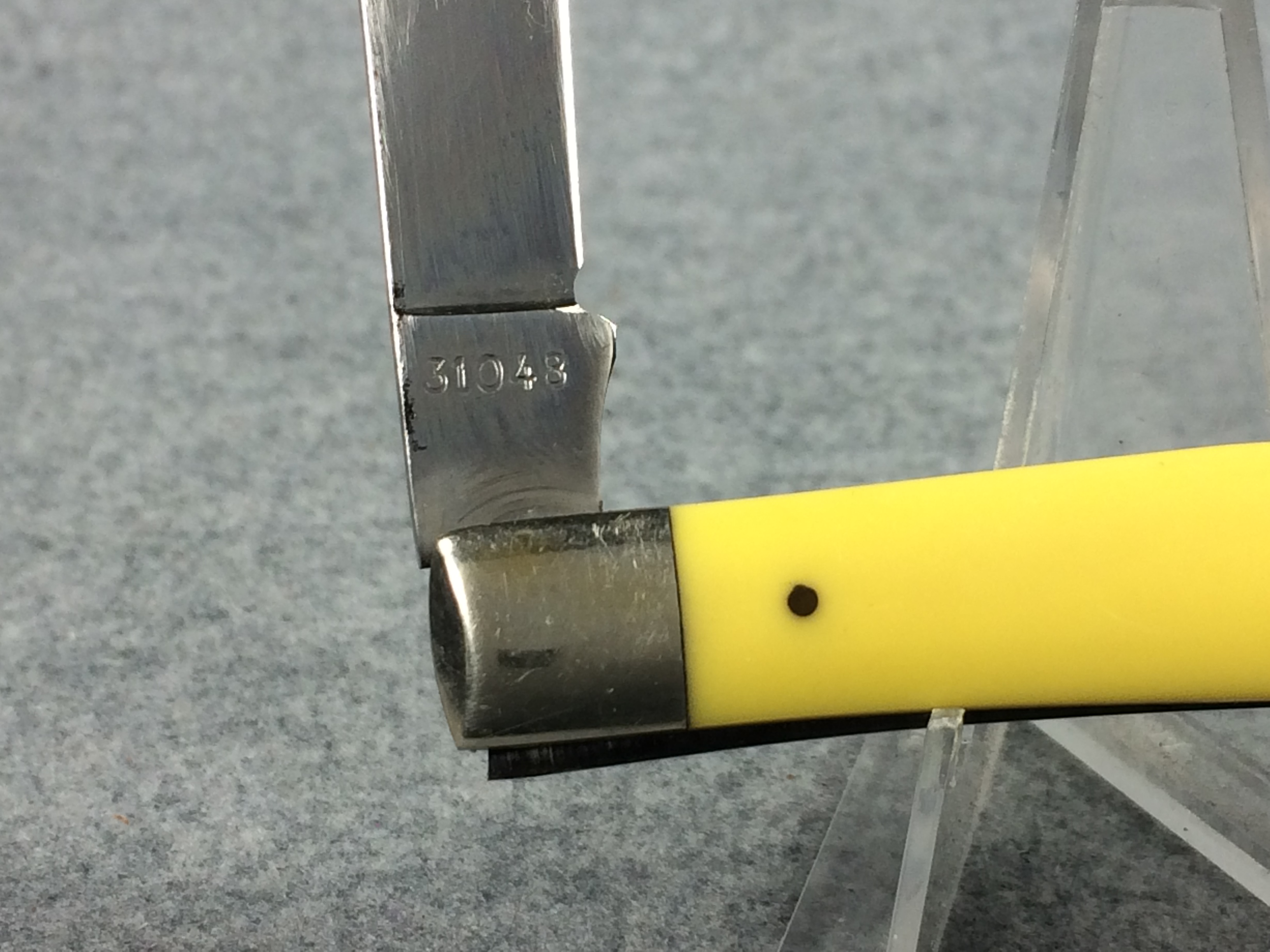 October 26, 2025 - 4 inches closed. 7-1/4 inches open. Made in USA. "CASE XX U.S.A. * *  " (2 dot) and "31048" tang stamps. Single Oval Open C "CASE" shield. Chrome vanadium blade. Yellow Composite handle. Nickel Silver bolsters. Brass liner.
