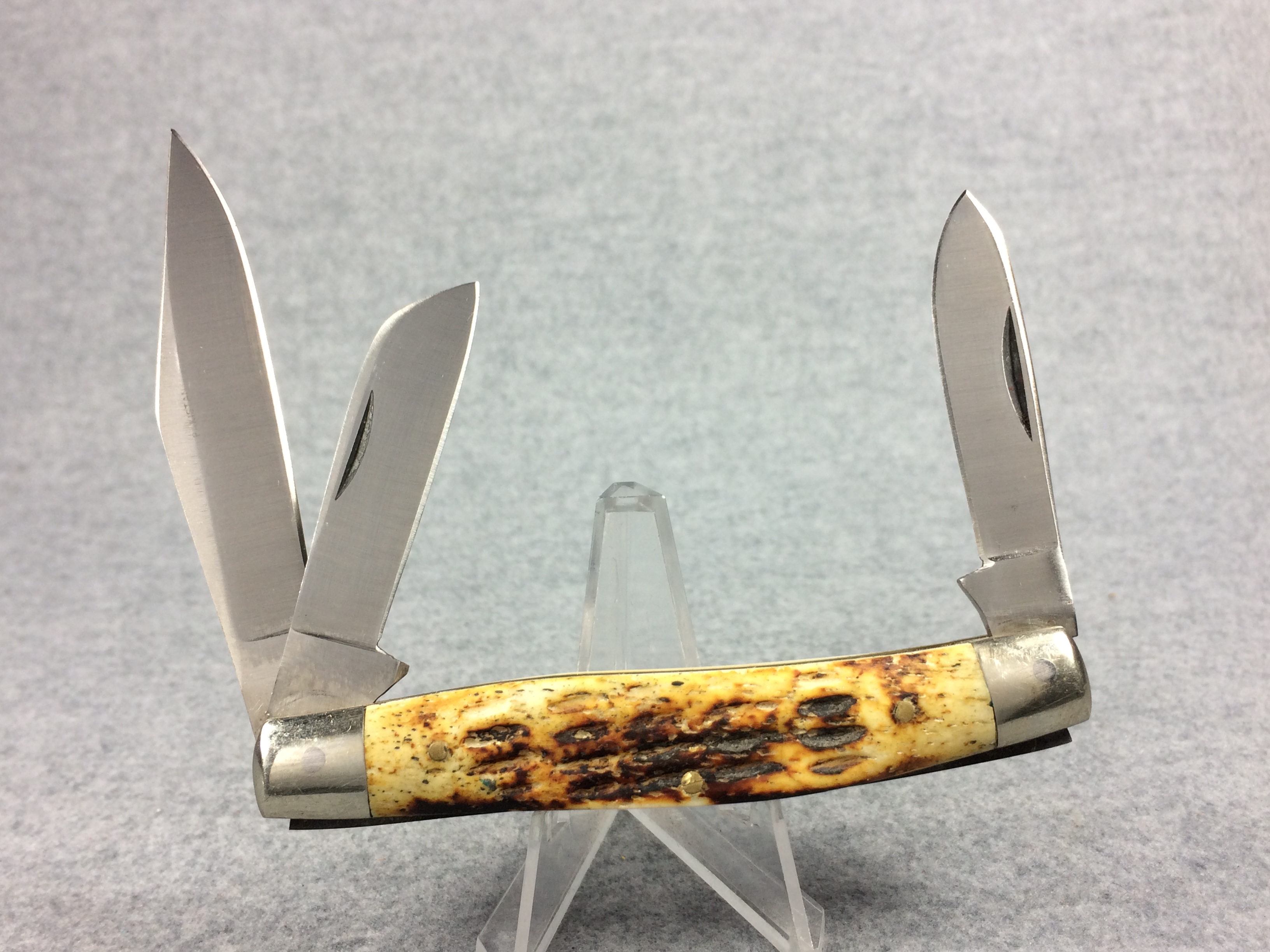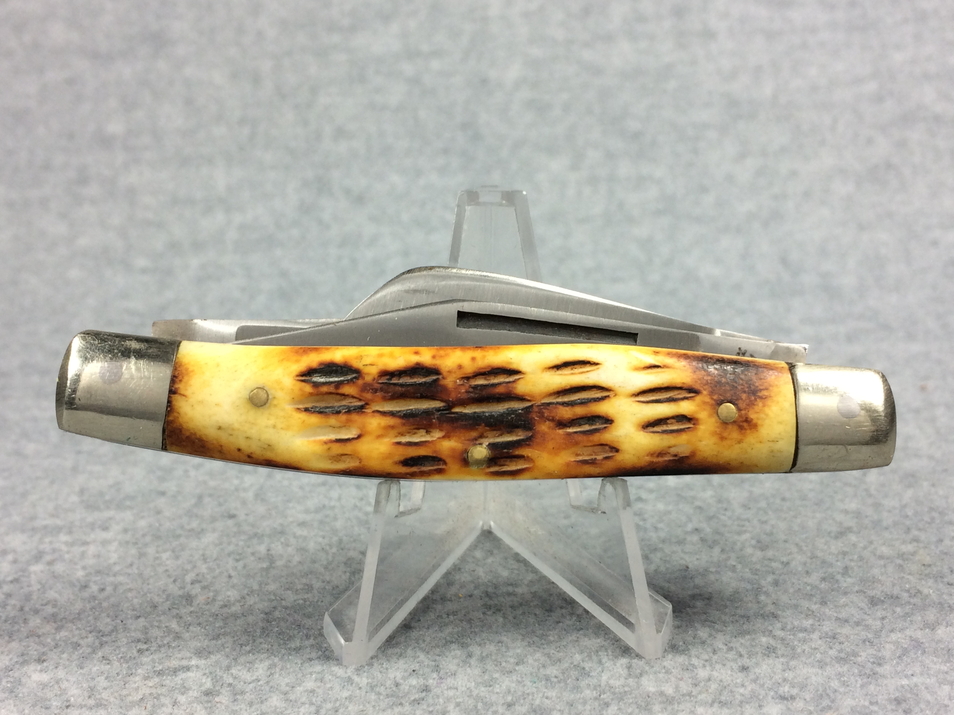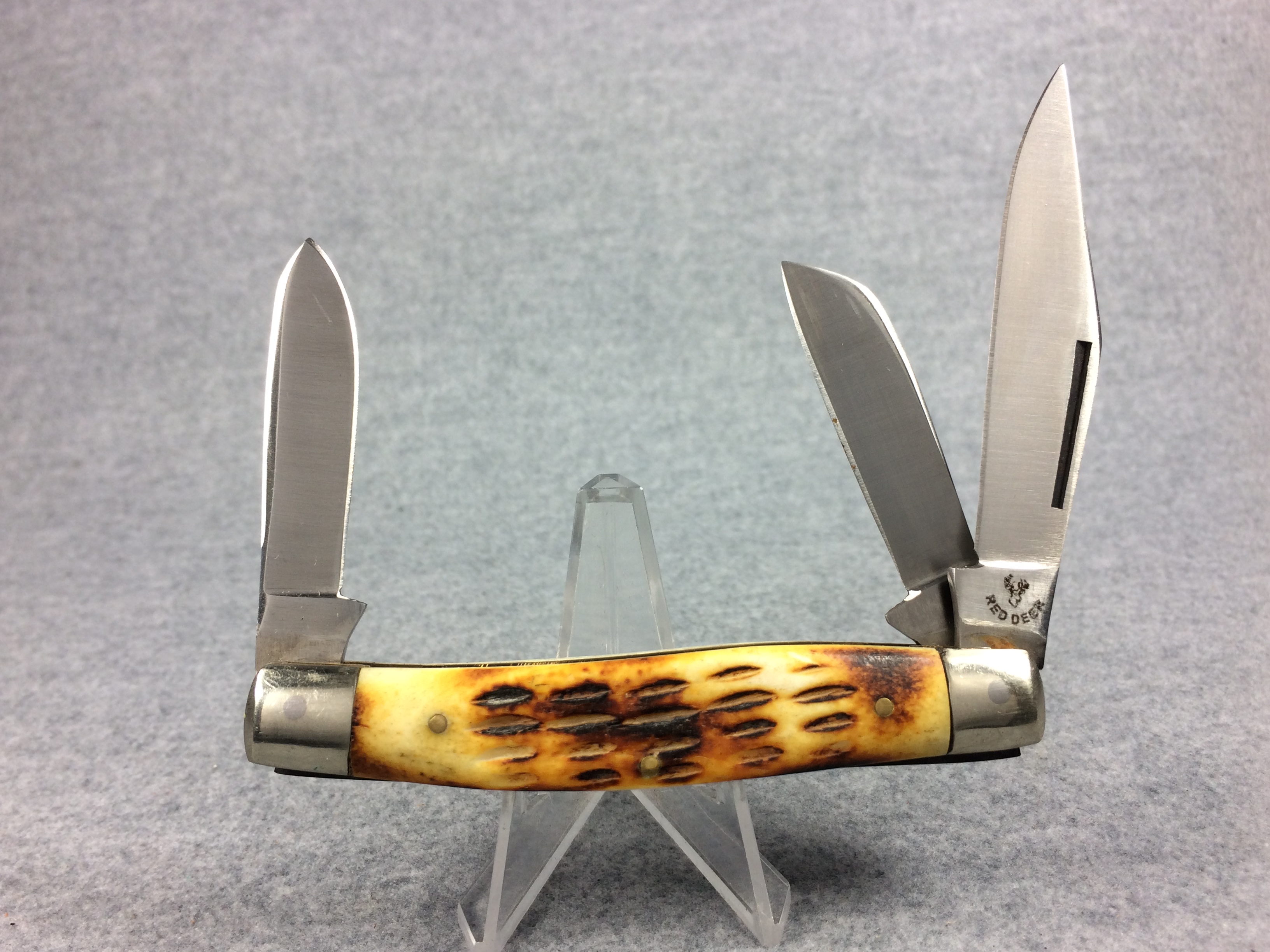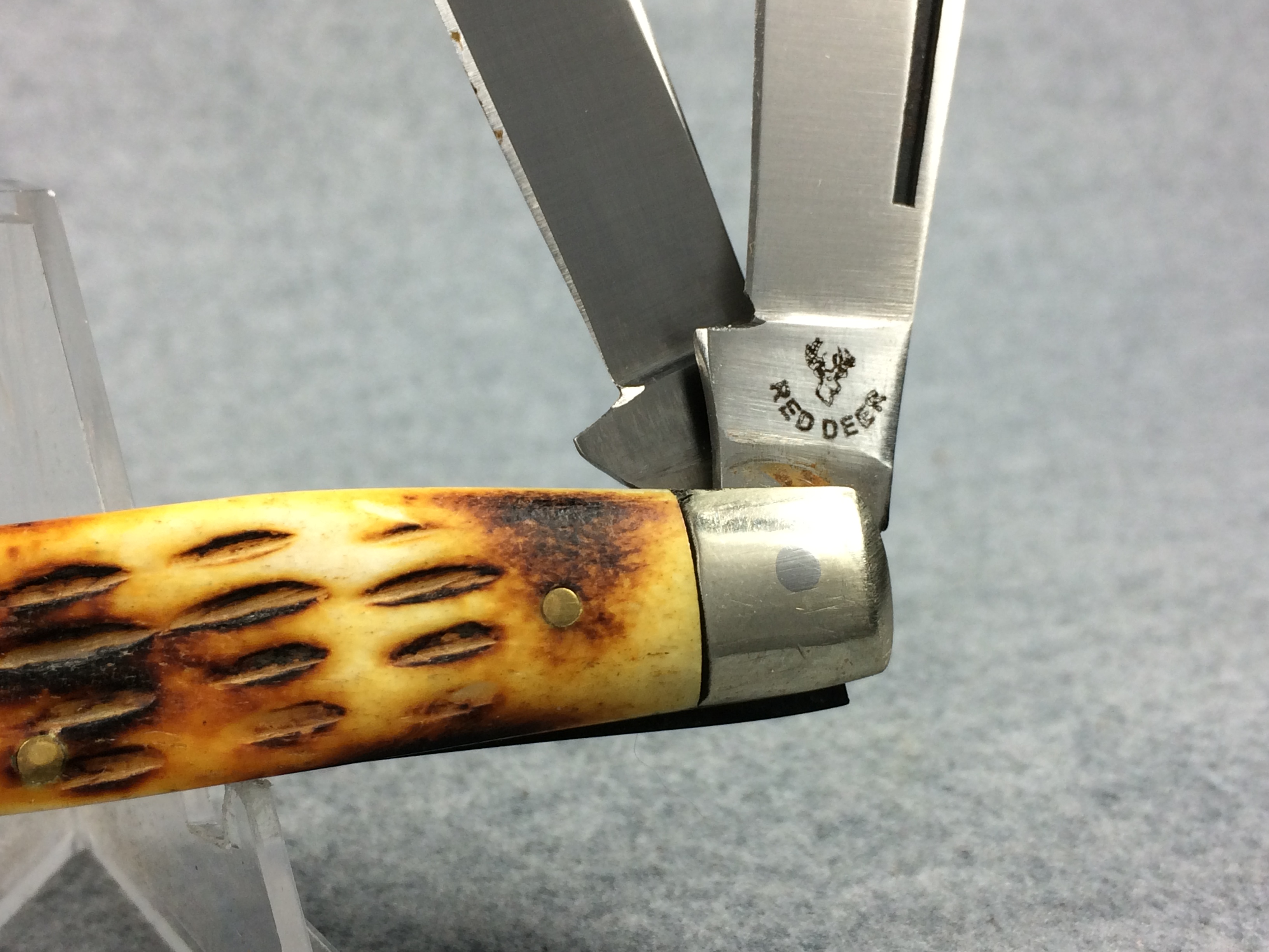 February 03, 2026 - 3-5/8 inches closed. 6-7/8 inches open. RED DEER" with logo tang stamp. No shield. Jigged Torched Bone handle. Nickel Silver bolsters. Brass liner.