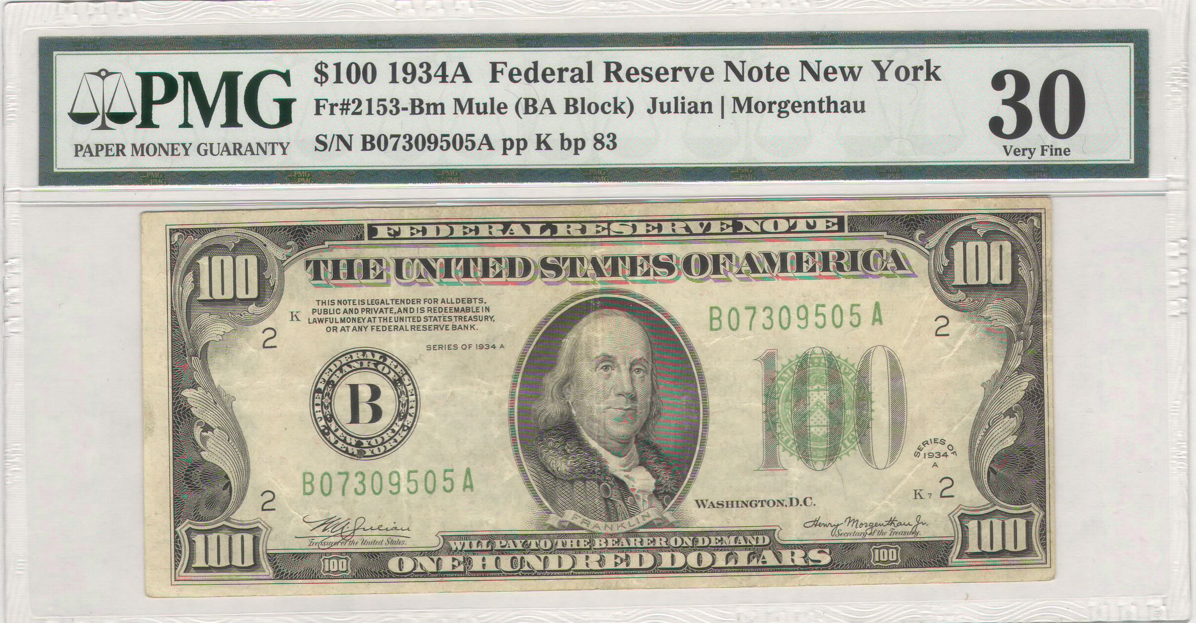 You have: (Fr-2153bm) 1934-A $100 Federal Reserve Note (New York, MULE)