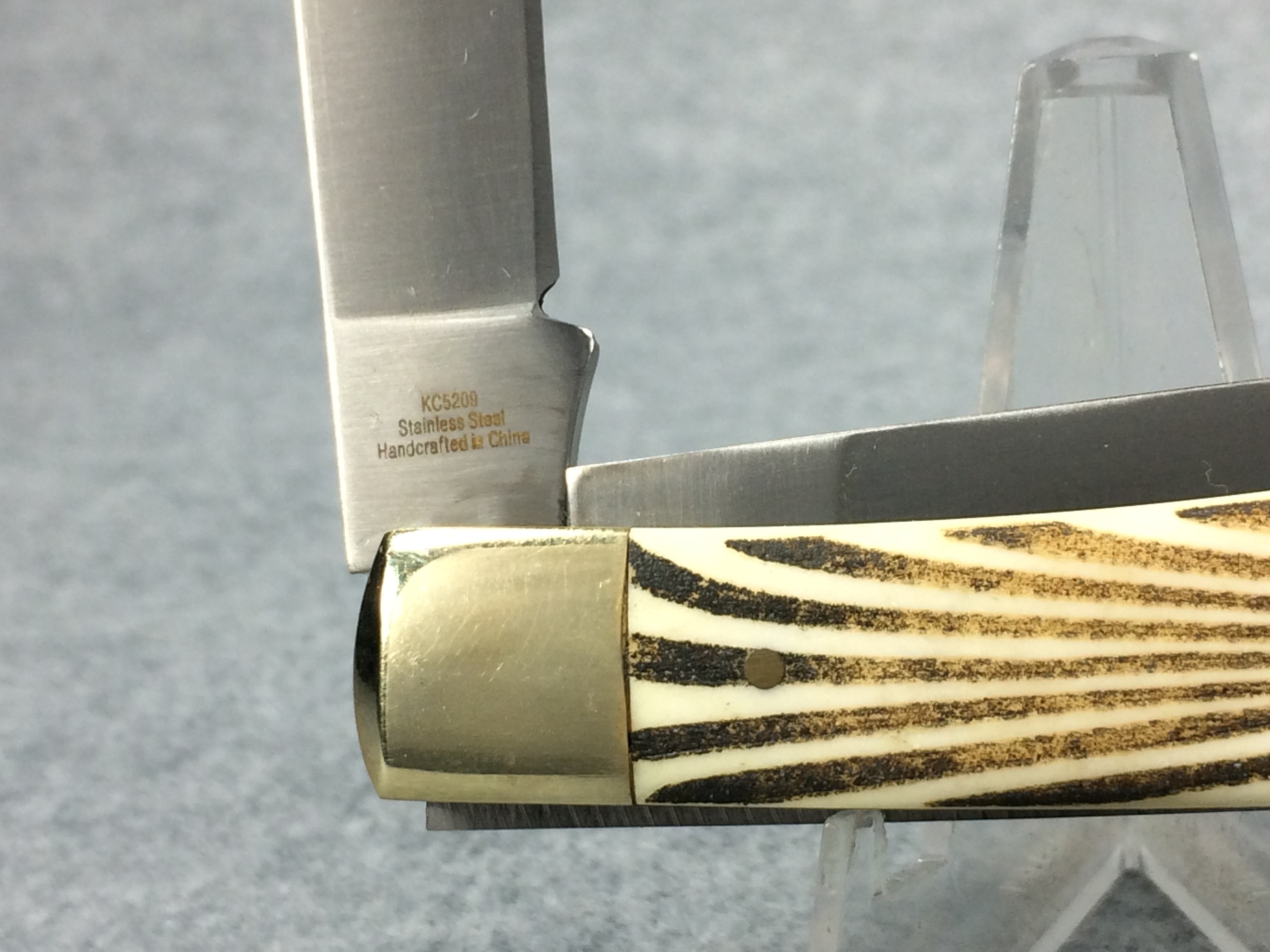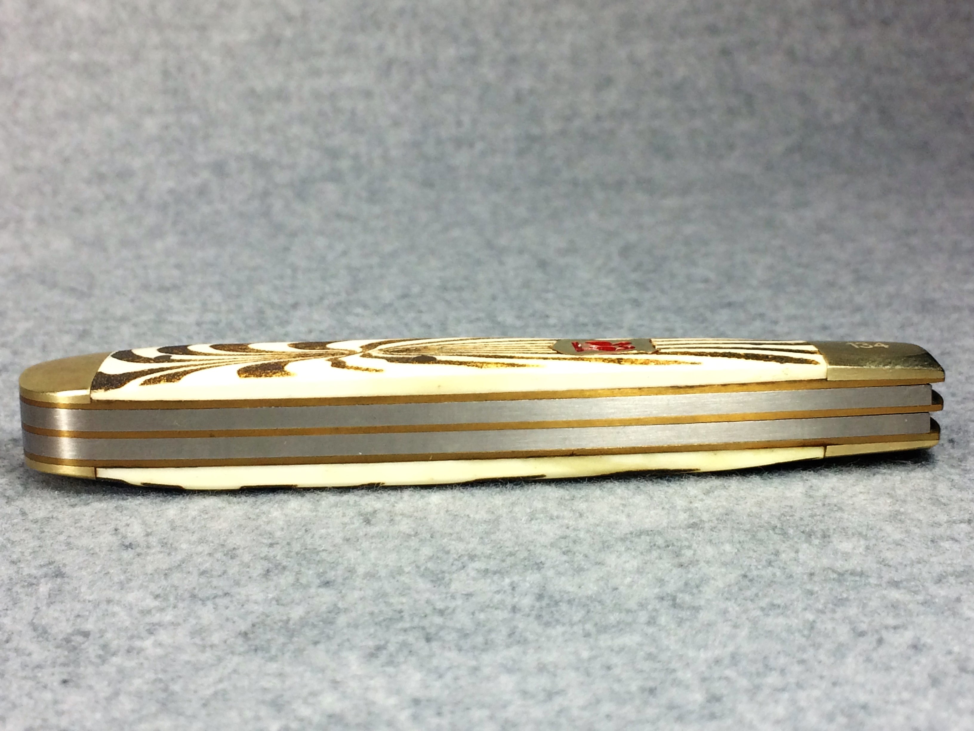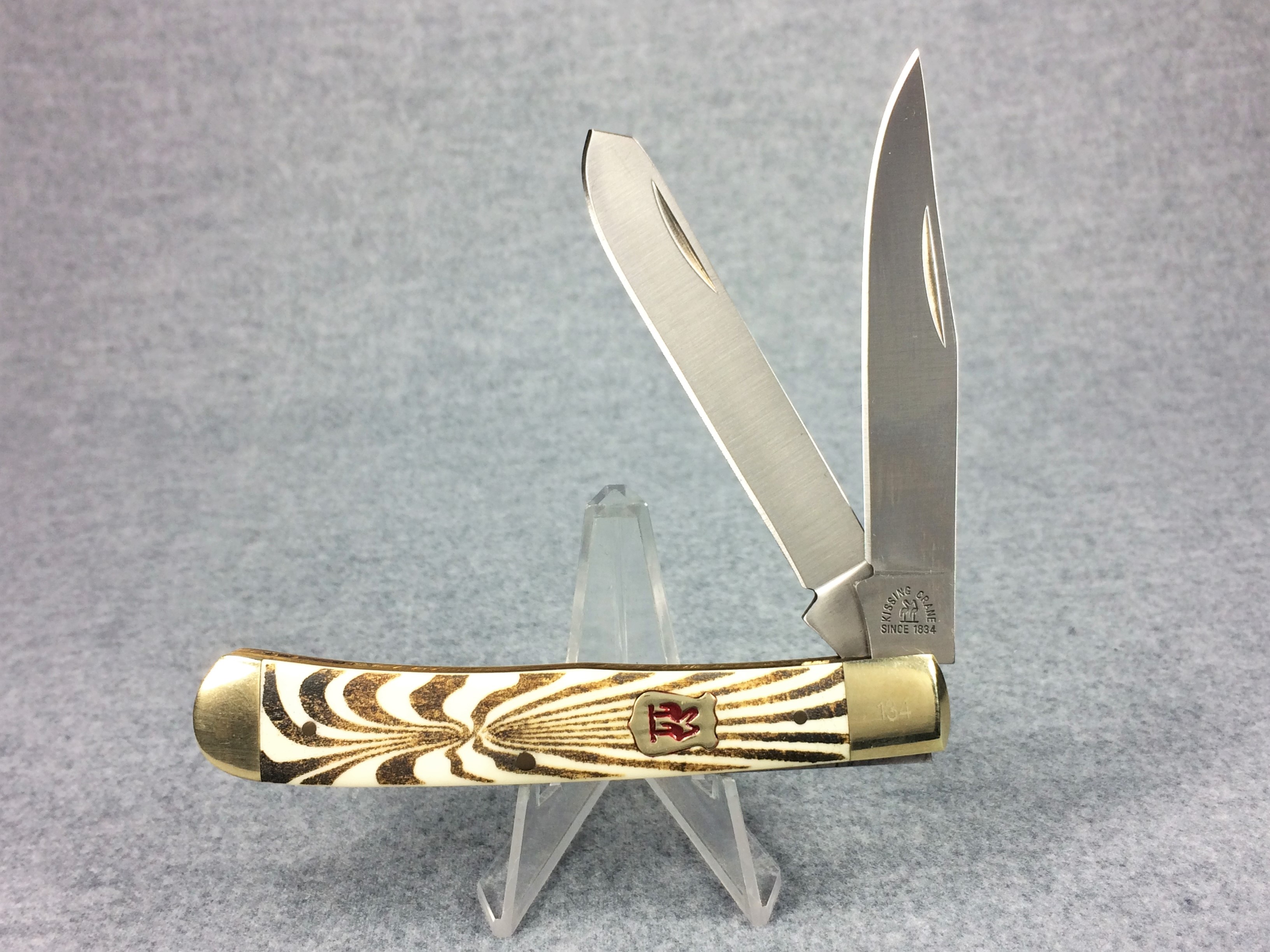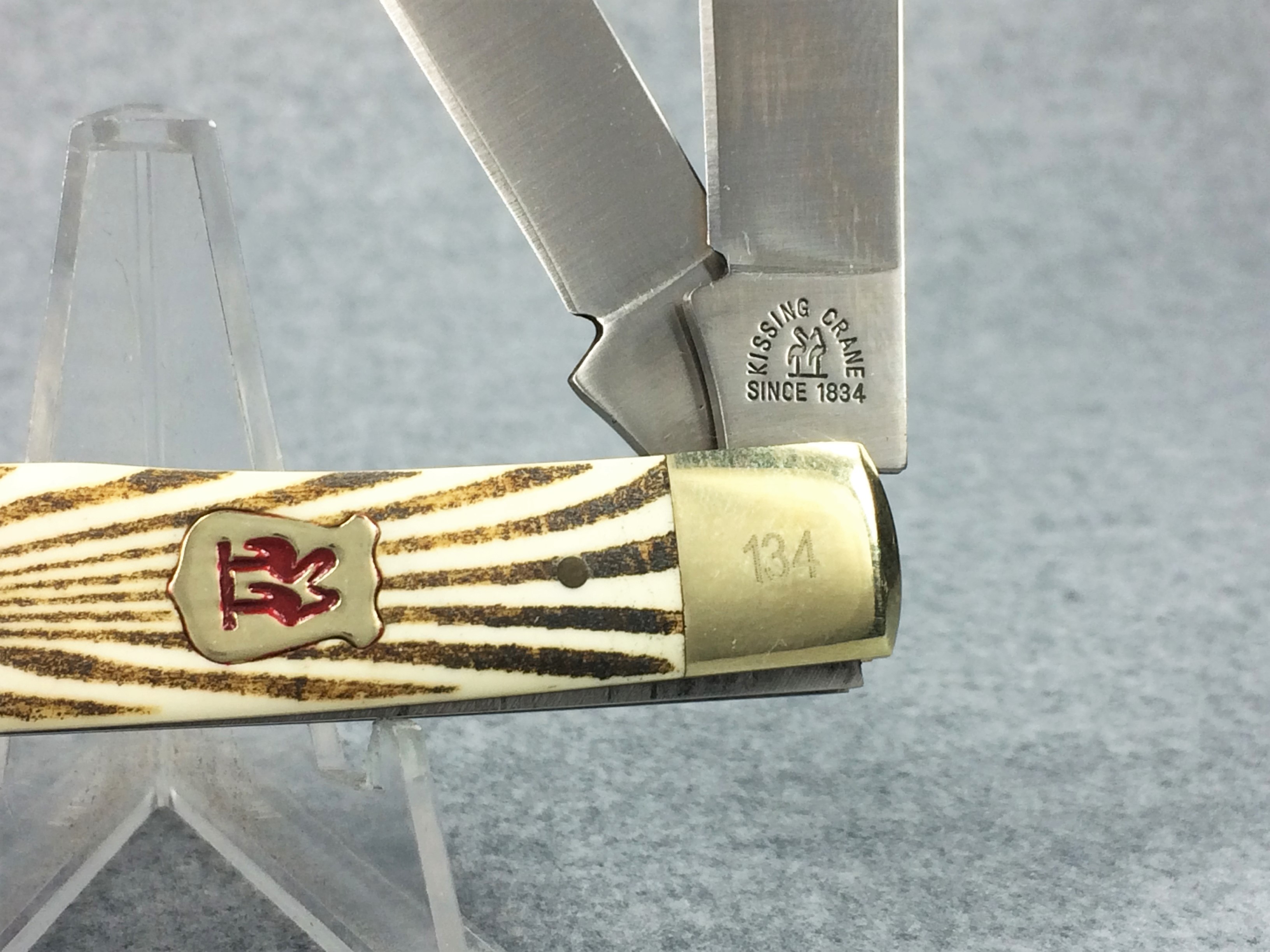January 14, 2026 - 2-Blade Trapper Knife. 4-1/8 inches closed. 7-3/8 inches open. "KISSING CRANE SINCE 1834 around logo, and "KC5209 Stainless Steel Handcrafted in China" tang stamps. Stainless steel blades. Red Kissing Crane badge shield. Smooth bone handle with burnt zebra pattern. Nickel Silver bolsters. Front right bolster etched with serial #134. Brass liner. No box.