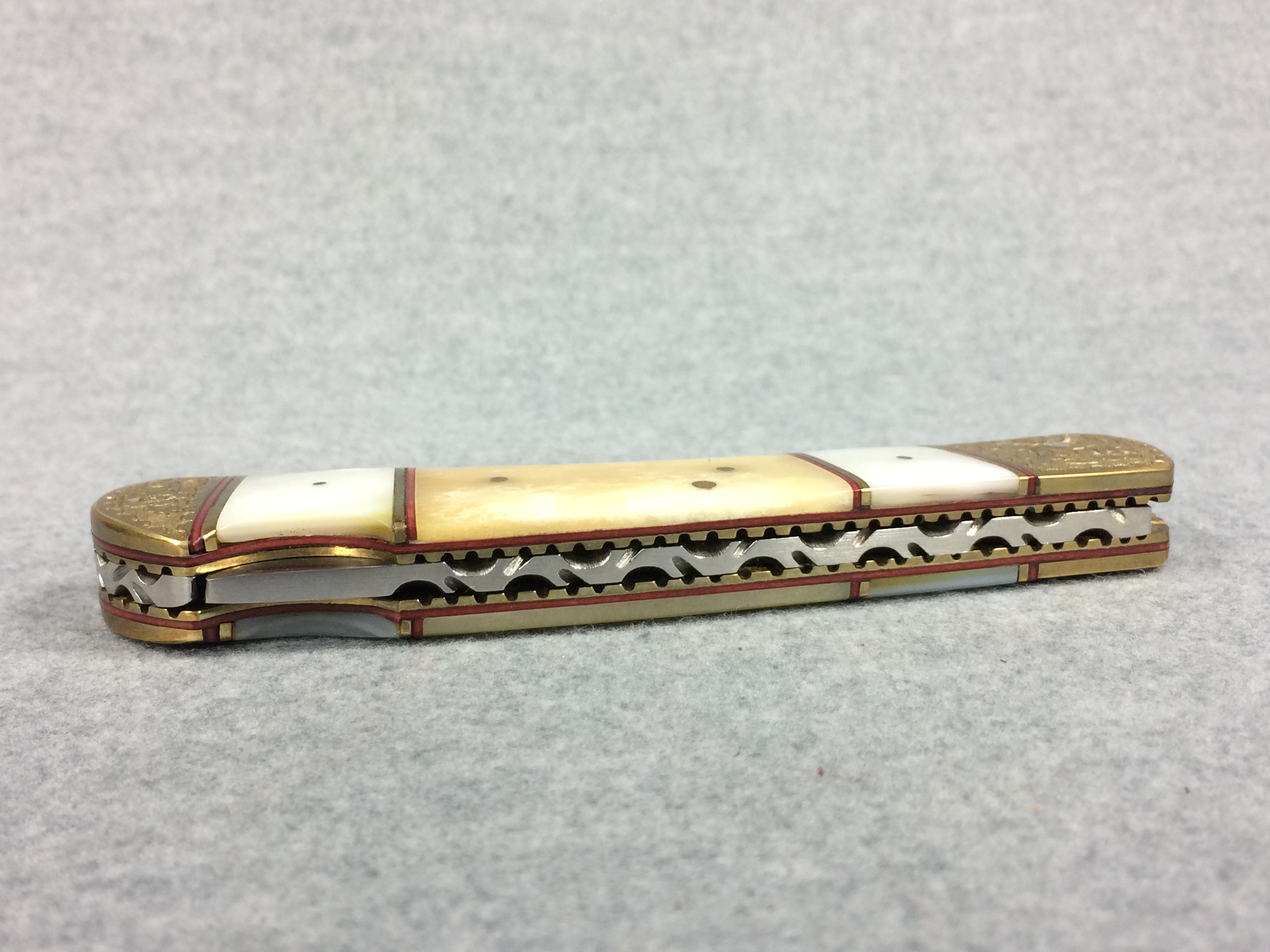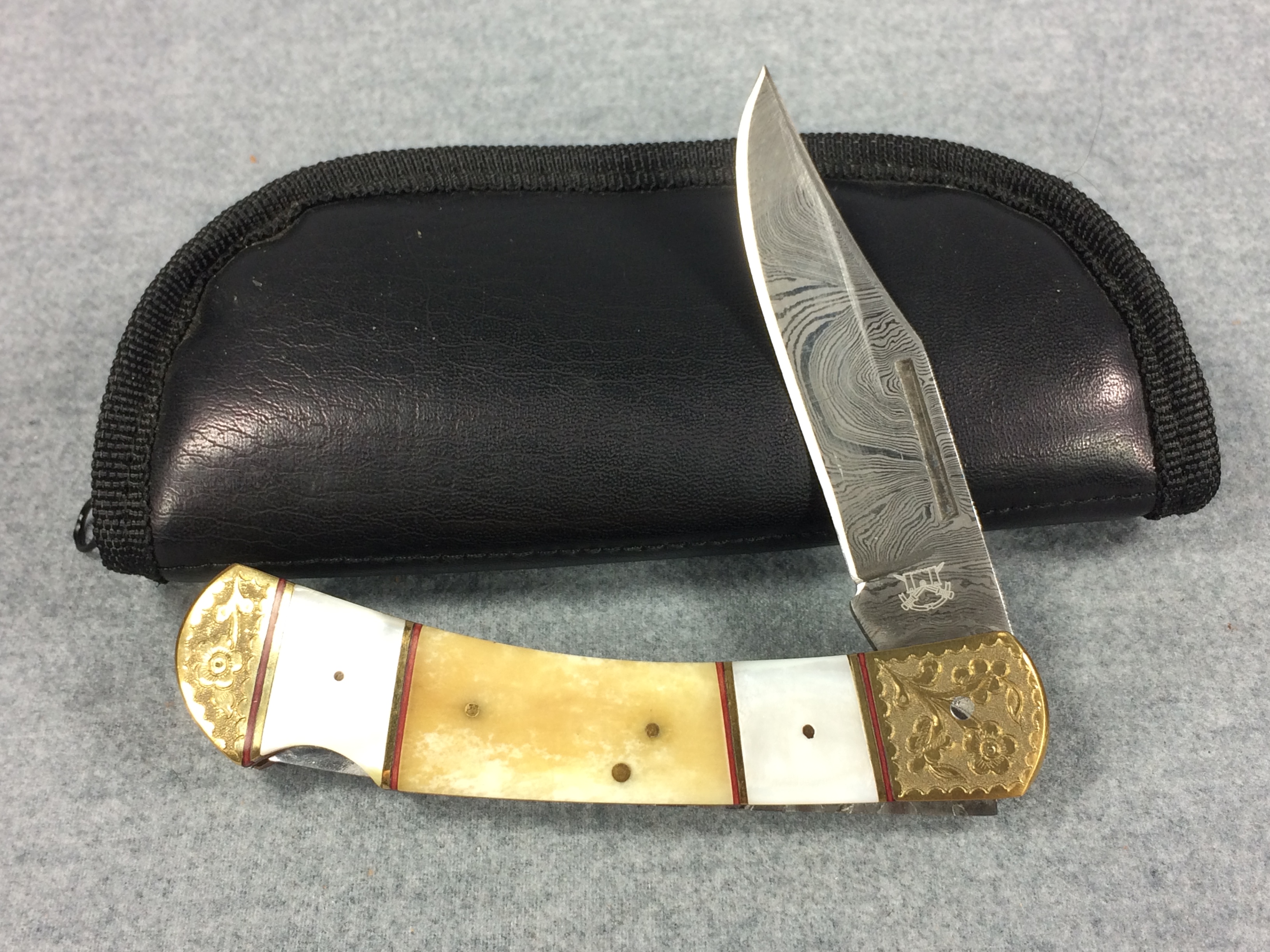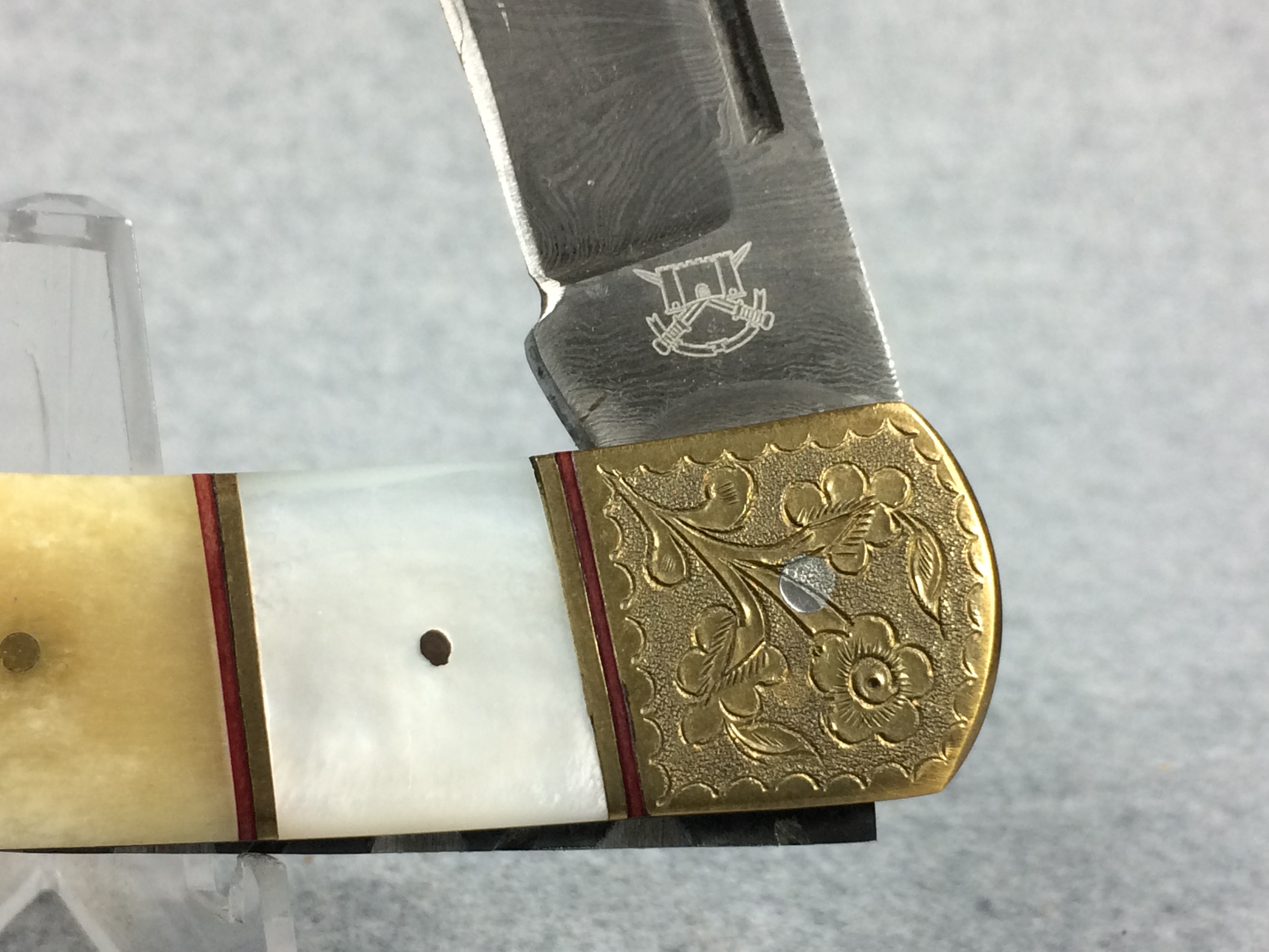 October 26, 2025 - 5 inches closed. 8-3/4 inches open. Sword & castle logo tang stamp. Damascus Blade. Camel bone and mother of pearl handle. Fancy file work on back spring and brass liner. Intricate etching on brass bolsters. With black storage pouch.