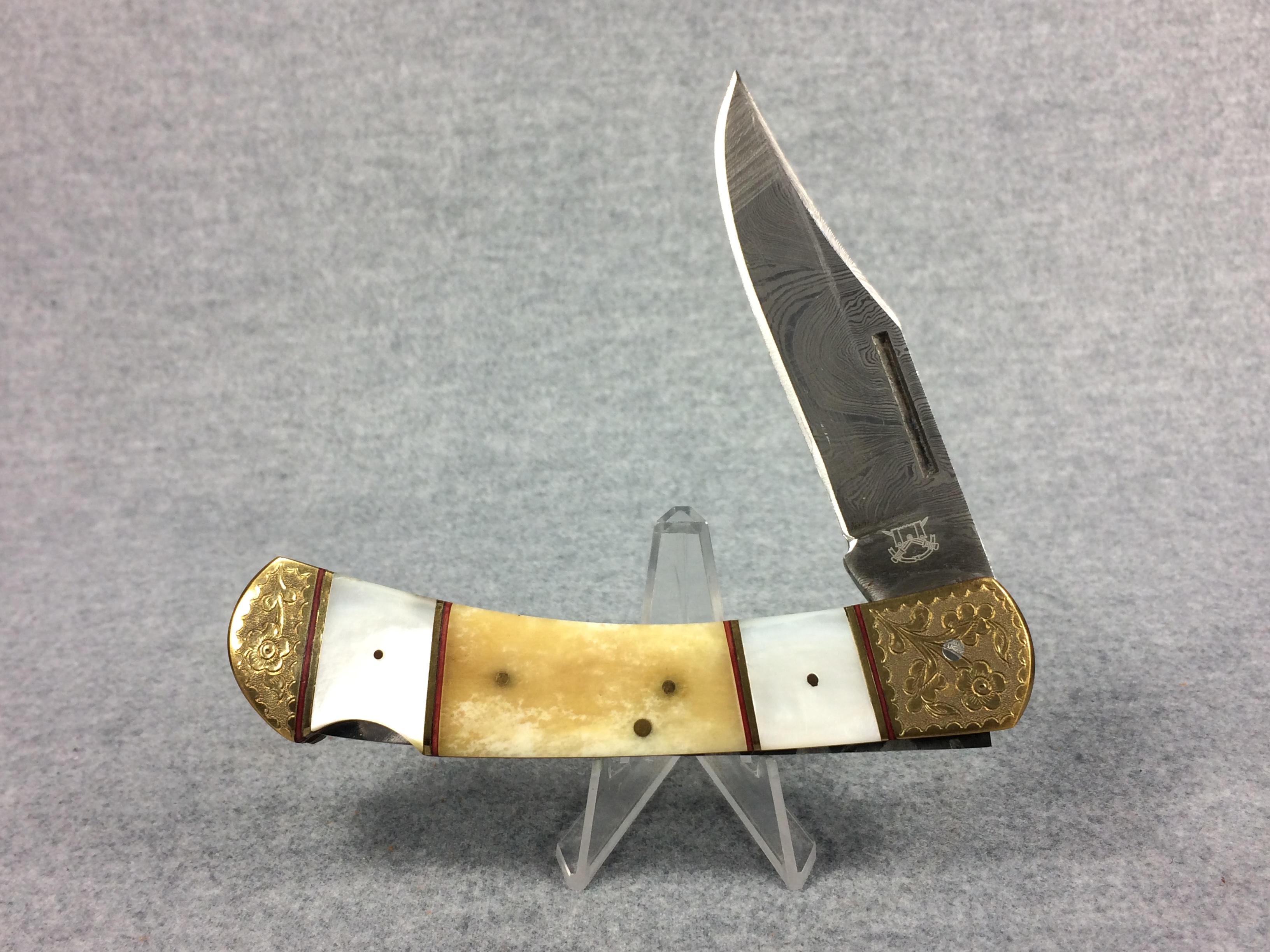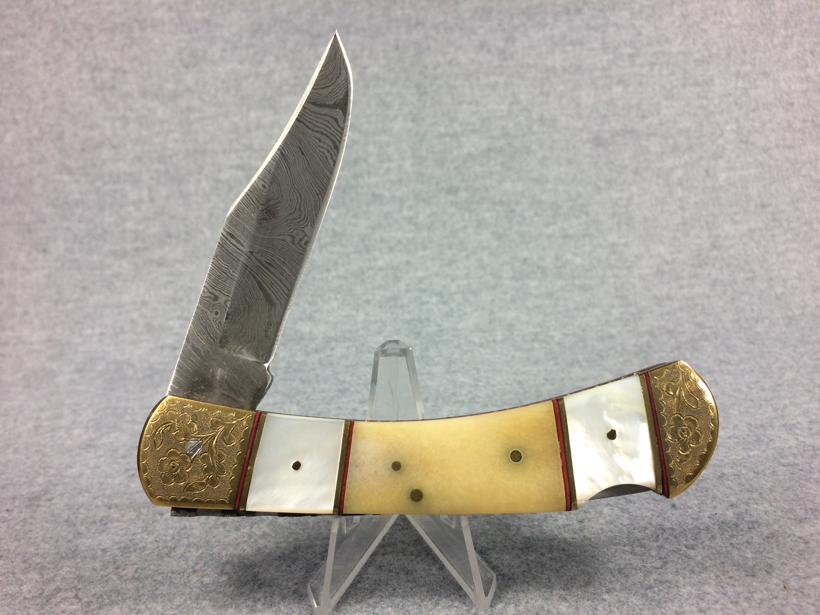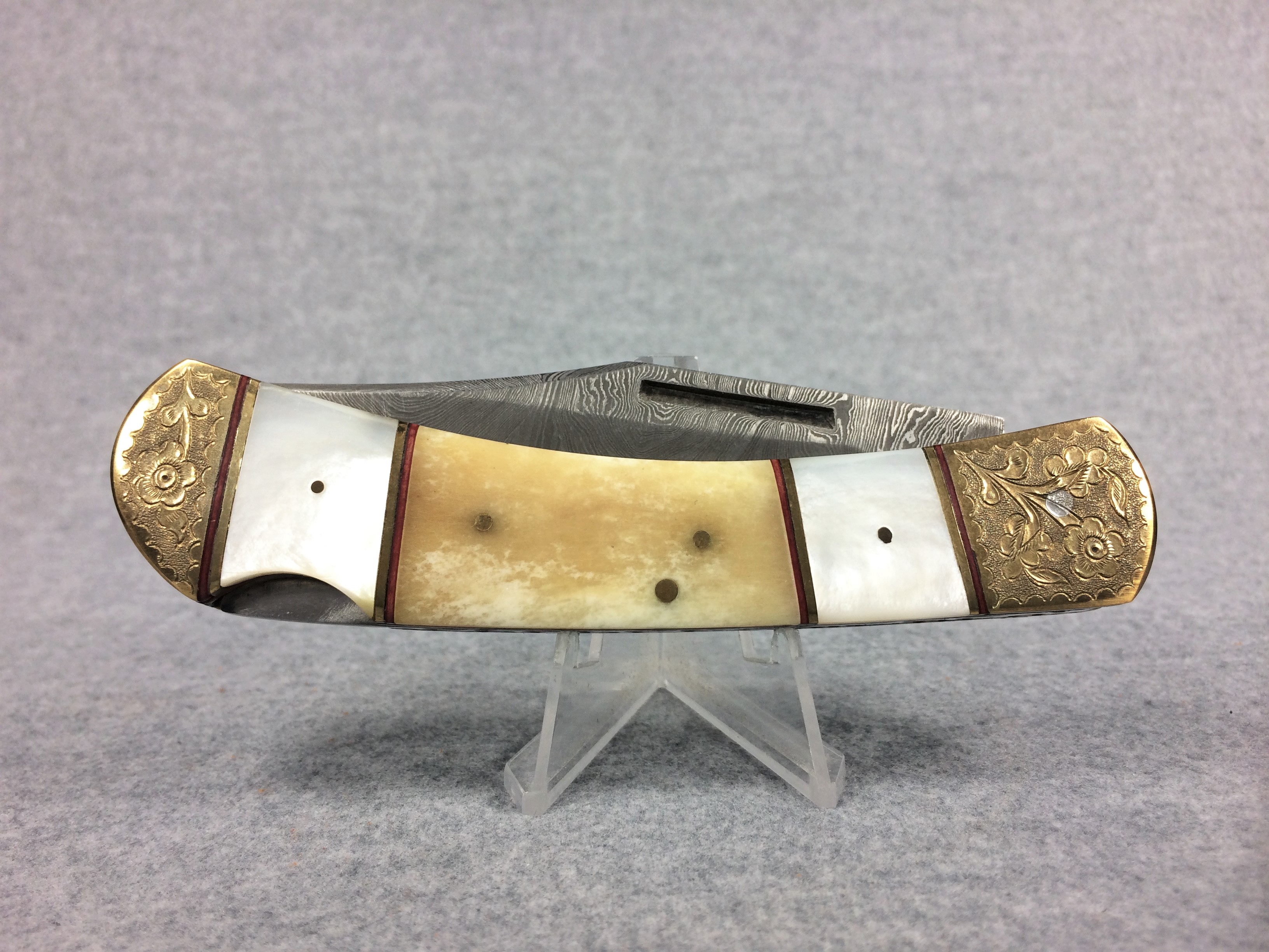 You have: SANA CUTLERY Camel Bone & Pearl Damascus Lockback
