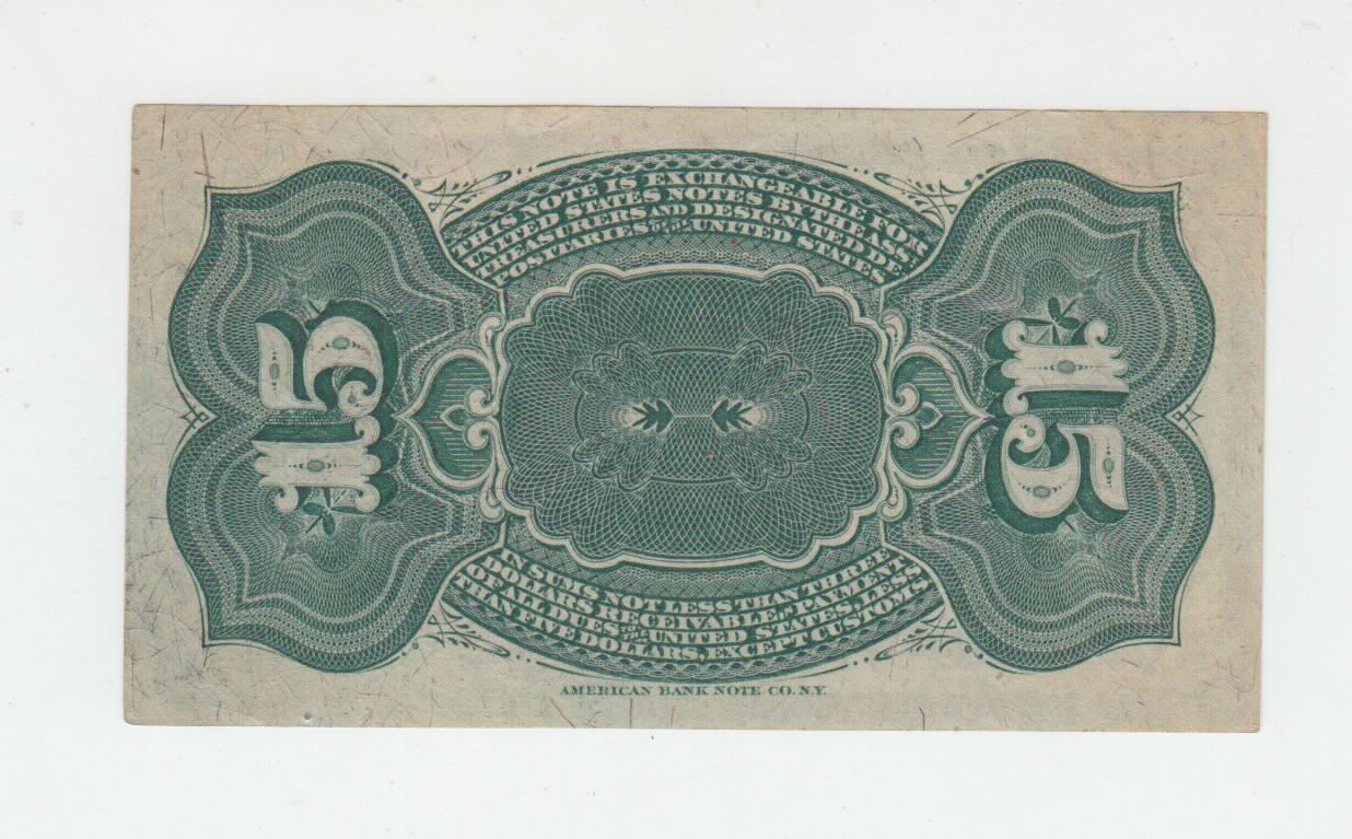 November 02, 2025 - 3-1/2 inches x 1-7/8 inches. Paper with violet fibers. Black with large red seal and bluish tint at right obverse. Green back. Bust of Columbia, left. Act Approved March 3rd, 1863. Printed at American Bank Note Co. N.Y.