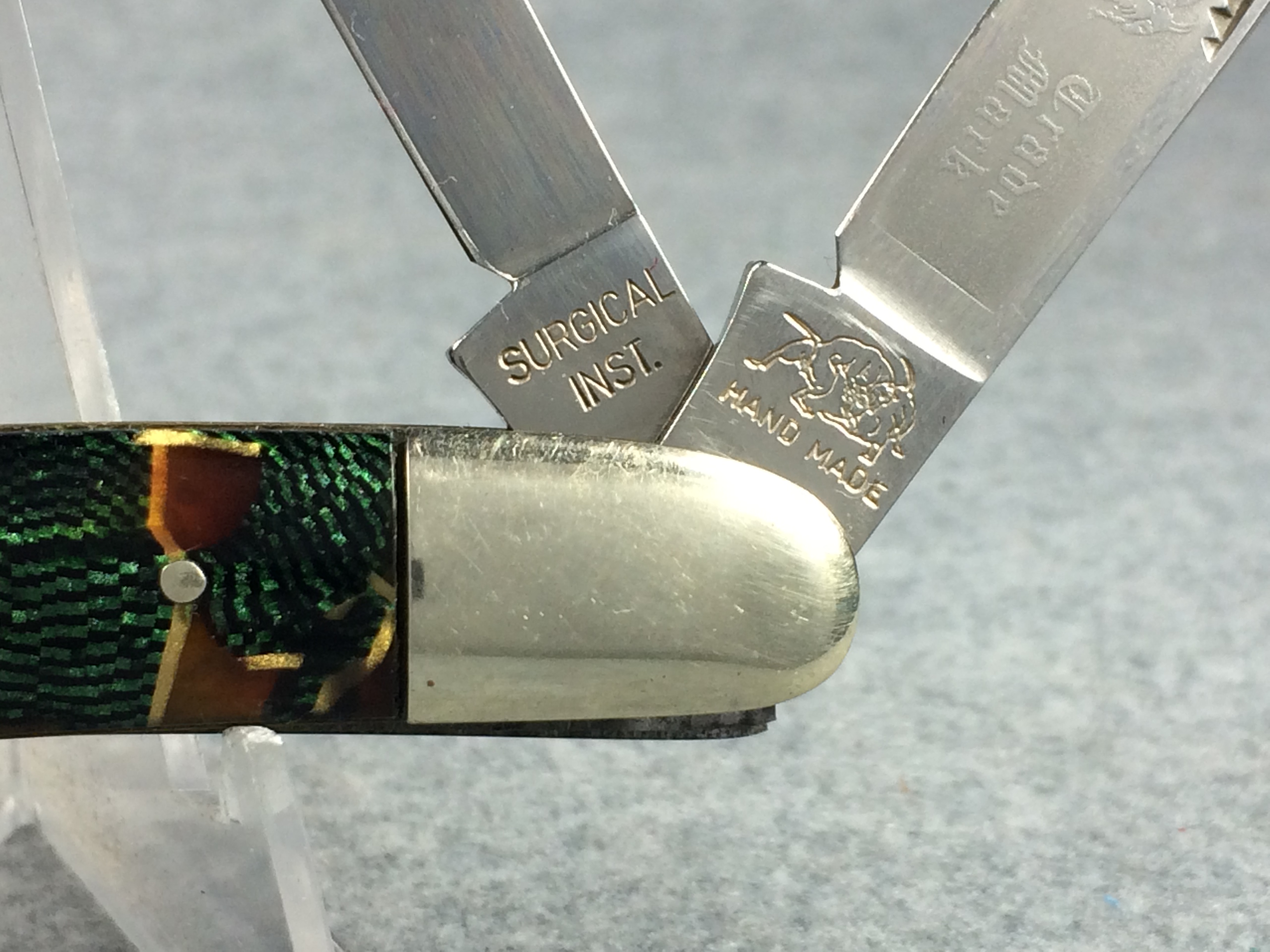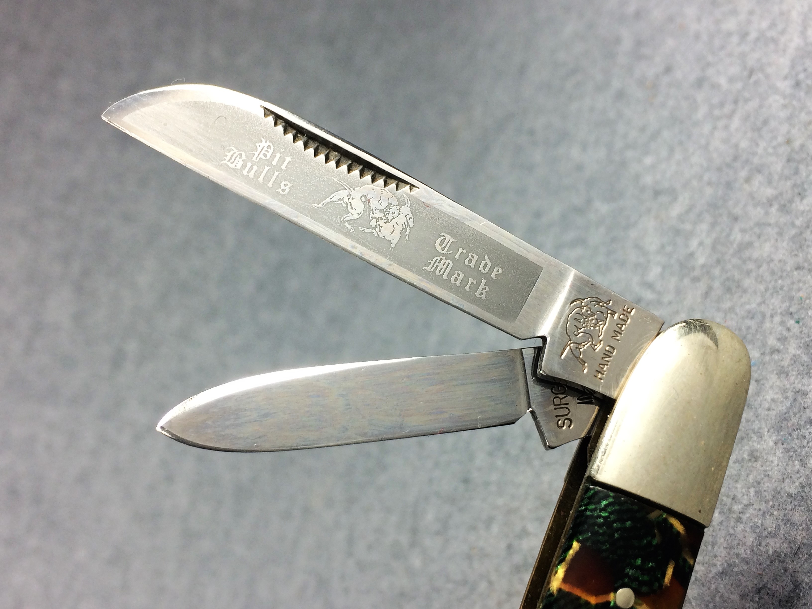 March 15, 2026 - 4 inches closed. 6-1/8 inches open. Made in Germany. Bulldog logo over "HAND MADE", "BULLDOG BRAND HAMMER FORGED SURGICAL INST. SOLINGEN GERMANY", and "SURGICAL INST." tang stamps. Plain bar shield. Blade etched "Pit Bulls Trade Mark" with logo. Tortoise shell celluloid handles. Nickel Silver bolsters. Brass liner.