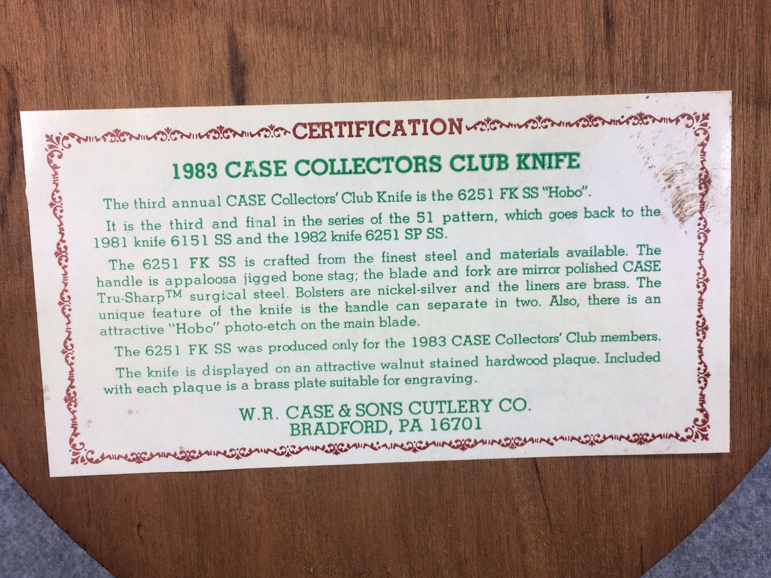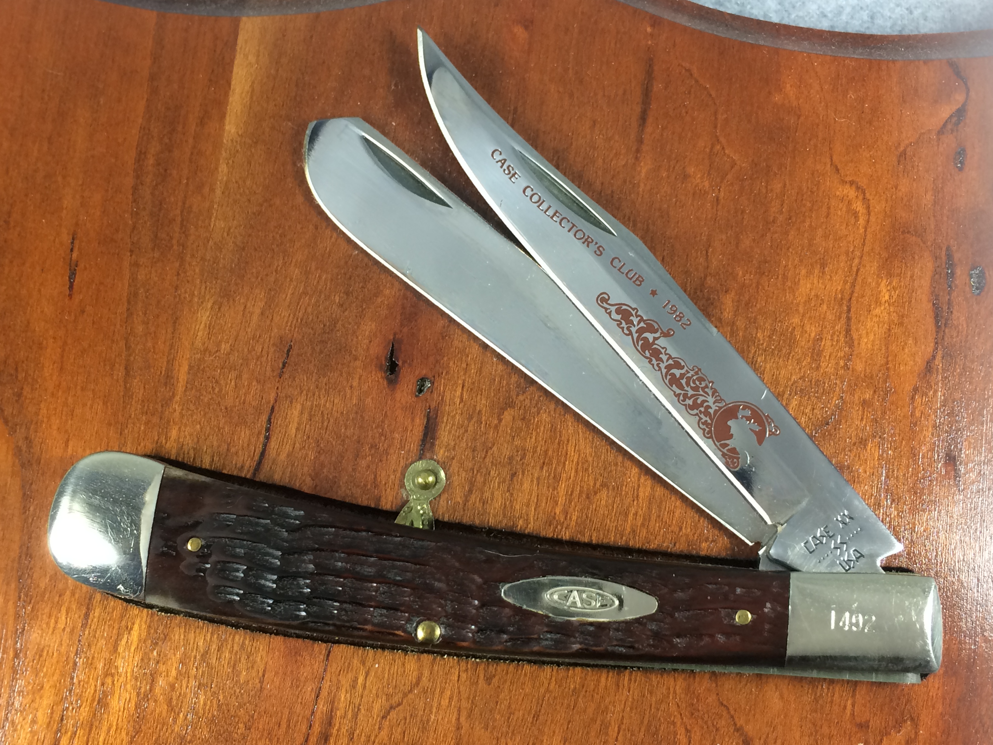 October 26, 2025 - Limited Edition. 5-1/4 inches closed and approx. 9-1/2 inches open. Made in USA. "CASE XX ****SS**** USA" (8 dot with lightning bolt S) and "6151SP SS" tang stamps. Double oval open-C CASE shield. Stainless steel blades. Master blade etched "CASE COLLECTORS CLUB 1982". Brown jigged bone handles. Nickel silver bolsters. Front right bolster etched with serial number. Brass liner.