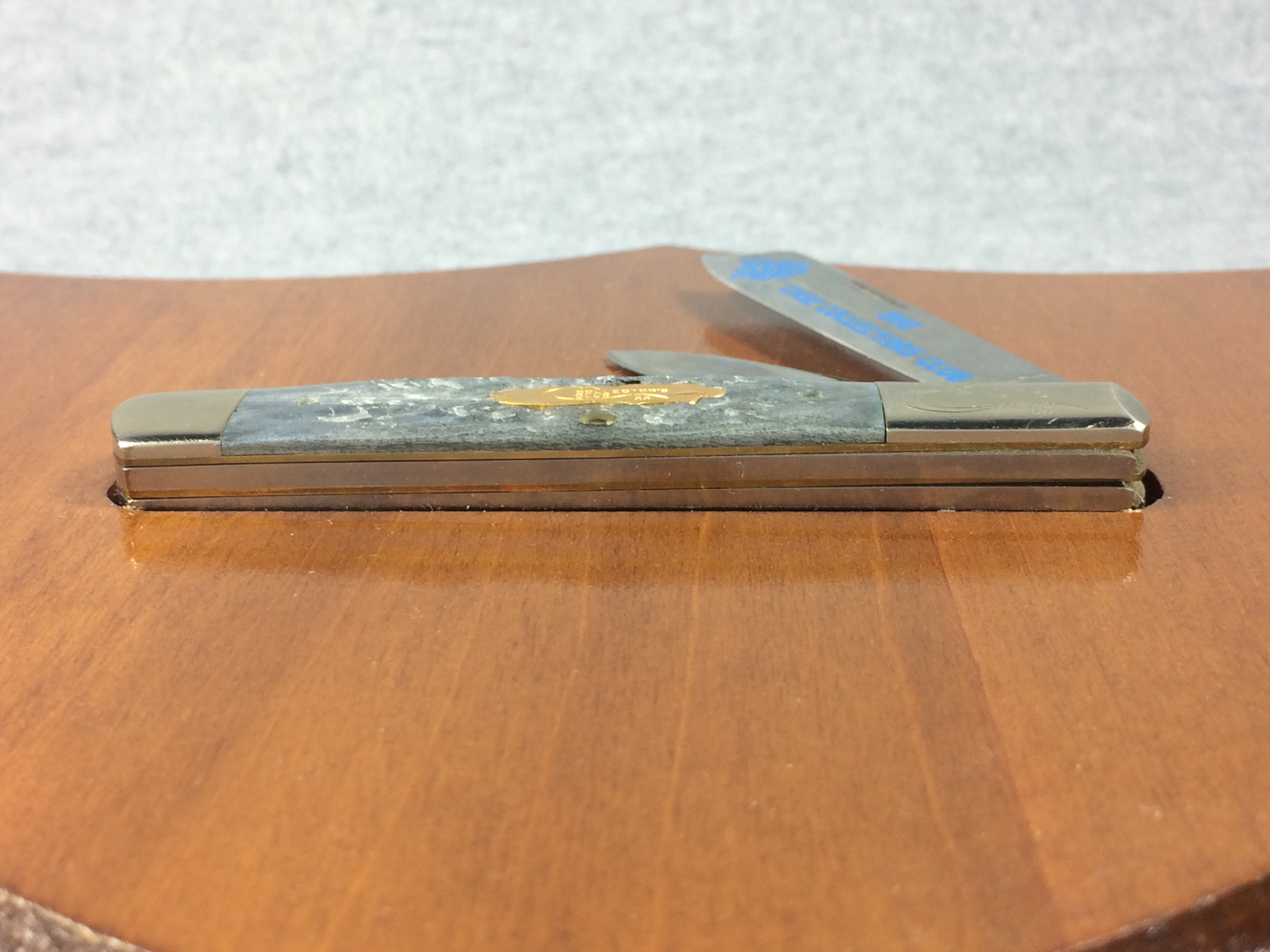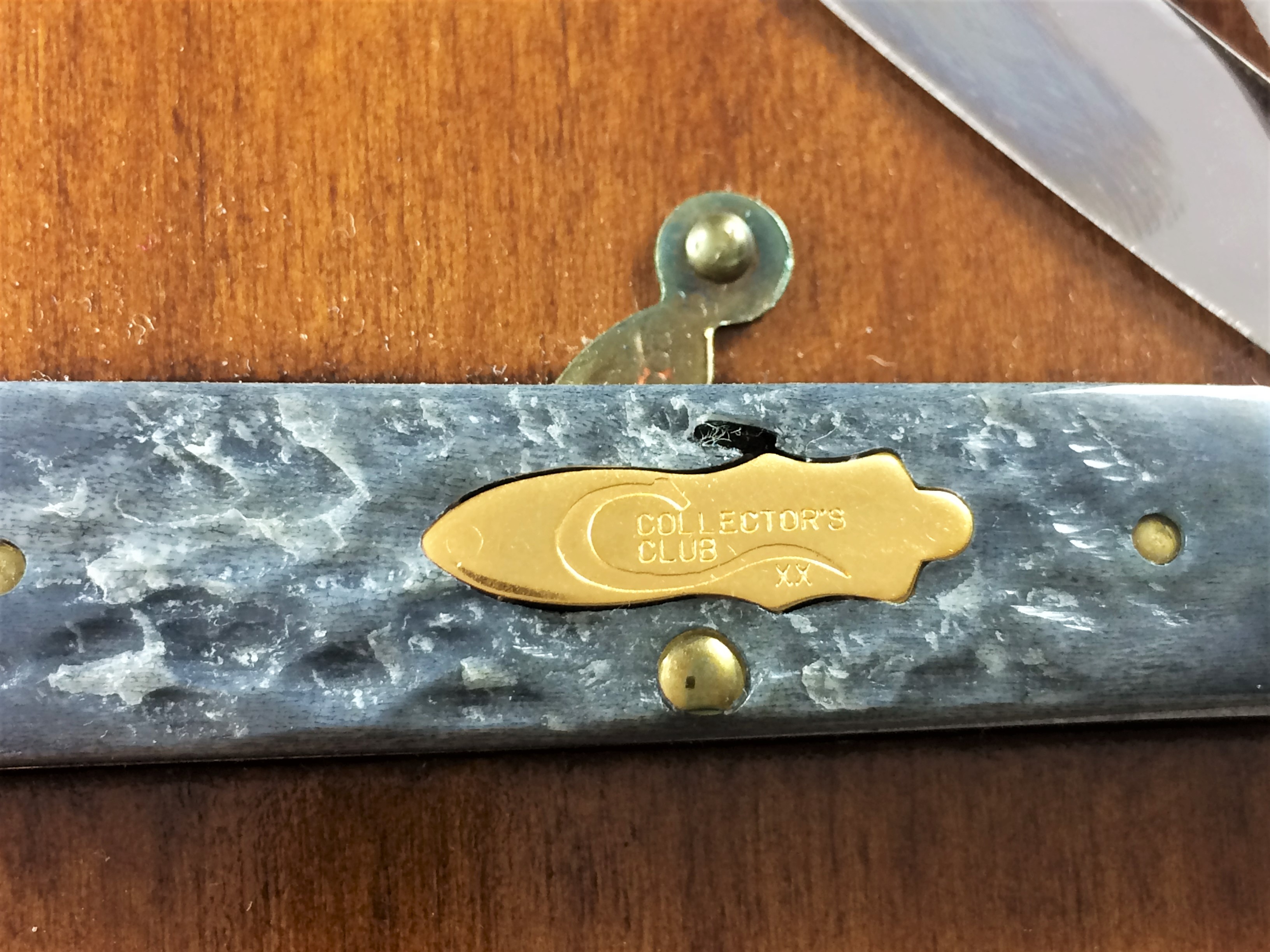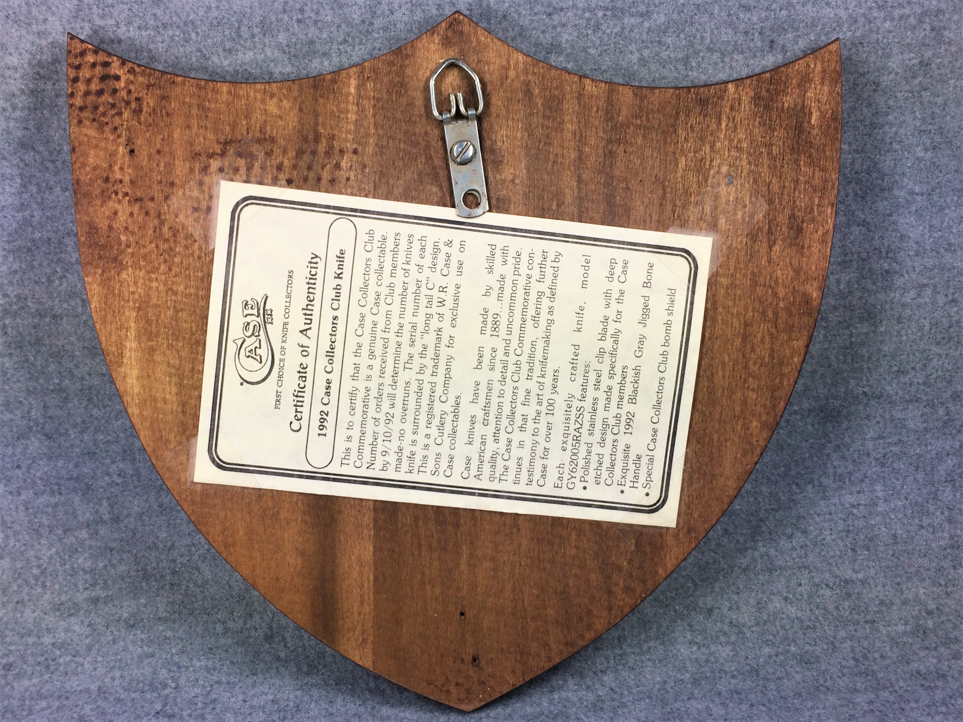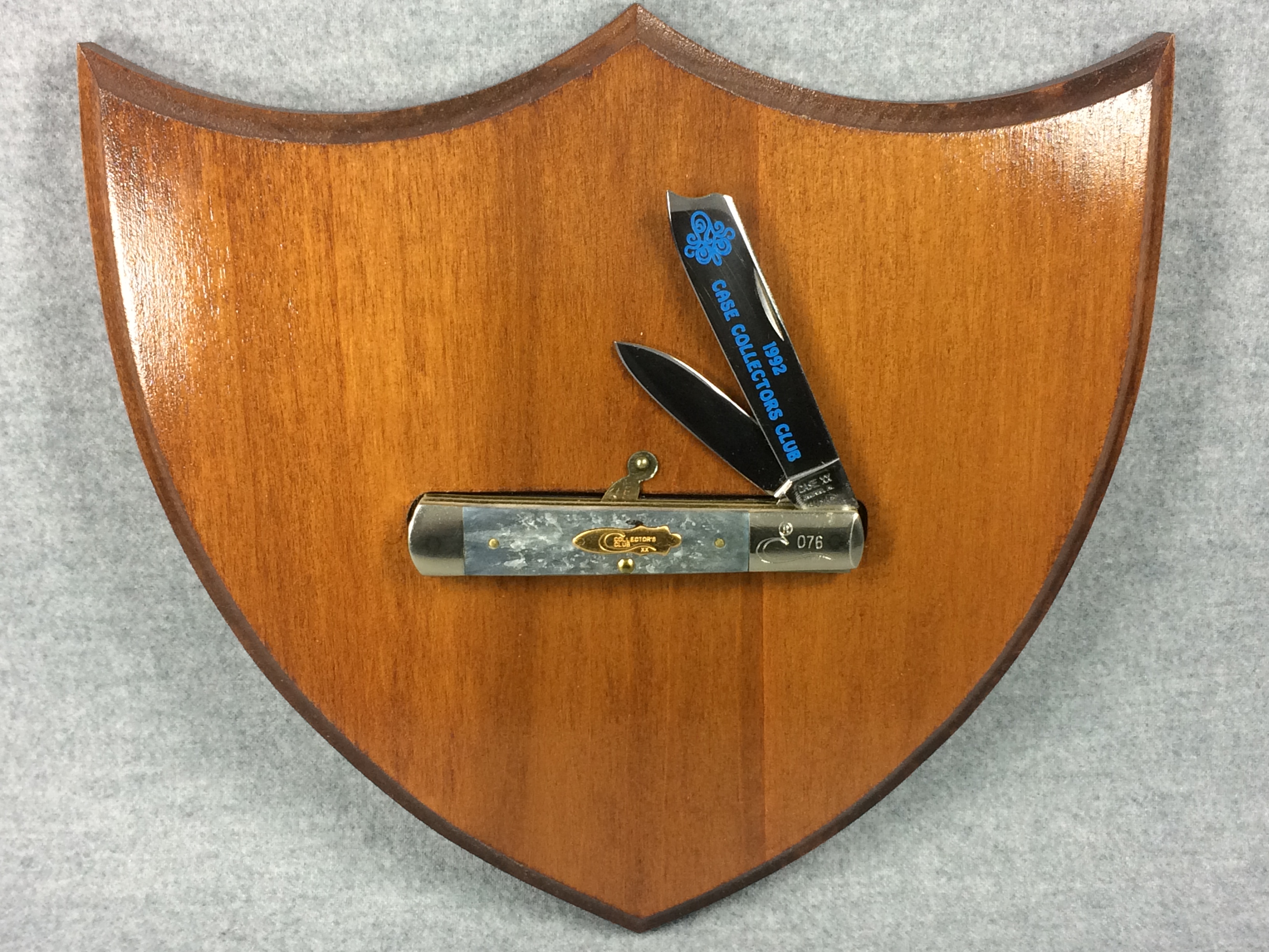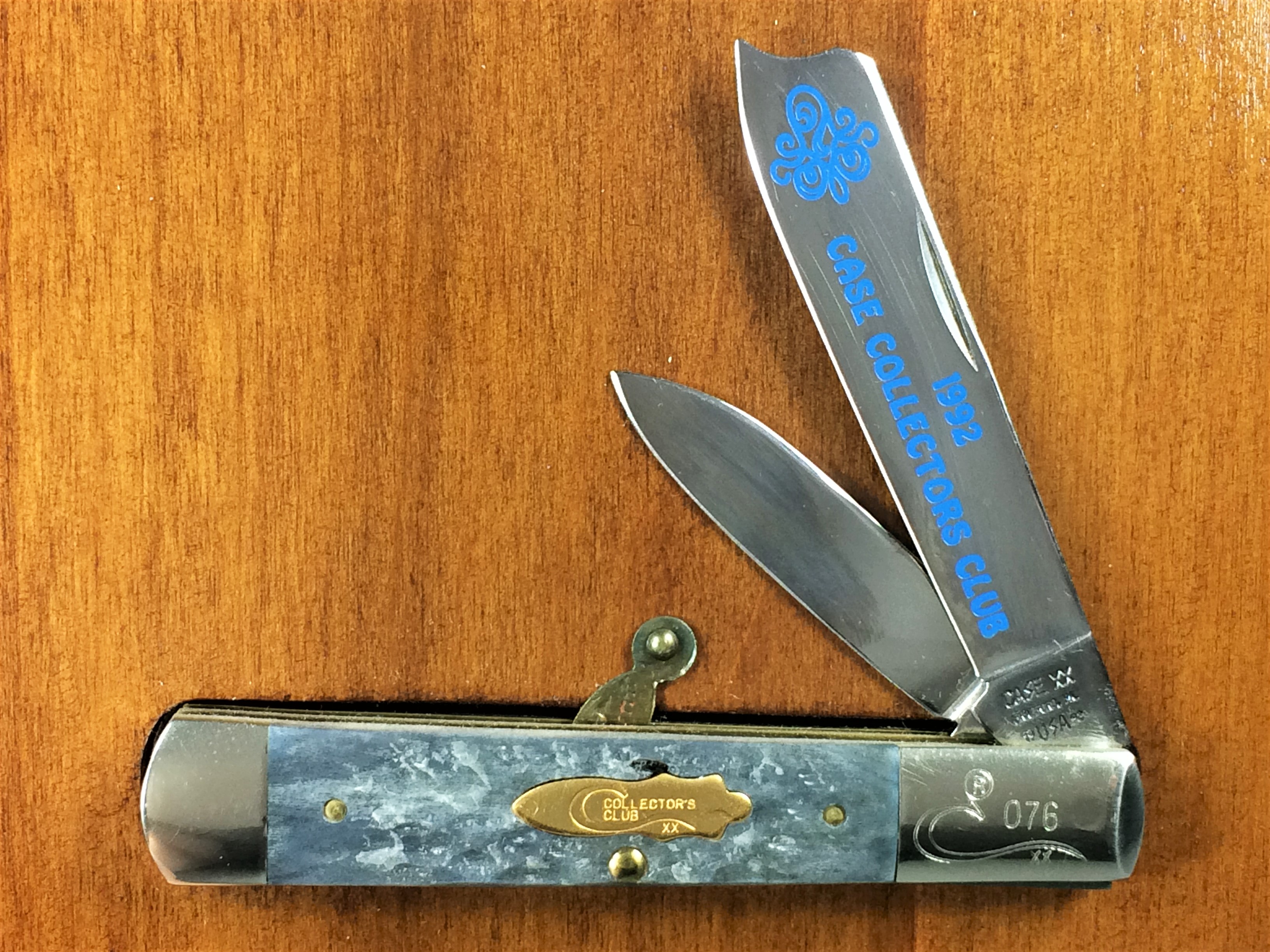 January 14, 2026 - 3-3/4 inches closed. 6-3/4 inches open. Made in USA. "CASE XX BRADFORD, PA 19 USA 92" and "GY62005 RAZSS" tang stamps. Special CCC bomb shield. Stainless Steel blades; master blade etched "1992 CASE COLLECTORS CLUB" in blue. Gray jigged bone handle. Nickel Silver bolsters; front right bolster etched with long-C serial #. Brass liner.