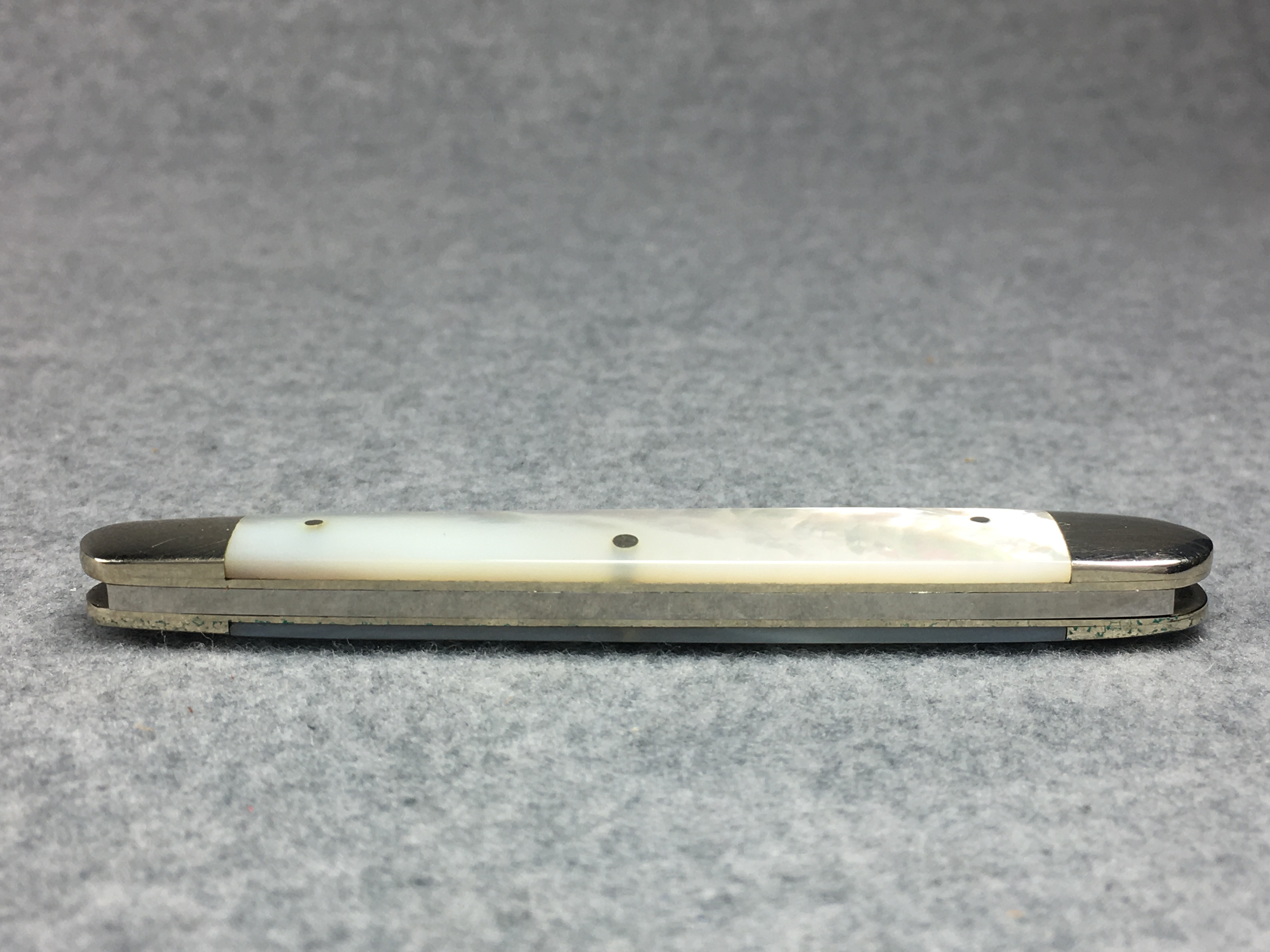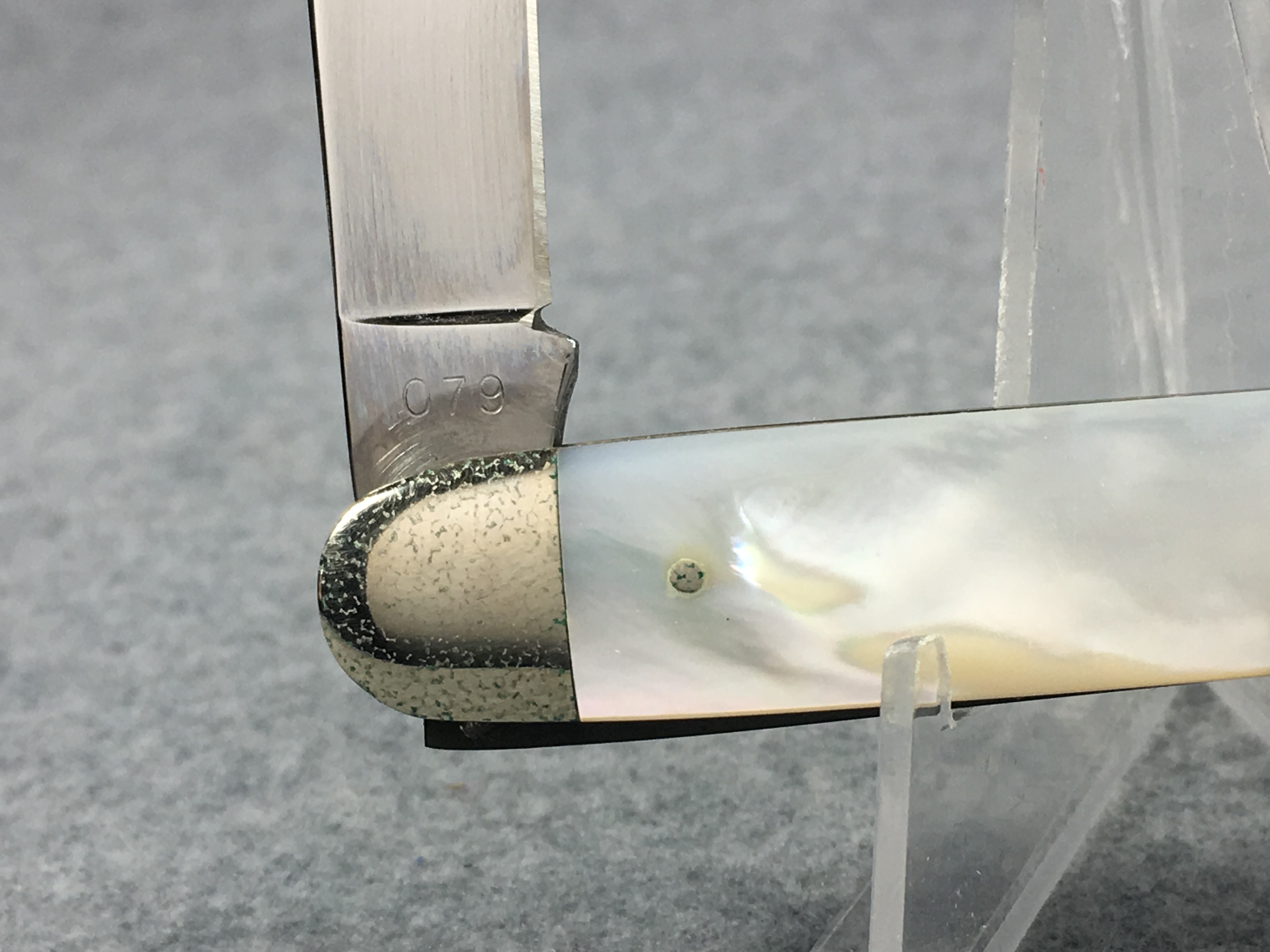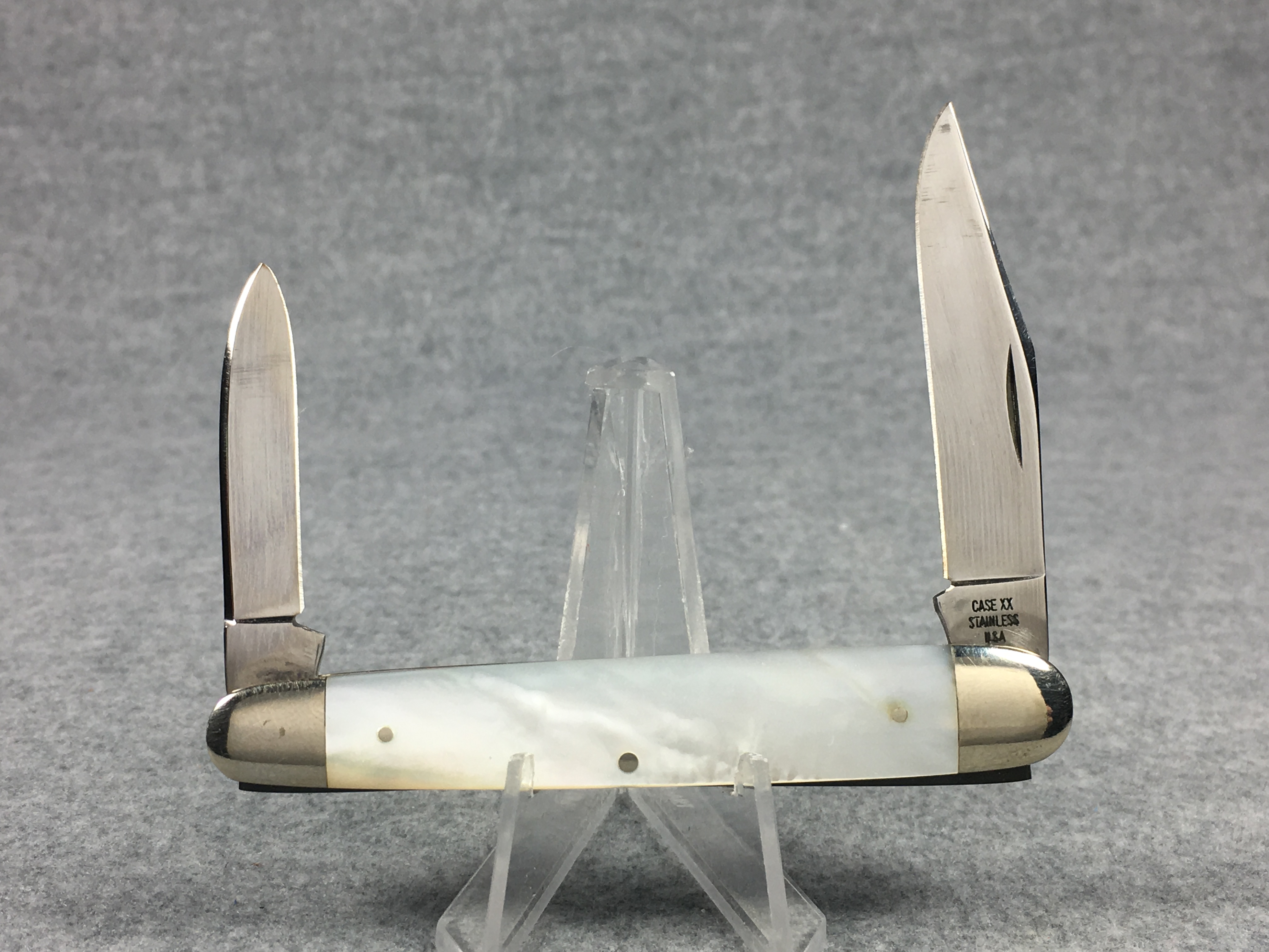 January 14, 2026 - 3-3/8 inches closed. 5-3/8 inches open. Made in USA. "CASE XX STAINLESS USA" and "079" tang stamps. Stainless Steel blades. Mother of Pearl handle. Nickel Silver bolsters. Nickel Silver liner.