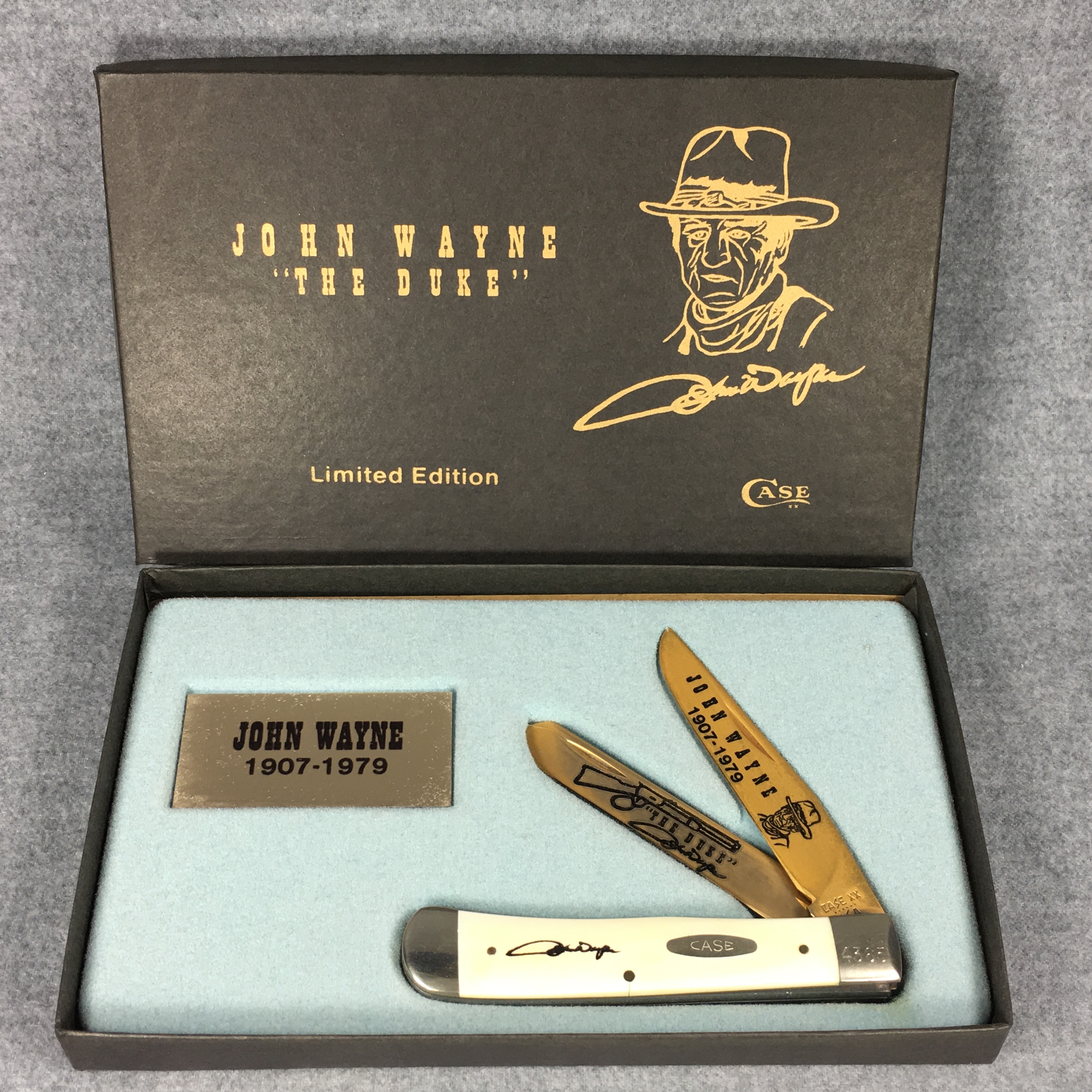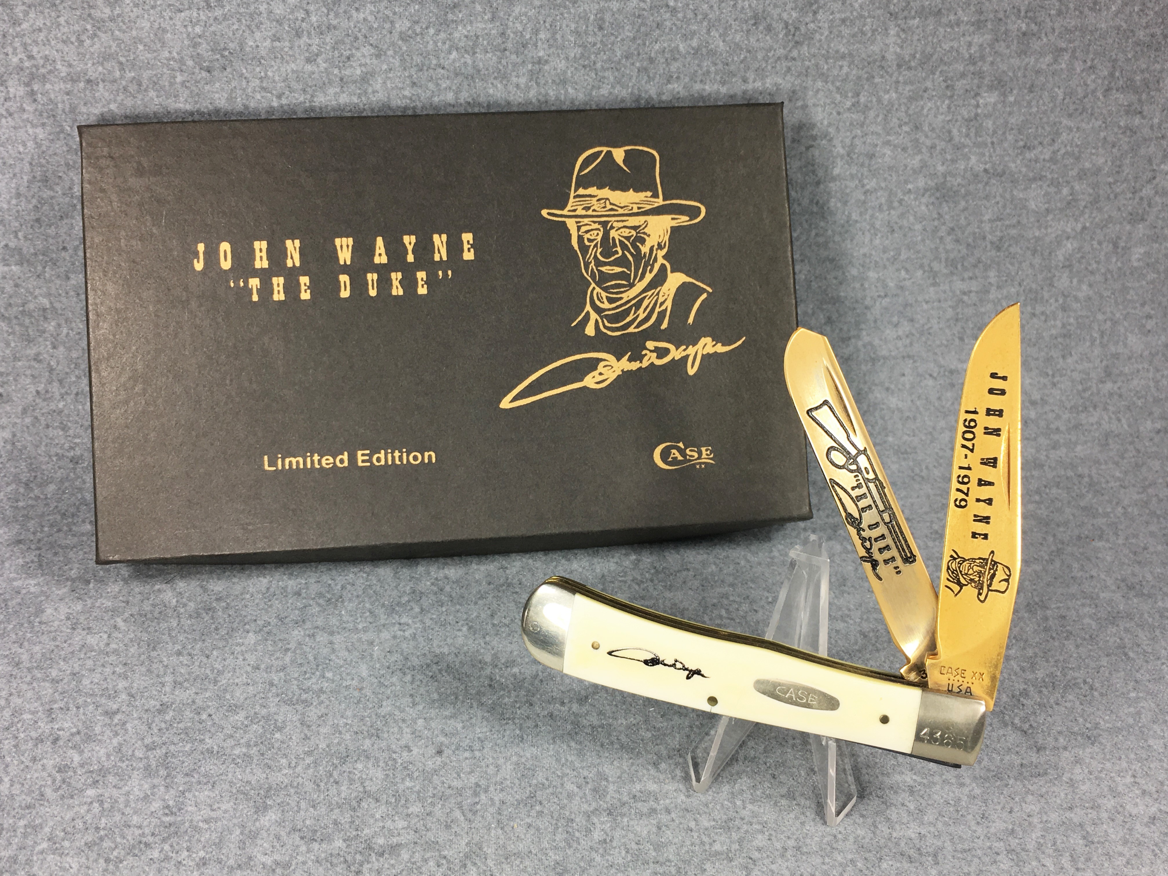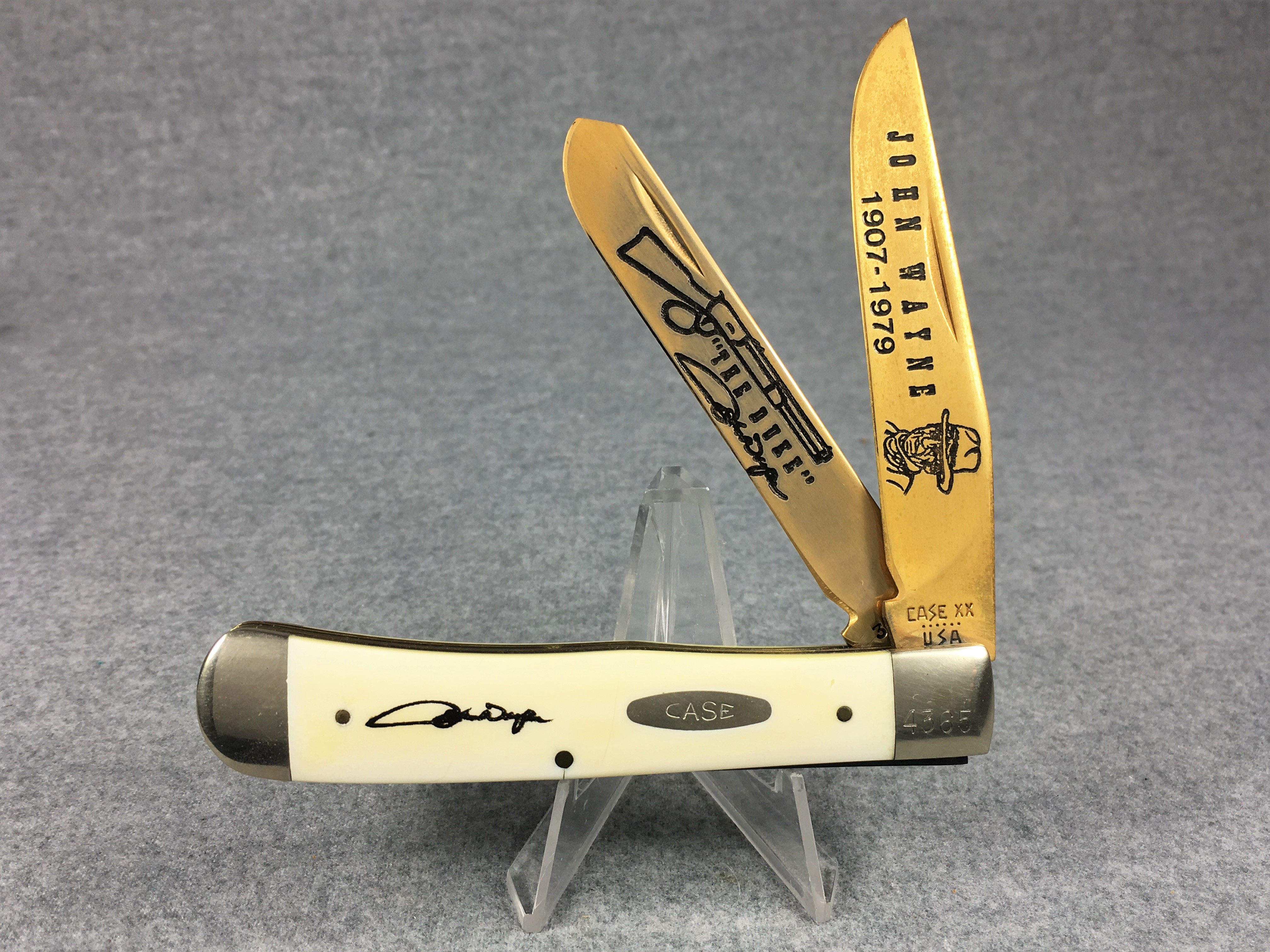 December 24, 2025 - Limited Edition. 4-1/8 inches closed. 7-3/8 inches open. Made in USA. "Case XX ****** USA " (6 dot with lightning bolt S) and "3254" tang stamps. Single Oval 'Open C' CASE shield. Gold-colored chrome vanadium blades. Master blade etched "JOHN WAYNE 1907-1979" and an image of Wayne. Secondary blade etched "THE DUKE", Wayne's signature, and an image of a rifle. Yellow Composition handle etched with Wayne's signature. Nickel Silver bolsters. Front bolster etched with serial number "4365". Brass liner.