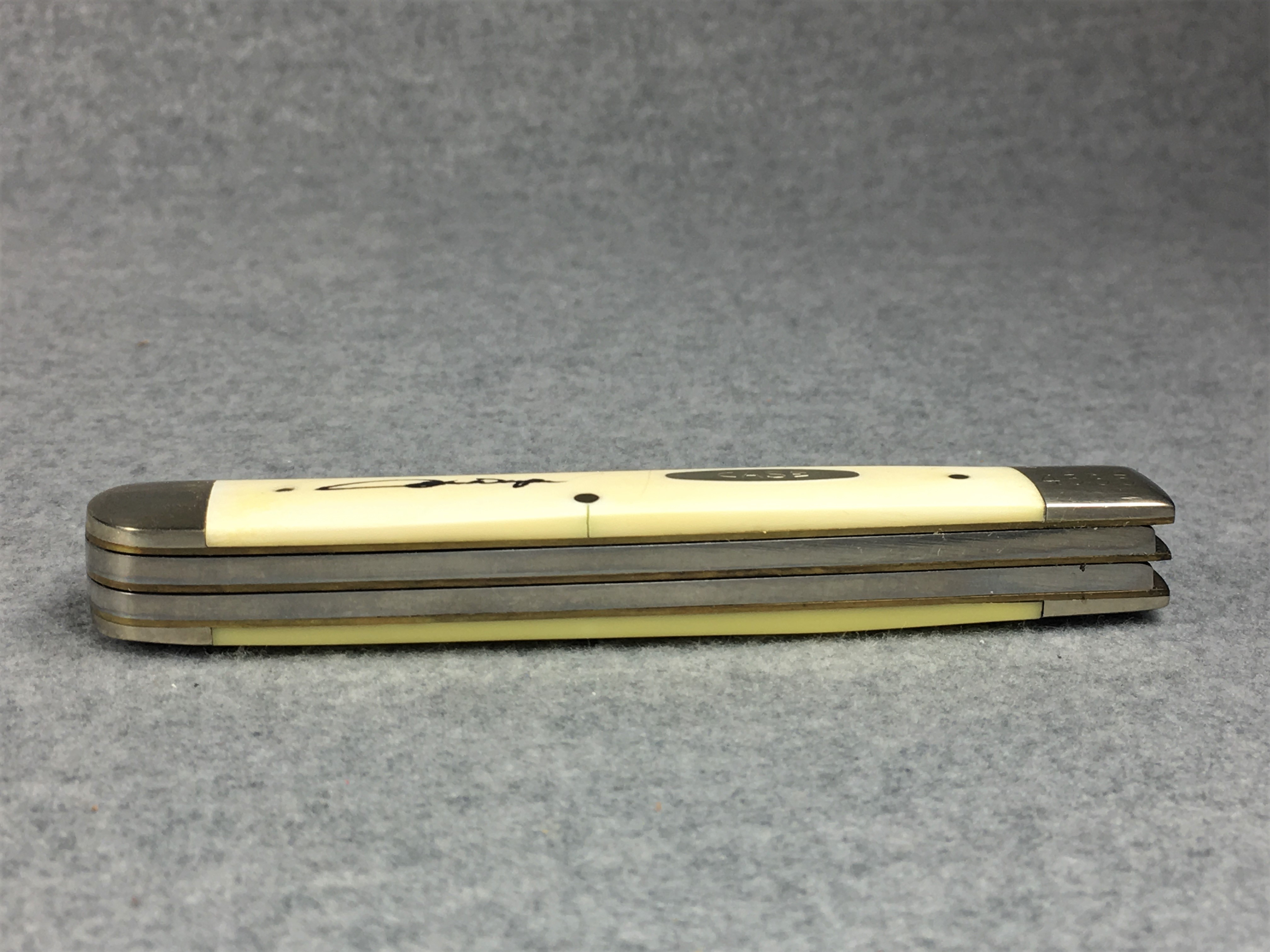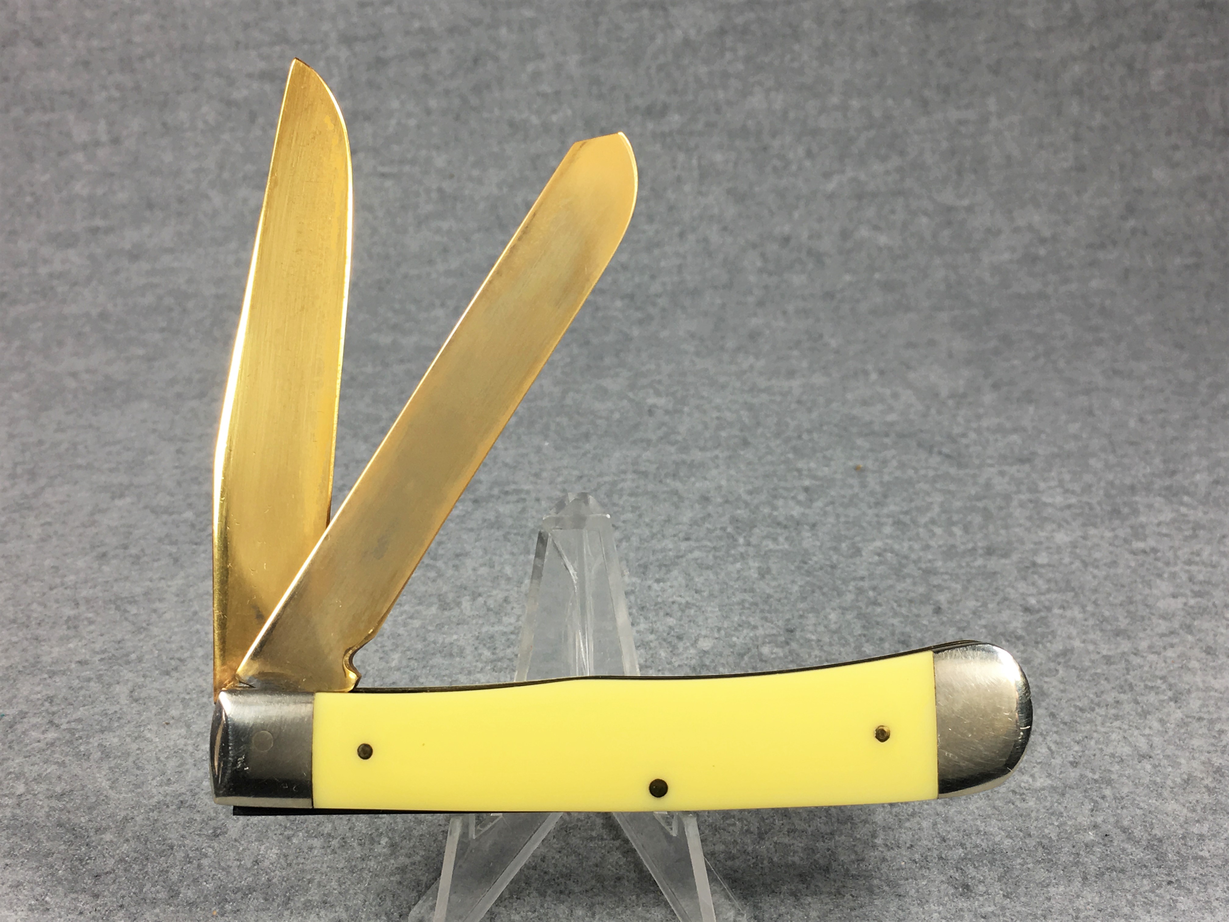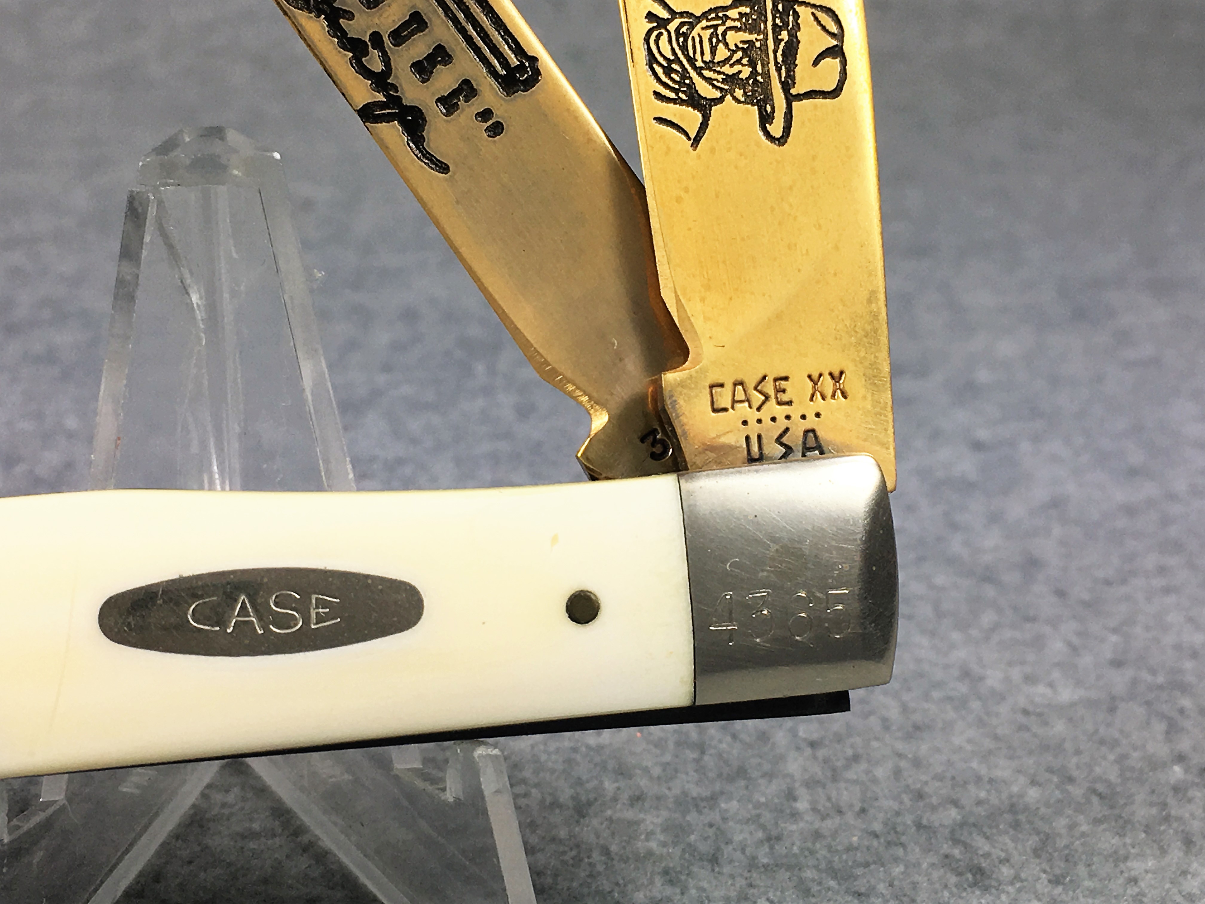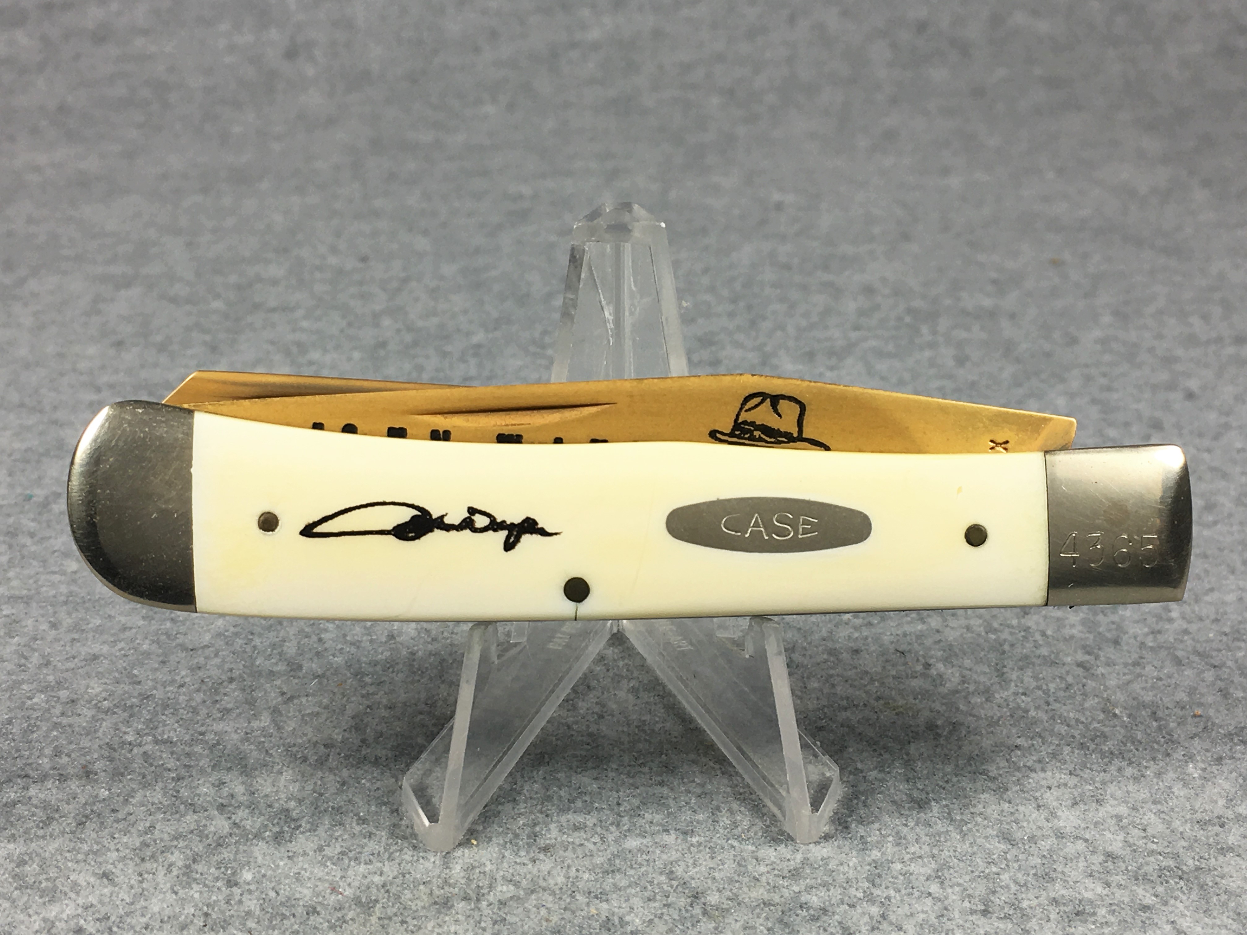 December 24, 2025 - Limited Edition. 4-1/8 inches closed. 7-3/8 inches open. Made in USA. "Case XX ****** USA " (6 dot with lightning bolt S) and "3254" tang stamps. Single Oval 'Open C' CASE shield. Gold-colored chrome vanadium blades. Master blade etched "JOHN WAYNE 1907-1979" and an image of Wayne. Secondary blade etched "THE DUKE", Wayne's signature, and an image of a rifle. Yellow Composition handle etched with Wayne's signature. Nickel Silver bolsters. Front bolster etched with serial number "4365". Brass liner.