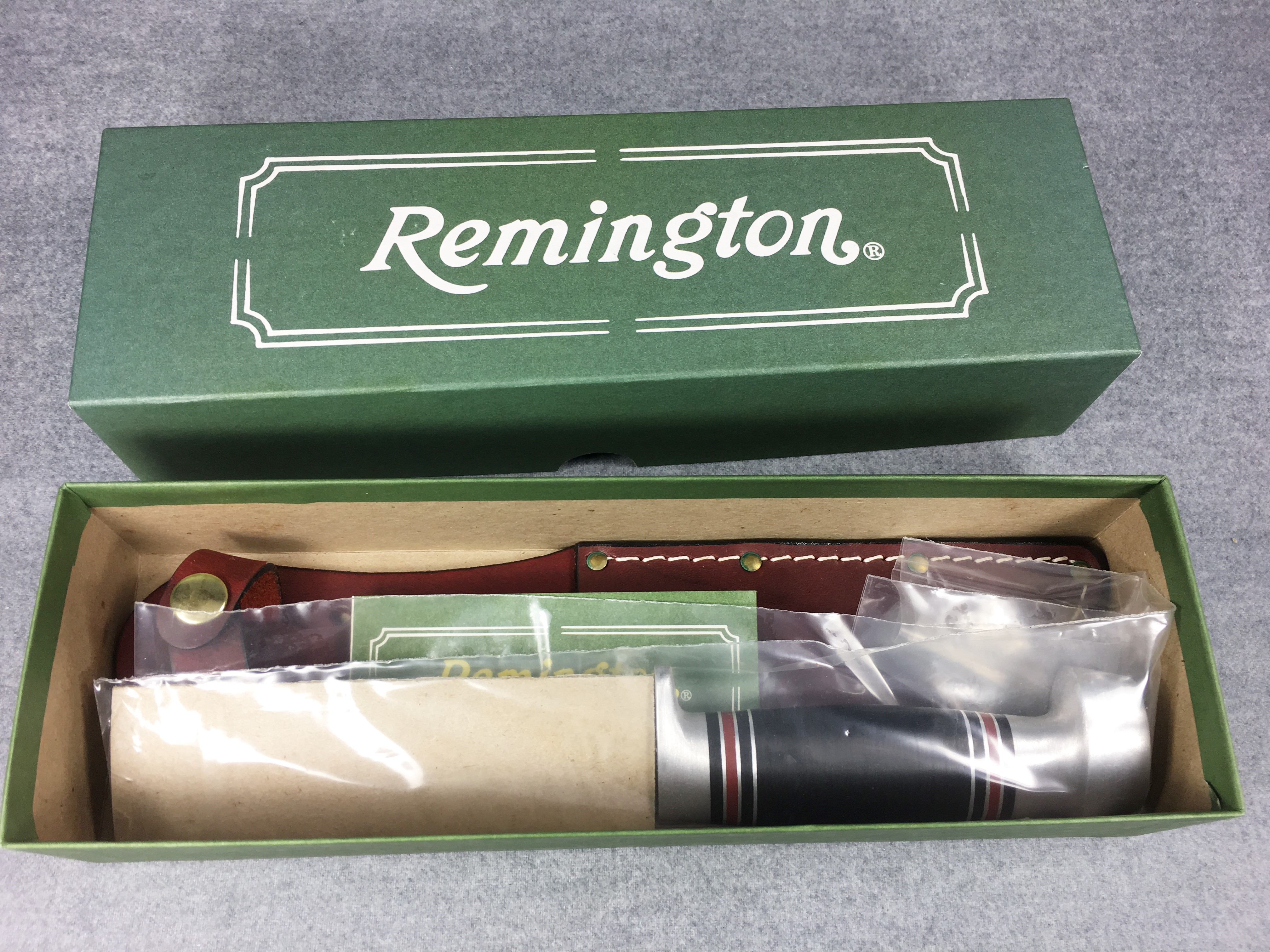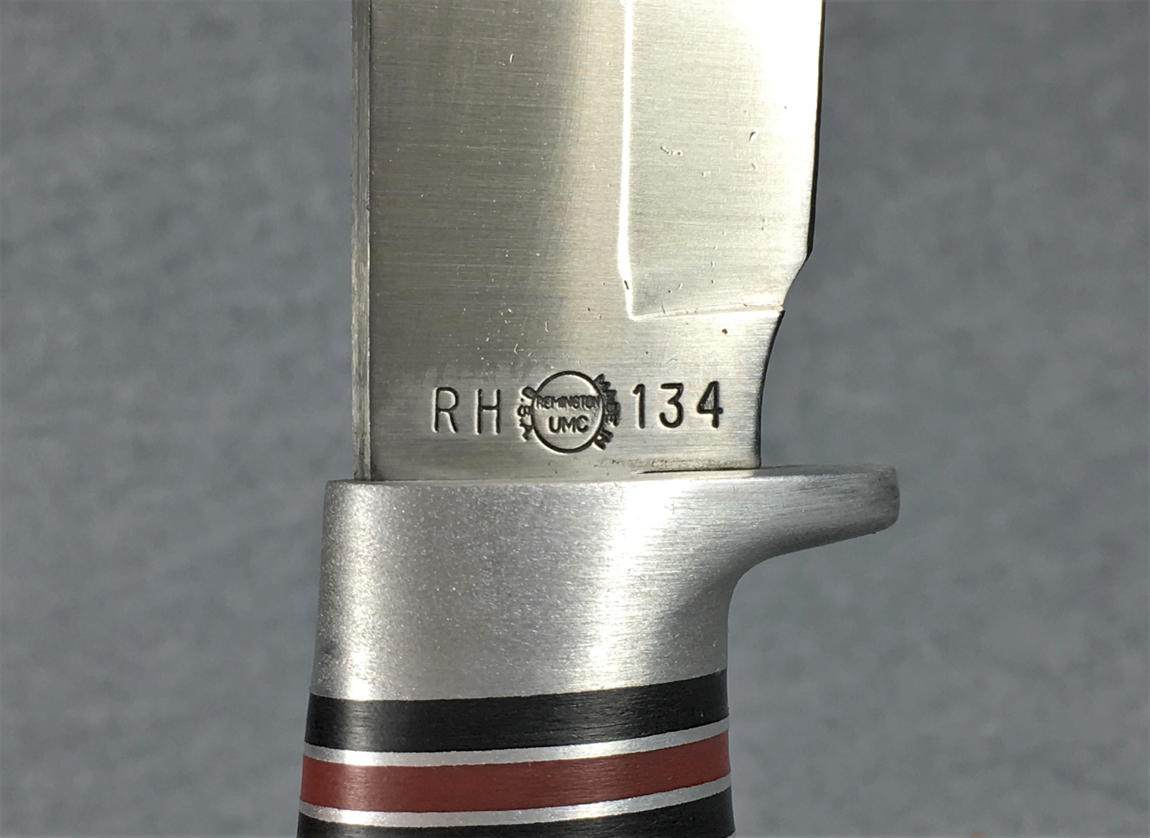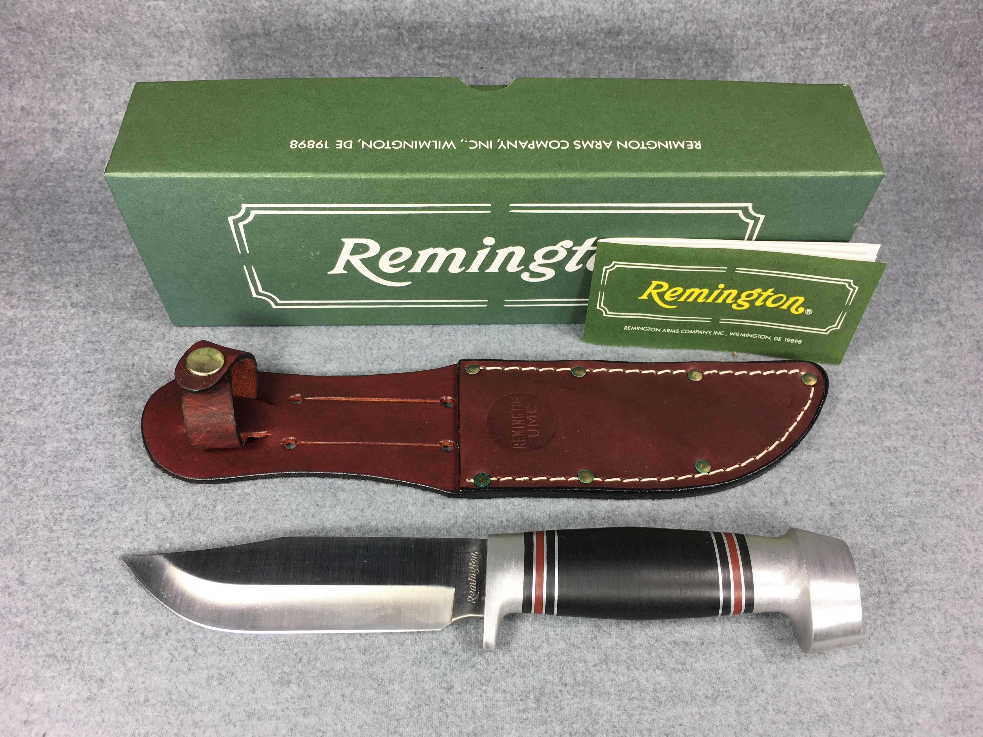 October 26, 2025 - Fixed Blade Knife. 9-3/8 inches long. Made in USA. "RH 134" with circle logo "REMINGTON UMC MADE IN U.S.A." and "Remington" tang stamps. Stainless Steel blade. Fiber and aluminum handle. Aluminum guard and buttcap. With original leather sheath, box, and paperwork.