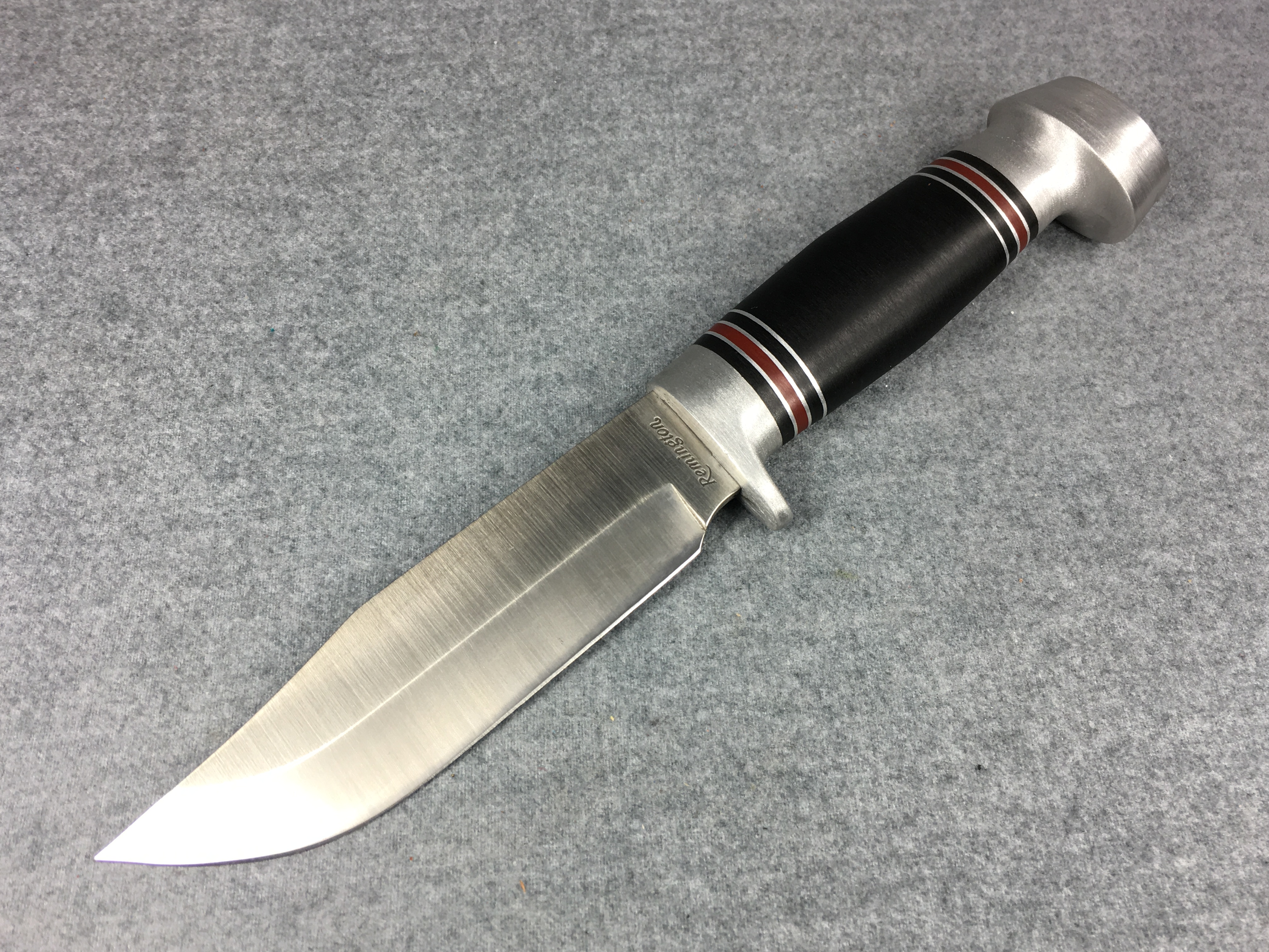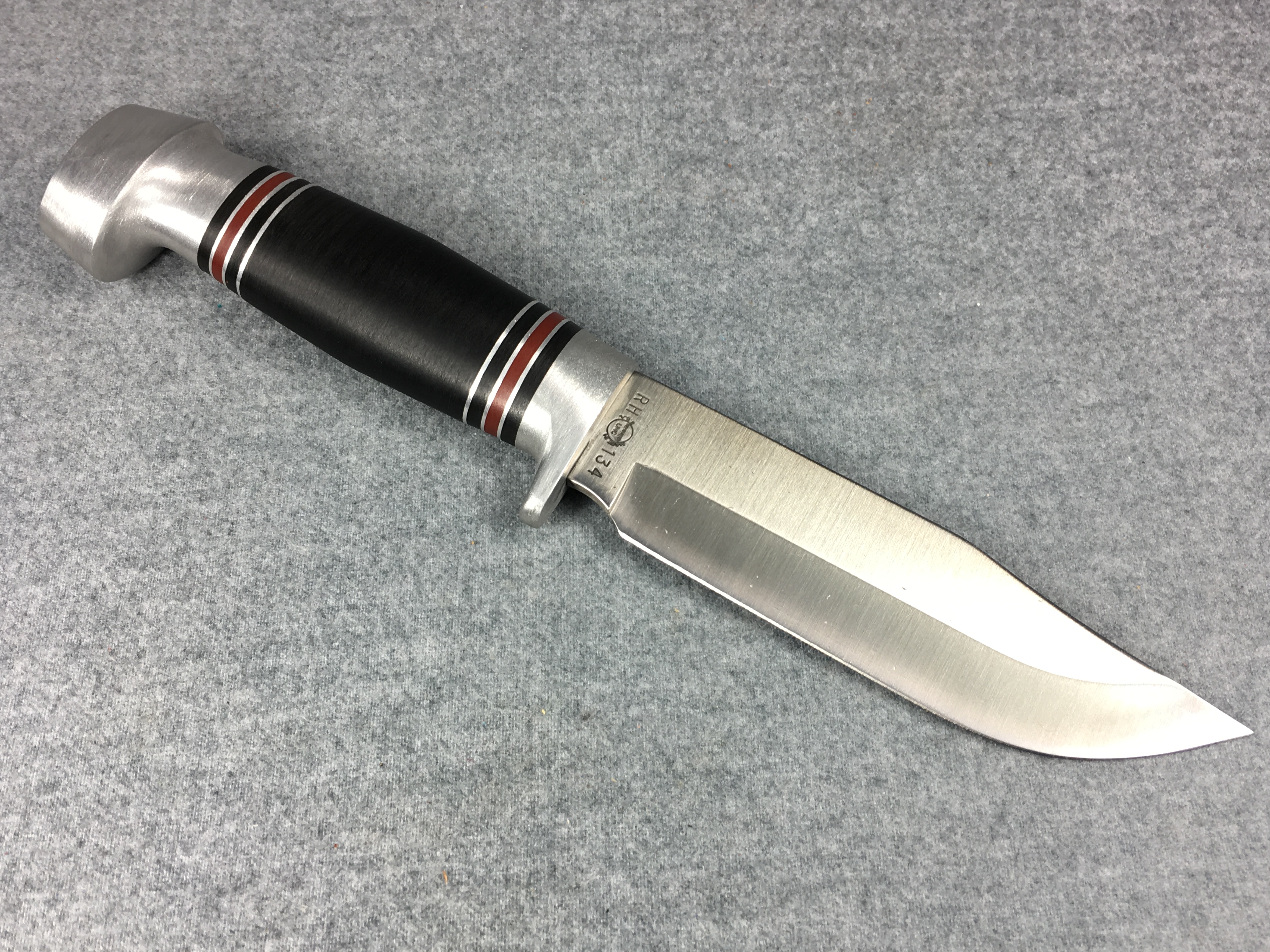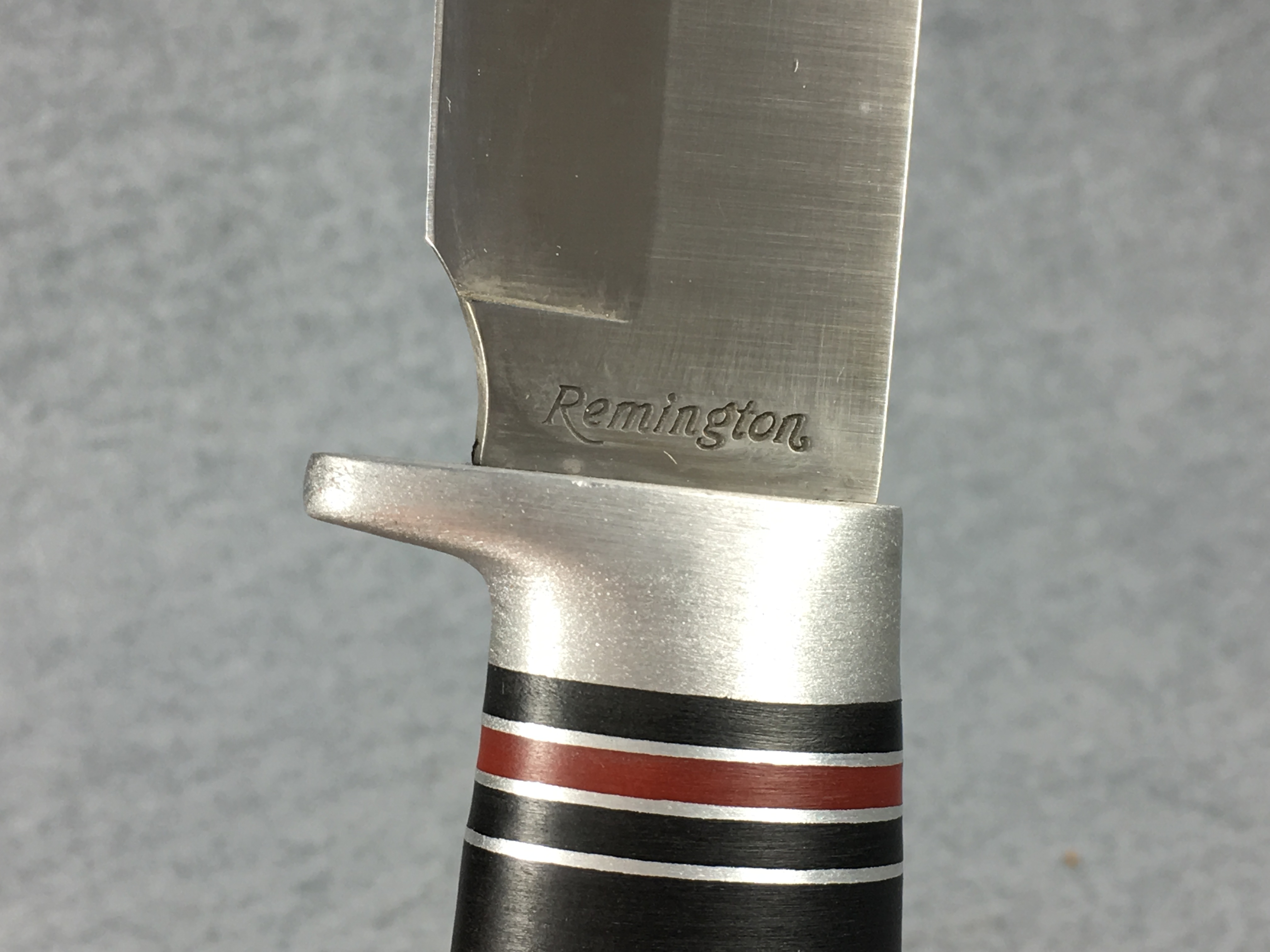 October 26, 2025 - Fixed Blade Knife. 9-3/8 inches long. Made in USA. "RH 134" with circle logo "REMINGTON UMC MADE IN U.S.A." and "Remington" tang stamps. Stainless Steel blade. Fiber and aluminum handle. Aluminum guard and buttcap. With original leather sheath, box, and paperwork.