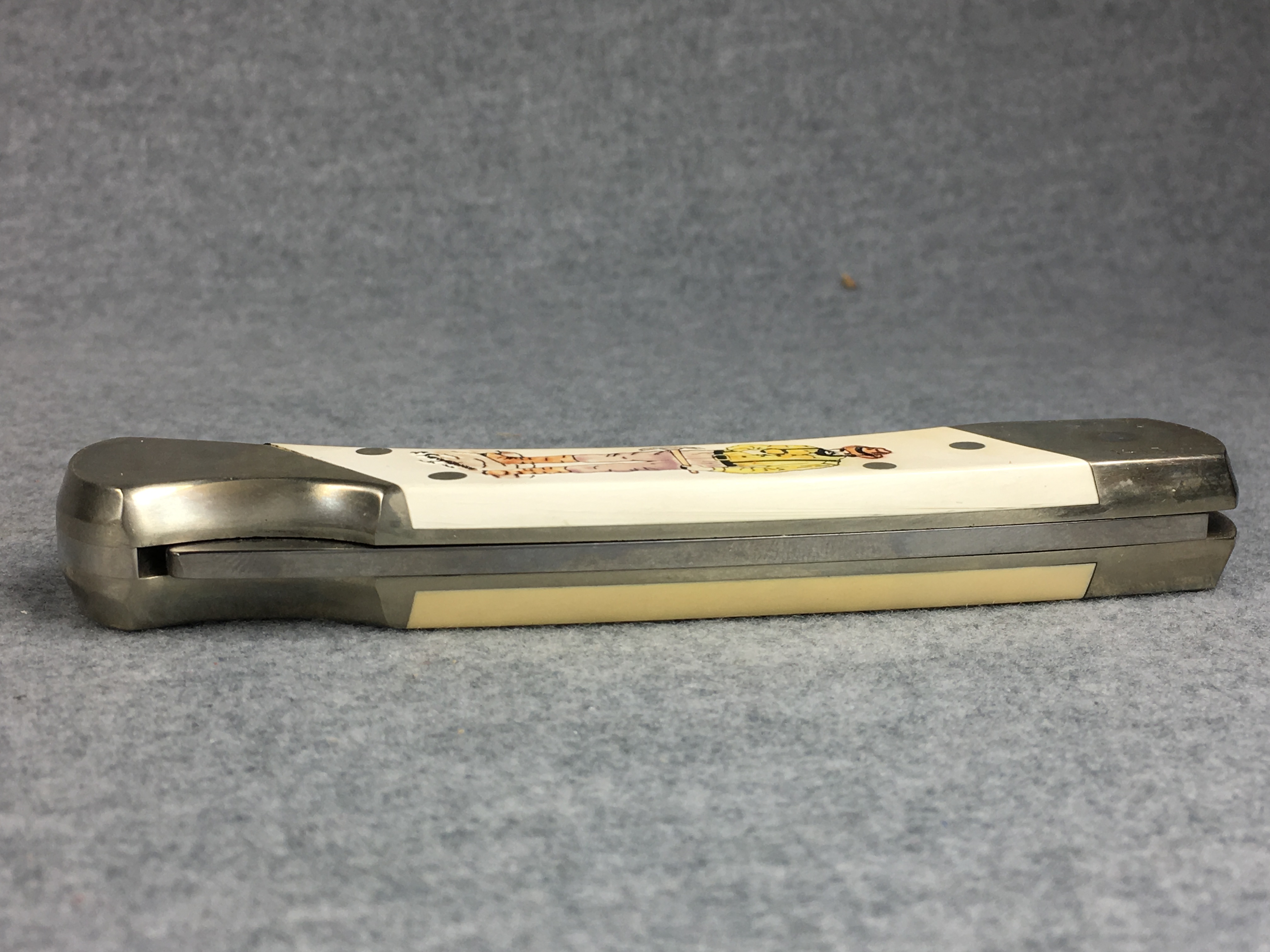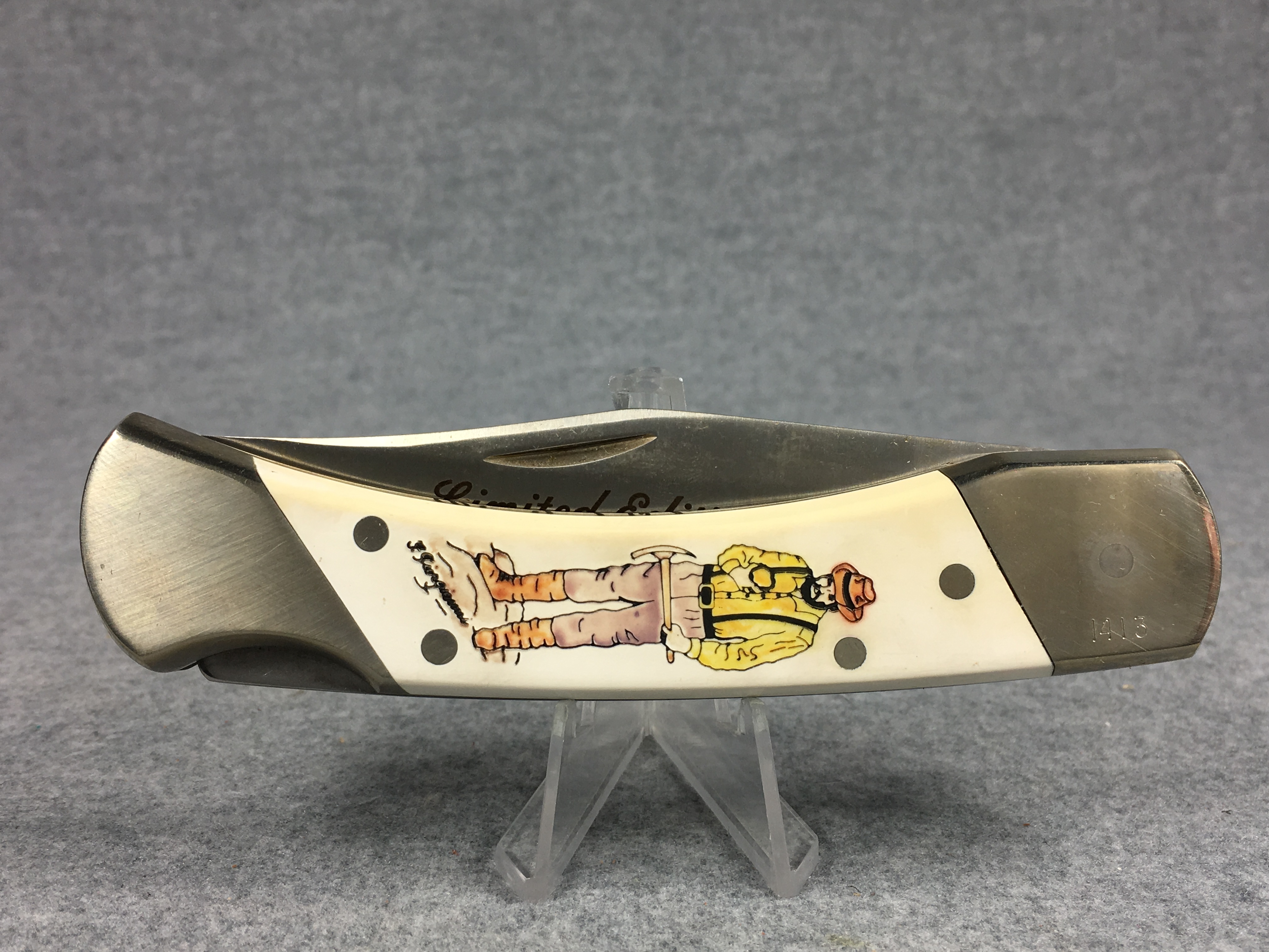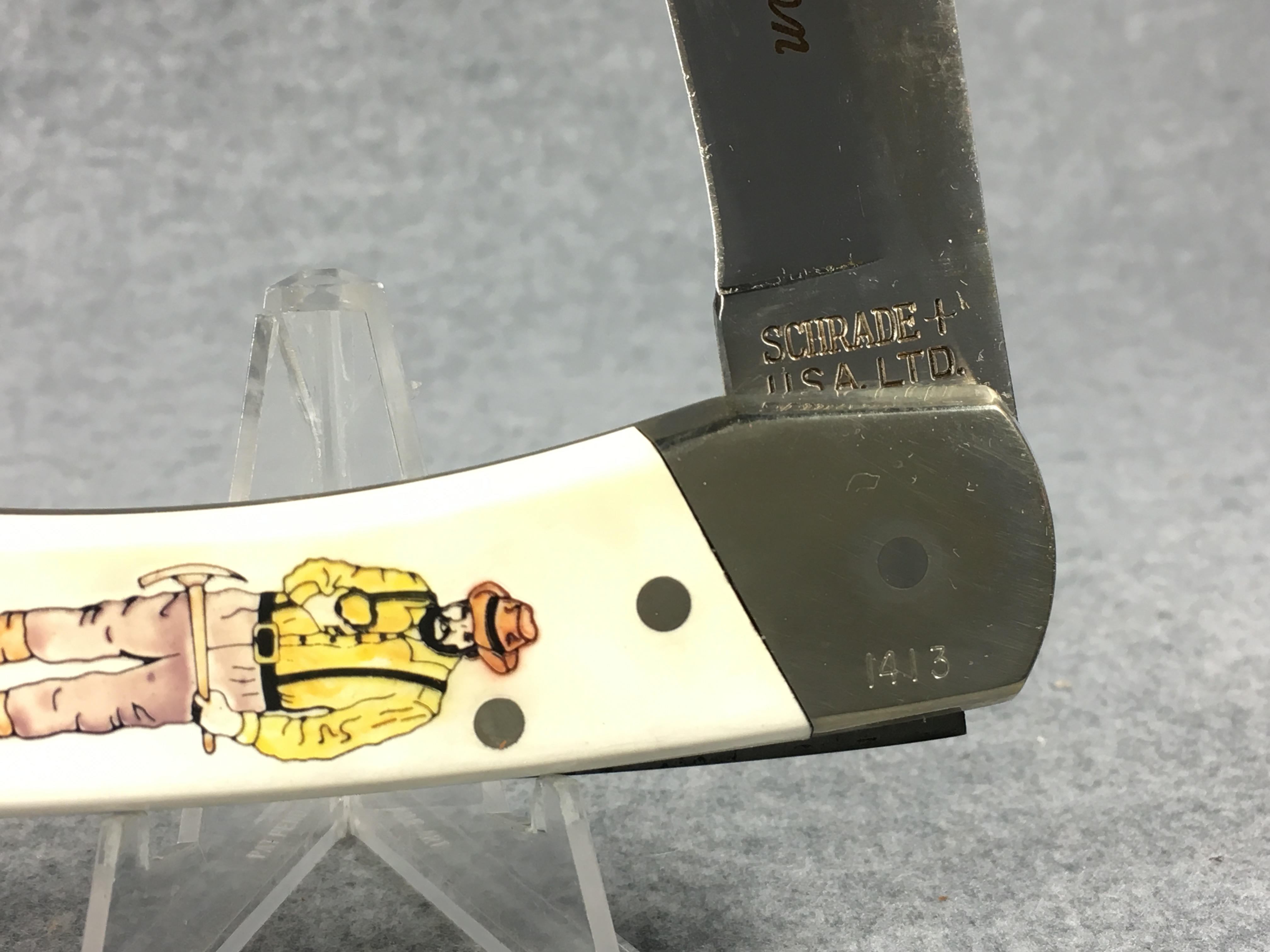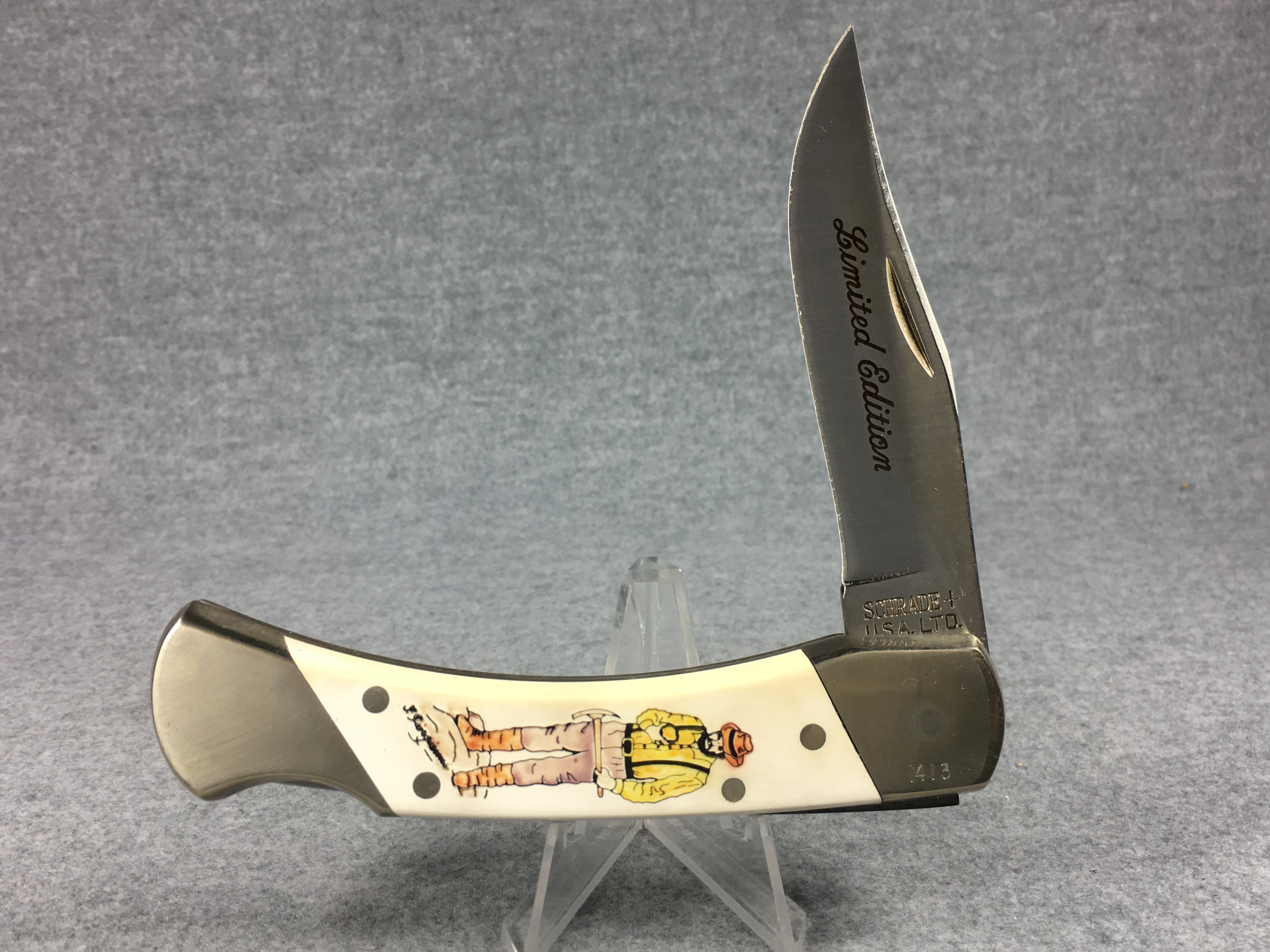 December 04, 2025 - 5-1/4 inches closed. 9-3/8 inches open. Made in USA. "SCHRADE+ U.S.A. LTD. " tang stamp. Stainless steel blade etched "Limited Edition". Handle scrimshawed with color images of men digging for gold. Nickel silver bolsters. Front right bolster etched with serial #1413. With original box, paperwork, and leather sheath.