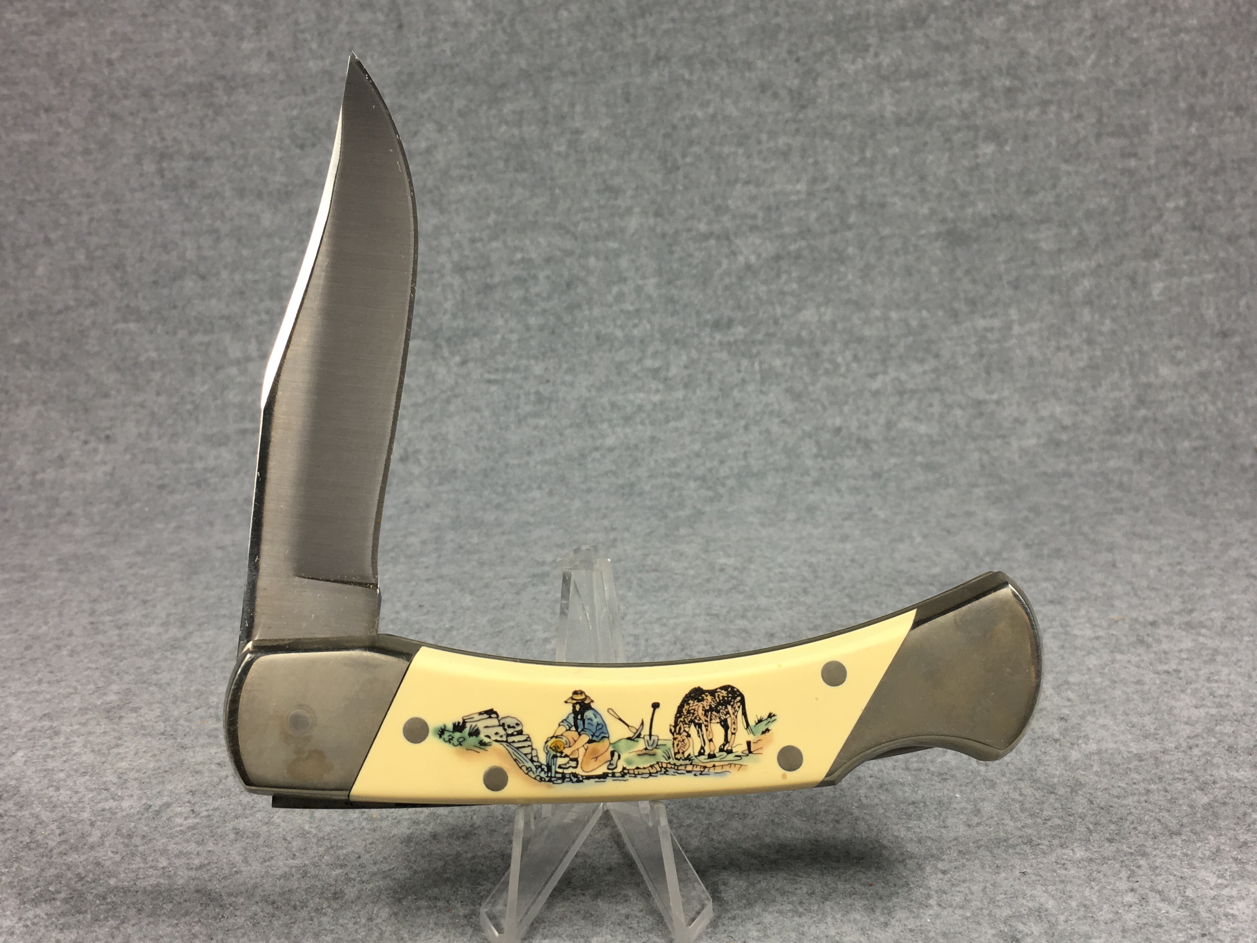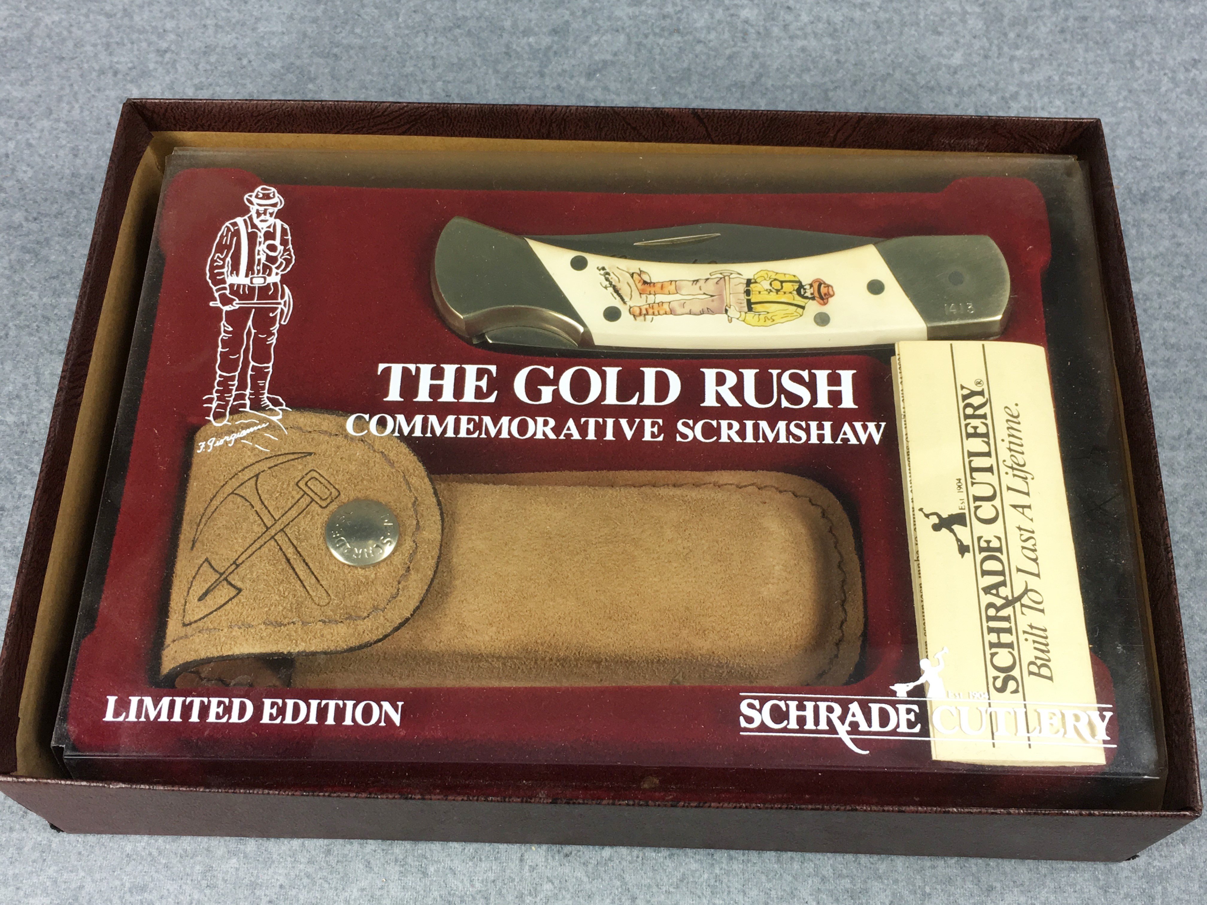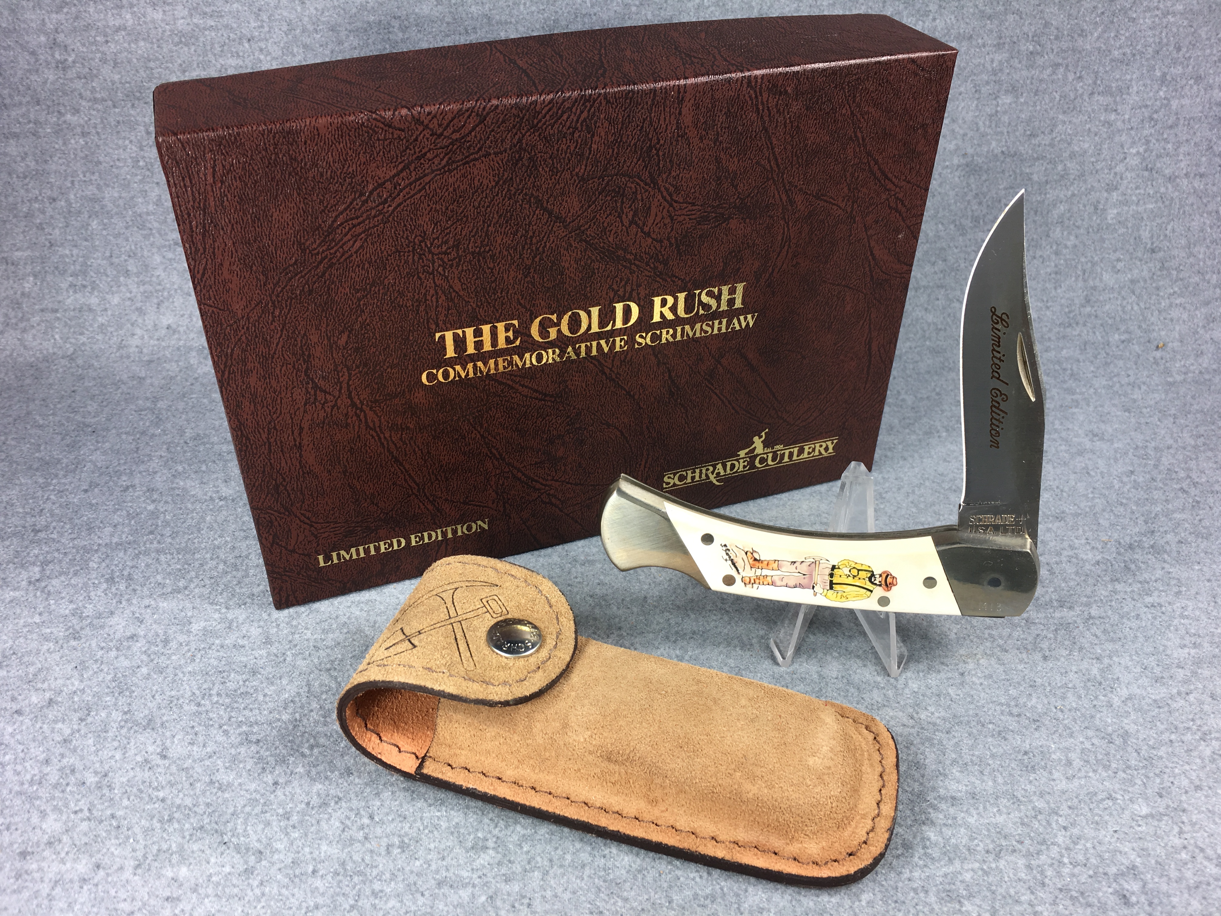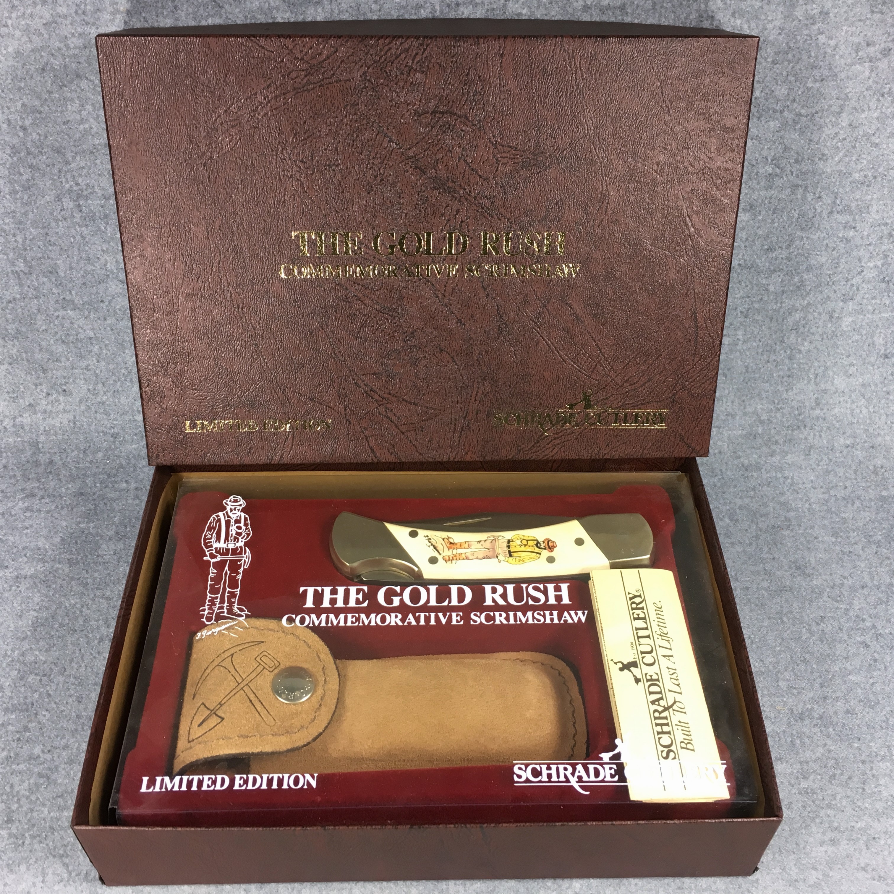 You have: SCHRADE+ Limited Ed THE GOLD RUSH Commemorative Scrimshaw Lockback