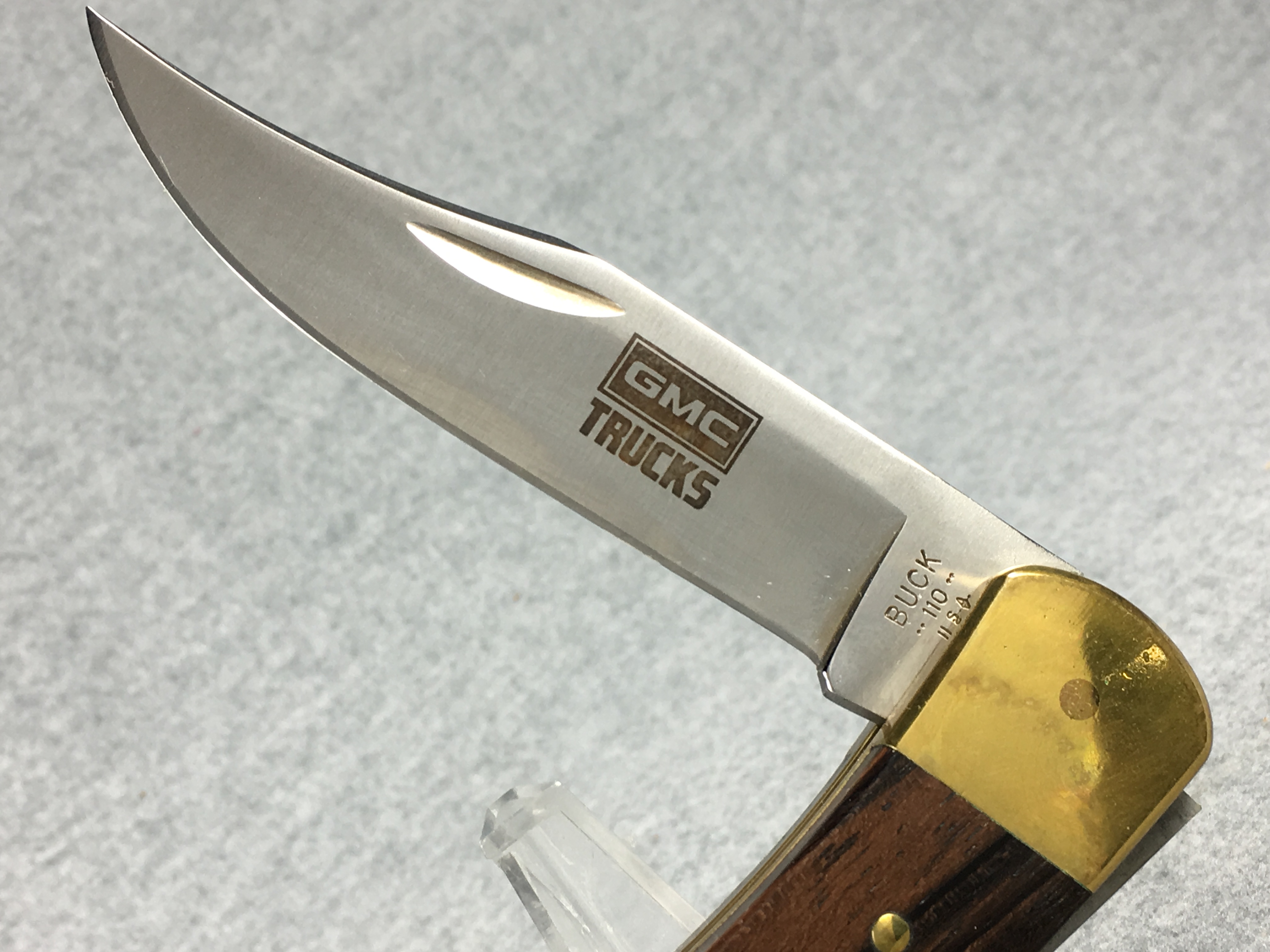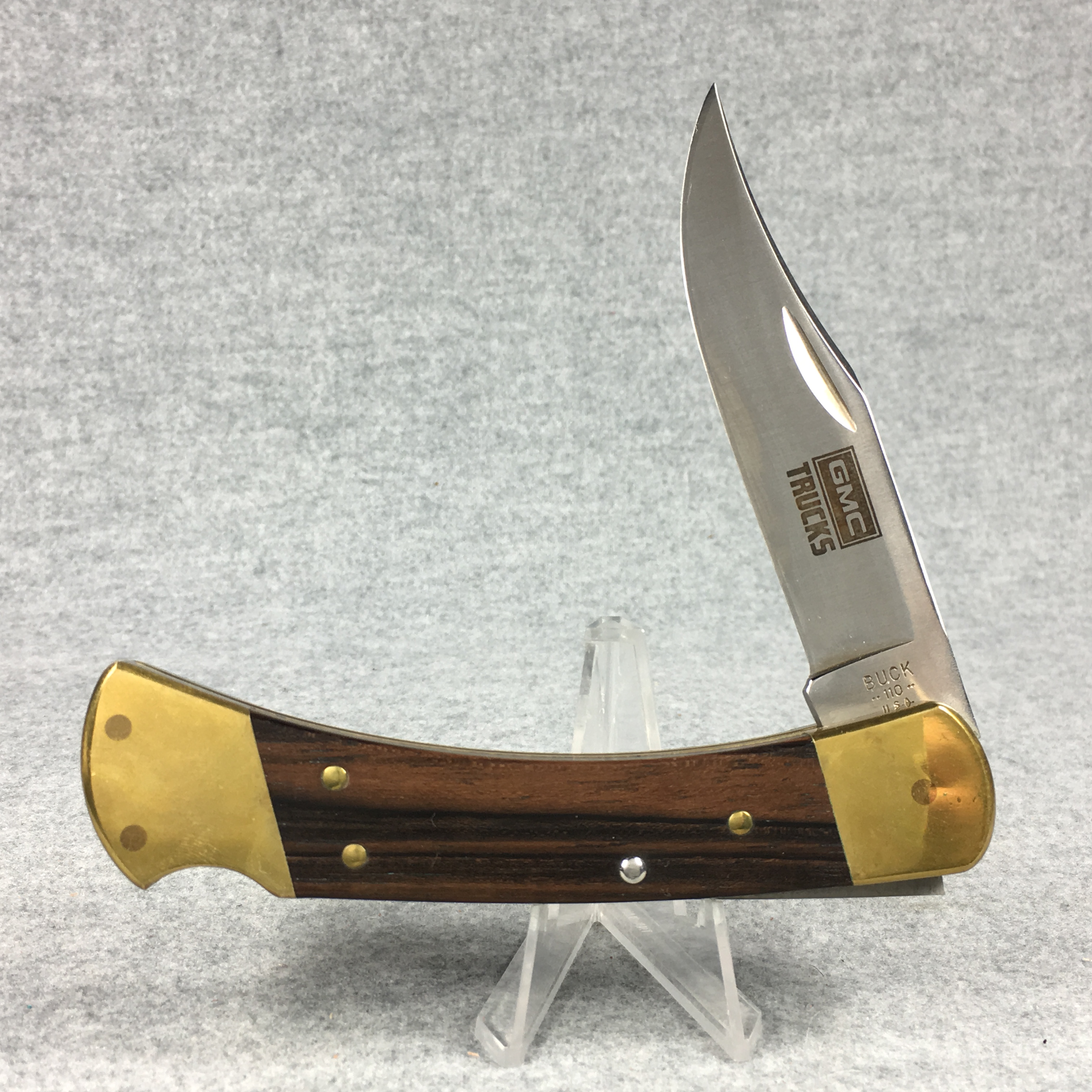 January 14, 2026 - 4-7/8 inches closed. 8-5/8 inches open. Made in USA. "Buck ** 110 ** U.S.A." tang stamp. Stainless Steel blade etched "GMC TRUCKS". Wood handle. Brass bolsters and liner.