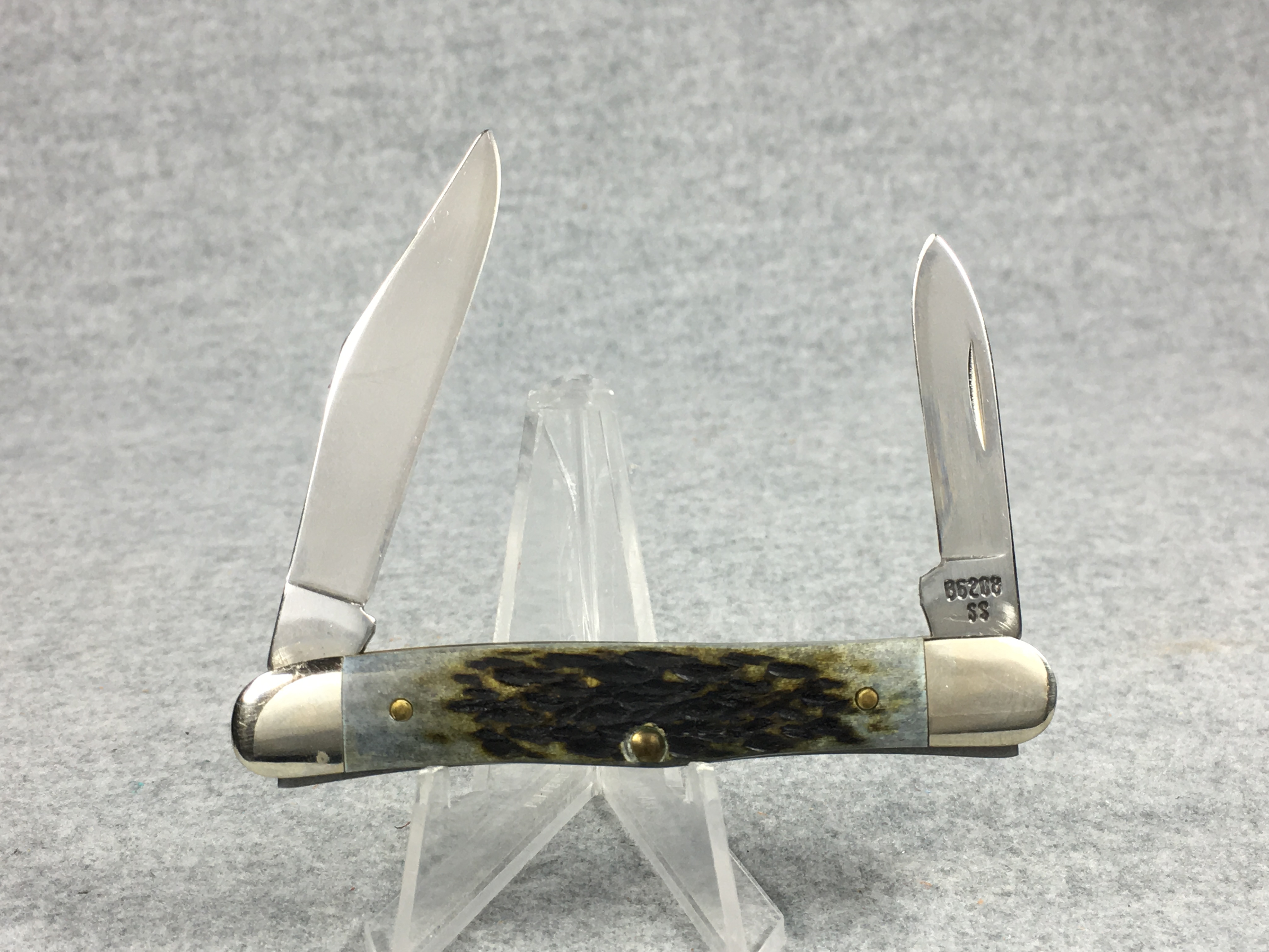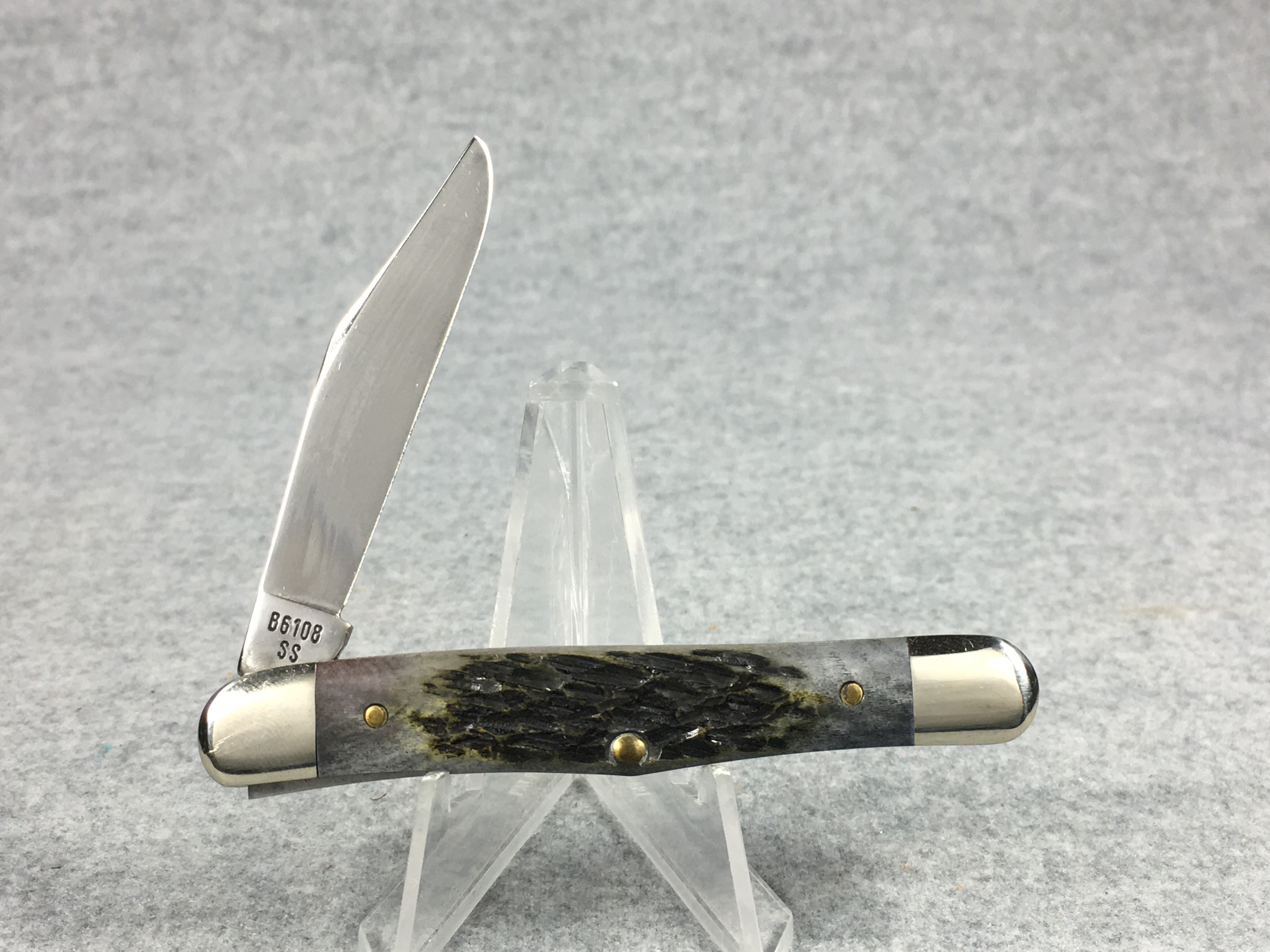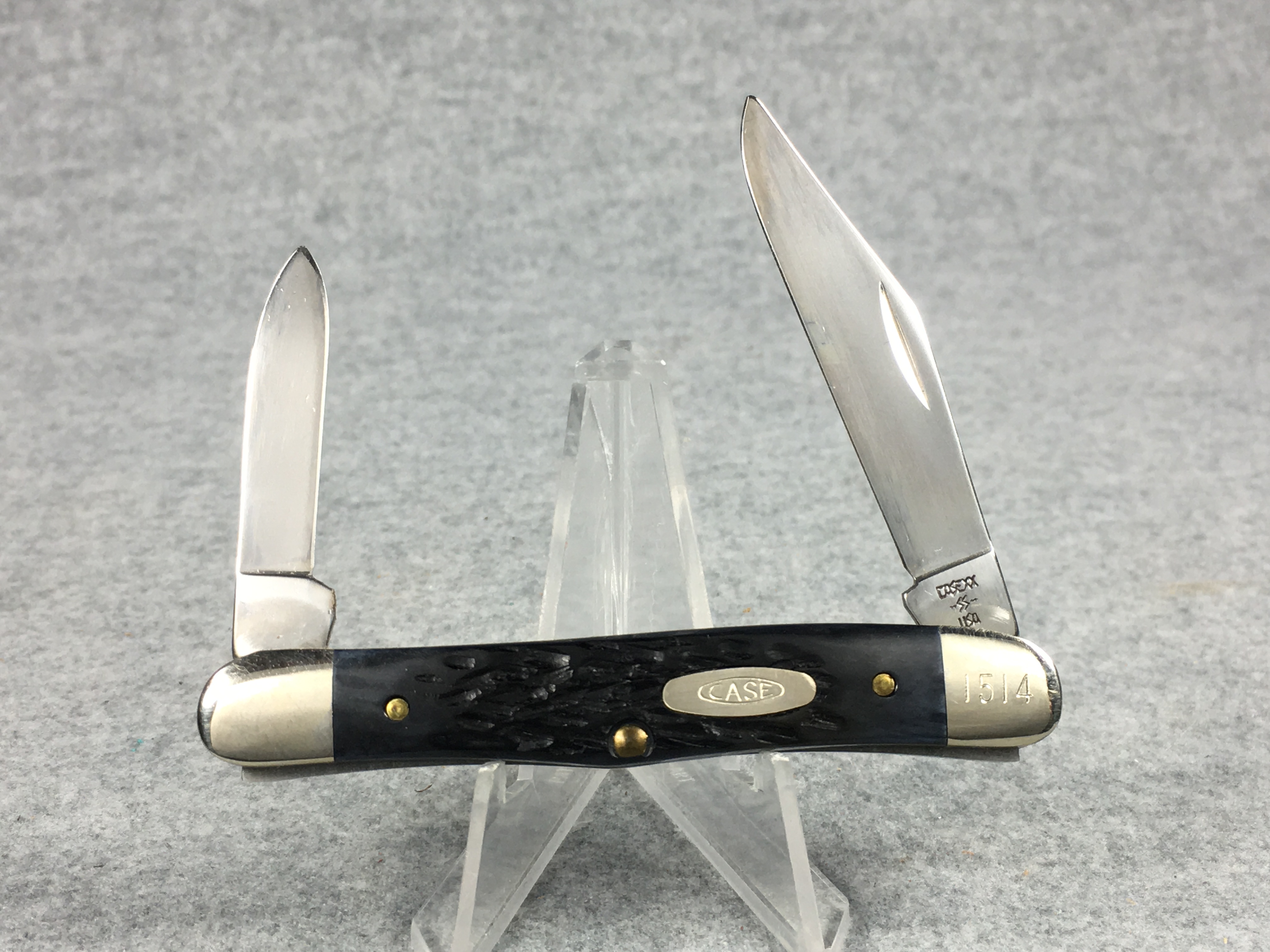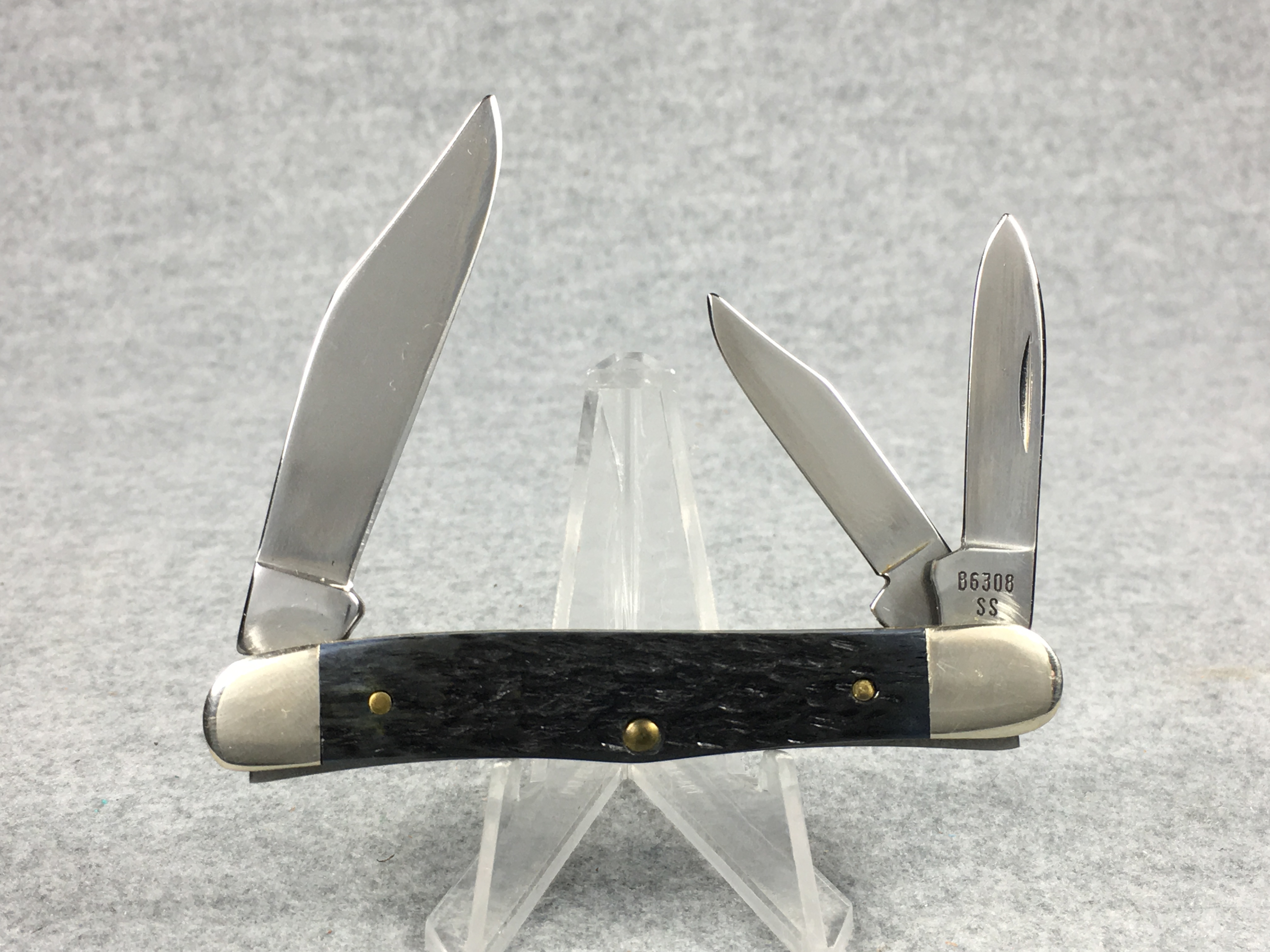 December 24, 2025 - Set of three Whittler Pocket Knives. 3-1/4 inches closed. 5-3/8 inches open. Made in USA. Includes the following knife patterns: B6108 SS, B6208 SS, and B6308 SS (with corresponding tang stamps). "CASE XX **SS** USA" (4 dot with lightning bolt S - 1986 date stamp) tang stamp. Double oval 'open C' CASE shields. Stainless Steel blades. Jigged Black Bone handles. Nickel Silver bolsters with serial #1514 on front right bolsters. Brass liners. With clamshell case and certificate of authenticity.