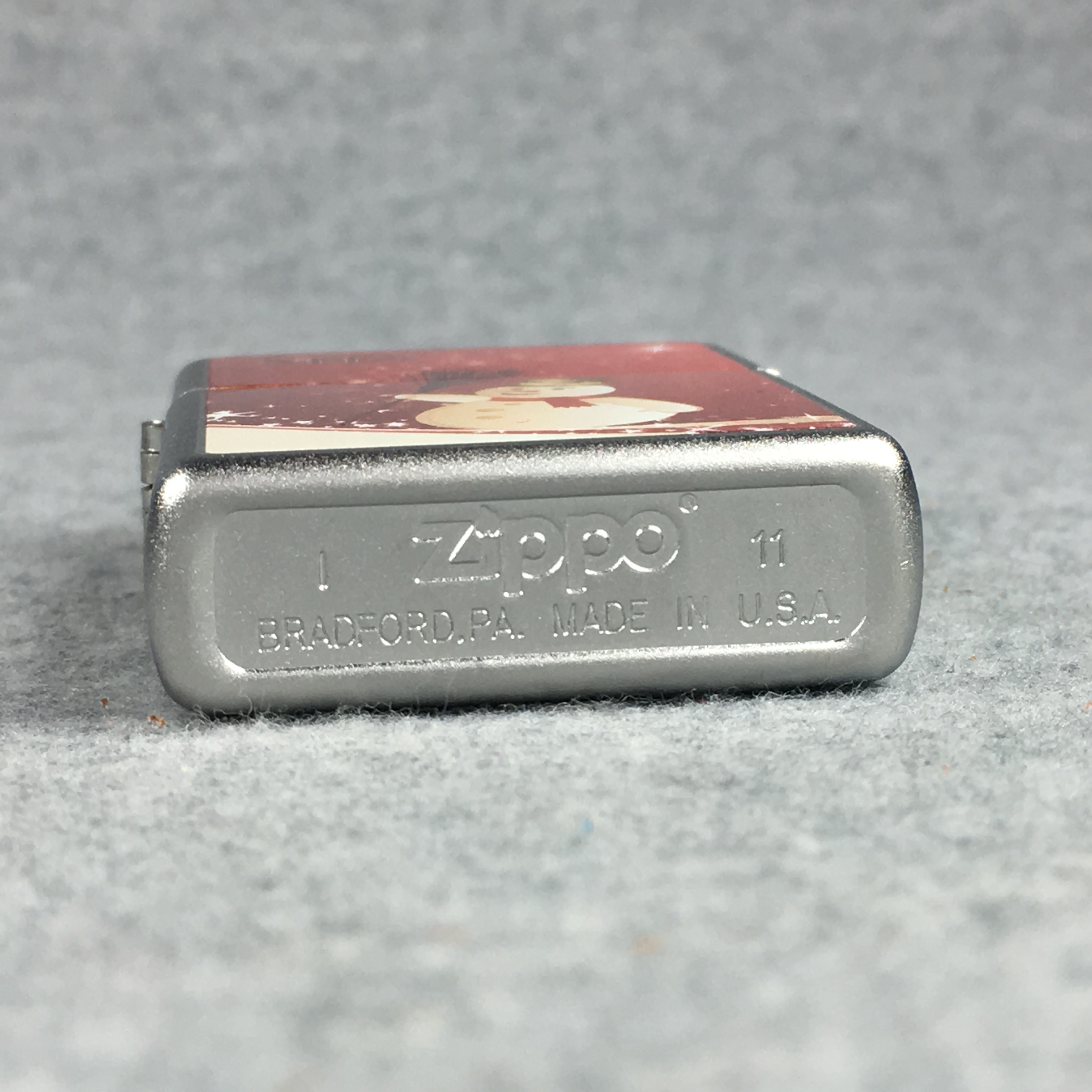 April 25, 2026 - ZIPPO MERRY CHRISTMAS SNOWMAN lighter. Satin chrome finish over solid Brass with color printed front design. Standard size 1-7/16 inches wide by 2-1/4 inches high. Bottom of lighter reads: I Zippo 2011 Bradford, PA. Made in U.S.A. New, sealed. No box.