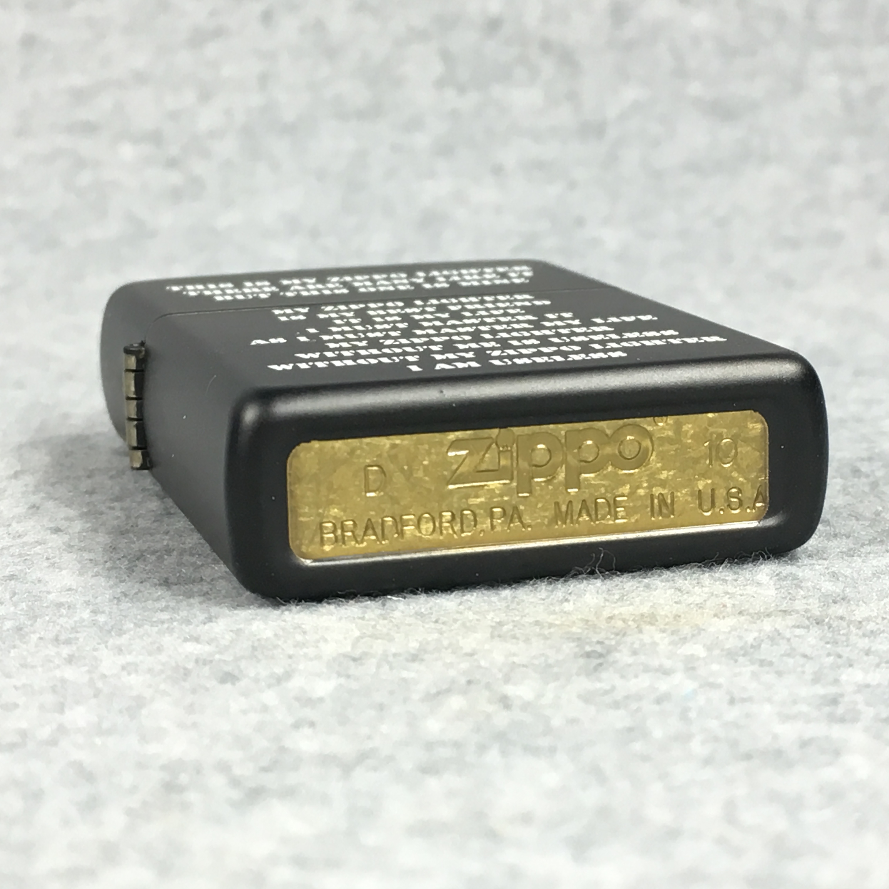 April 25, 2026 - ZIPPO Lighter, 2010. Black matte finish over brass. Standard size 1-7/16 inches wide by 2-1/4 inches high. Bottom of lighter reads: D Zippo 10 Bradford, PA Made in U.S.A. Sealed, with original unfired insert.