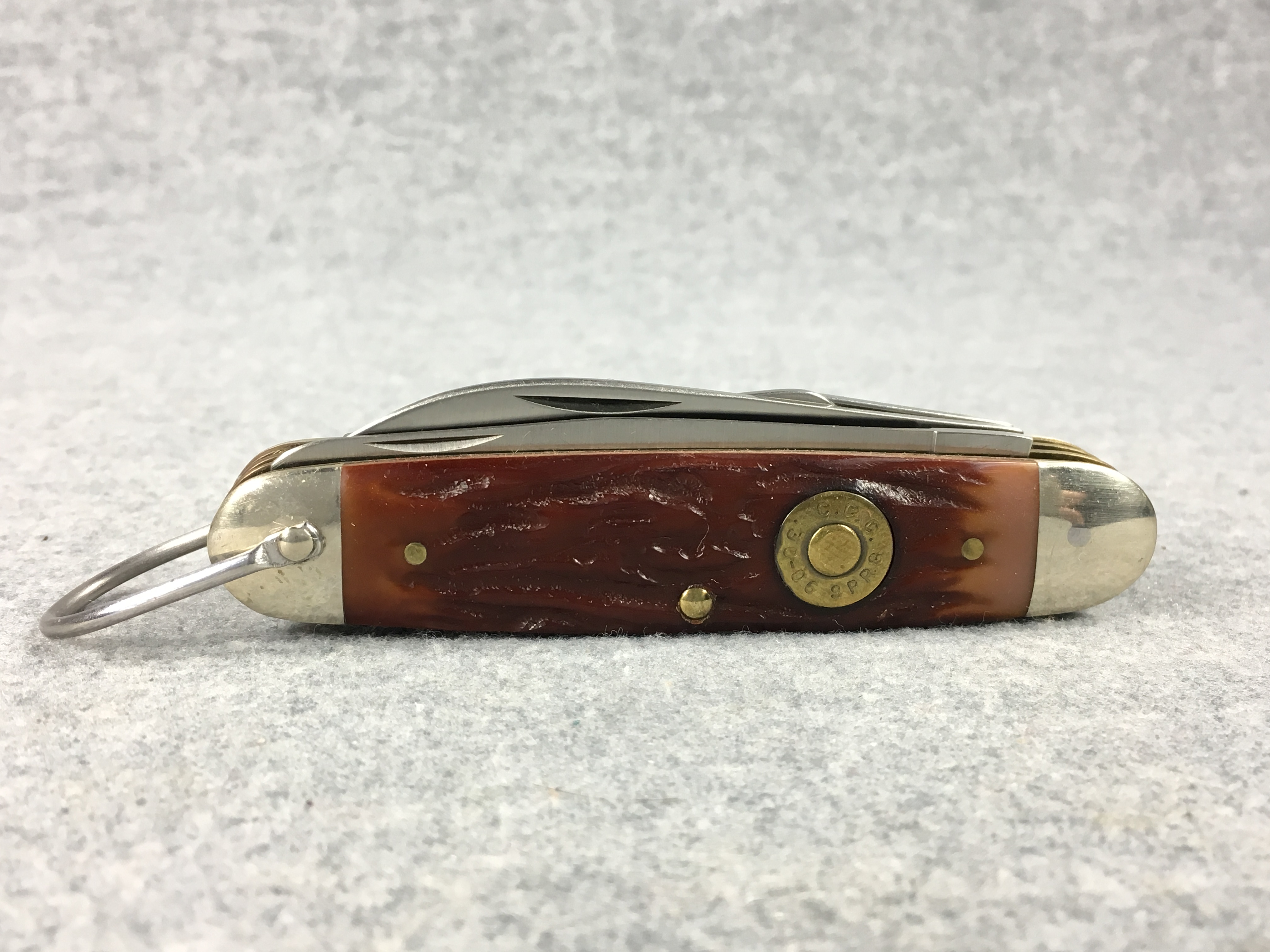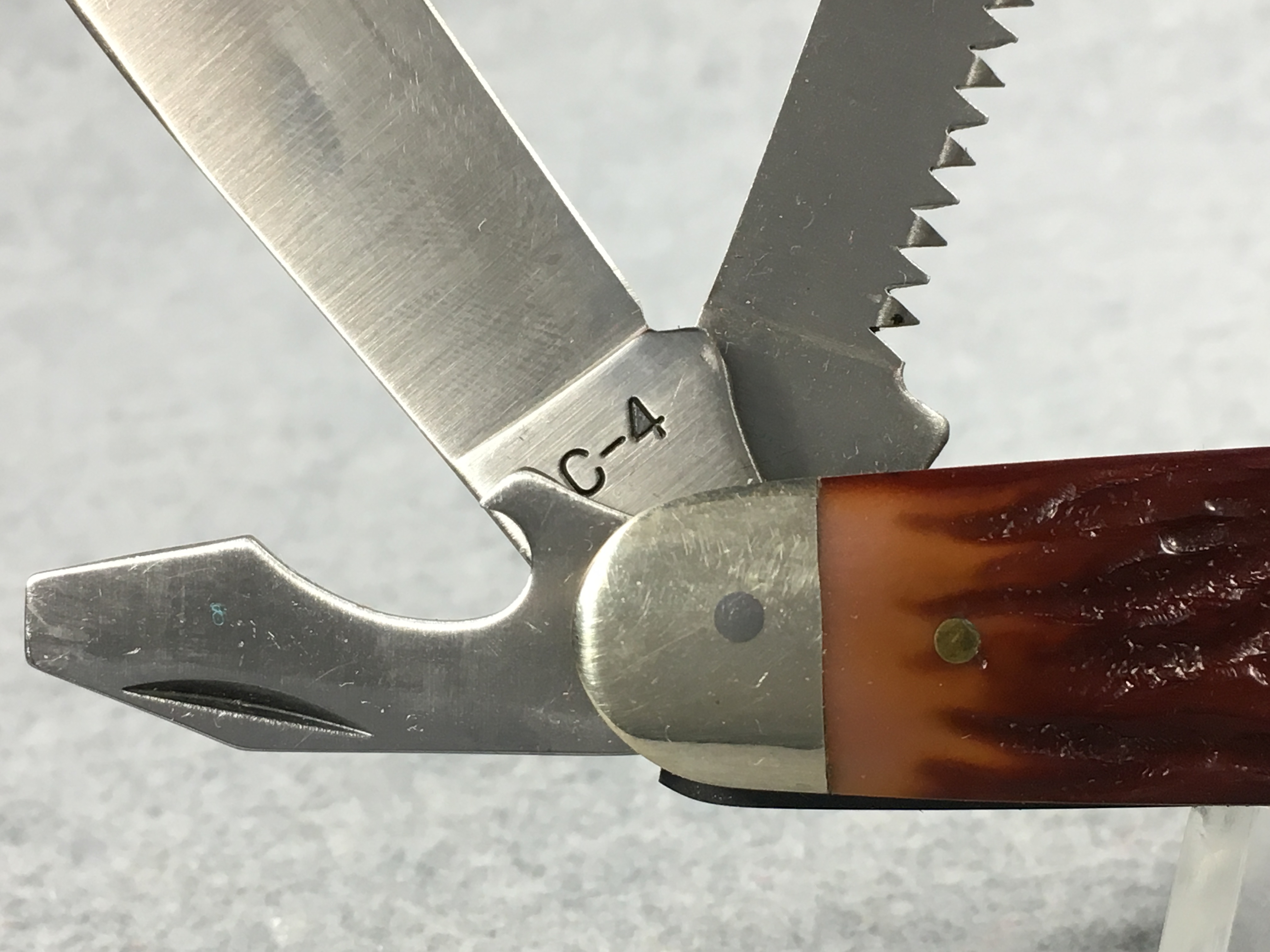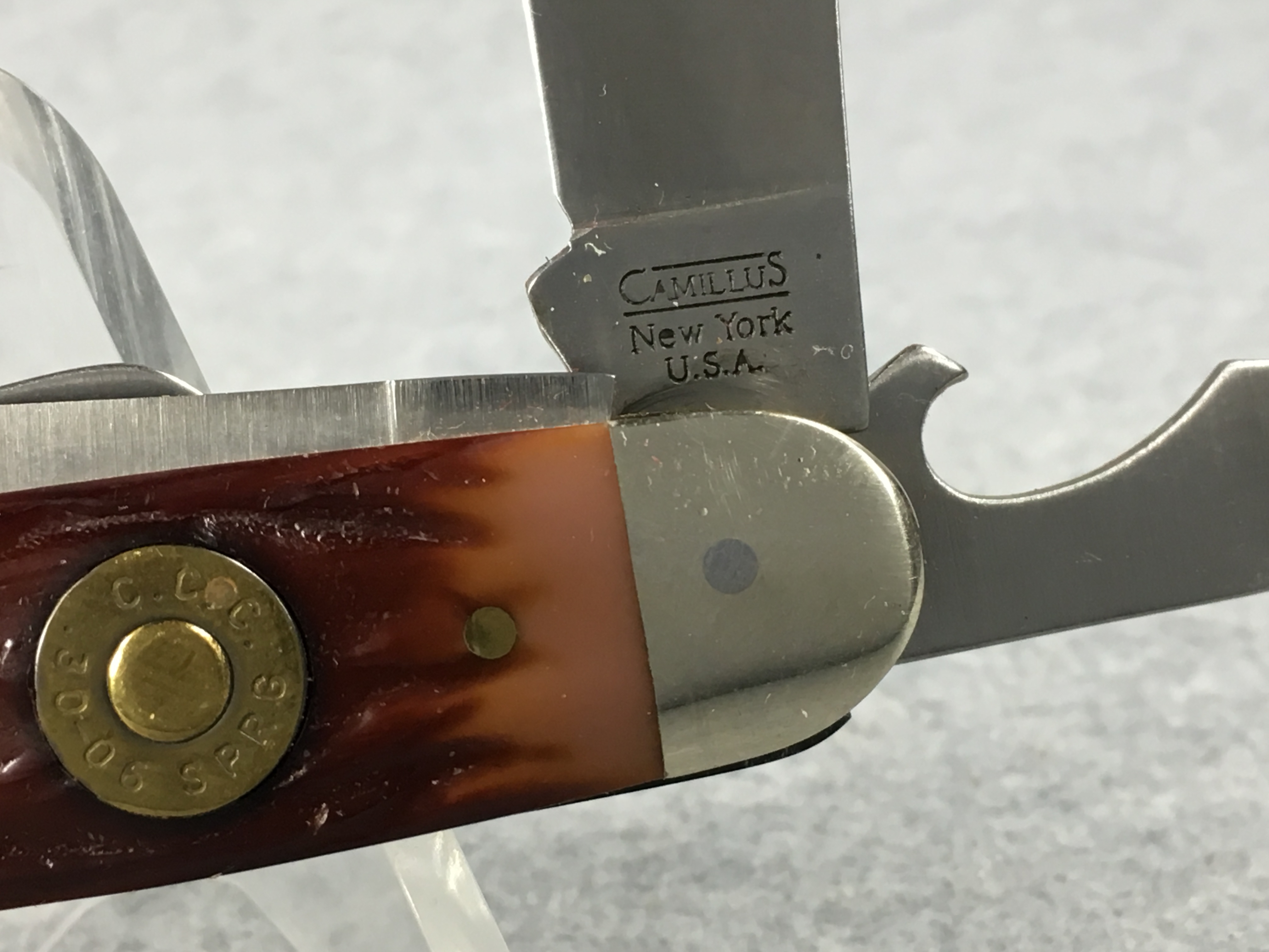 October 26, 2025 - 3-3/4 inches closed. 6-3/4 inches open. "CAMILLUS New York USA" and "C-4" tang stamps. Shotgun shell "30-06 SPRG CCC" shield. Imitation jigged bone handle. Nickel silver bolsters. Brass liner. No box.